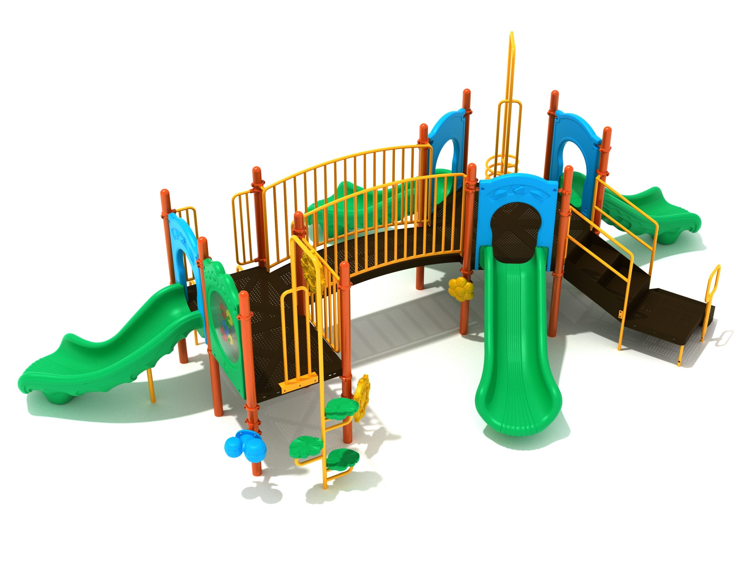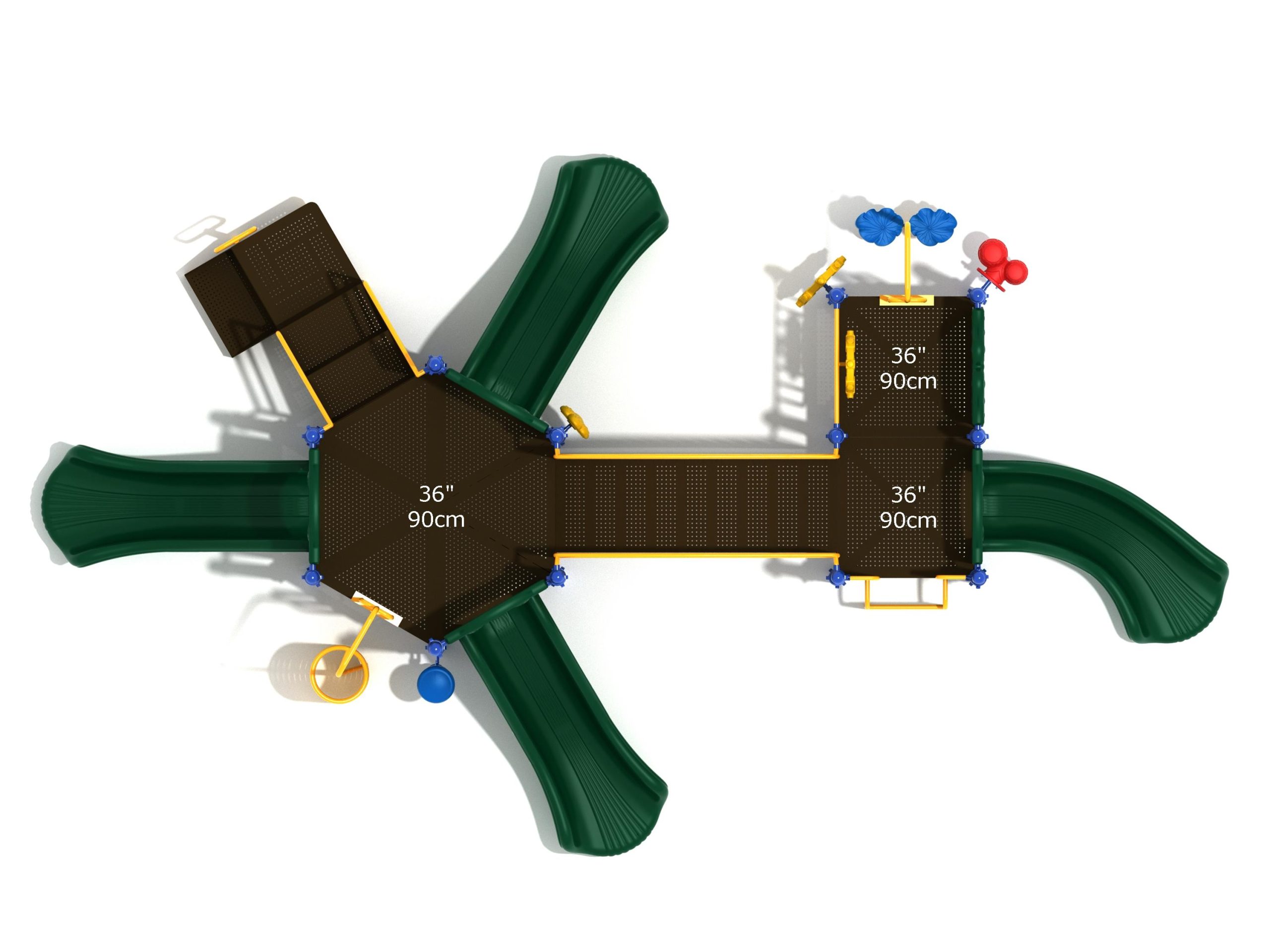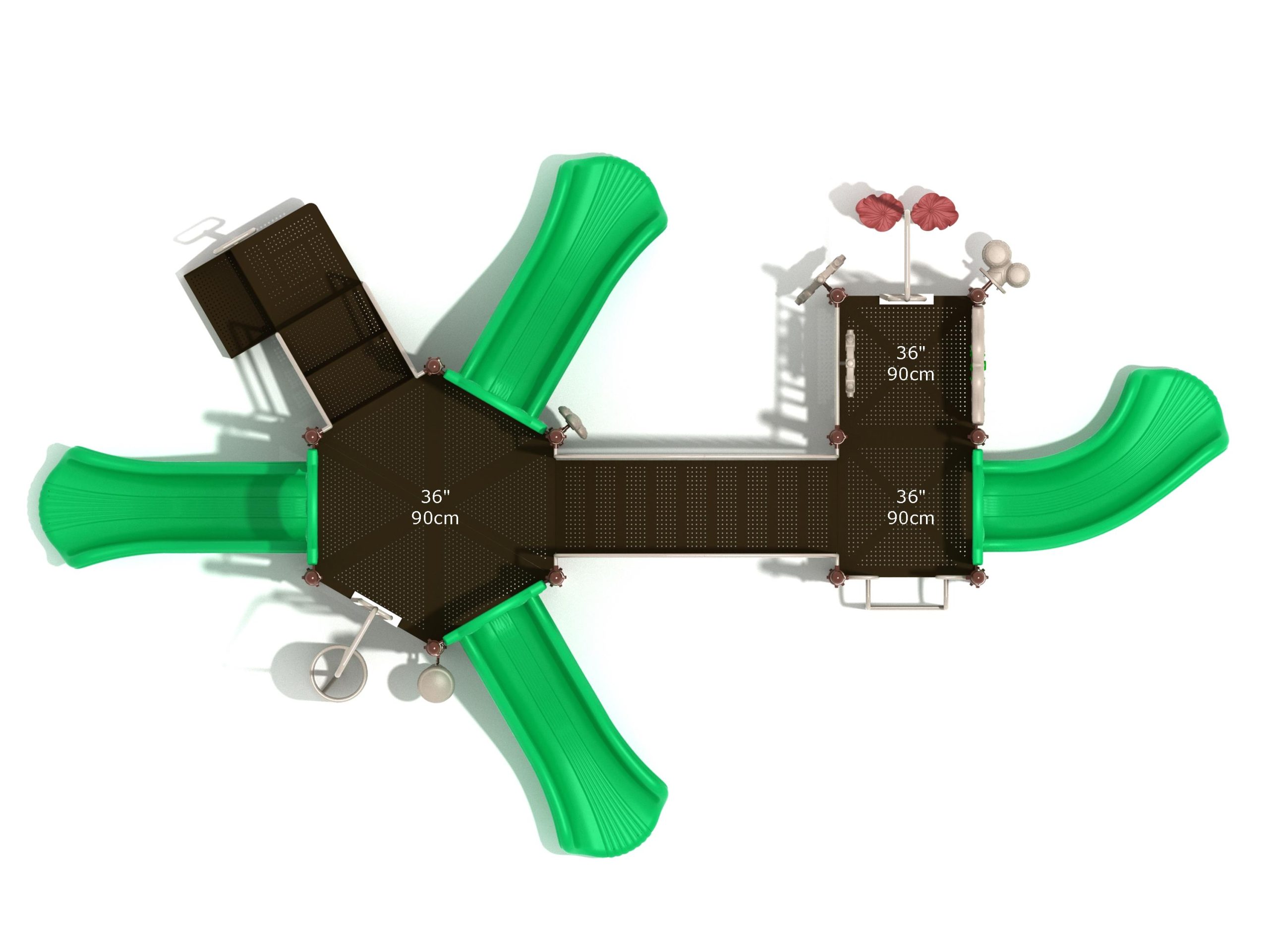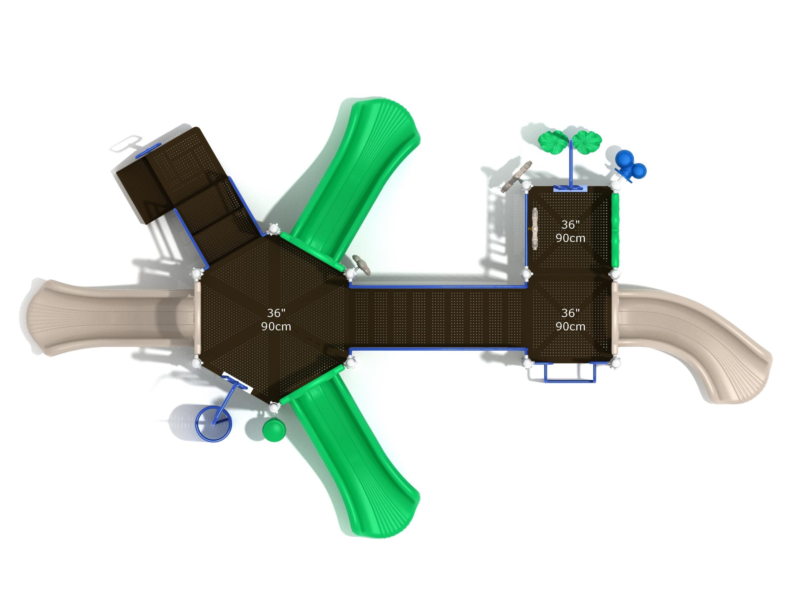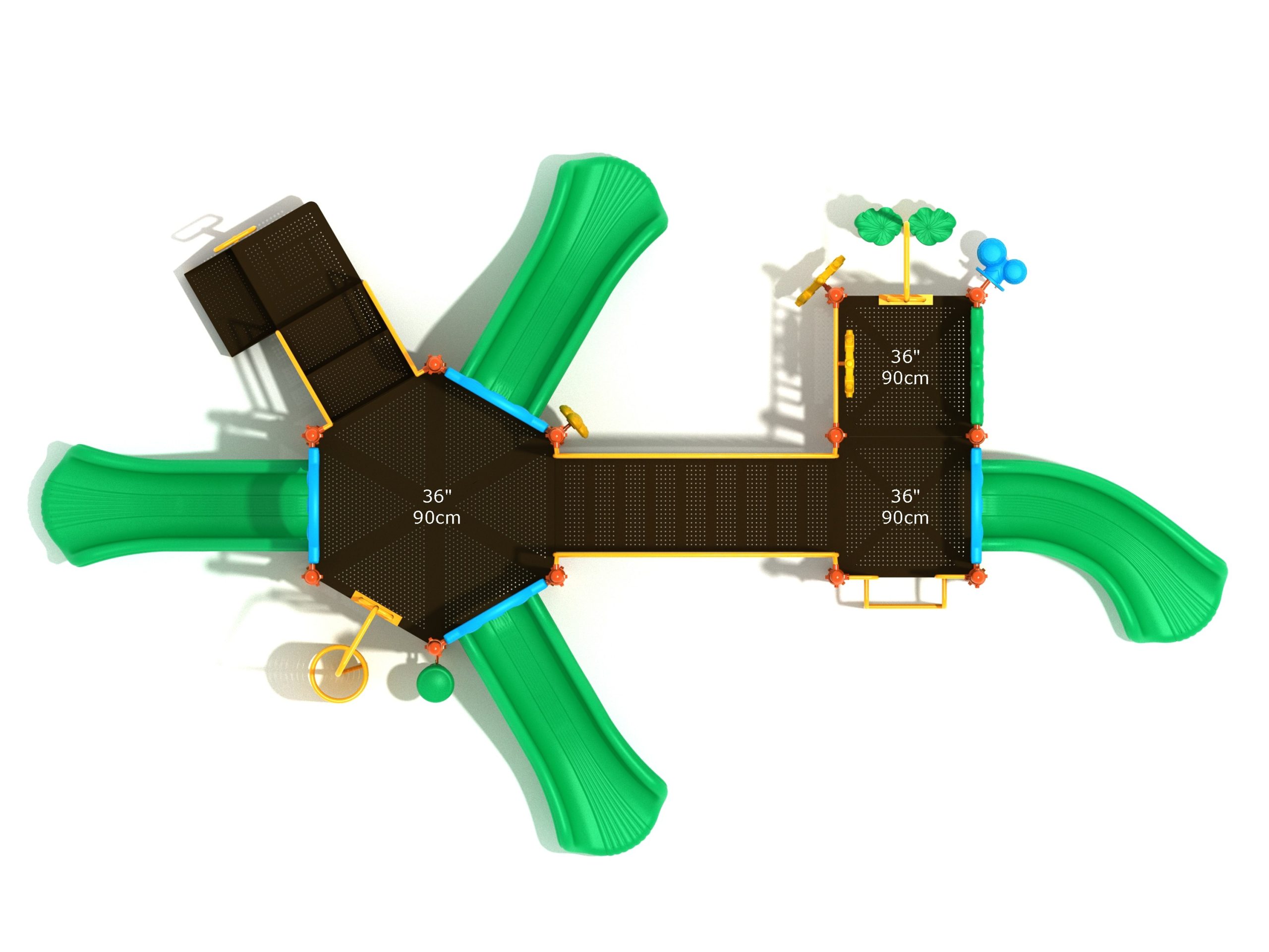 When you add the Eugene play structure to a playground or outdoor park, you can guarantee it will be a hit with the children thanks to the large number of activities to engage them. There’ll never be a long queue to go down a slide as there are four to choose from and an Arch Bridge connects the two sections. Three long Straight Slides emerge from a central hexagonal platform and on the other end of the structure there’s a Right Turn Slide to add something different to the sliding adventure. Climbing up onto the top platforms can also be done in numerous ways to inspire creativity. There’s the traditional Vertical Ladder or Transfer Station for smaller children, but more adventurous types will hop their way up on plant leaves with the Lotus Step Climber or wind their way up the Spiral Climber which improves both strength and climbing agility. Younger children will appreciate the range of features on the lower levels including the Gear Panel and Ship’s Wheel, both of which bring a sense of movement to the equipment. The Single Drum, Rain Wheel and Bongos add a welcomed sound element to the experience.