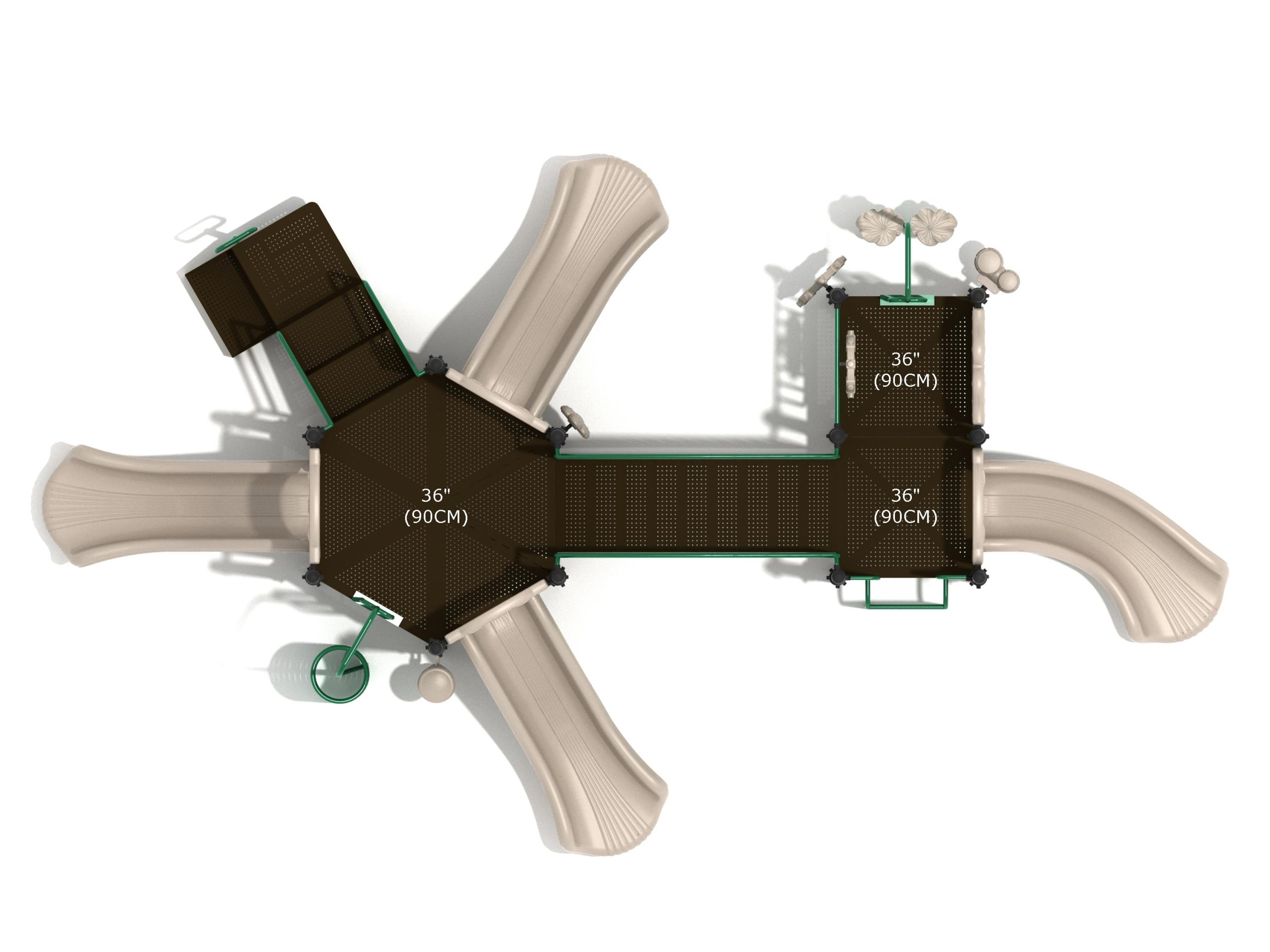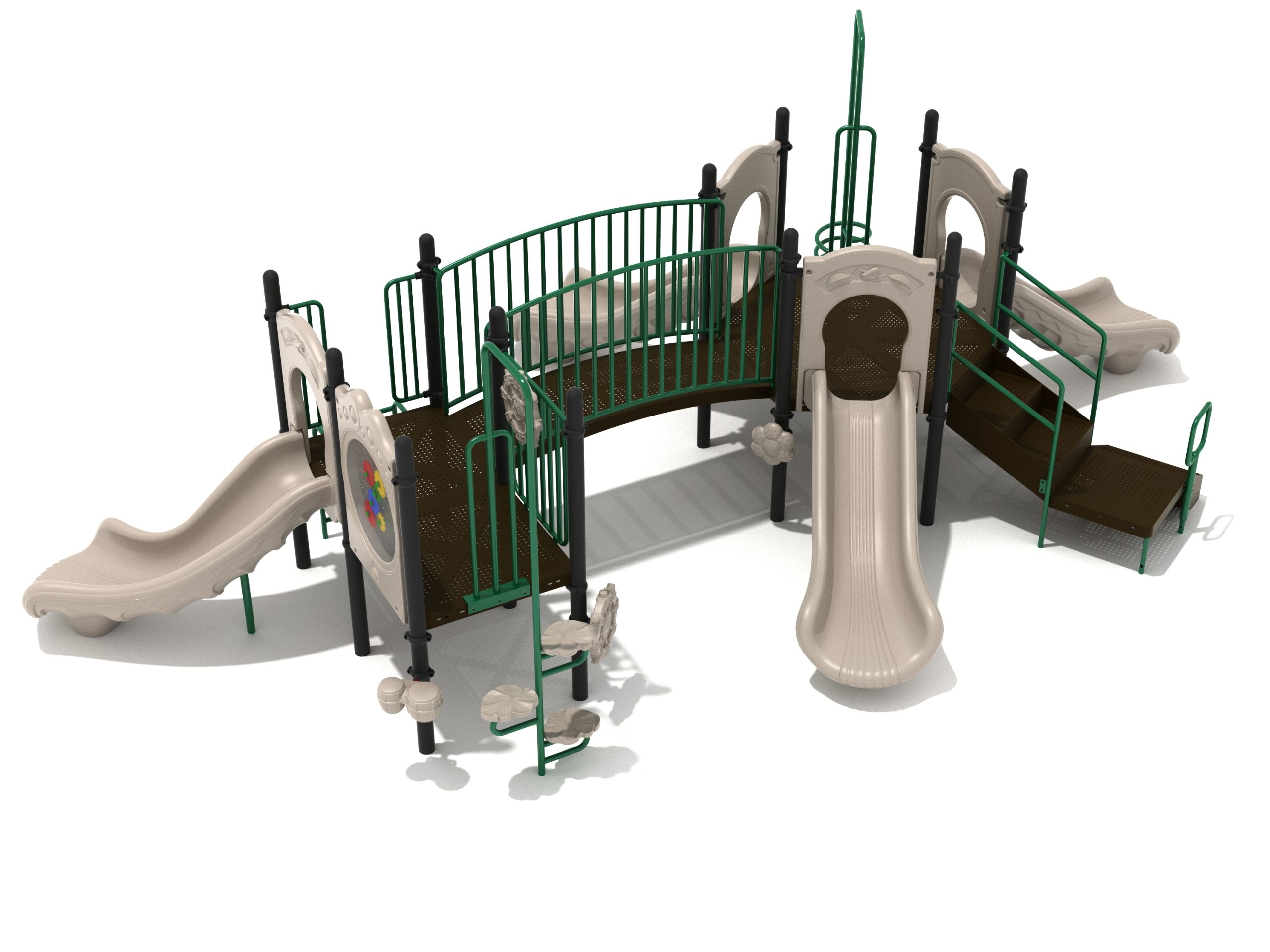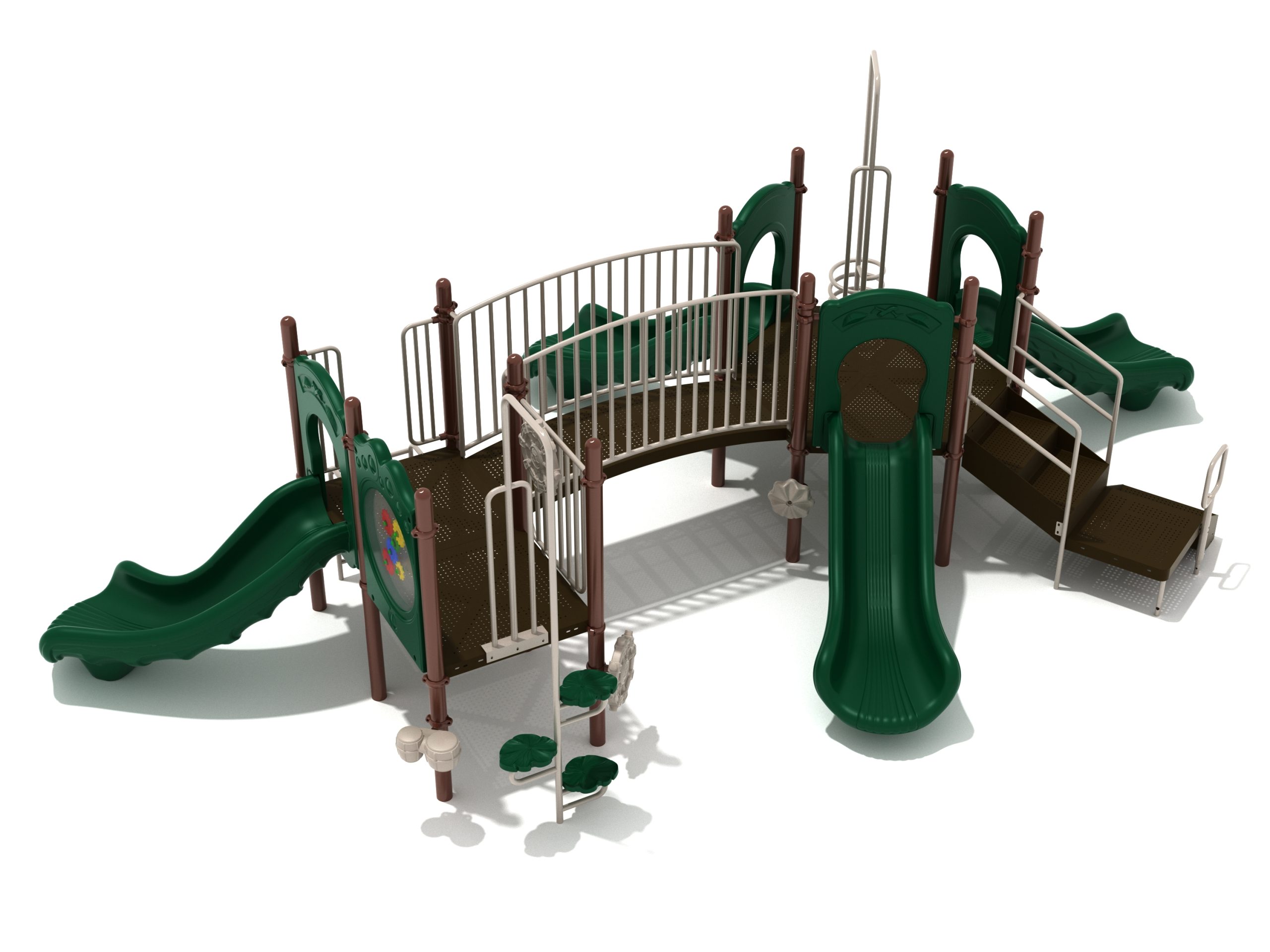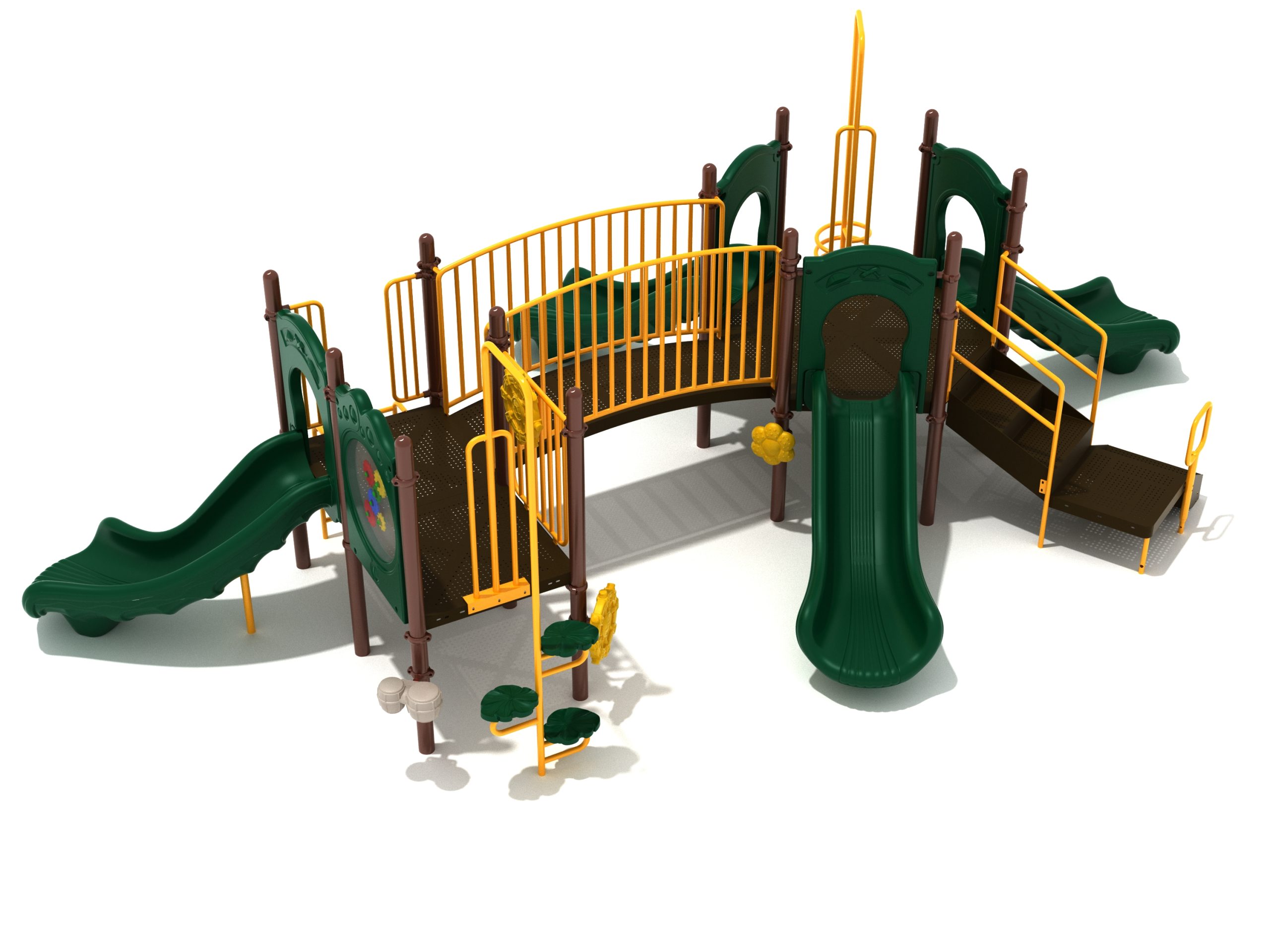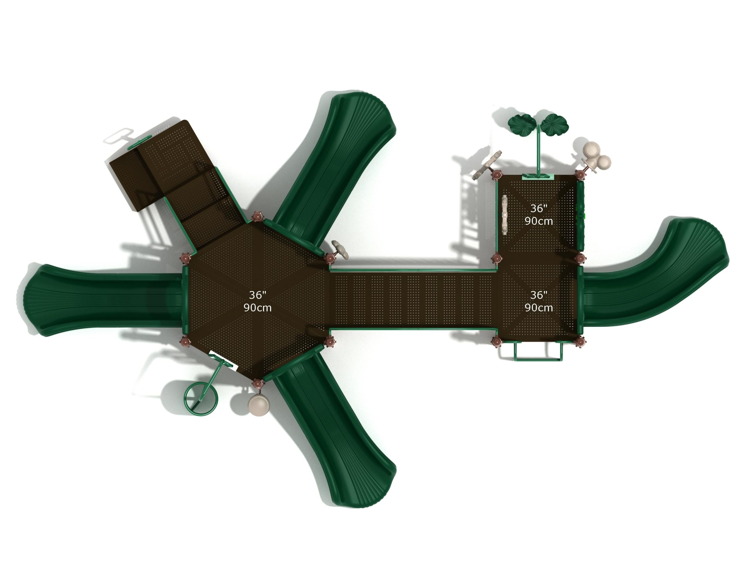 When you add the Eugene play structure to a playground or outdoor park, you can guarantee it will be a hit with the children thanks to the large number of activities to engage them. There’ll never be a long queue to go down a slide as there are four to choose from and an Arch Bridge connects the two sections. Three long Straight Slides emerge from a central hexagonal platform and on the other end of the structure there’s a Right Turn Slide to add something different to the sliding adventure. Climbing up onto the top platforms can also be done in numerous ways to inspire creativity. There’s the traditional Vertical Ladder or Transfer Station for smaller children, but more adventurous types will hop their way up on plant leaves with the Lotus Step Climber or wind their way up the Spiral Climber which improves both strength and climbing agility. Younger children will appreciate the range of features on the lower levels including the Gear Panel and Ship’s Wheel, both of which bring a sense of movement to the equipment. The Single Drum, Rain Wheel and Bongos add a welcomed sound element to the experience.