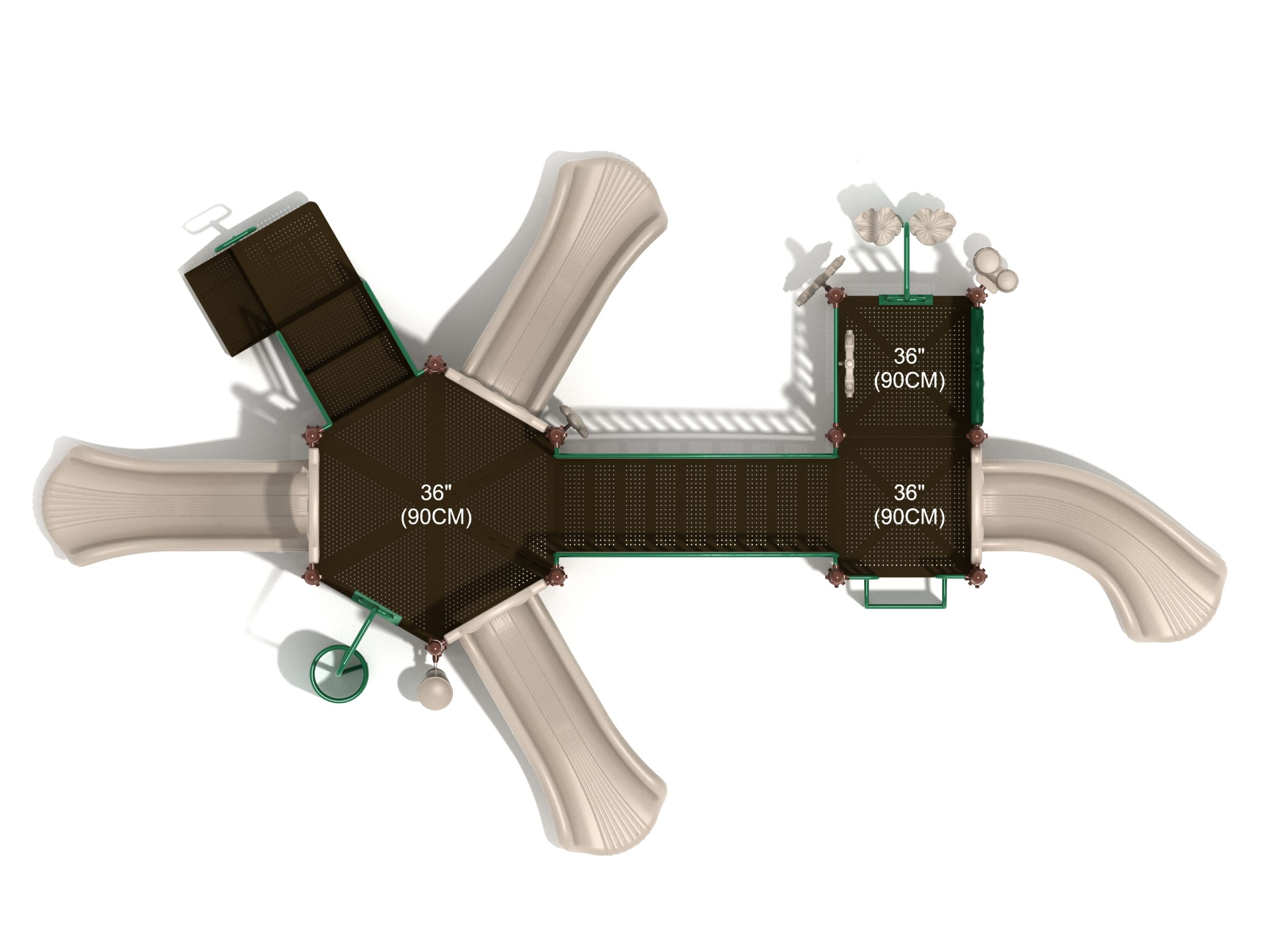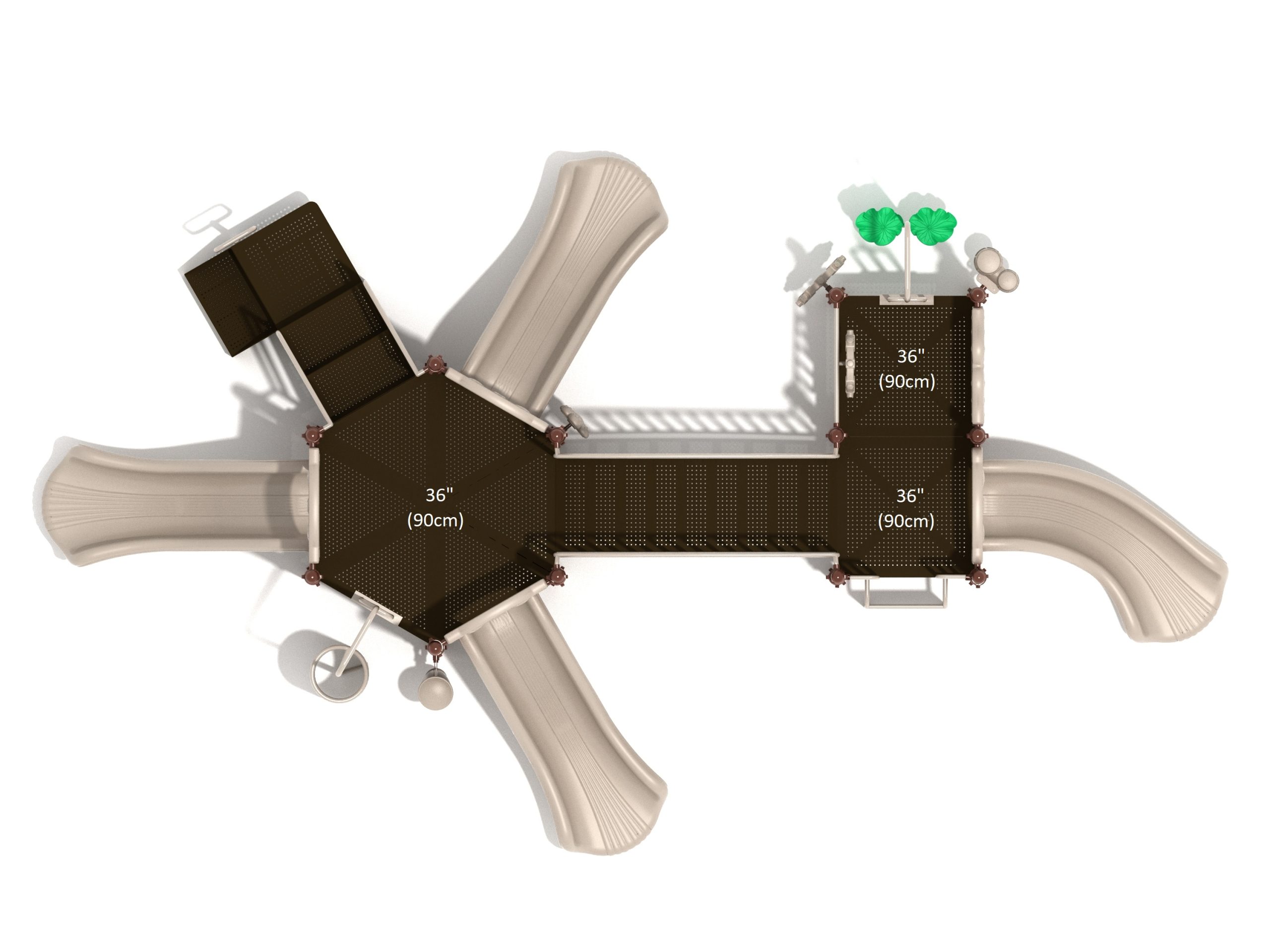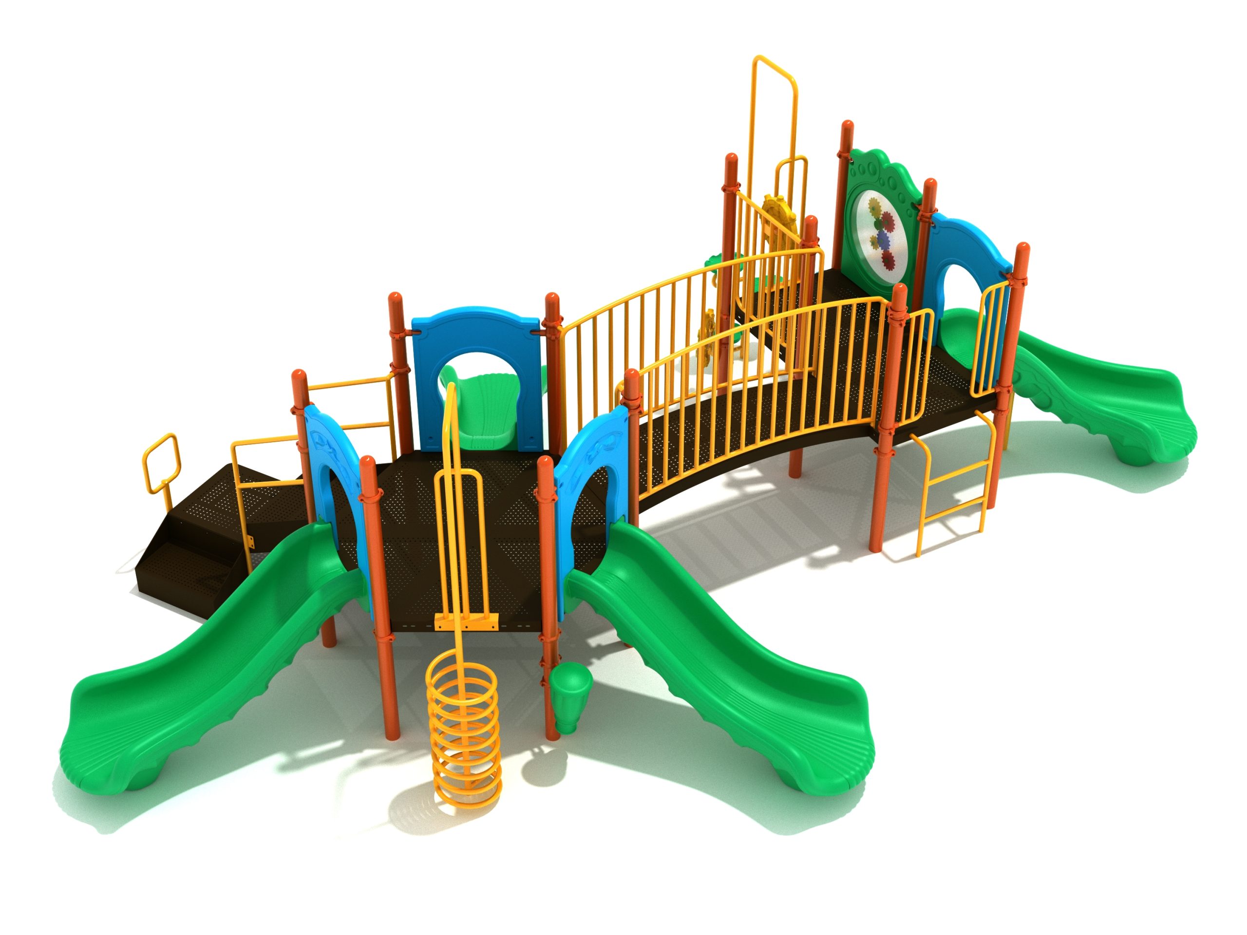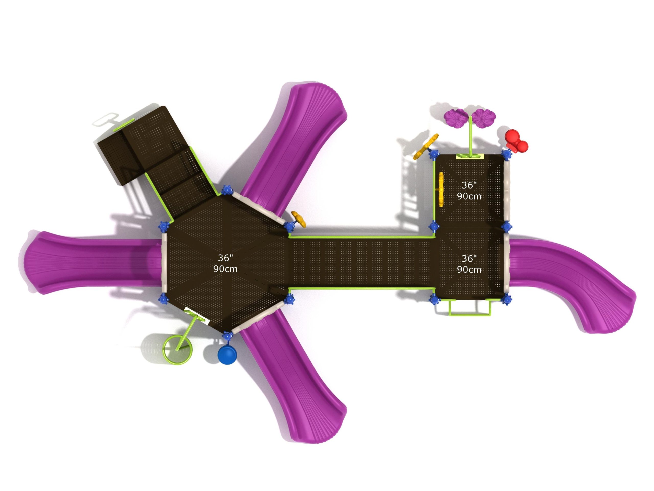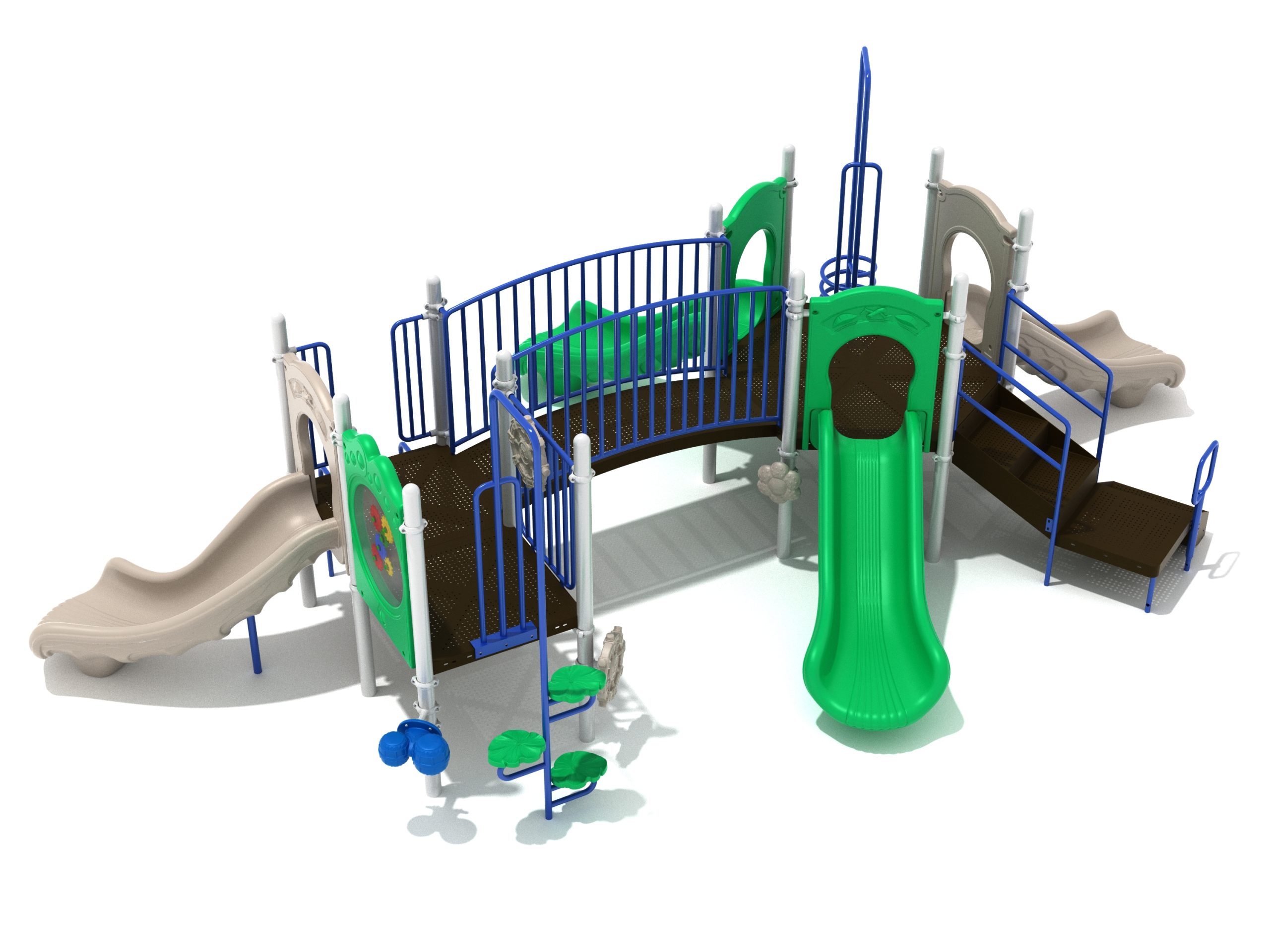 When you add the Eugene play structure to a playground or outdoor park, you can guarantee it will be a hit with the children thanks to the large number of activities to engage them. There’ll never be a long queue to go down a slide as there are four to choose from and an Arch Bridge connects the two sections. Three long Straight Slides emerge from a central hexagonal platform and on the other end of the structure there’s a Right Turn Slide to add something different to the sliding adventure. Climbing up onto the top platforms can also be done in numerous ways to inspire creativity. There’s the traditional Vertical Ladder or Transfer Station for smaller children, but more adventurous types will hop their way up on plant leaves with the Lotus Step Climber or wind their way up the Spiral Climber which improves both strength and climbing agility. Younger children will appreciate the range of features on the lower levels including the Gear Panel and Ship’s Wheel, both of which bring a sense of movement to the equipment. The Single Drum, Rain Wheel and Bongos add a welcomed sound element to the experience.