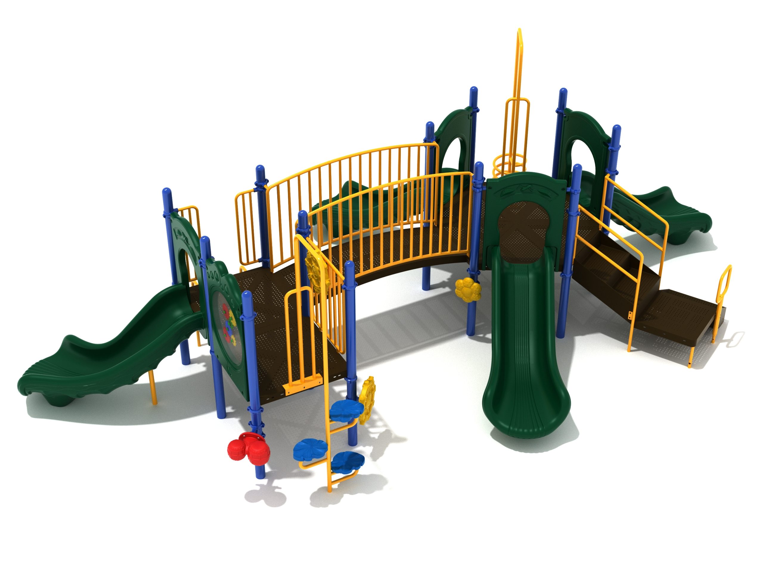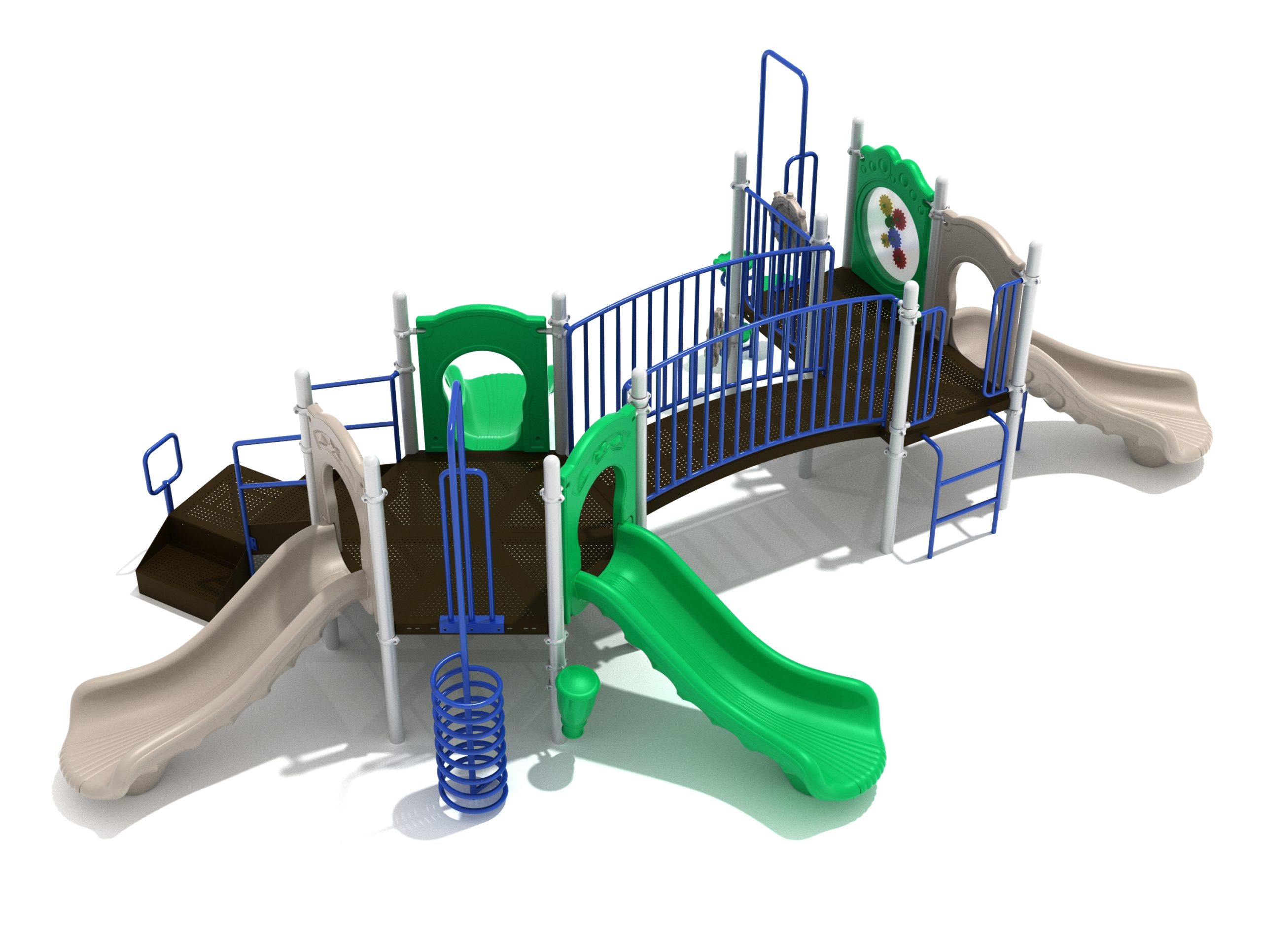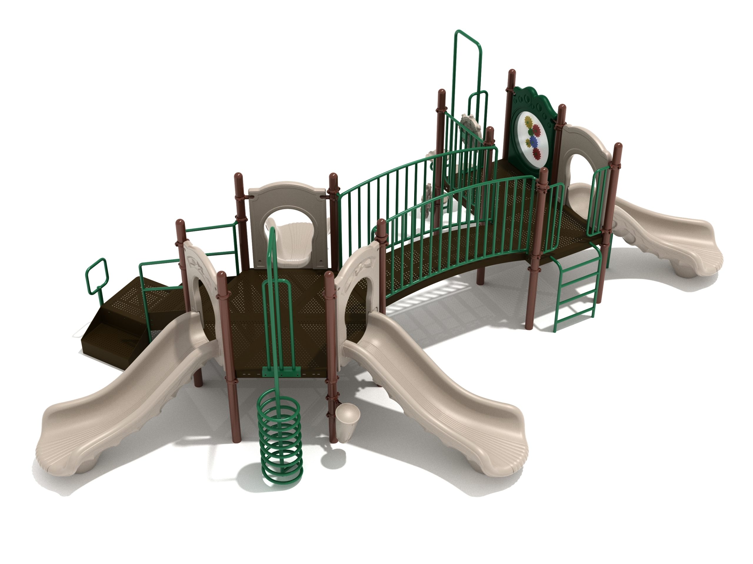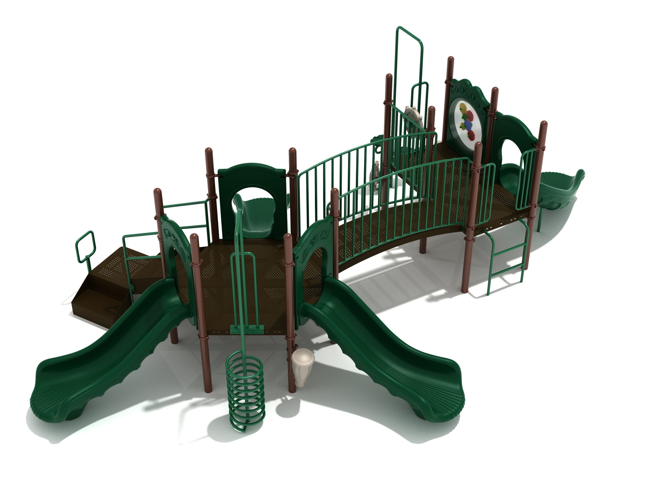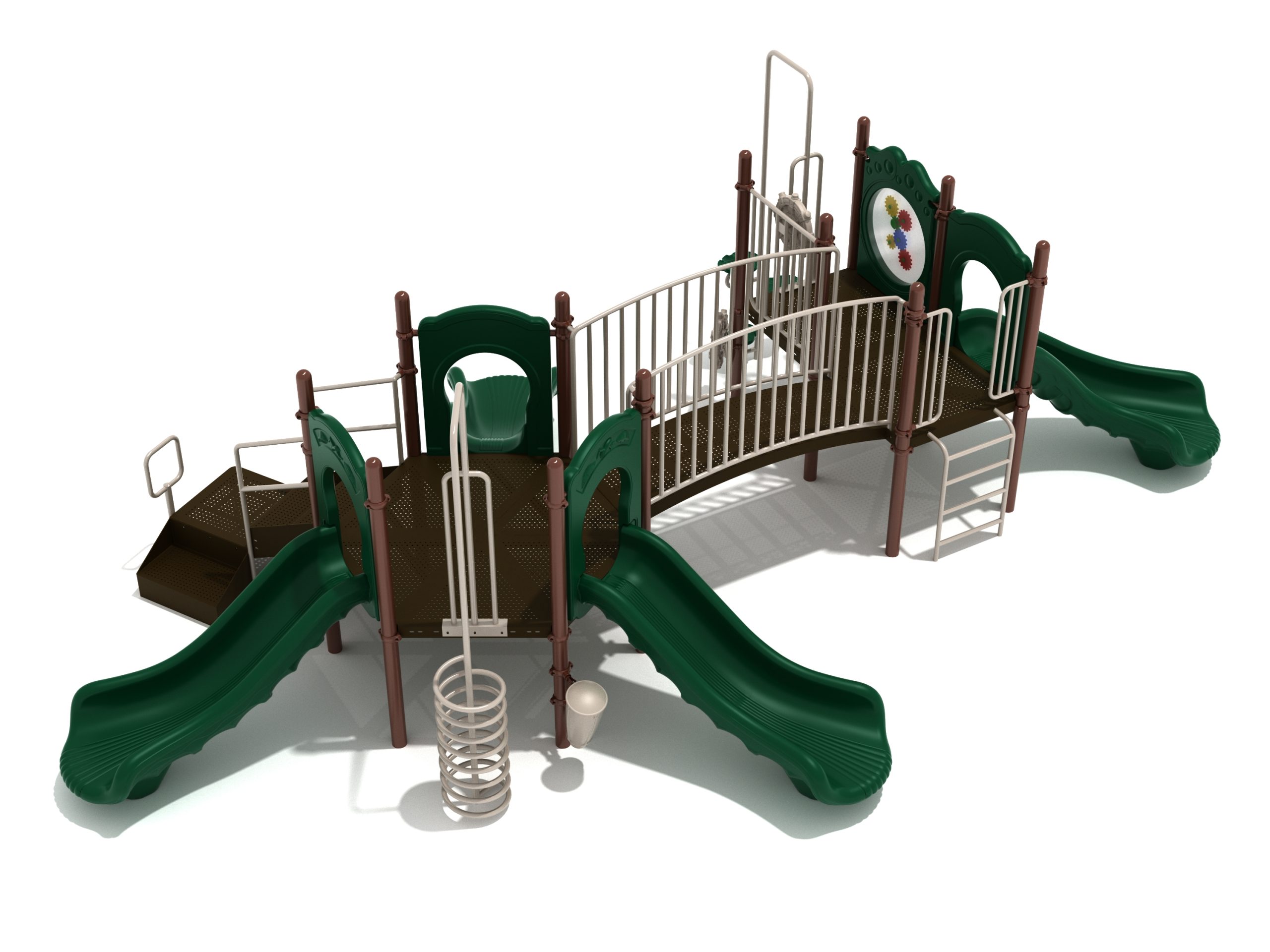 When you add the Eugene play structure to a playground or outdoor park, you can guarantee it will be a hit with the children thanks to the large number of activities to engage them. There’ll never be a long queue to go down a slide as there are four to choose from and an Arch Bridge connects the two sections. Three long Straight Slides emerge from a central hexagonal platform and on the other end of the structure there’s a Right Turn Slide to add something different to the sliding adventure. Climbing up onto the top platforms can also be done in numerous ways to inspire creativity. There’s the traditional Vertical Ladder or Transfer Station for smaller children, but more adventurous types will hop their way up on plant leaves with the Lotus Step Climber or wind their way up the Spiral Climber which improves both strength and climbing agility. Younger children will appreciate the range of features on the lower levels including the Gear Panel and Ship’s Wheel, both of which bring a sense of movement to the equipment. The Single Drum, Rain Wheel and Bongos add a welcomed sound element to the experience.