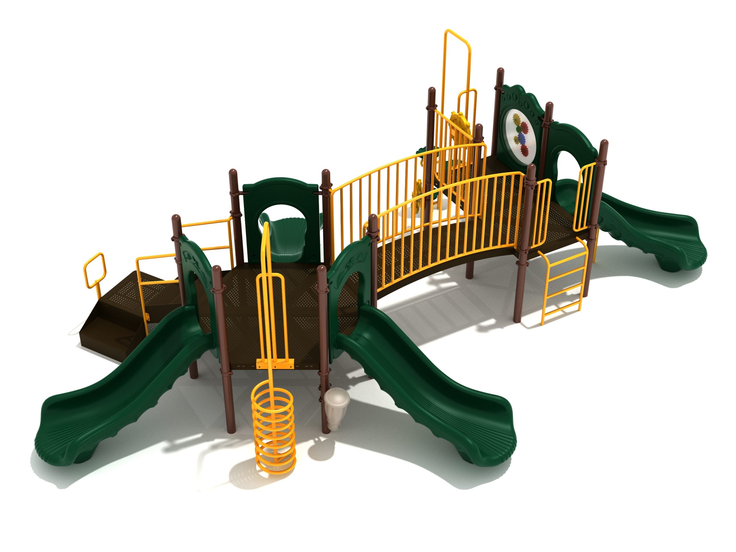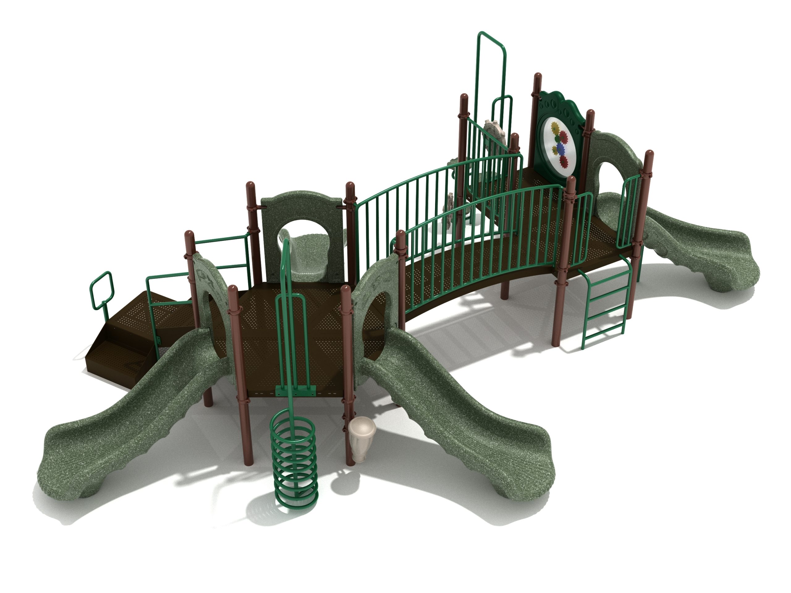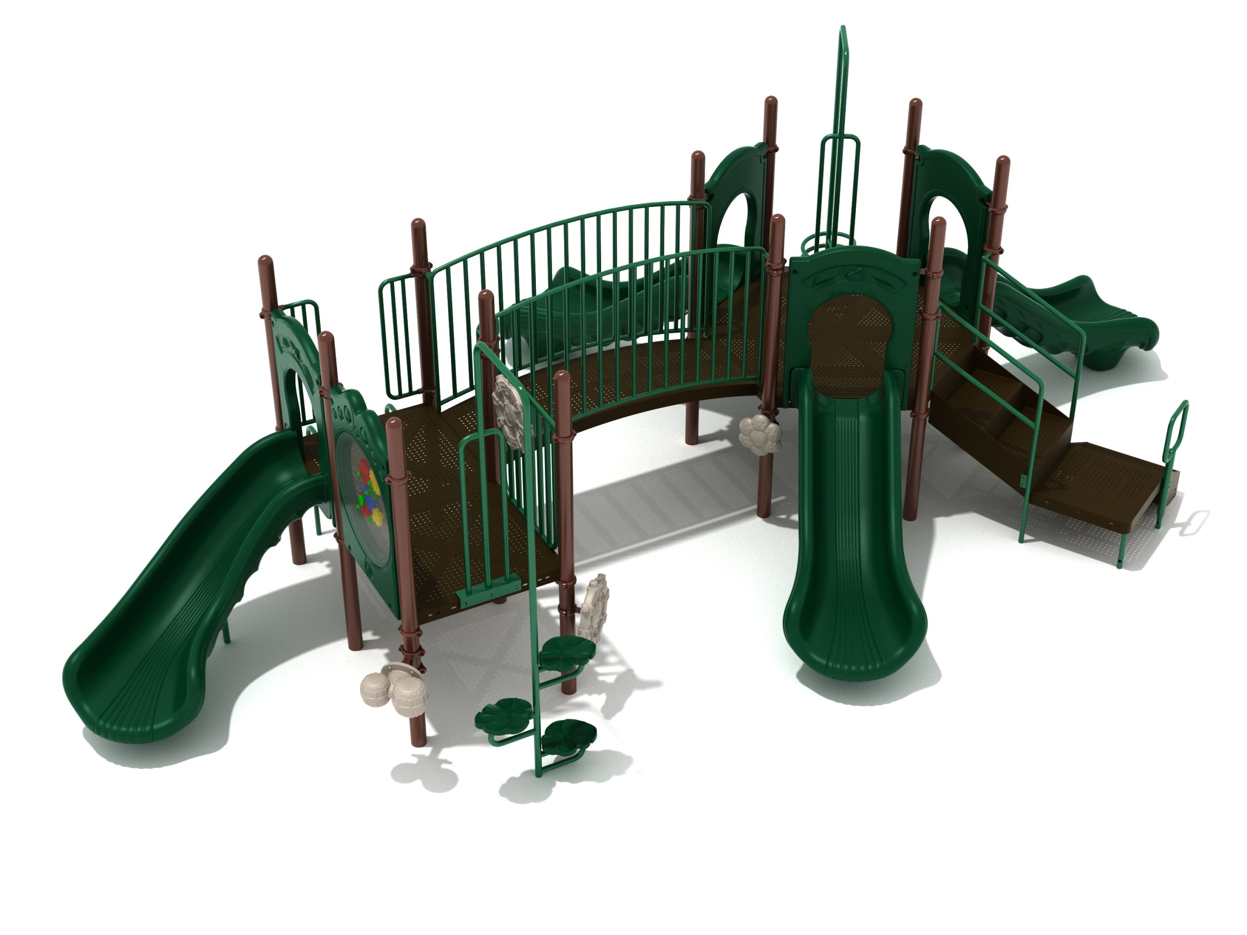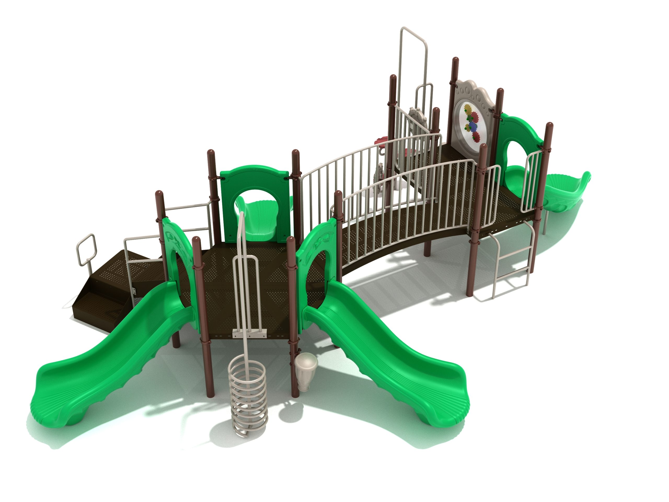 When you add the Eugene play structure to a playground or outdoor park, you can guarantee it will be a hit with the children thanks to the large number of activities to engage them. There’ll never be a long queue to go down a slide as there are four to choose from and an Arch Bridge connects the two sections. Three long Straight Slides emerge from a central hexagonal platform and on the other end of the structure there’s a Right Turn Slide to add something different to the sliding adventure. Climbing up onto the top platforms can also be done in numerous ways to inspire creativity. There’s the traditional Vertical Ladder or Transfer Station for smaller children, but more adventurous types will hop their way up on plant leaves with the Lotus Step Climber or wind their way up the Spiral Climber which improves both strength and climbing agility. Younger children will appreciate the range of features on the lower levels including the Gear Panel and Ship’s Wheel, both of which bring a sense of movement to the equipment. The Single Drum, Rain Wheel and Bongos add a welcomed sound element to the experience.