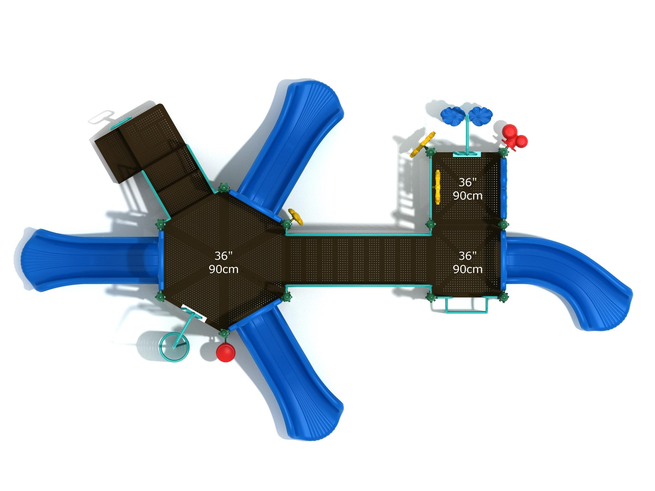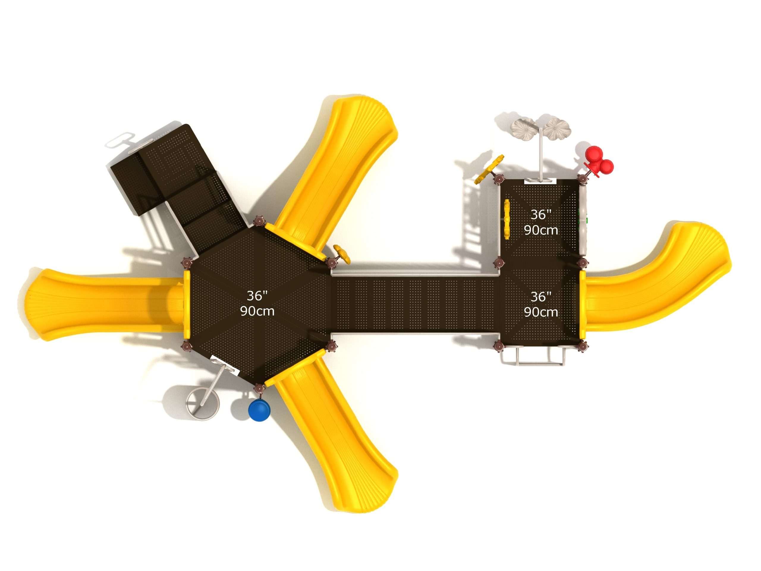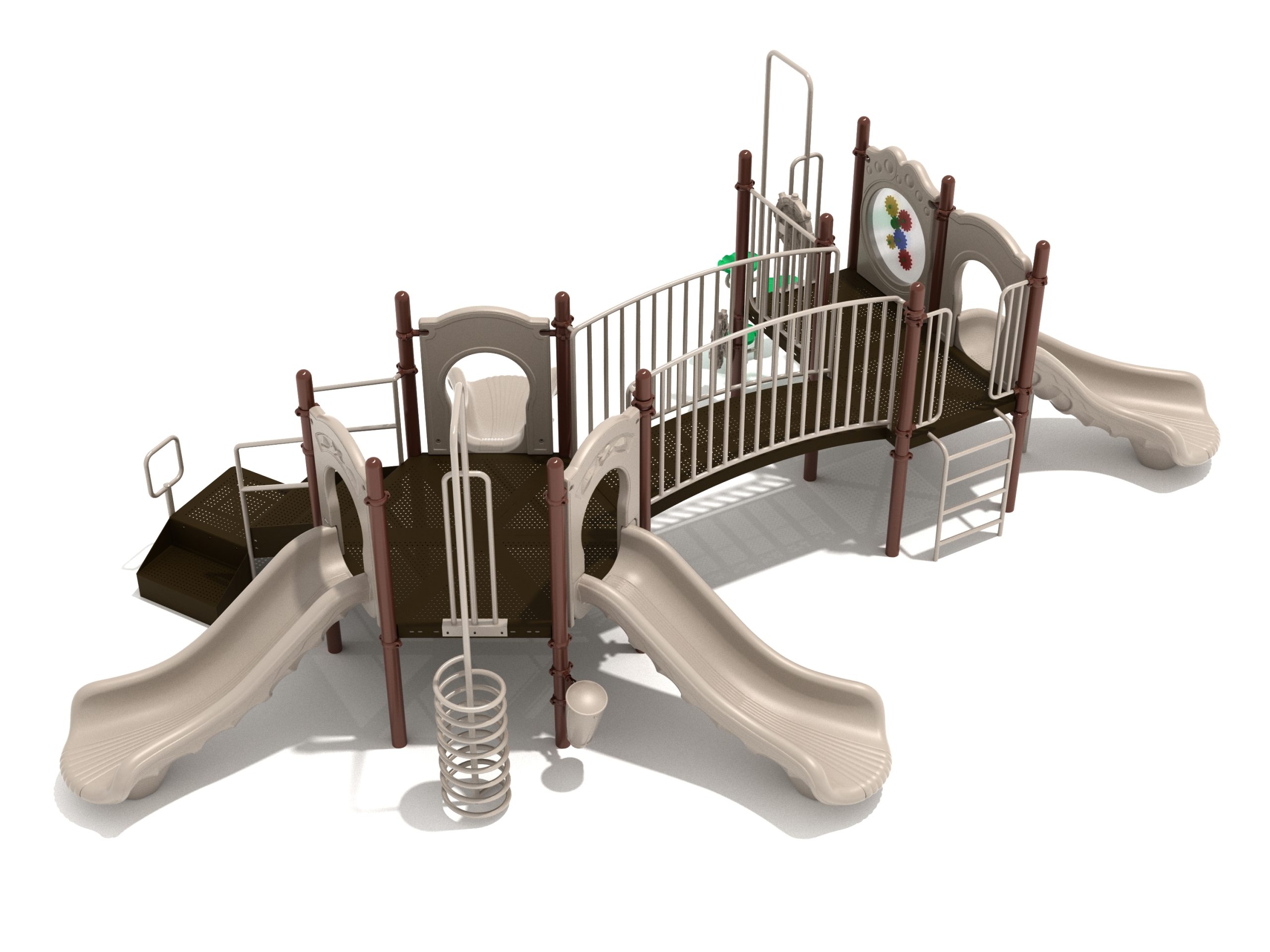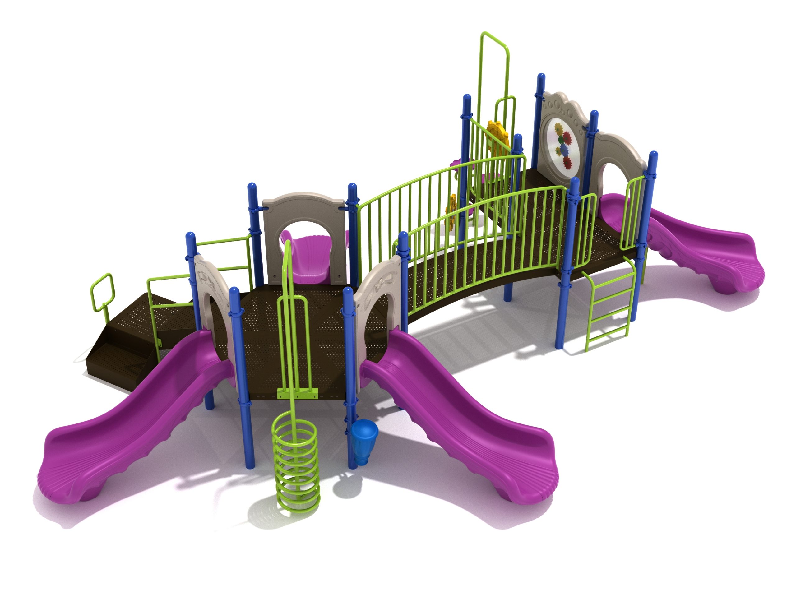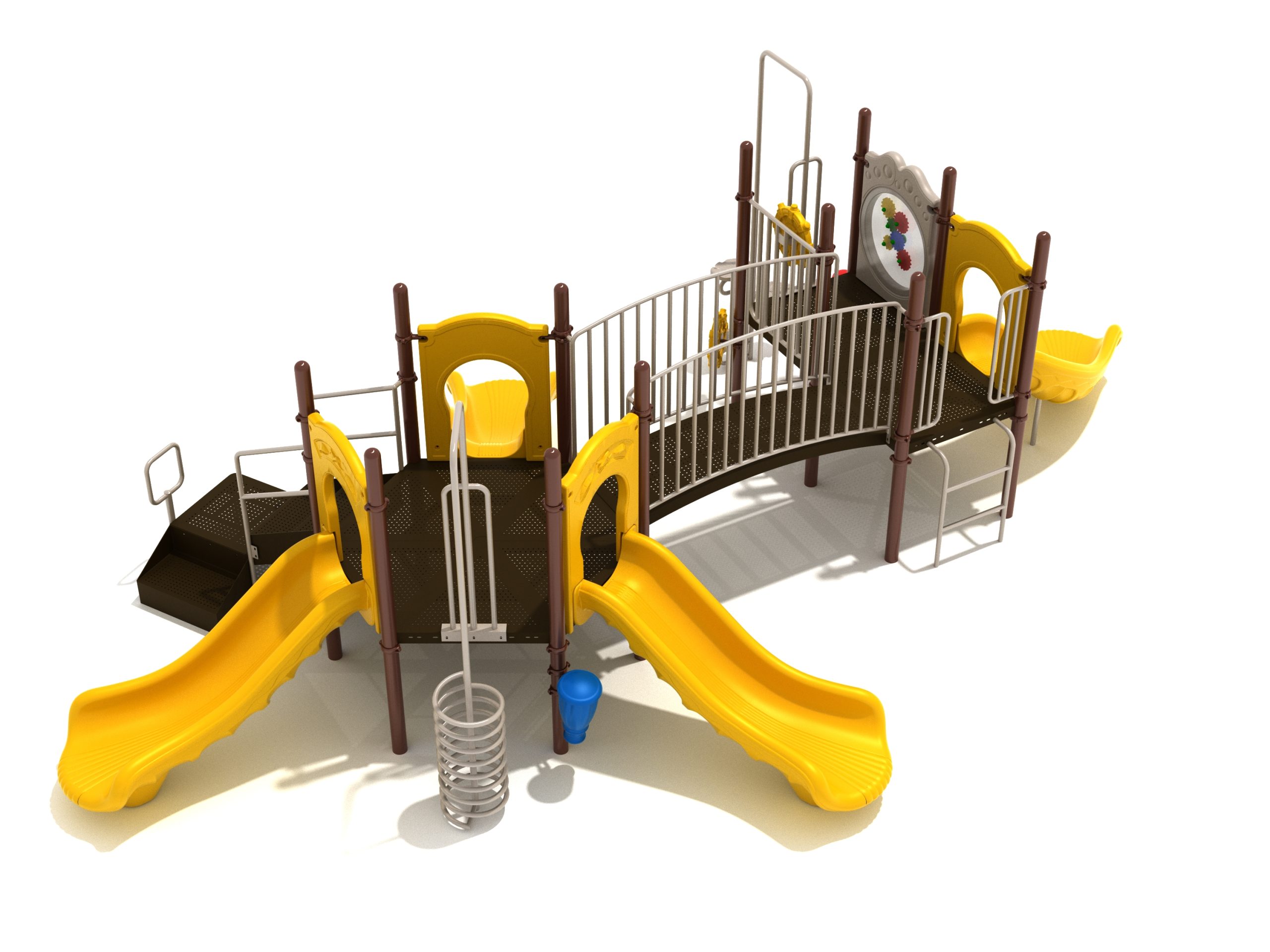 When you add the Eugene play structure to a playground or outdoor park, you can guarantee it will be a hit with the children thanks to the large number of activities to engage them. There’ll never be a long queue to go down a slide as there are four to choose from and an Arch Bridge connects the two sections. Three long Straight Slides emerge from a central hexagonal platform and on the other end of the structure there’s a Right Turn Slide to add something different to the sliding adventure. Climbing up onto the top platforms can also be done in numerous ways to inspire creativity. There’s the traditional Vertical Ladder or Transfer Station for smaller children, but more adventurous types will hop their way up on plant leaves with the Lotus Step Climber or wind their way up the Spiral Climber which improves both strength and climbing agility. Younger children will appreciate the range of features on the lower levels including the Gear Panel and Ship’s Wheel, both of which bring a sense of movement to the equipment. The Single Drum, Rain Wheel and Bongos add a welcomed sound element to the experience.