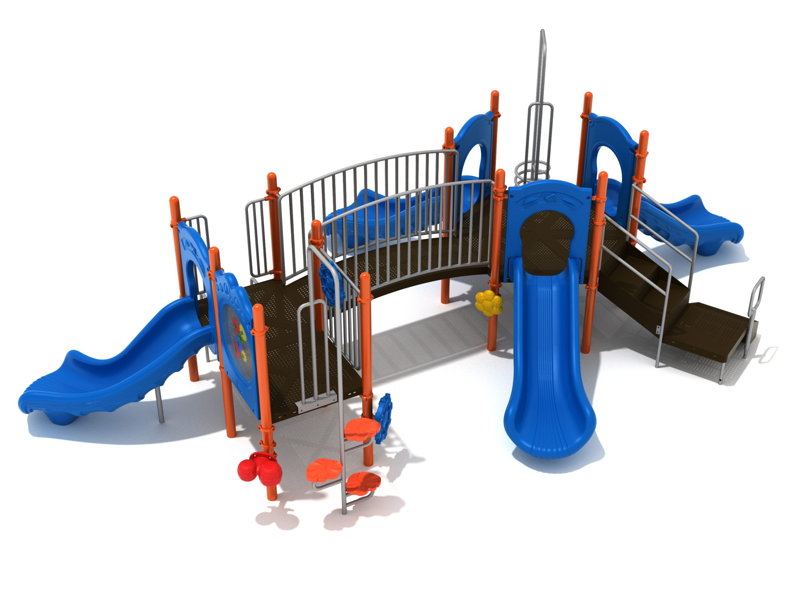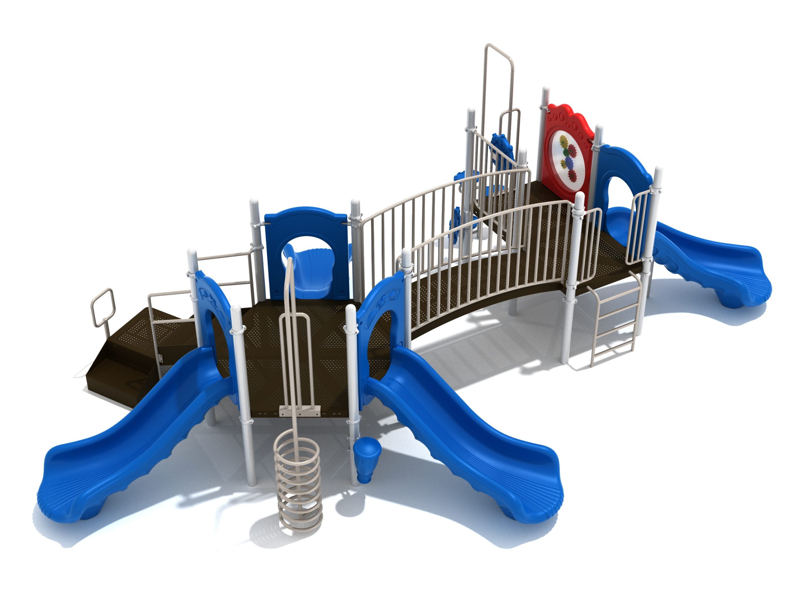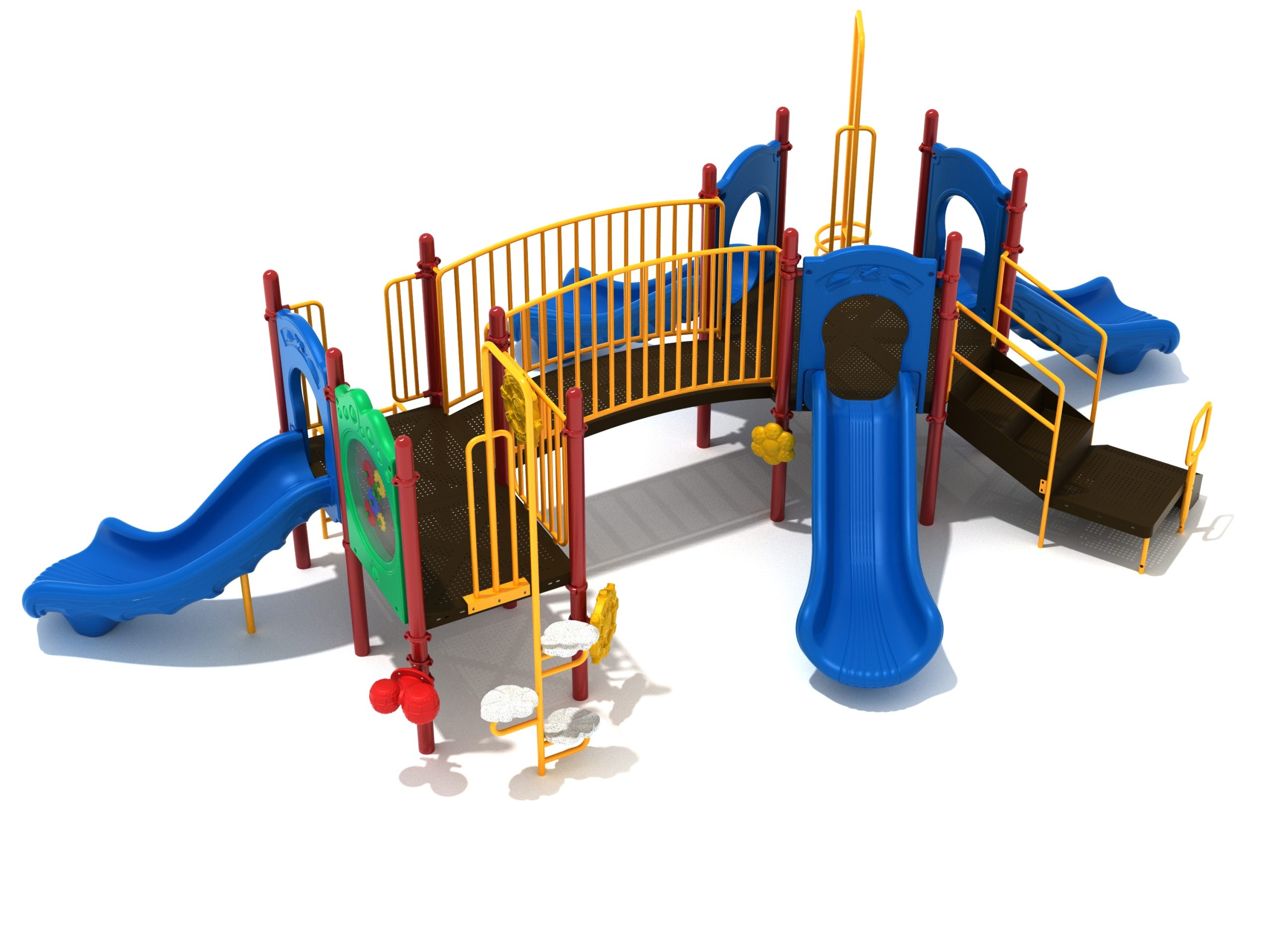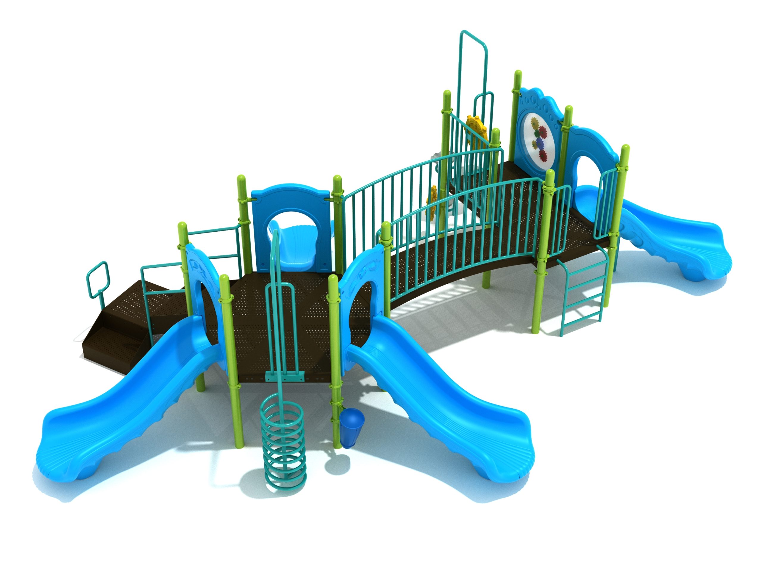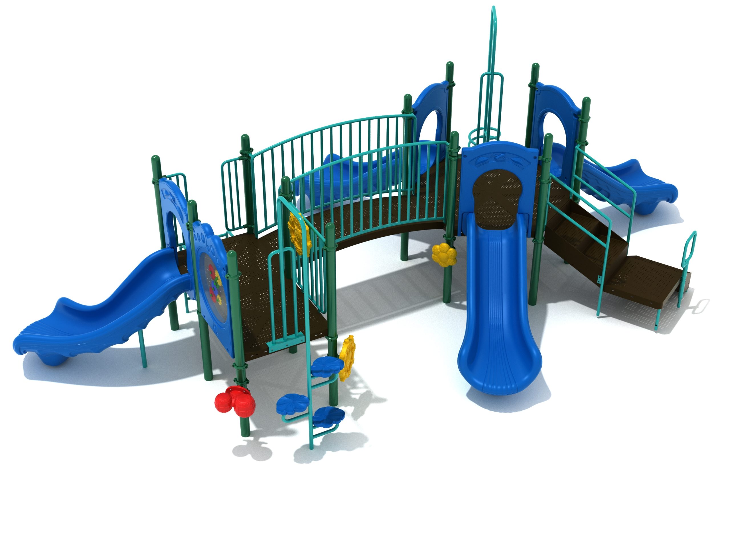 When you add the Eugene play structure to a playground or outdoor park, you can guarantee it will be a hit with the children thanks to the large number of activities to engage them. There’ll never be a long queue to go down a slide as there are four to choose from and an Arch Bridge connects the two sections. Three long Straight Slides emerge from a central hexagonal platform and on the other end of the structure there’s a Right Turn Slide to add something different to the sliding adventure. Climbing up onto the top platforms can also be done in numerous ways to inspire creativity. There’s the traditional Vertical Ladder or Transfer Station for smaller children, but more adventurous types will hop their way up on plant leaves with the Lotus Step Climber or wind their way up the Spiral Climber which improves both strength and climbing agility. Younger children will appreciate the range of features on the lower levels including the Gear Panel and Ship’s Wheel, both of which bring a sense of movement to the equipment. The Single Drum, Rain Wheel and Bongos add a welcomed sound element to the experience.