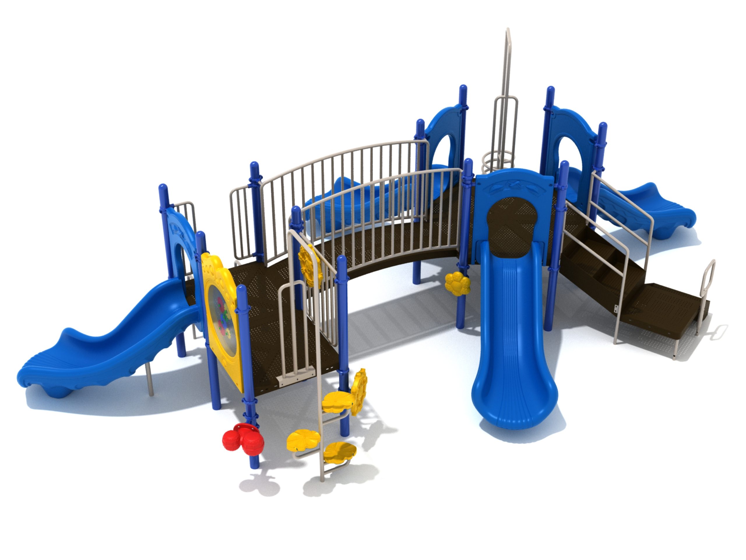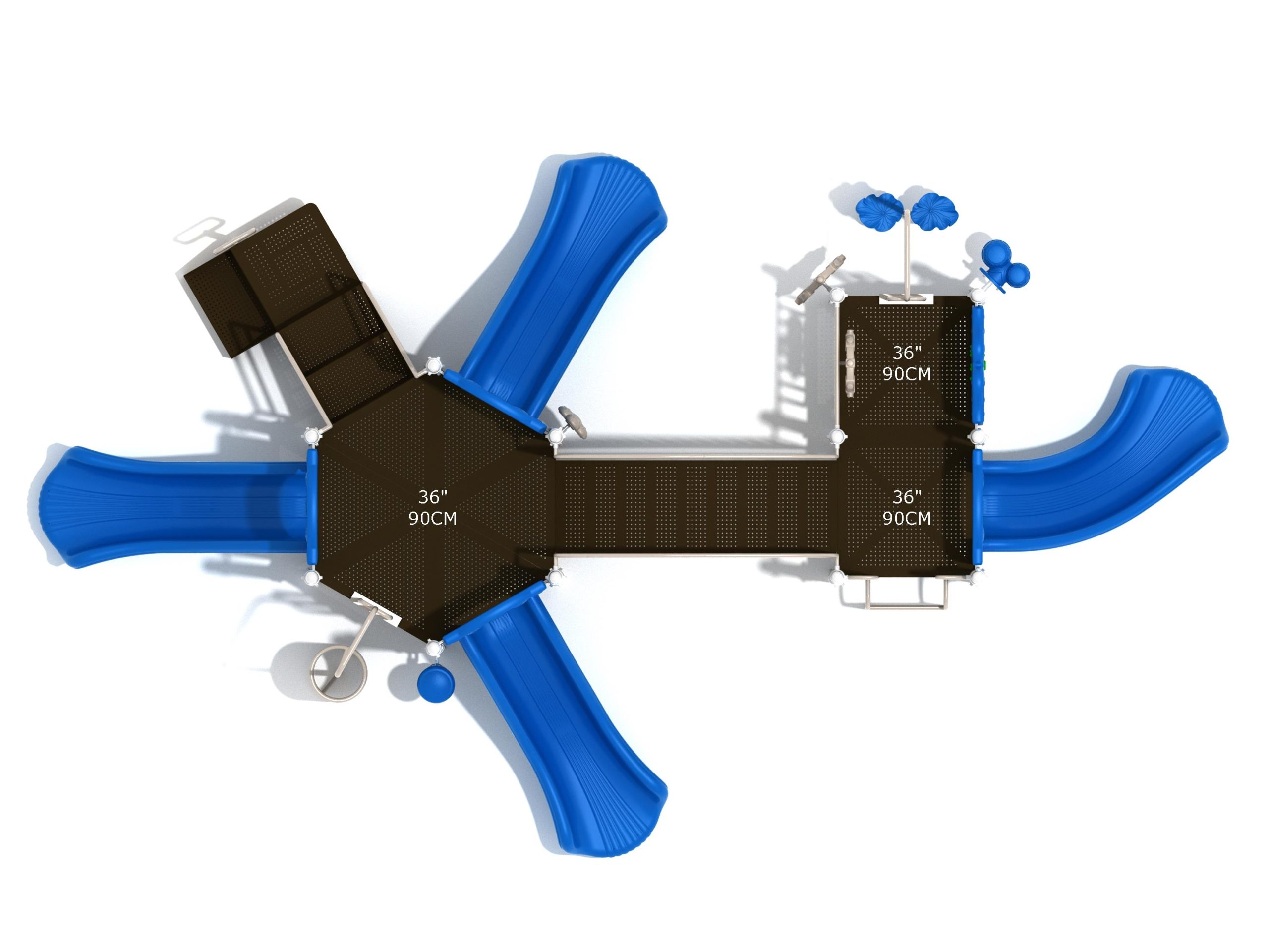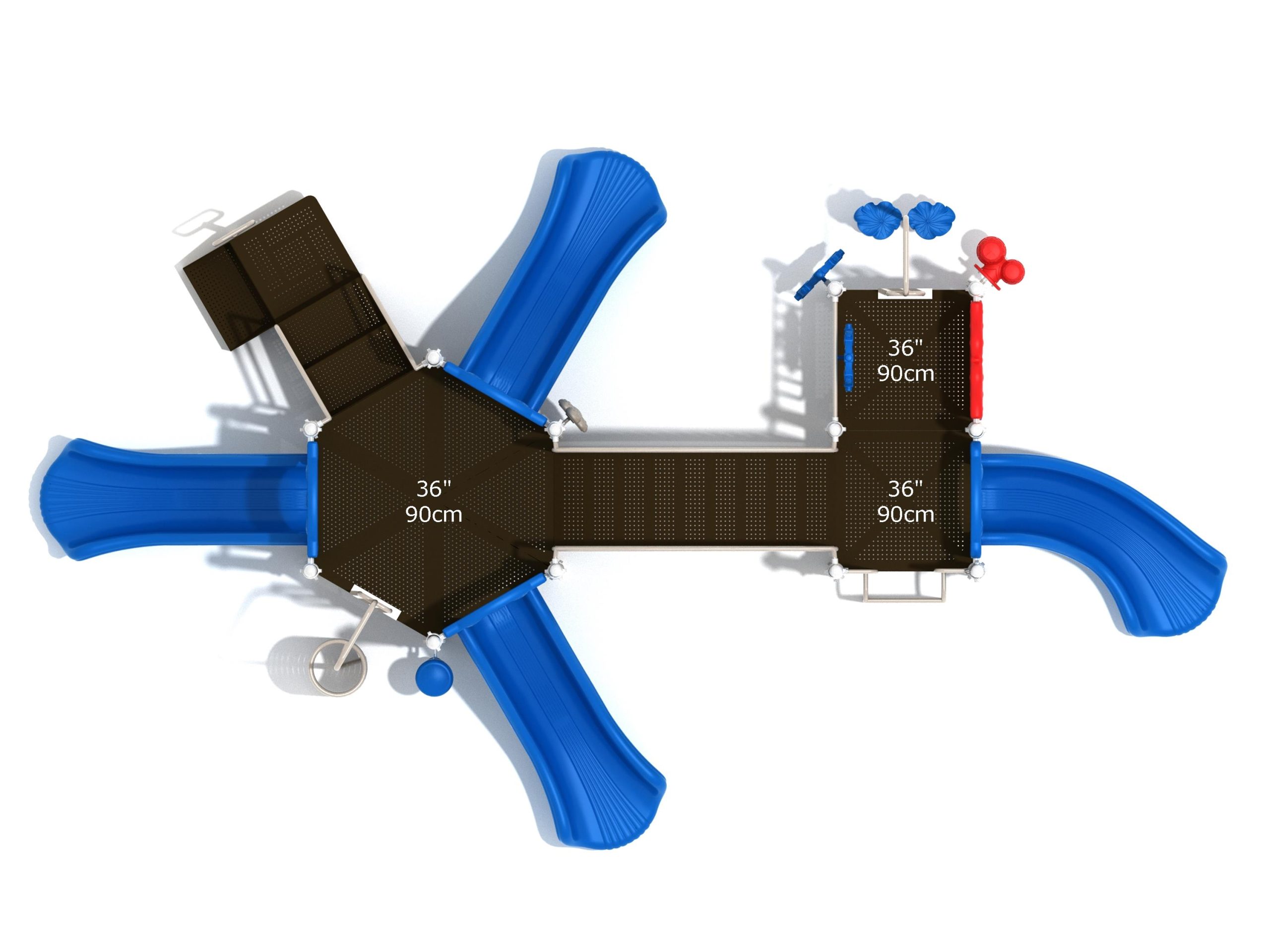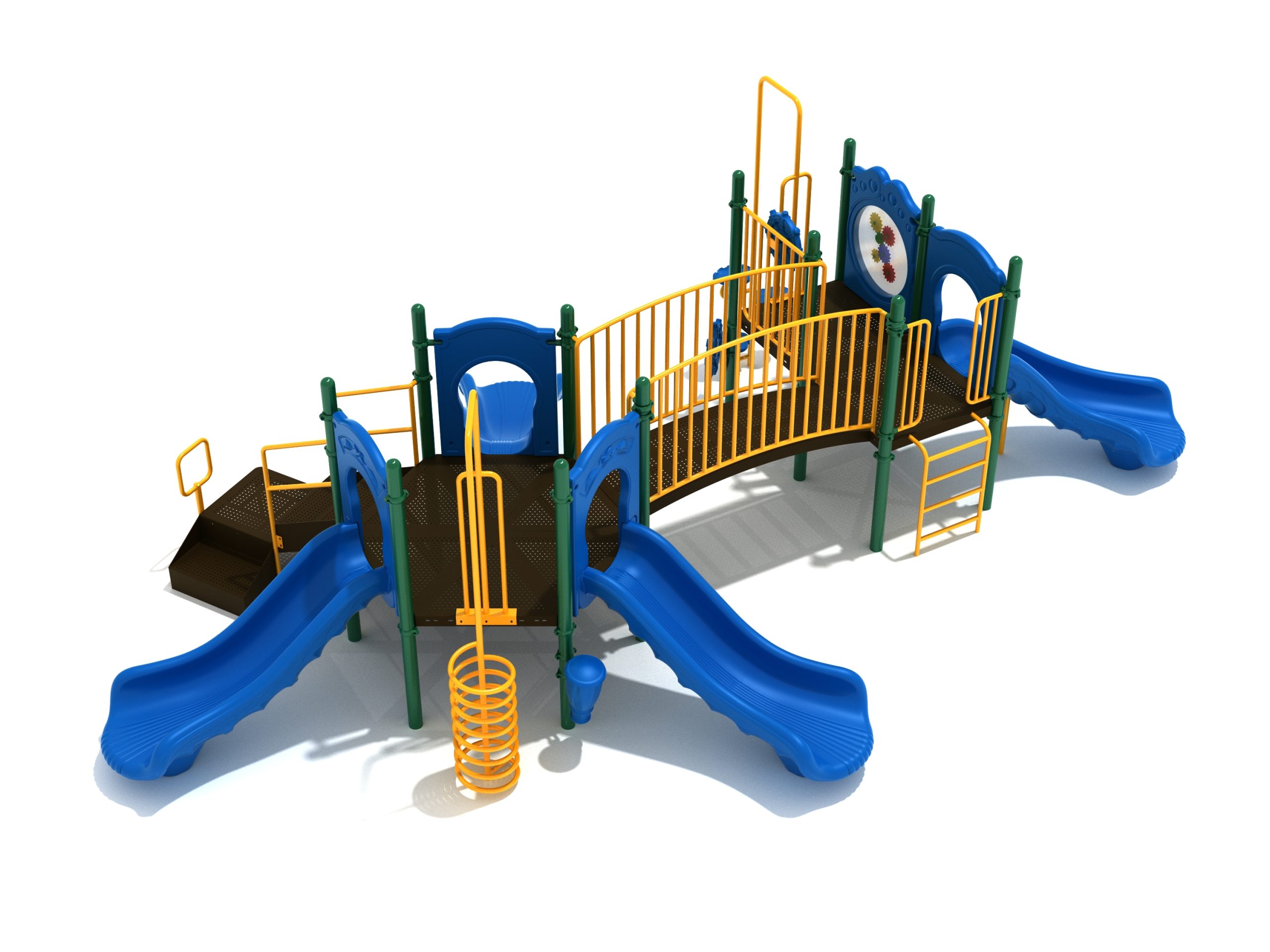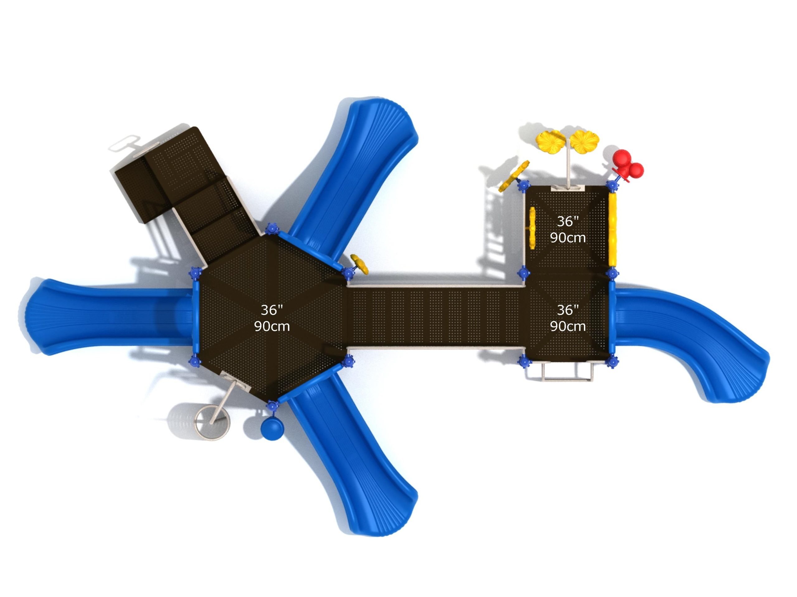 When you add the Eugene play structure to a playground or outdoor park, you can guarantee it will be a hit with the children thanks to the large number of activities to engage them. There’ll never be a long queue to go down a slide as there are four to choose from and an Arch Bridge connects the two sections. Three long Straight Slides emerge from a central hexagonal platform and on the other end of the structure there’s a Right Turn Slide to add something different to the sliding adventure. Climbing up onto the top platforms can also be done in numerous ways to inspire creativity. There’s the traditional Vertical Ladder or Transfer Station for smaller children, but more adventurous types will hop their way up on plant leaves with the Lotus Step Climber or wind their way up the Spiral Climber which improves both strength and climbing agility. Younger children will appreciate the range of features on the lower levels including the Gear Panel and Ship’s Wheel, both of which bring a sense of movement to the equipment. The Single Drum, Rain Wheel and Bongos add a welcomed sound element to the experience.