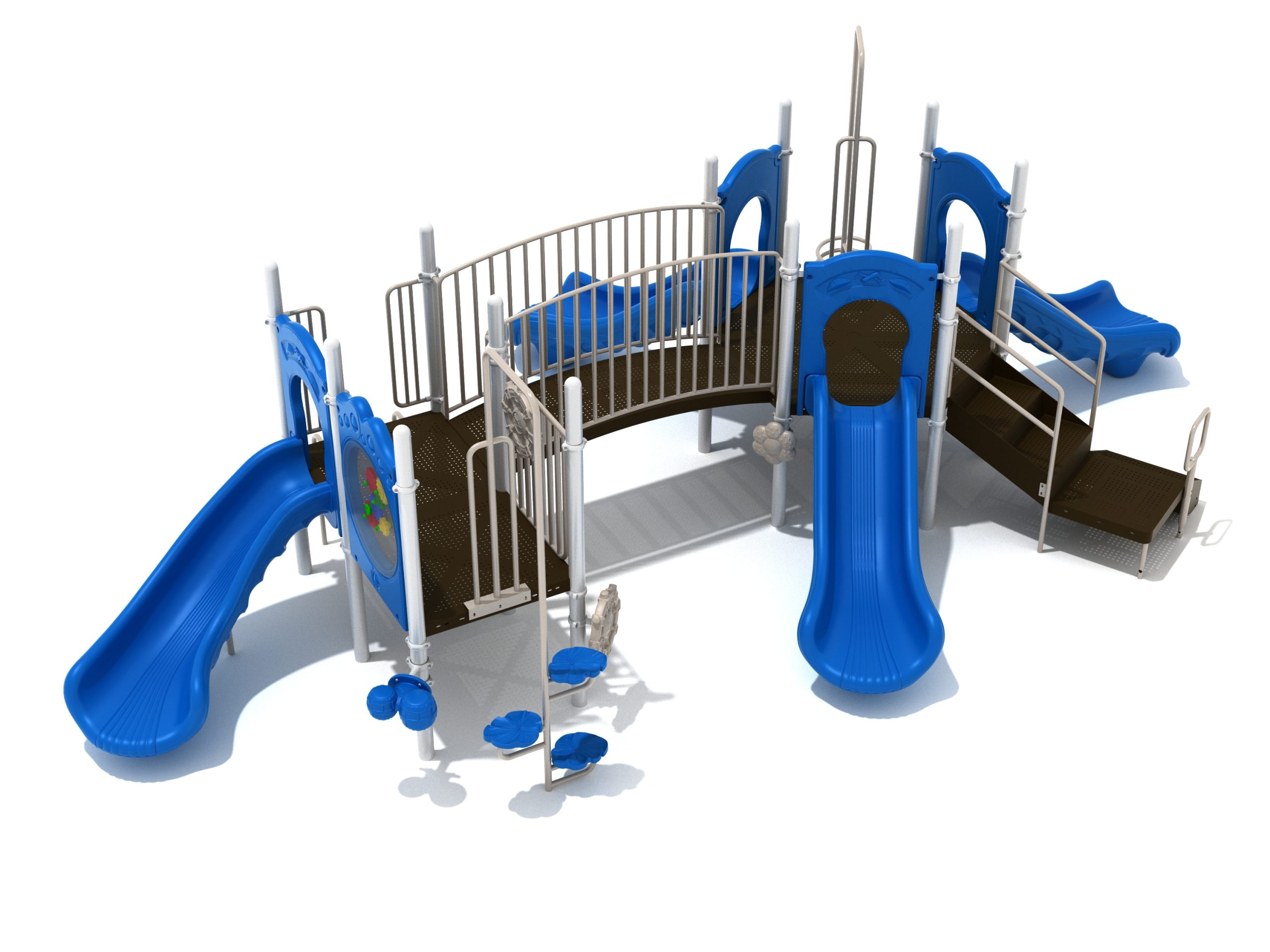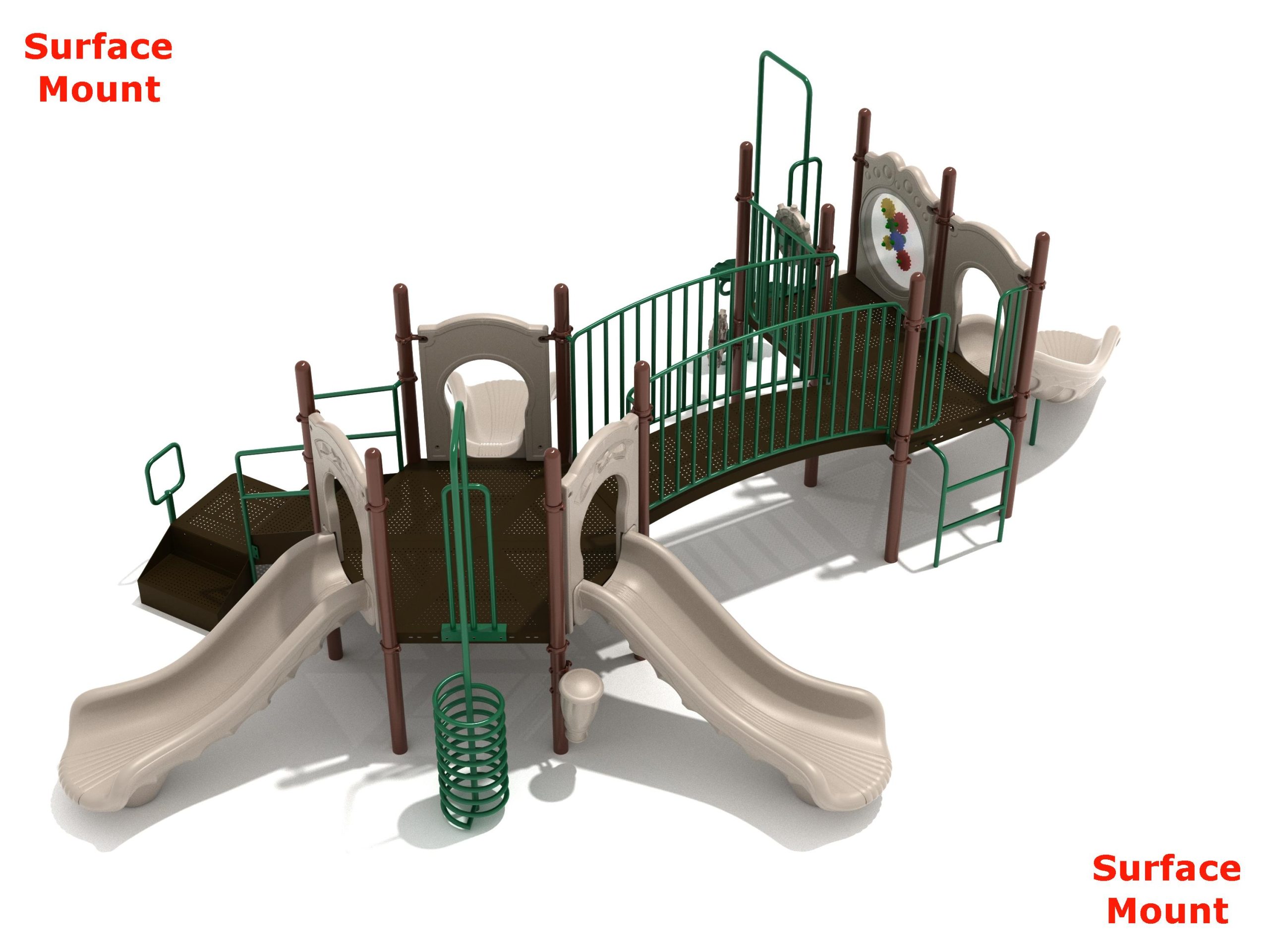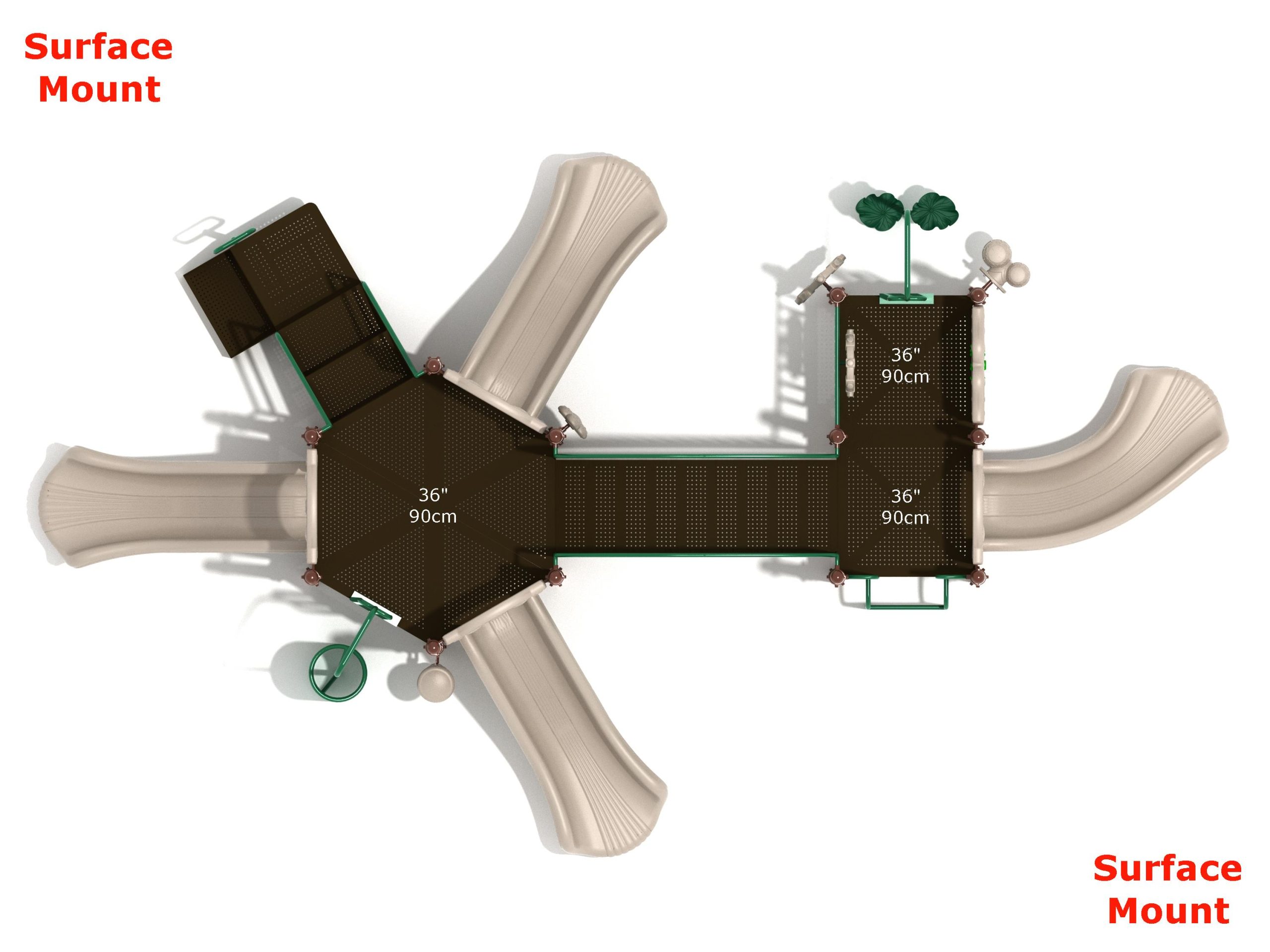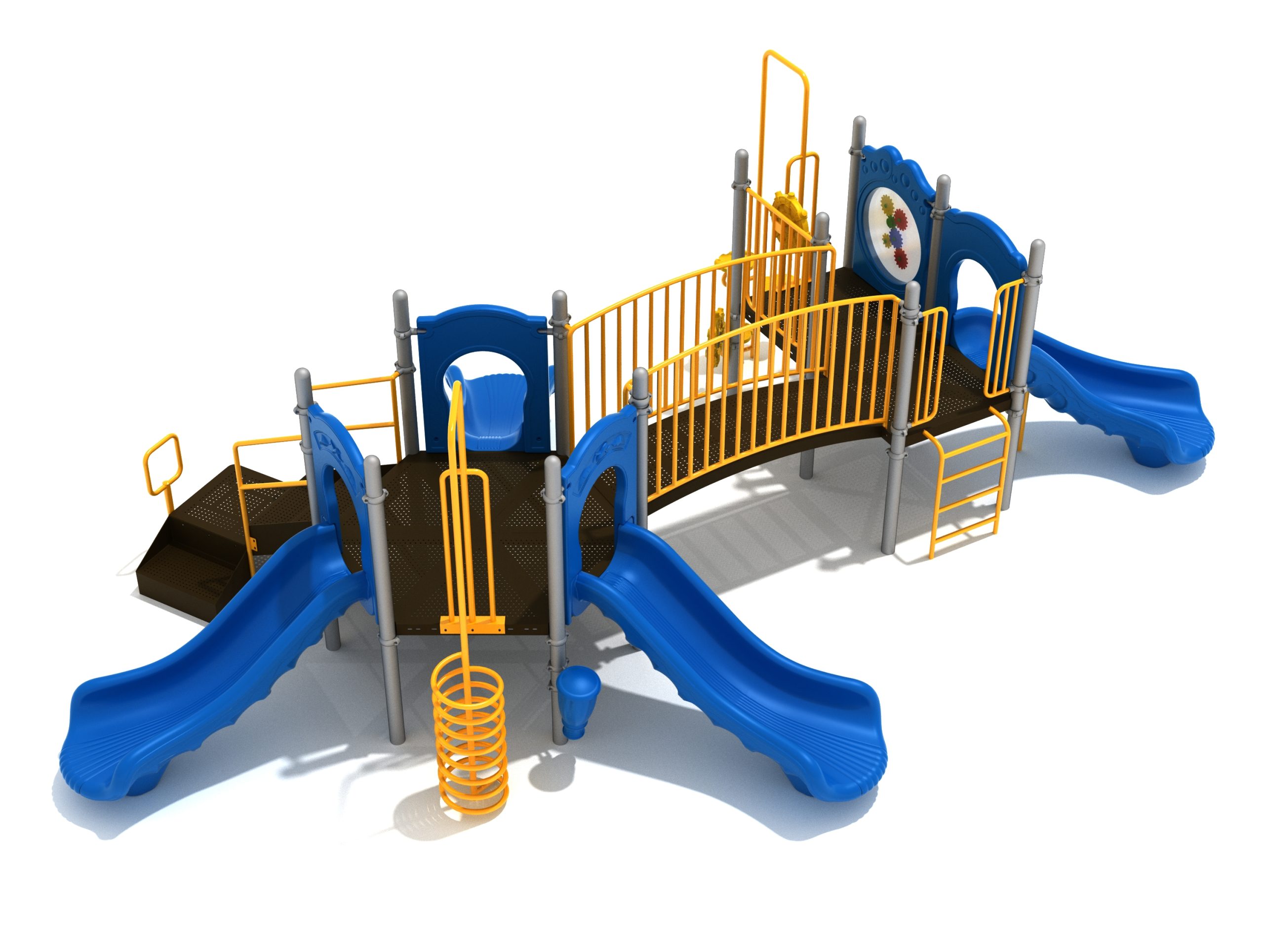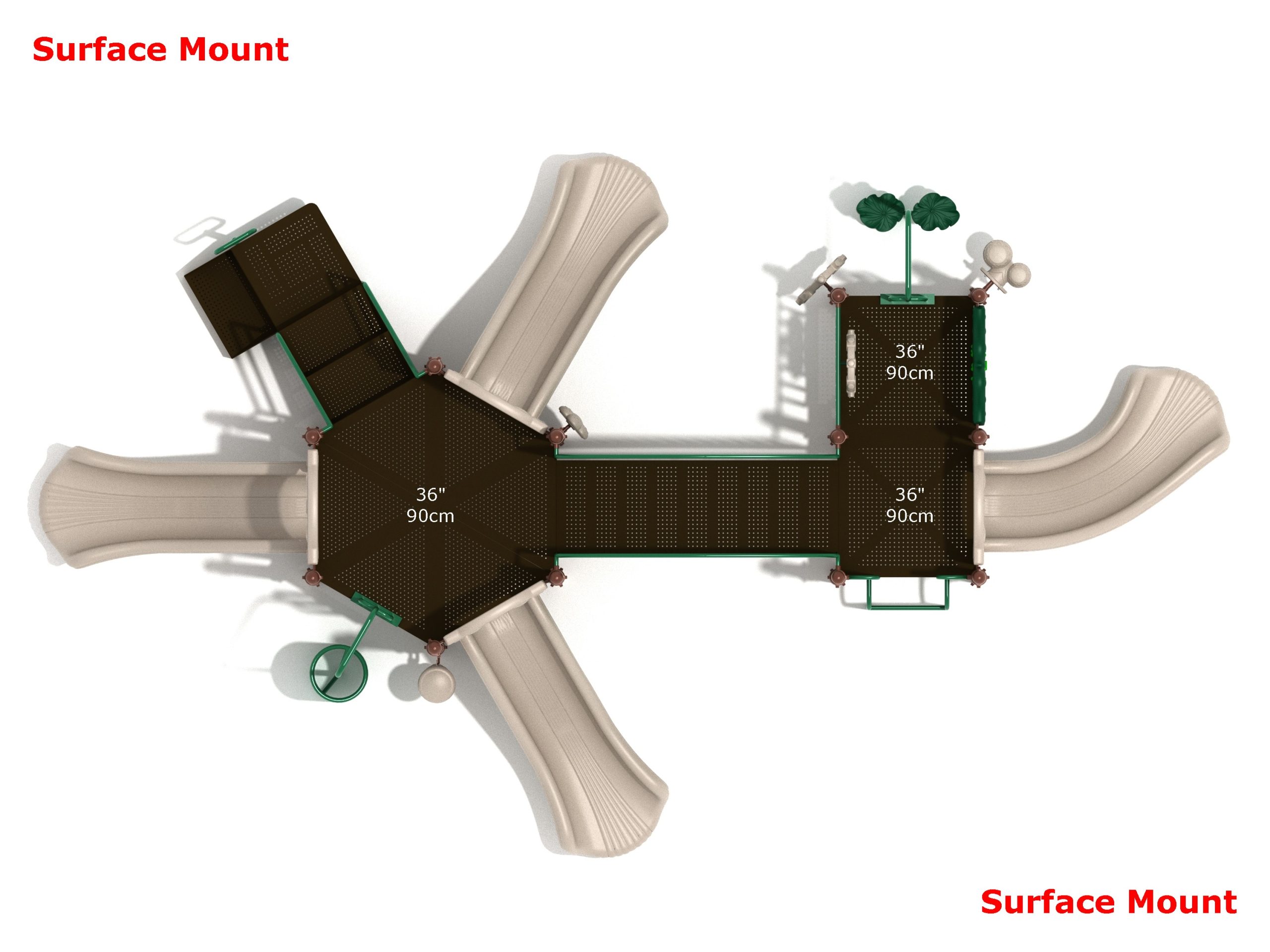 When you add the Eugene play structure to a playground or outdoor park, you can guarantee it will be a hit with the children thanks to the large number of activities to engage them. There’ll never be a long queue to go down a slide as there are four to choose from and an Arch Bridge connects the two sections. Three long Straight Slides emerge from a central hexagonal platform and on the other end of the structure there’s a Right Turn Slide to add something different to the sliding adventure. Climbing up onto the top platforms can also be done in numerous ways to inspire creativity. There’s the traditional Vertical Ladder or Transfer Station for smaller children, but more adventurous types will hop their way up on plant leaves with the Lotus Step Climber or wind their way up the Spiral Climber which improves both strength and climbing agility. Younger children will appreciate the range of features on the lower levels including the Gear Panel and Ship’s Wheel, both of which bring a sense of movement to the equipment. The Single Drum, Rain Wheel and Bongos add a welcomed sound element to the experience.