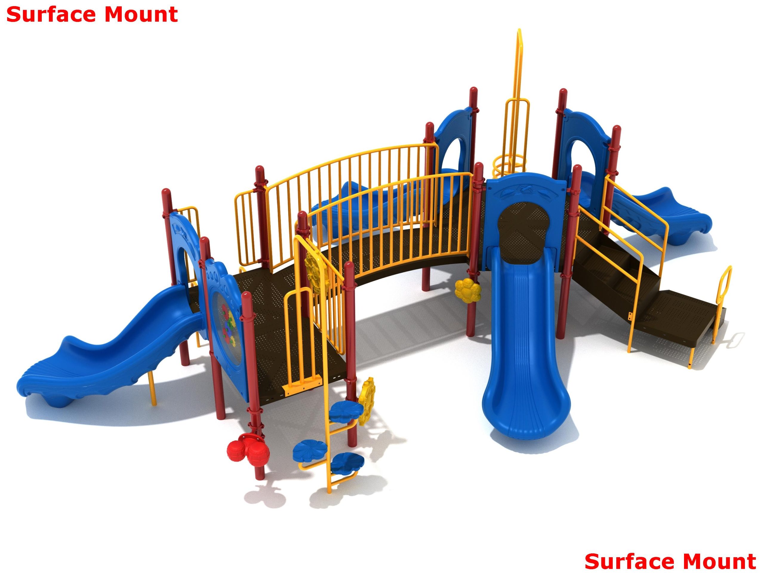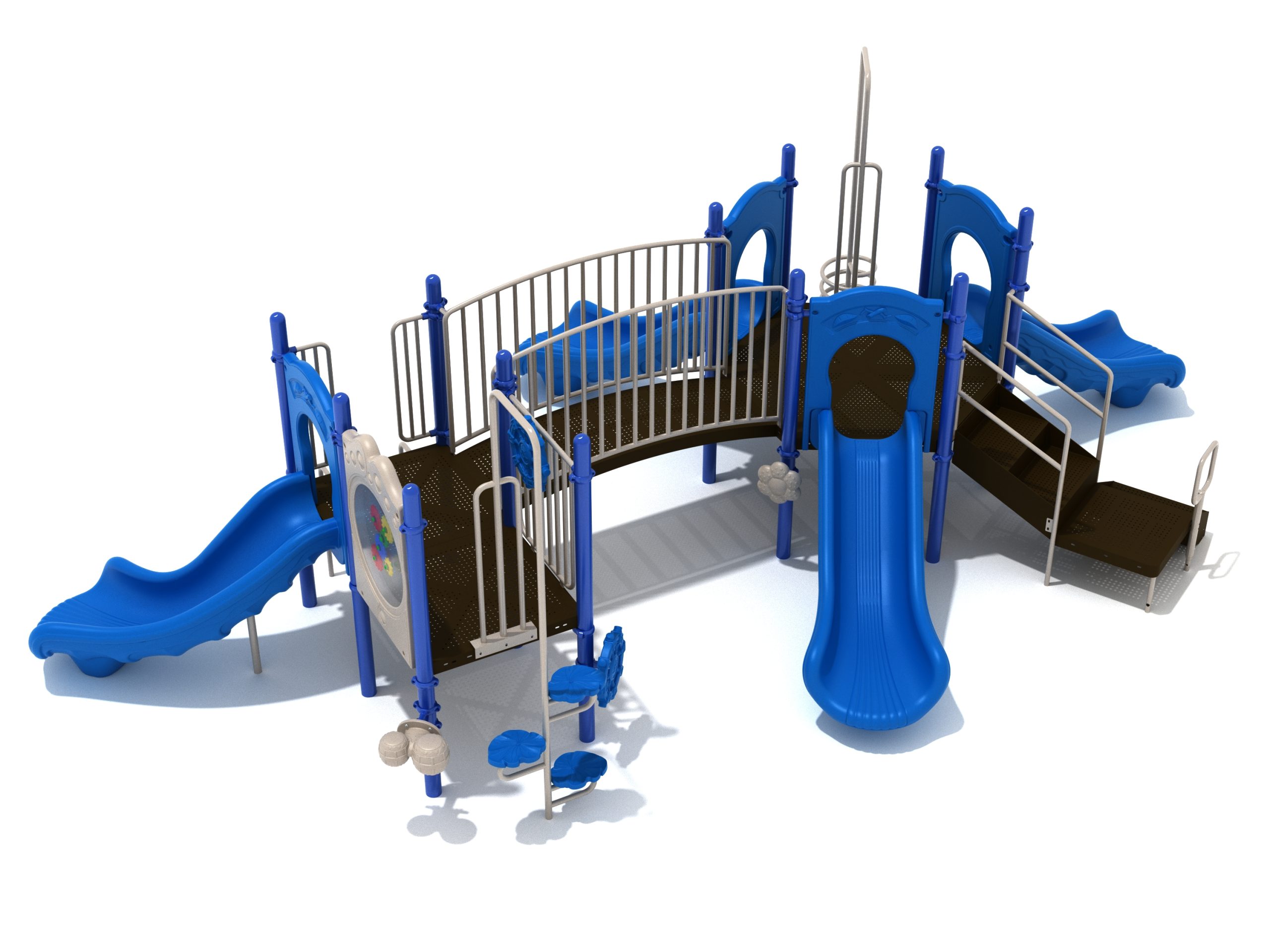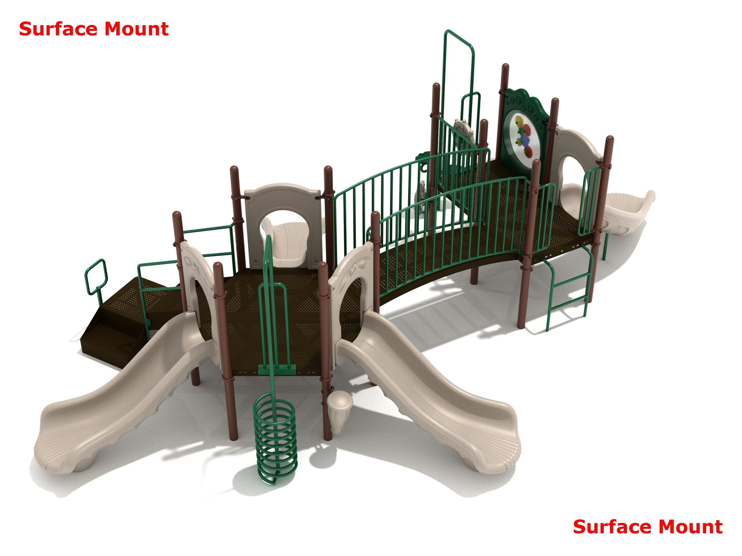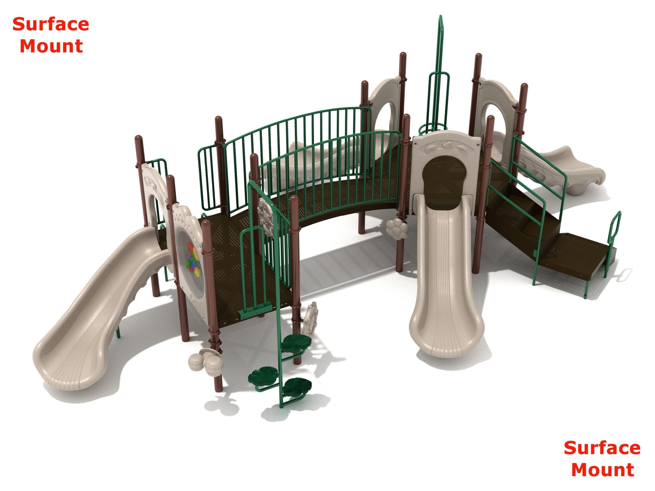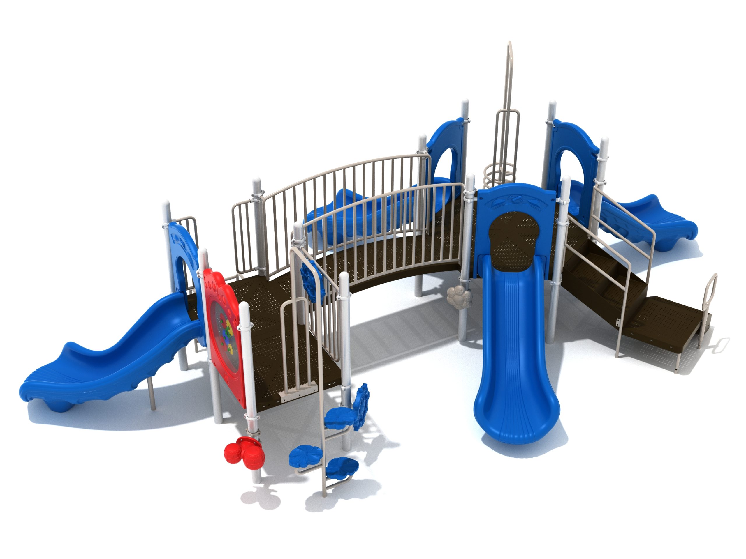 When you add the Eugene play structure to a playground or outdoor park, you can guarantee it will be a hit with the children thanks to the large number of activities to engage them. There’ll never be a long queue to go down a slide as there are four to choose from and an Arch Bridge connects the two sections. Three long Straight Slides emerge from a central hexagonal platform and on the other end of the structure there’s a Right Turn Slide to add something different to the sliding adventure. Climbing up onto the top platforms can also be done in numerous ways to inspire creativity. There’s the traditional Vertical Ladder or Transfer Station for smaller children, but more adventurous types will hop their way up on plant leaves with the Lotus Step Climber or wind their way up the Spiral Climber which improves both strength and climbing agility. Younger children will appreciate the range of features on the lower levels including the Gear Panel and Ship’s Wheel, both of which bring a sense of movement to the equipment. The Single Drum, Rain Wheel and Bongos add a welcomed sound element to the experience.
