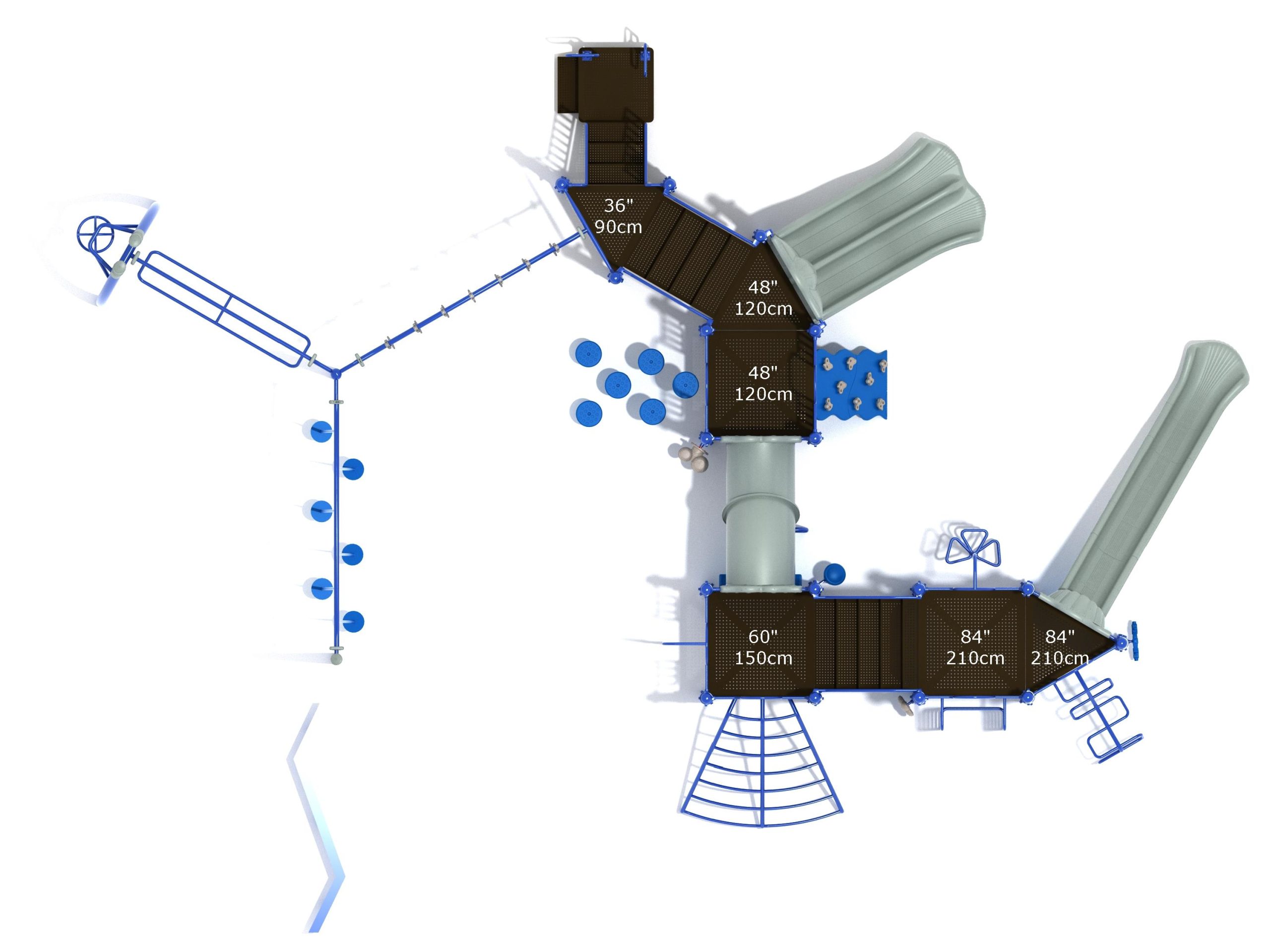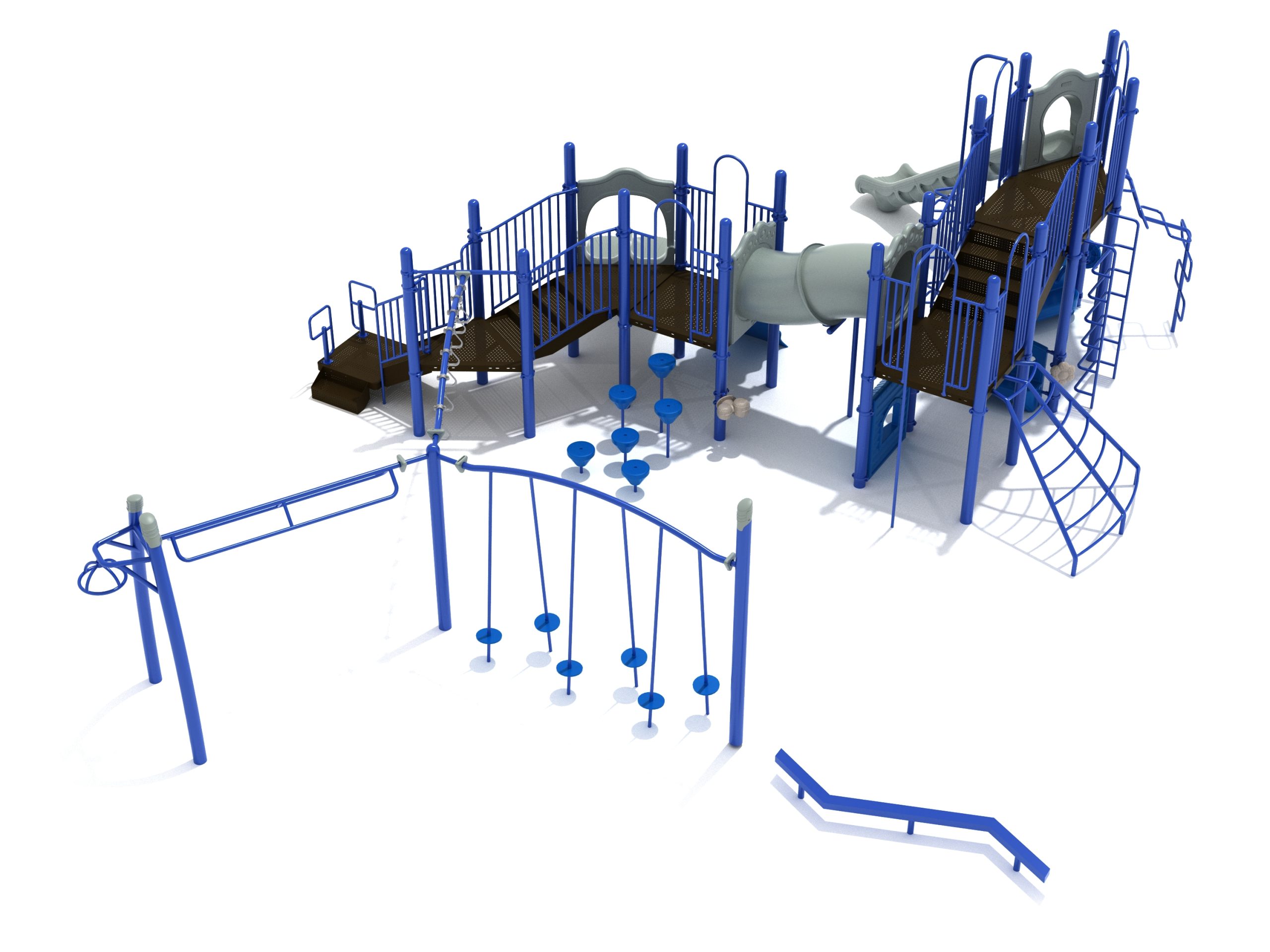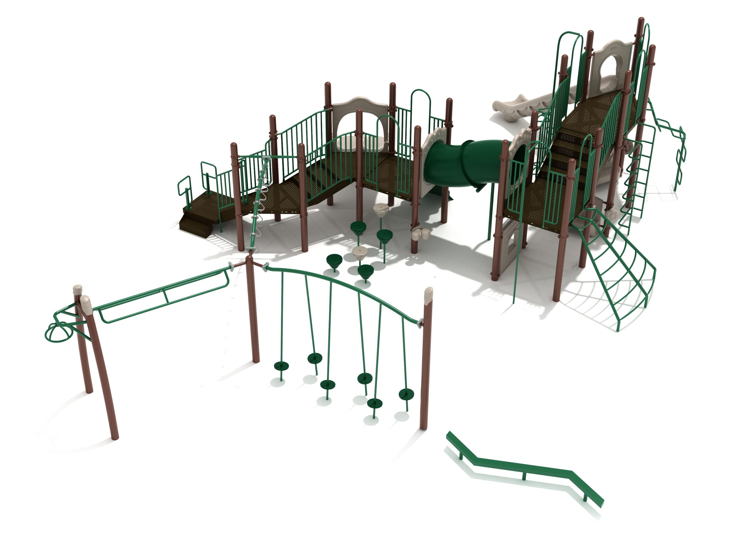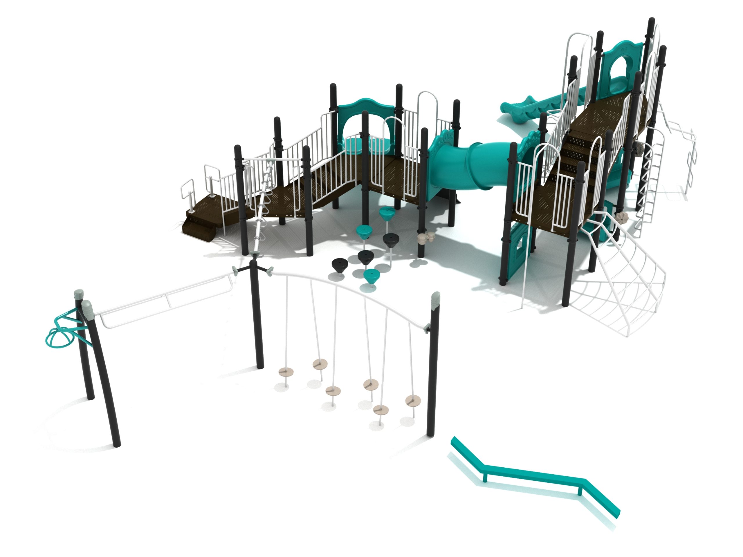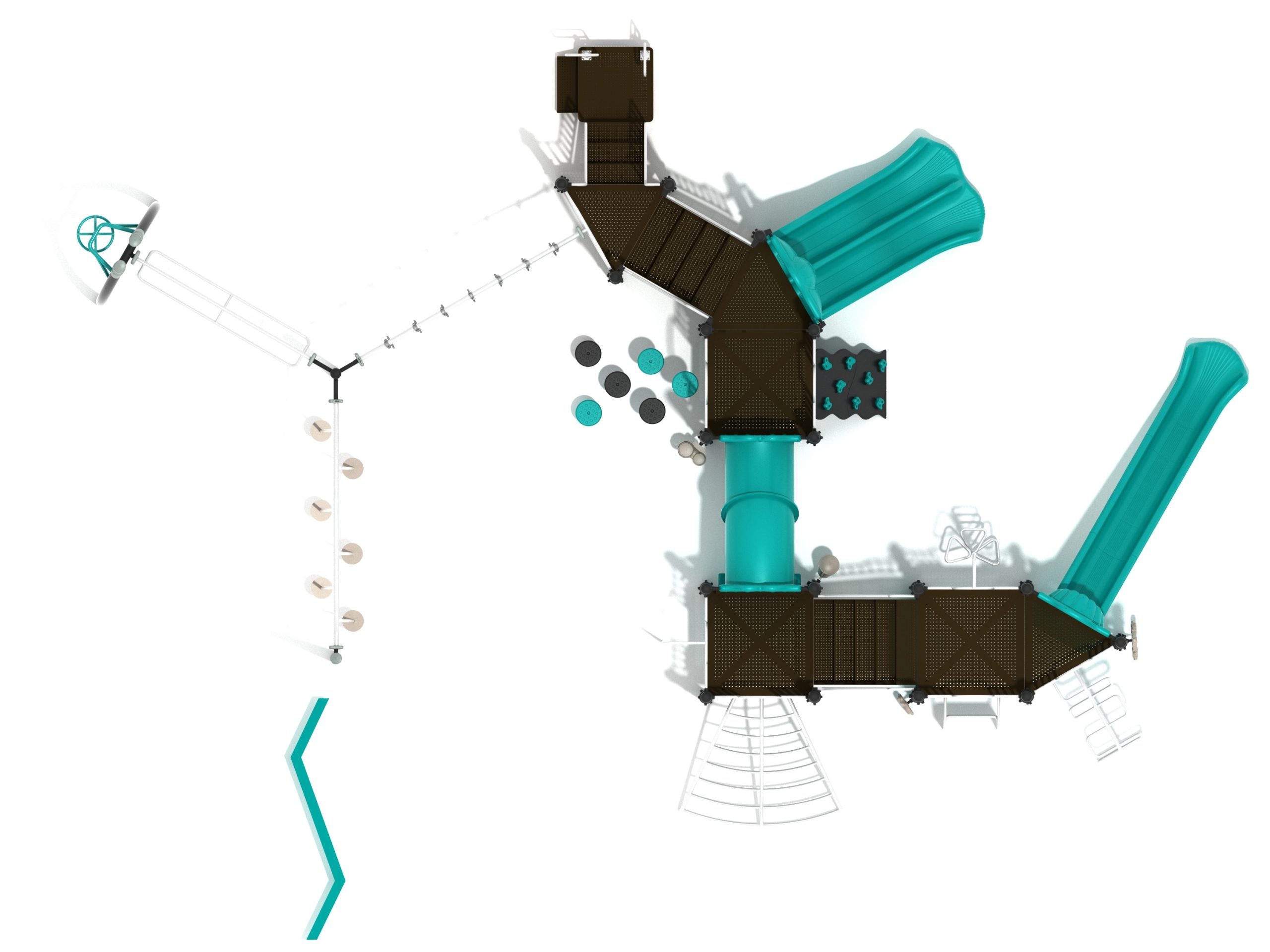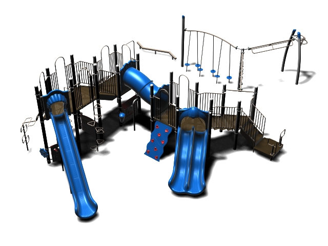 The Foraker playset has everything a child could dream of when it comes to play equipment. Watch as they carefully coordinate themselves to cross the Balance Beam before summoning their strength, flexibility and ingenuity to tackle the Tilted Lily Pad Bridge. To reach the twisting fun of the Overhead Spinner kids must successfully navigate their way up the Rocker Bar Overhead Climber which tilts back and forth with every swing. The Curved Overhead Swinging Ring Ladder is slightly sloping upwards which makes the task of getting to the main structure even more difficult and challenging. On the main structure the fun continues with a Double Wave Slide, a Straight Slide and a Fireman Pole to get down, and multiple adventurous ways to climb up to build strength and motor skills including a Wavy Rock Climbing Wall, a Clover Climber, a Wavy Snake Climber, a Fan Ladder with parallel bars and a 6-step Pebble Climber. Younger children will appreciate the Incline Tube Bridge as well as two Bench Panels, a Ship’s Wheel for watery adventures and a Single Drum to bang on.