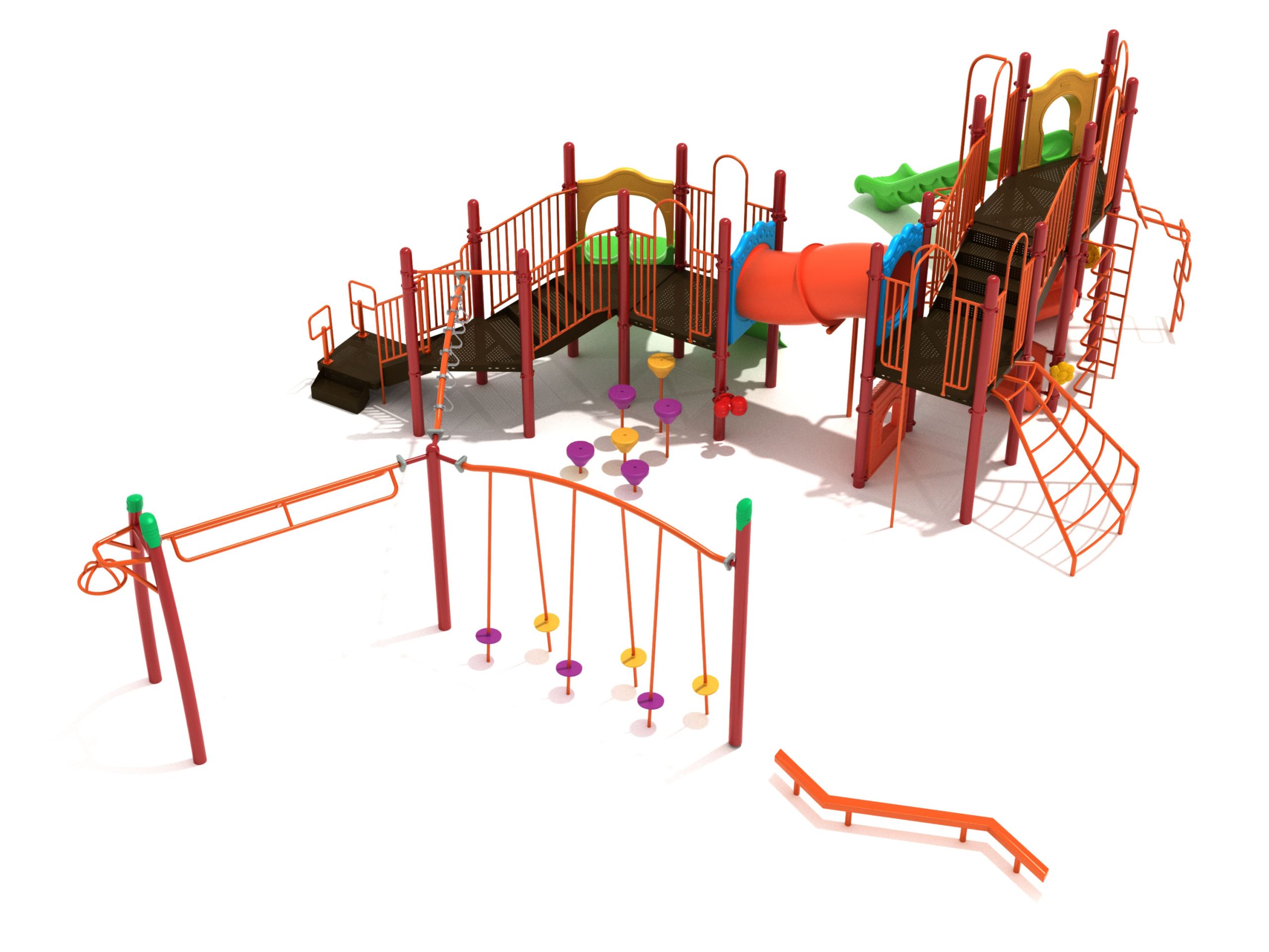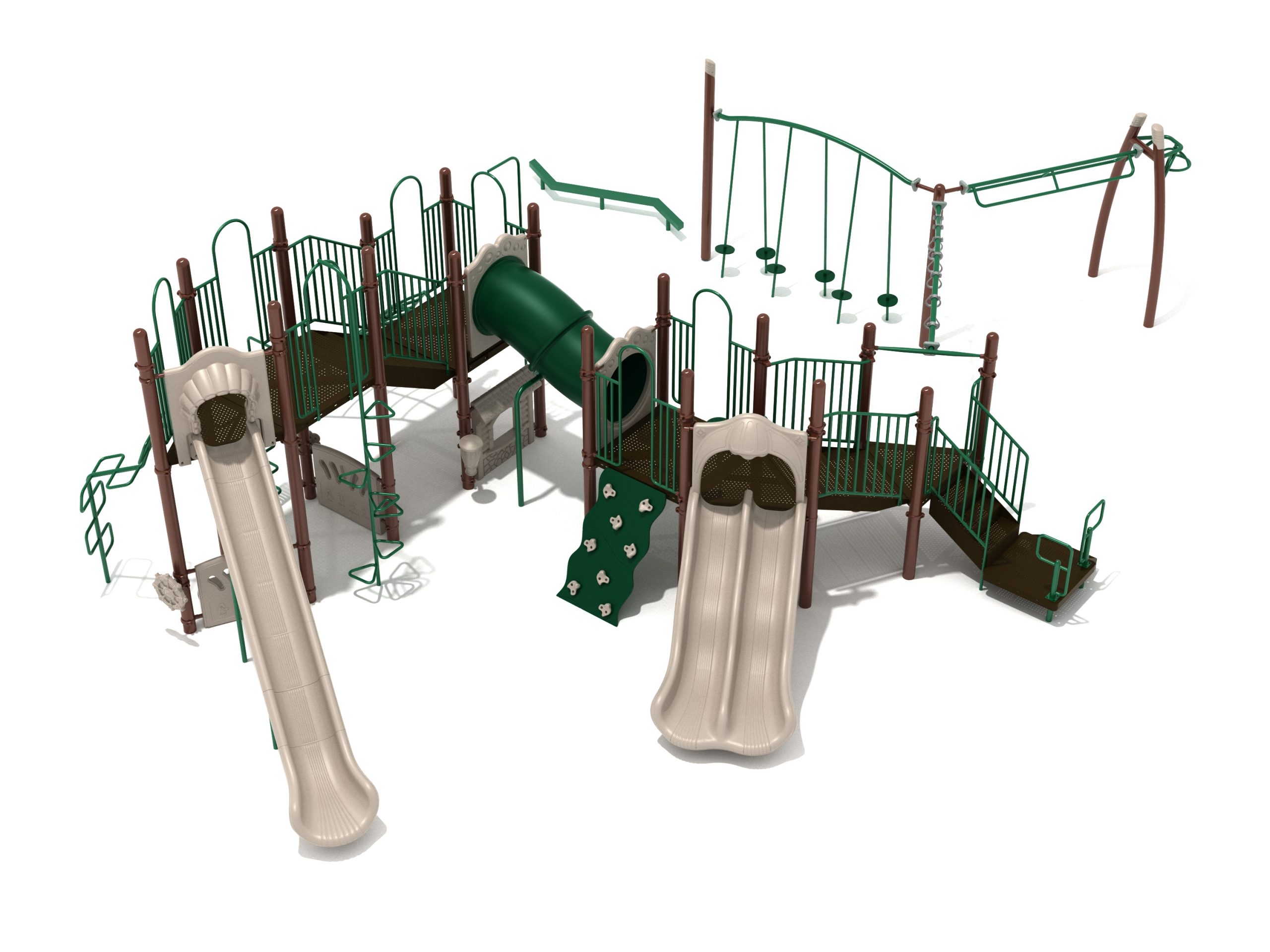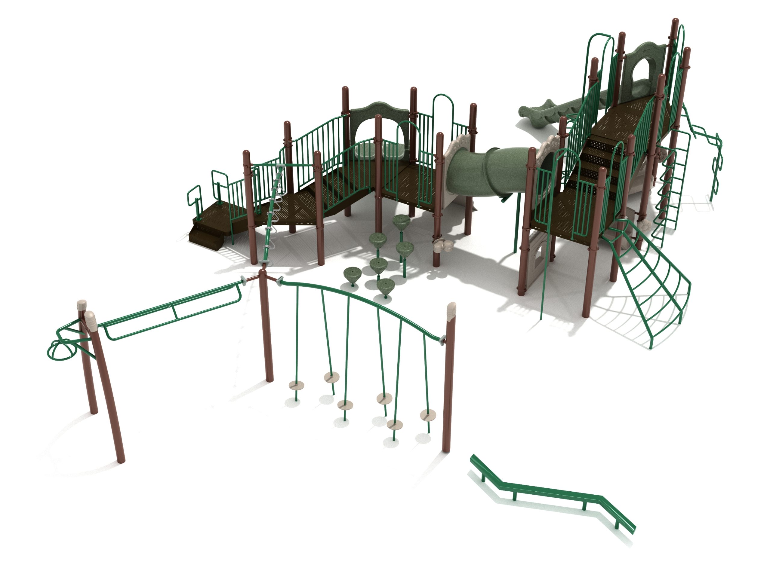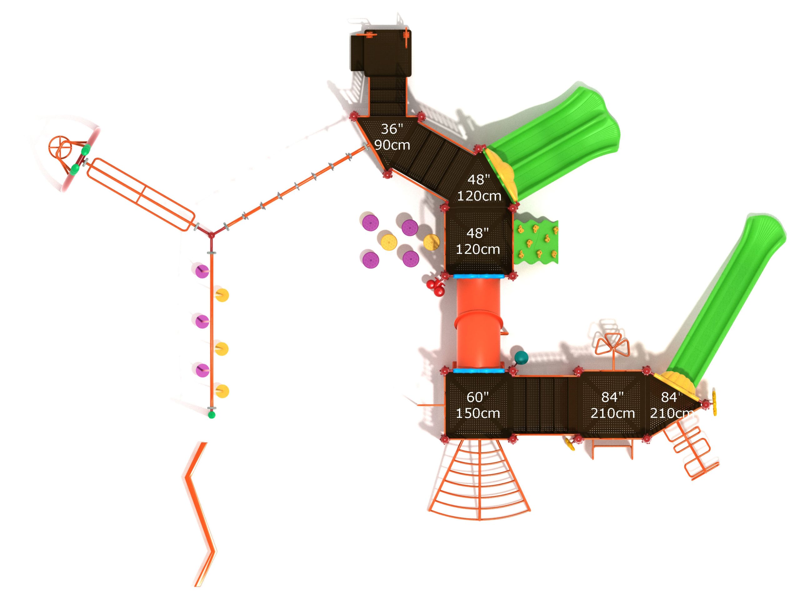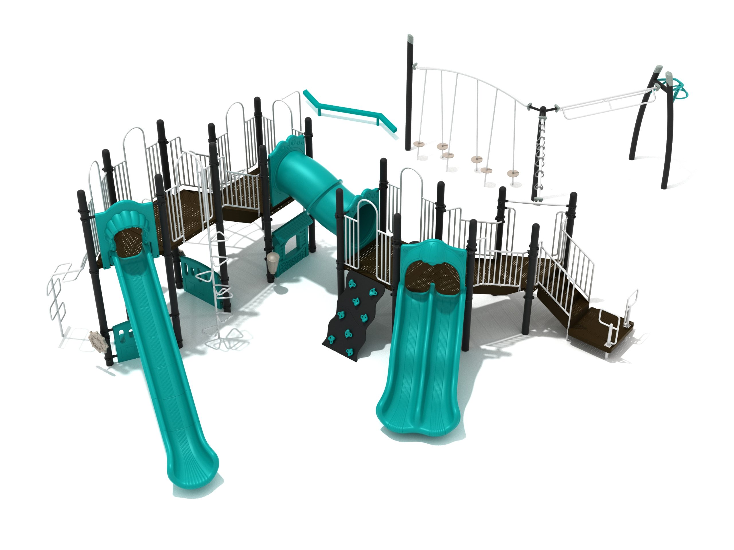 The Foraker playset has everything a child could dream of when it comes to play equipment. Watch as they carefully coordinate themselves to cross the Balance Beam before summoning their strength, flexibility and ingenuity to tackle the Tilted Lily Pad Bridge. To reach the twisting fun of the Overhead Spinner kids must successfully navigate their way up the Rocker Bar Overhead Climber which tilts back and forth with every swing. The Curved Overhead Swinging Ring Ladder is slightly sloping upwards which makes the task of getting to the main structure even more difficult and challenging. On the main structure the fun continues with a Double Wave Slide, a Straight Slide and a Fireman Pole to get down, and multiple adventurous ways to climb up to build strength and motor skills including a Wavy Rock Climbing Wall, a Clover Climber, a Wavy Snake Climber, a Fan Ladder with parallel bars and a 6-step Pebble Climber. Younger children will appreciate the Incline Tube Bridge as well as two Bench Panels, a Ship’s Wheel for watery adventures and a Single Drum to bang on.
