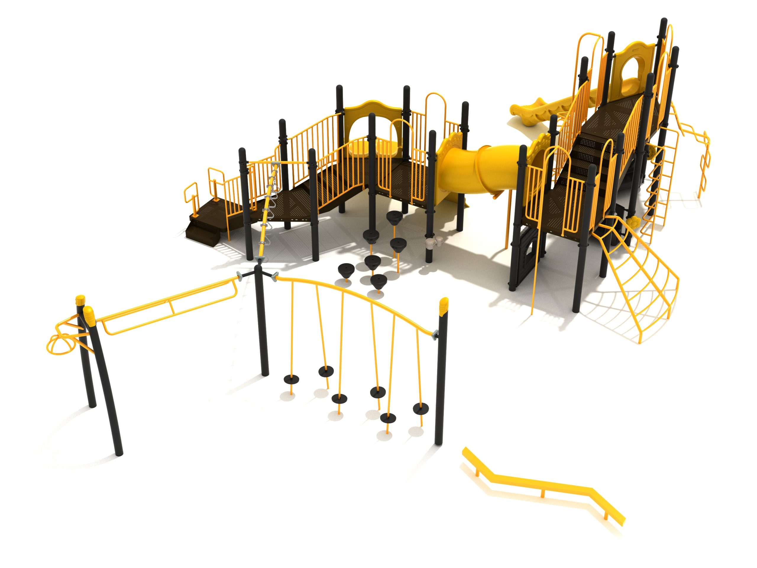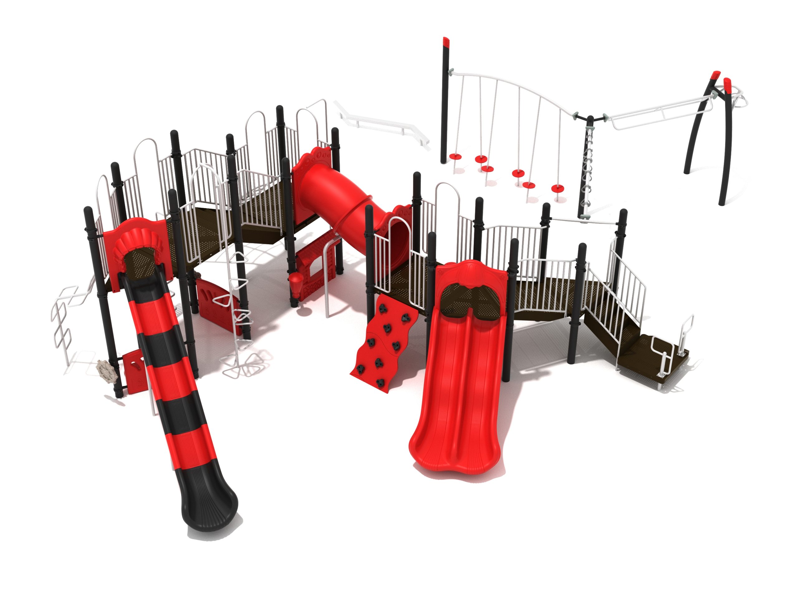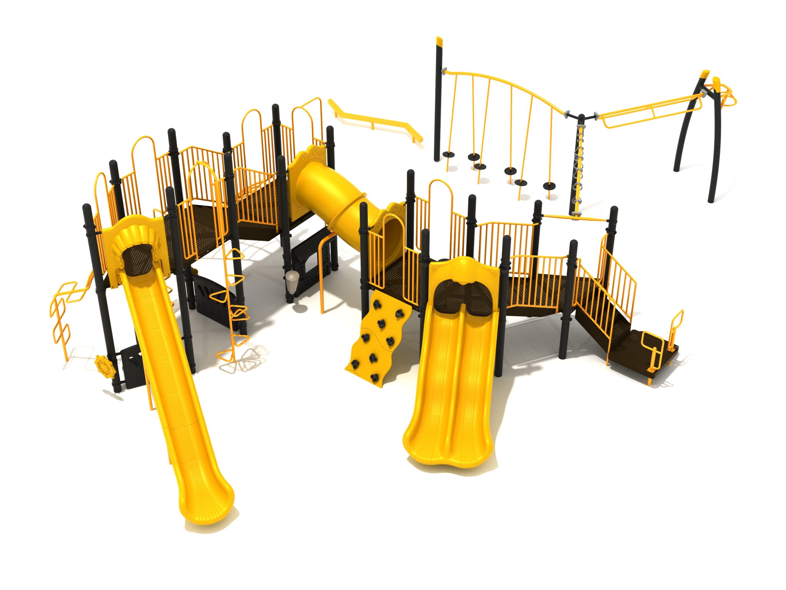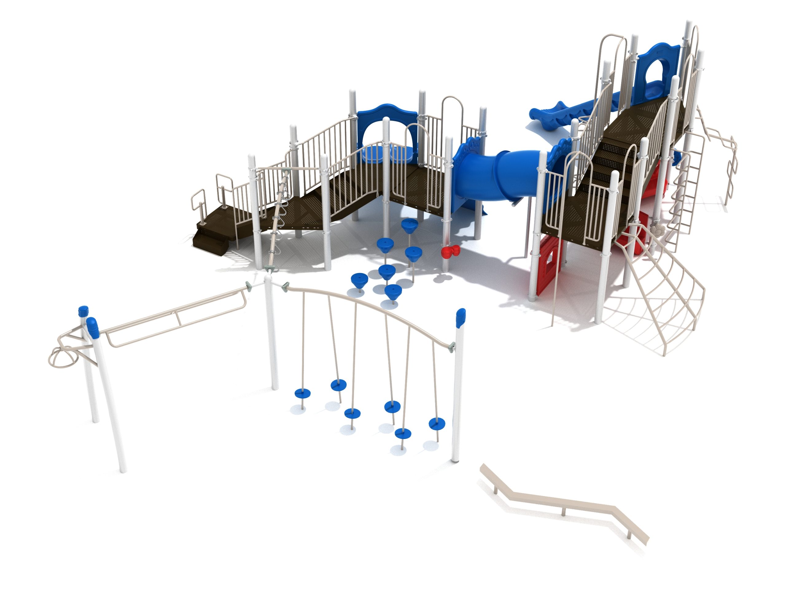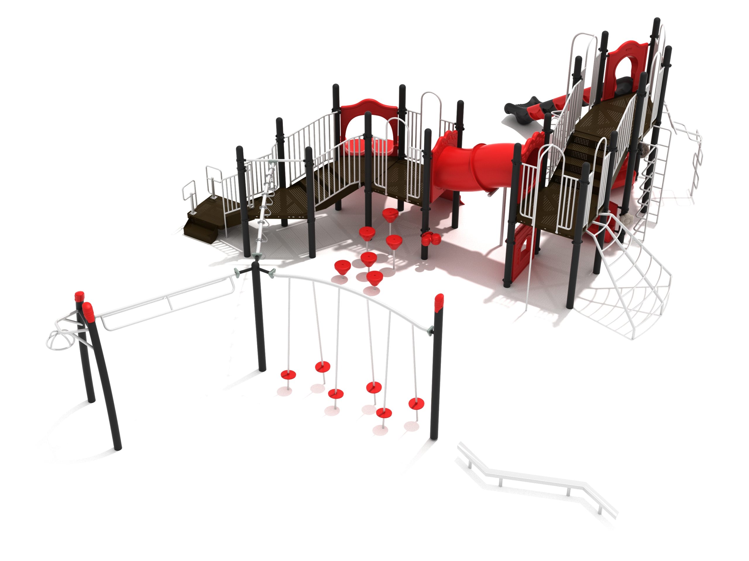 The Foraker playset has everything a child could dream of when it comes to play equipment. Watch as they carefully coordinate themselves to cross the Balance Beam before summoning their strength, flexibility and ingenuity to tackle the Tilted Lily Pad Bridge. To reach the twisting fun of the Overhead Spinner kids must successfully navigate their way up the Rocker Bar Overhead Climber which tilts back and forth with every swing. The Curved Overhead Swinging Ring Ladder is slightly sloping upwards which makes the task of getting to the main structure even more difficult and challenging. On the main structure the fun continues with a Double Wave Slide, a Straight Slide and a Fireman Pole to get down, and multiple adventurous ways to climb up to build strength and motor skills including a Wavy Rock Climbing Wall, a Clover Climber, a Wavy Snake Climber, a Fan Ladder with parallel bars and a 6-step Pebble Climber. Younger children will appreciate the Incline Tube Bridge as well as two Bench Panels, a Ship’s Wheel for watery adventures and a Single Drum to bang on.