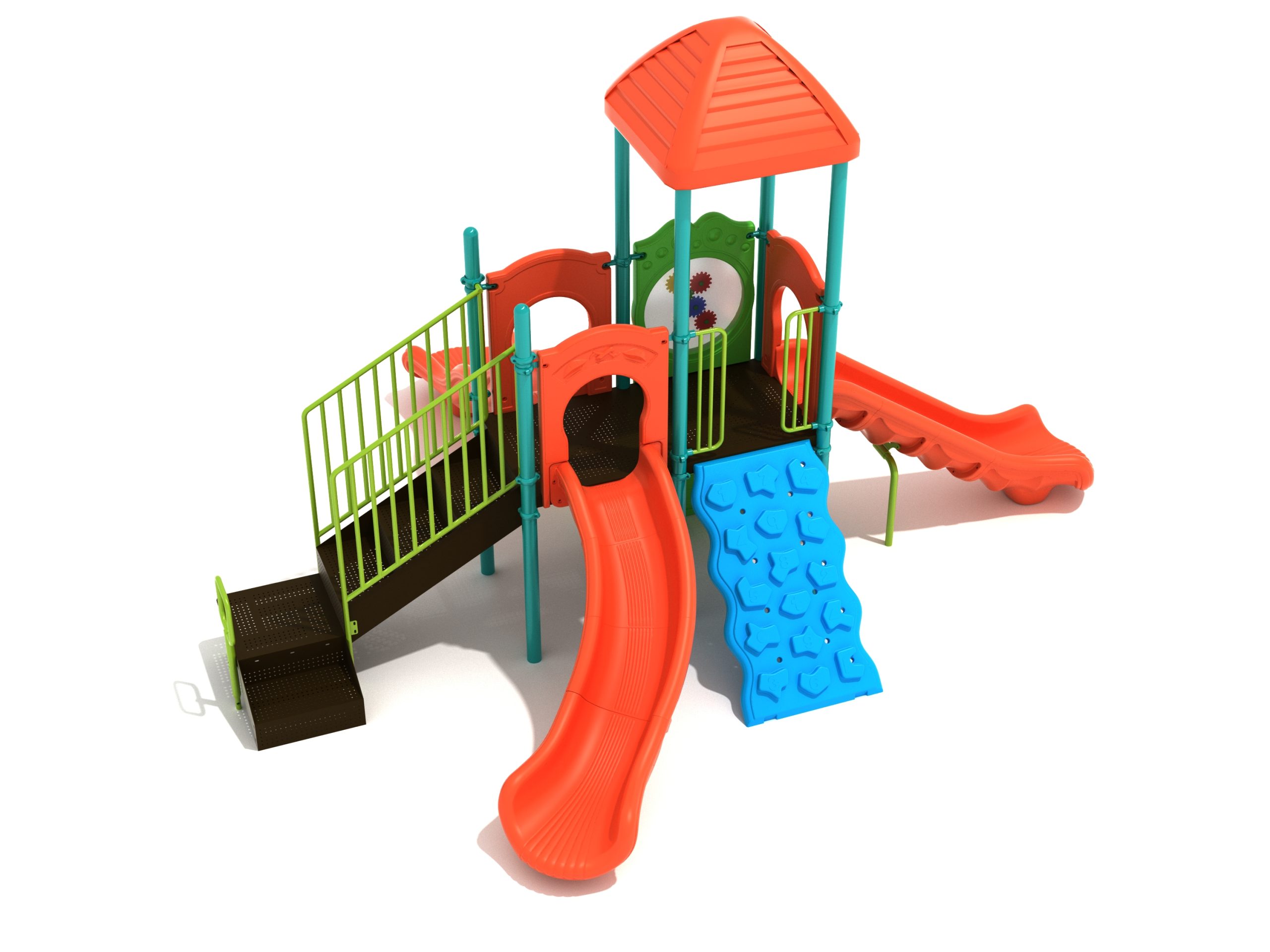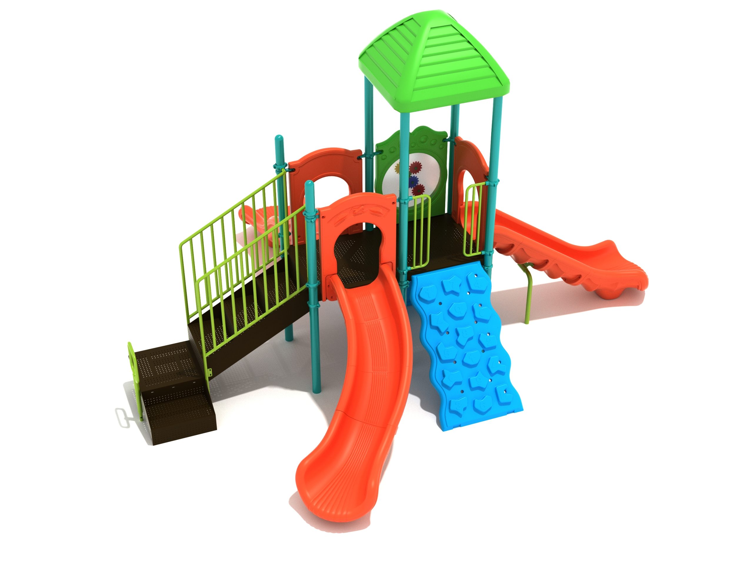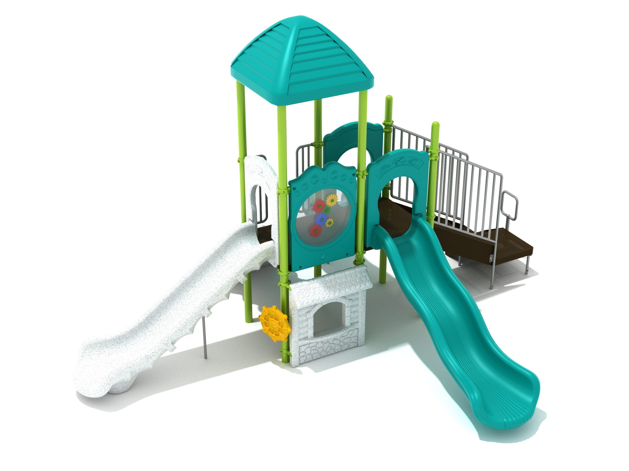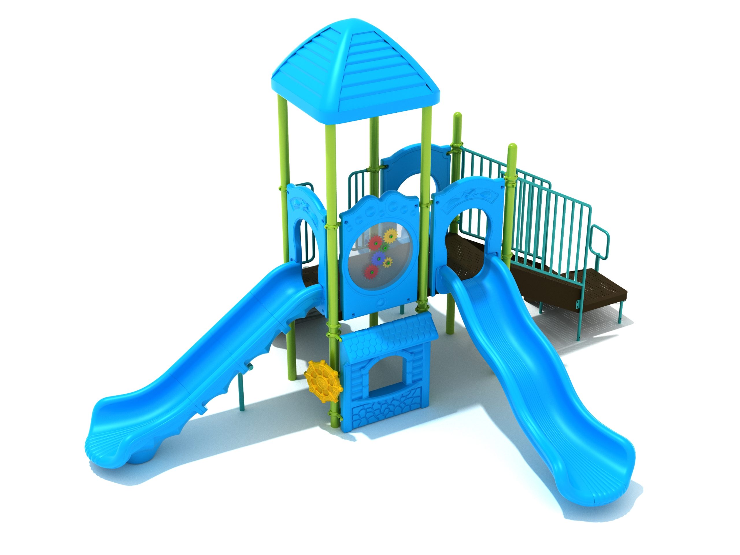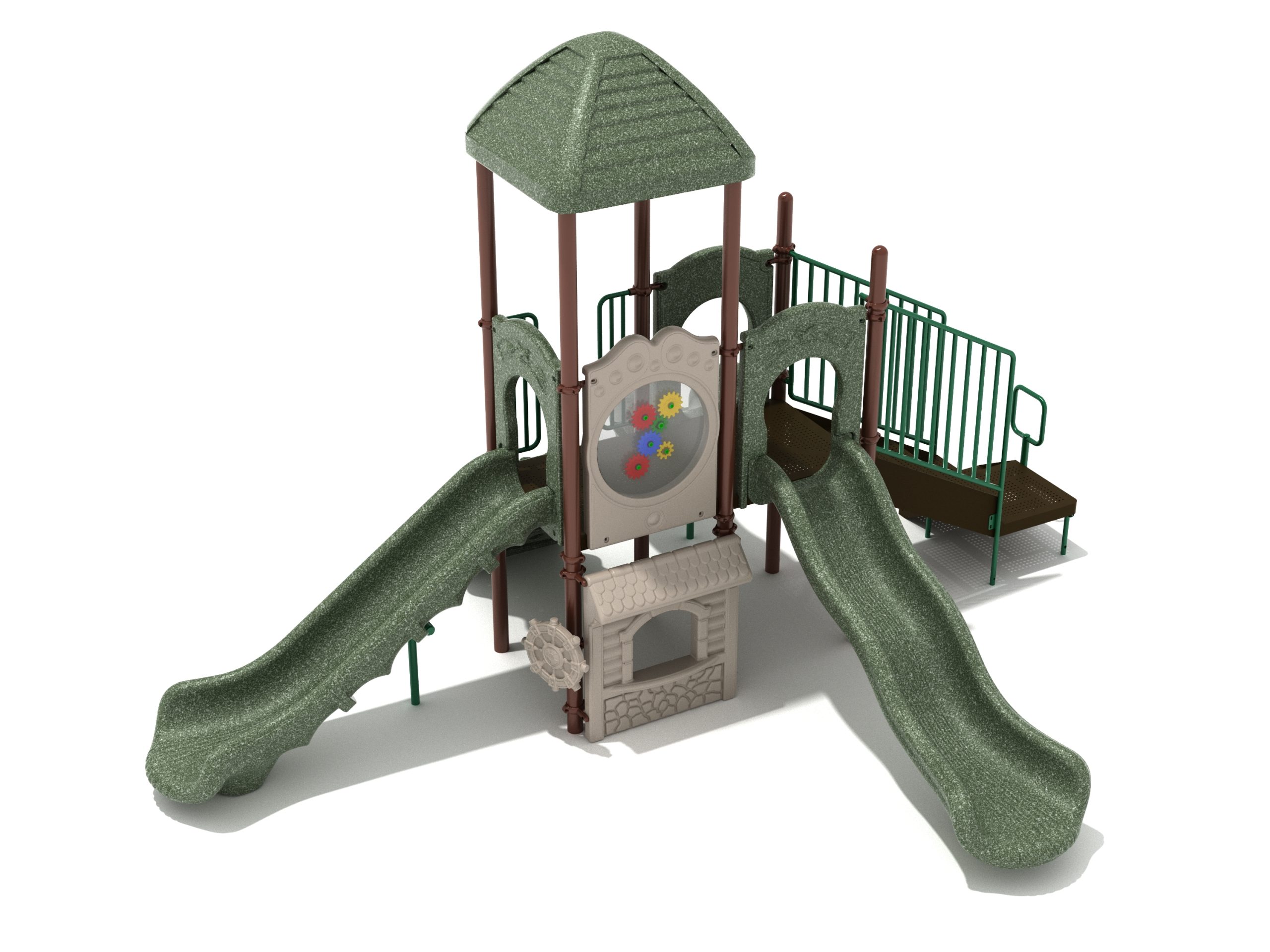 The Frederick play structure is a play structure of clustered fun, complete with a variation of many fun and exciting features. Made up of two square, 48” elevated platforms, this play structure is accessible by a number climber or by stairs. A gear panel borders one side of one of the elevated platforms, and a wave slide, a straight slide, and a right turn slide branch off of the elevated platforms, giving children a fun way off of the play structure. A ship’s wheel and a store panel found on the ground level provide opportunities for on-ground play and make the Frederick play structure ADA compliant. A line roof covers part of the play structure, providing shade and protection from the sun to children playing on the play structure during sunny days. This play structure is designed for children who are between the ages of 2 and 12 years old.
