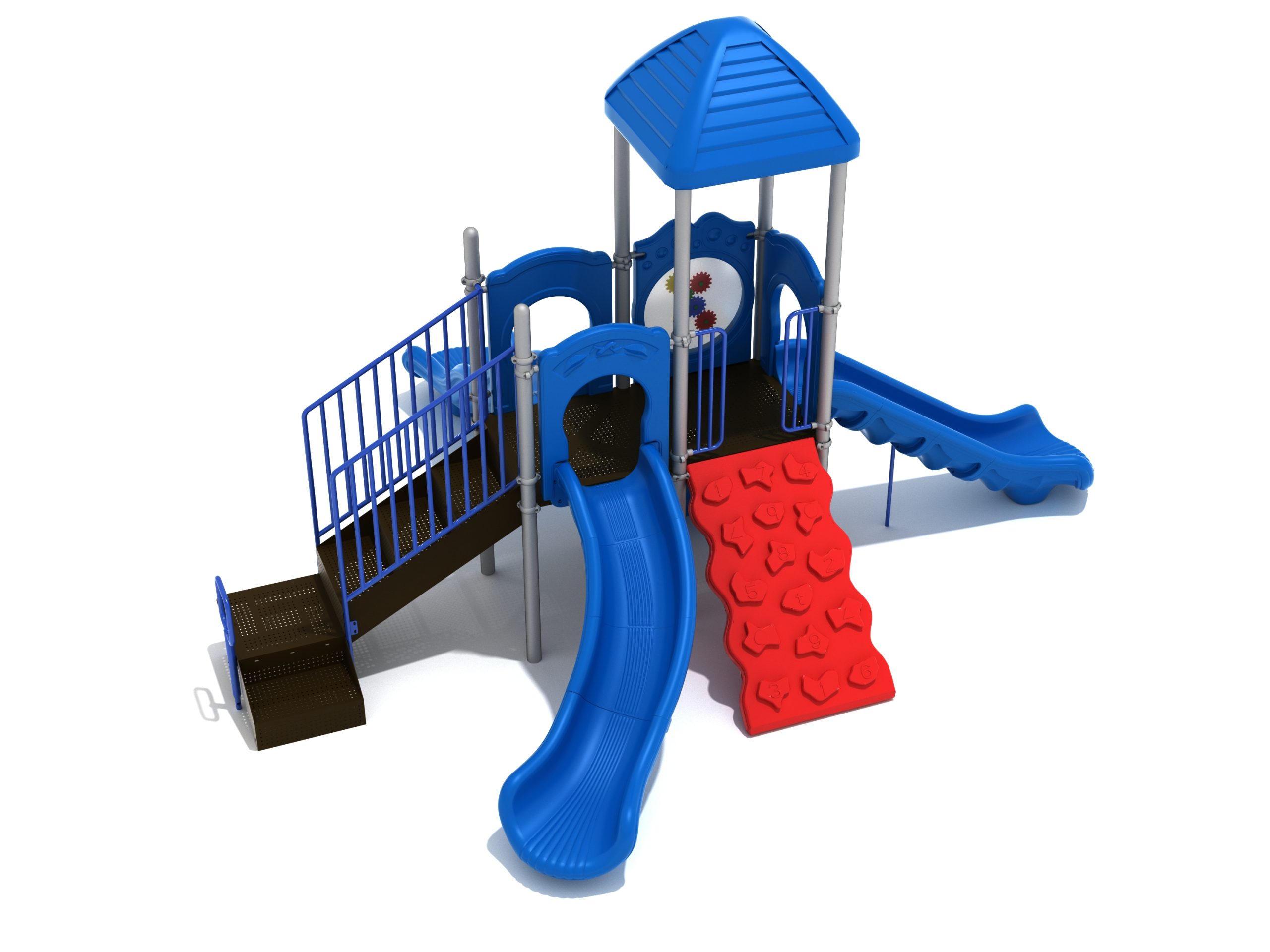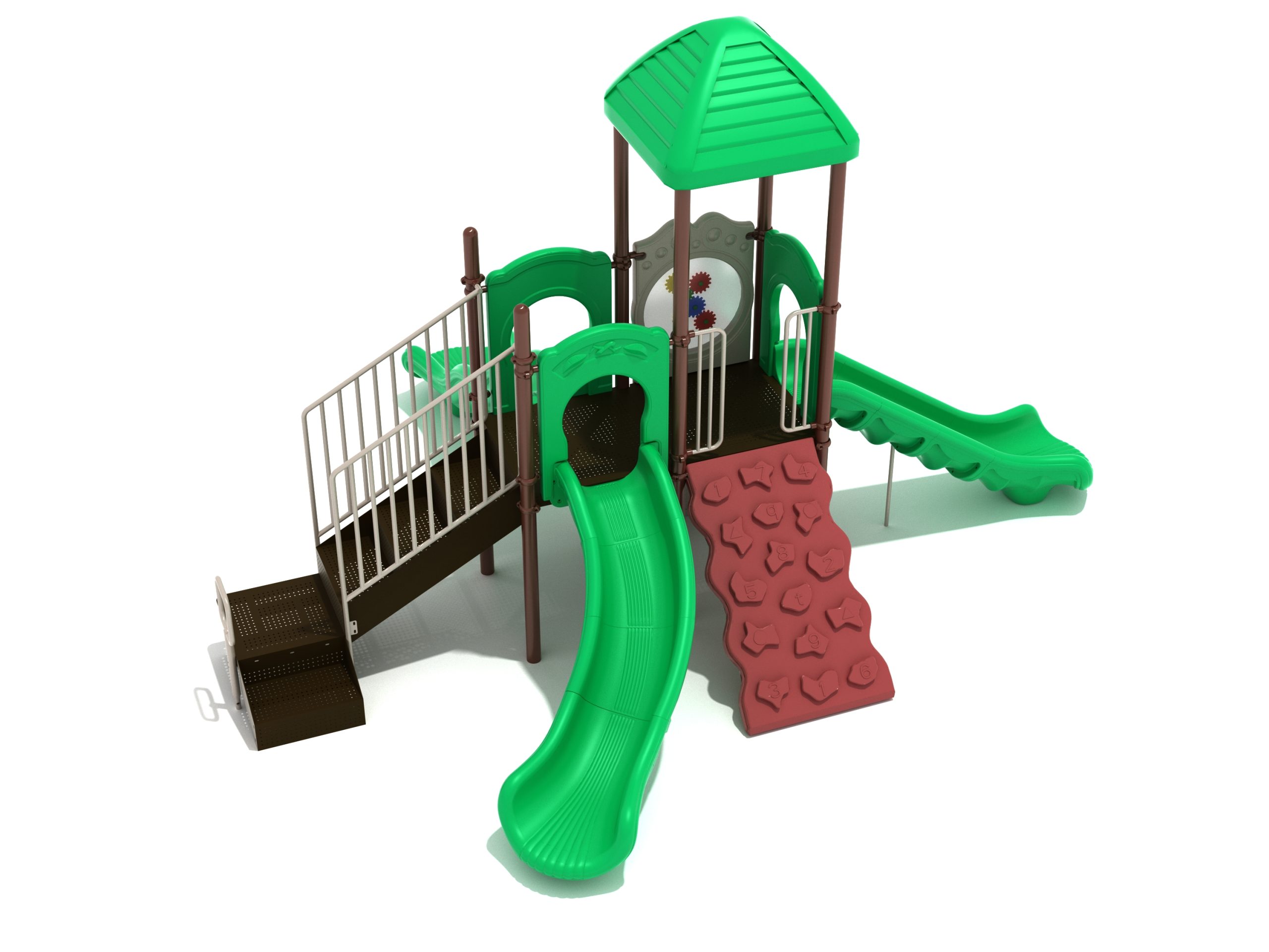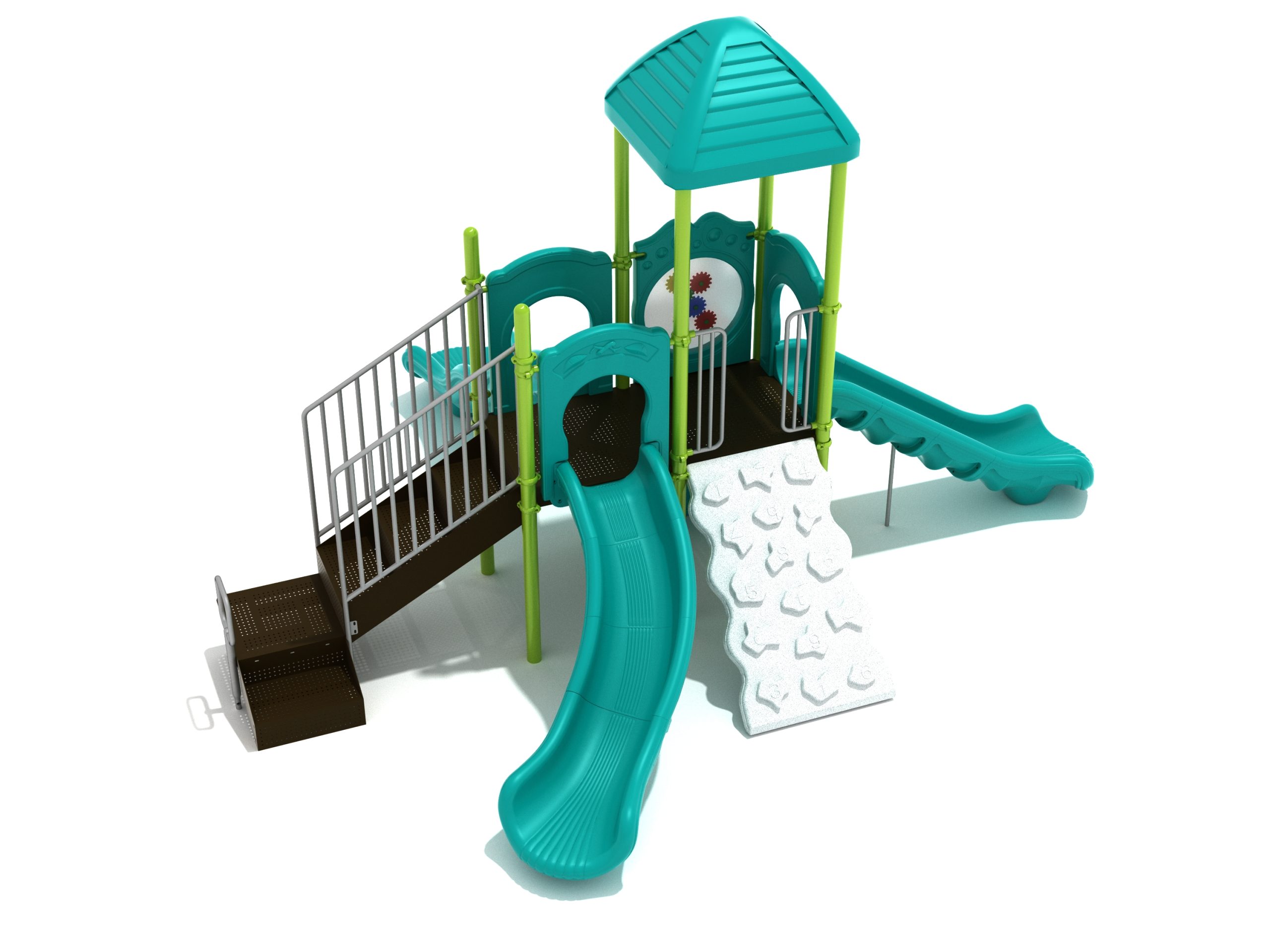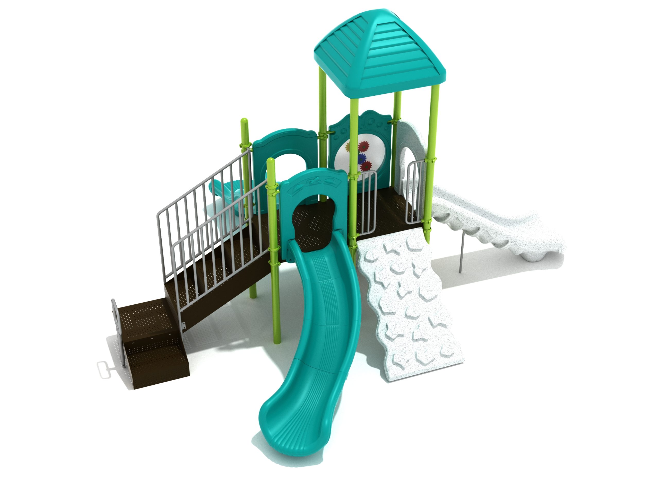 The Frederick play structure is a play structure of clustered fun, complete with a variation of many fun and exciting features. Made up of two square, 48” elevated platforms, this play structure is accessible by a number climber or by stairs. A gear panel borders one side of one of the elevated platforms, and a wave slide, a straight slide, and a right turn slide branch off of the elevated platforms, giving children a fun way off of the play structure. A ship’s wheel and a store panel found on the ground level provide opportunities for on-ground play and make the Frederick play structure ADA compliant. A line roof covers part of the play structure, providing shade and protection from the sun to children playing on the play structure during sunny days. This play structure is designed for children who are between the ages of 2 and 12 years old.