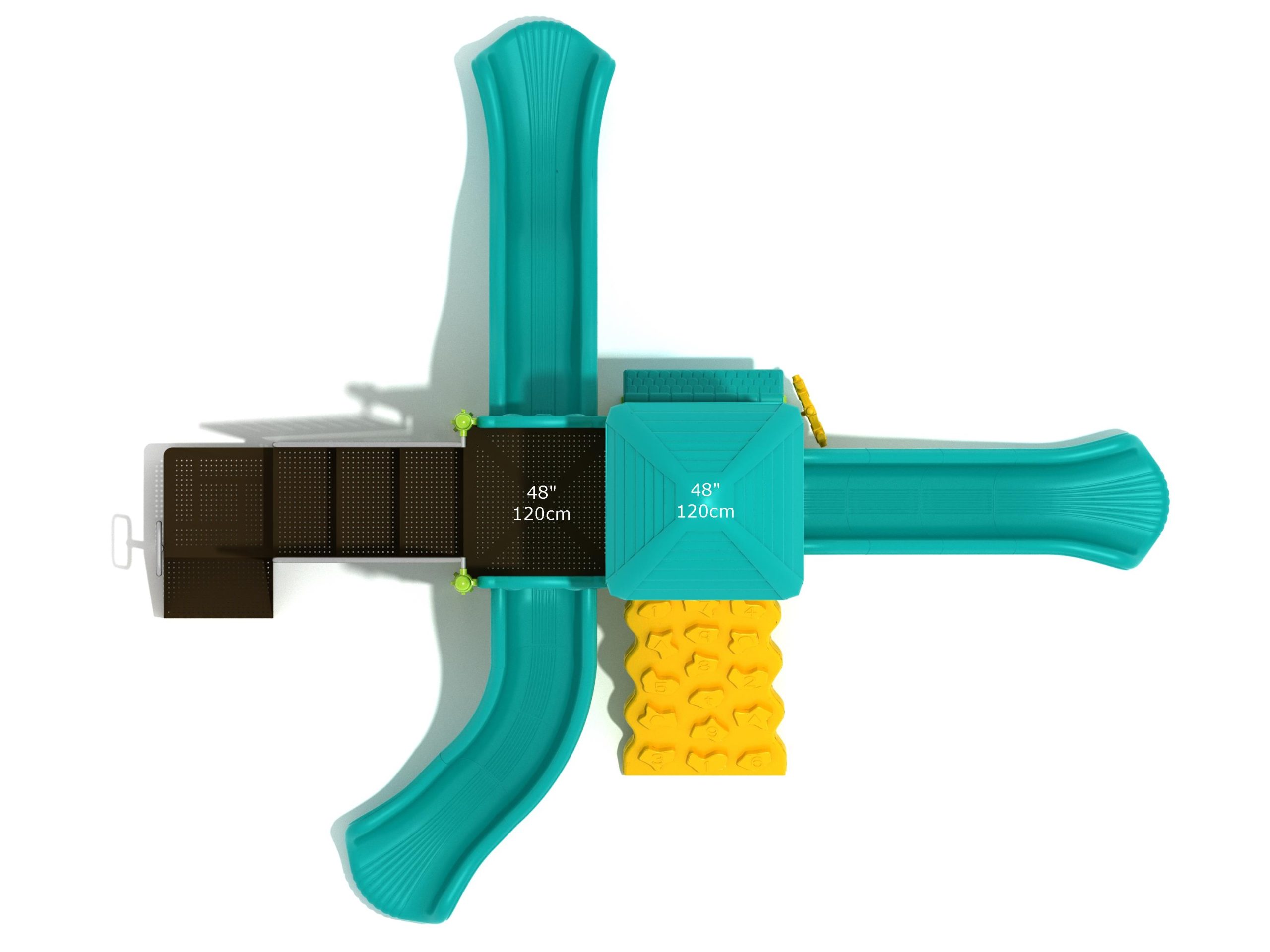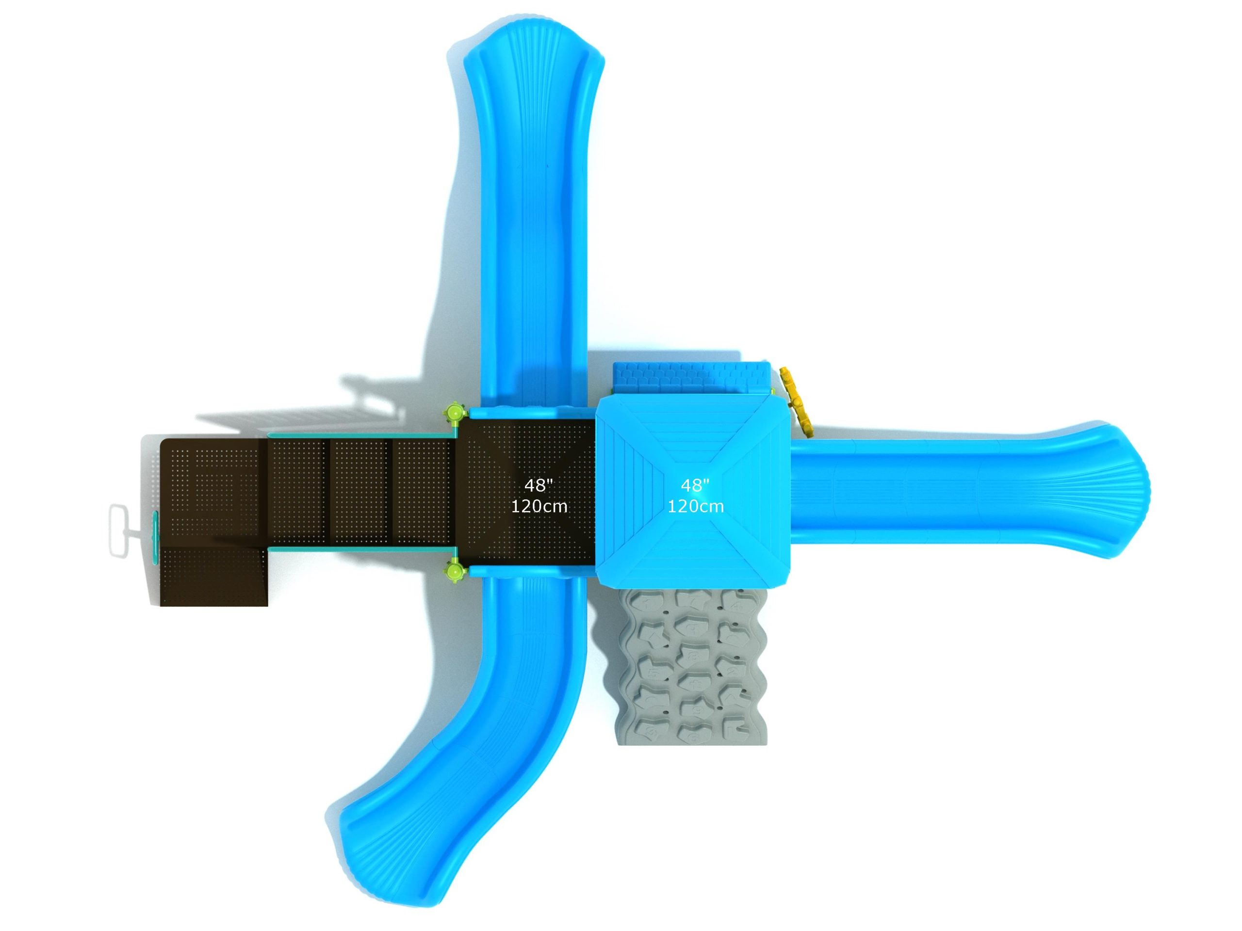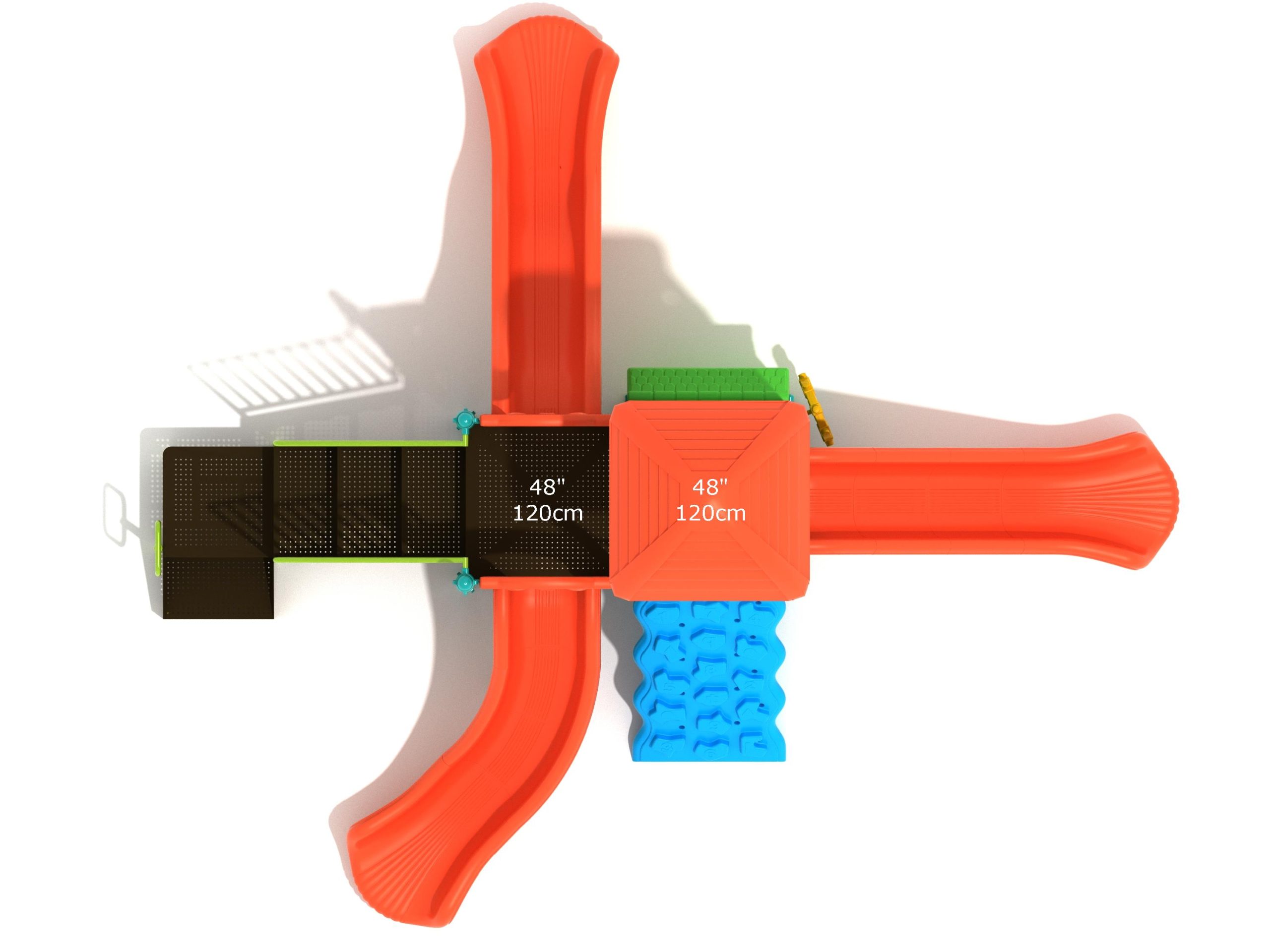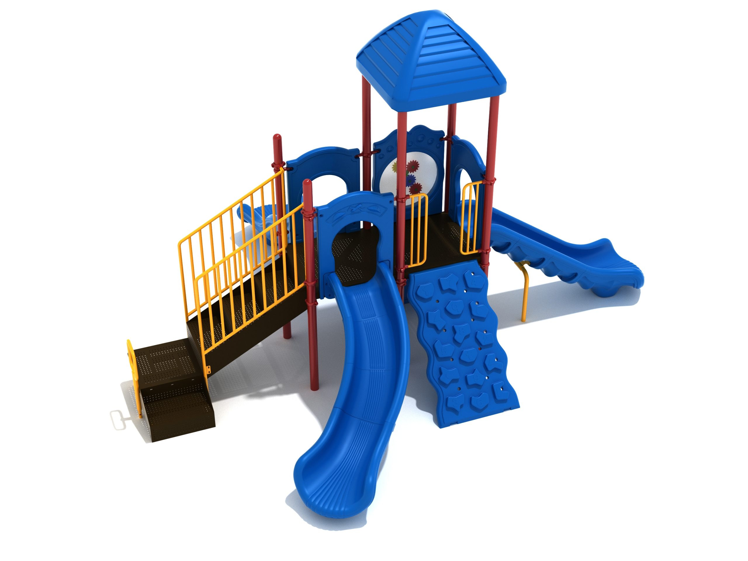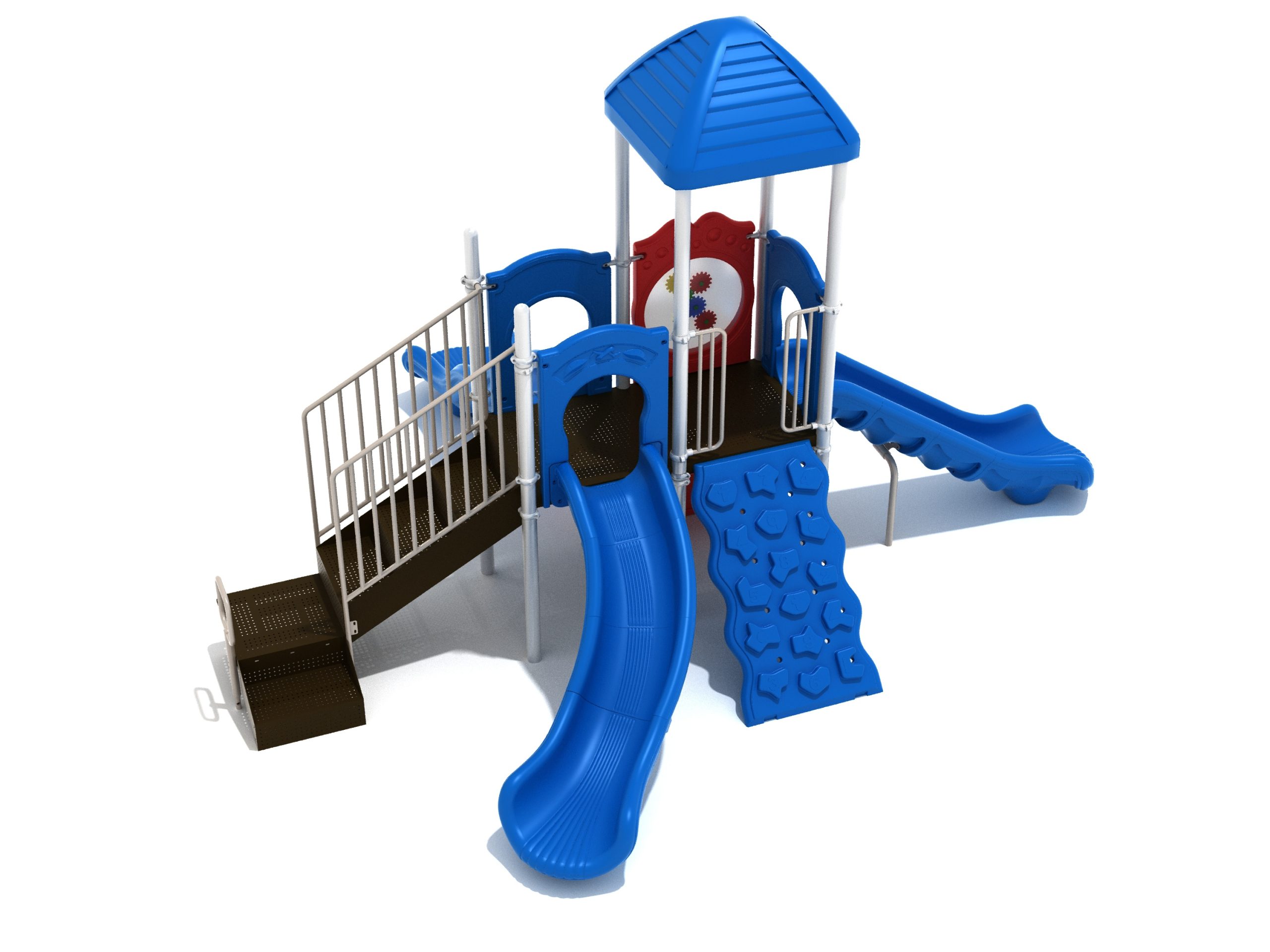 The Frederick play structure is a play structure of clustered fun, complete with a variation of many fun and exciting features. Made up of two square, 48” elevated platforms, this play structure is accessible by a number climber or by stairs. A gear panel borders one side of one of the elevated platforms, and a wave slide, a straight slide, and a right turn slide branch off of the elevated platforms, giving children a fun way off of the play structure. A ship’s wheel and a store panel found on the ground level provide opportunities for on-ground play and make the Frederick play structure ADA compliant. A line roof covers part of the play structure, providing shade and protection from the sun to children playing on the play structure during sunny days. This play structure is designed for children who are between the ages of 2 and 12 years old.