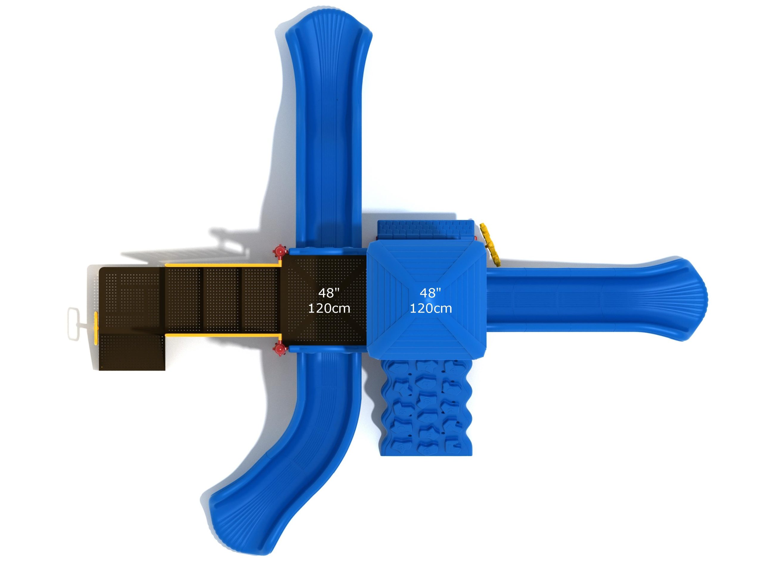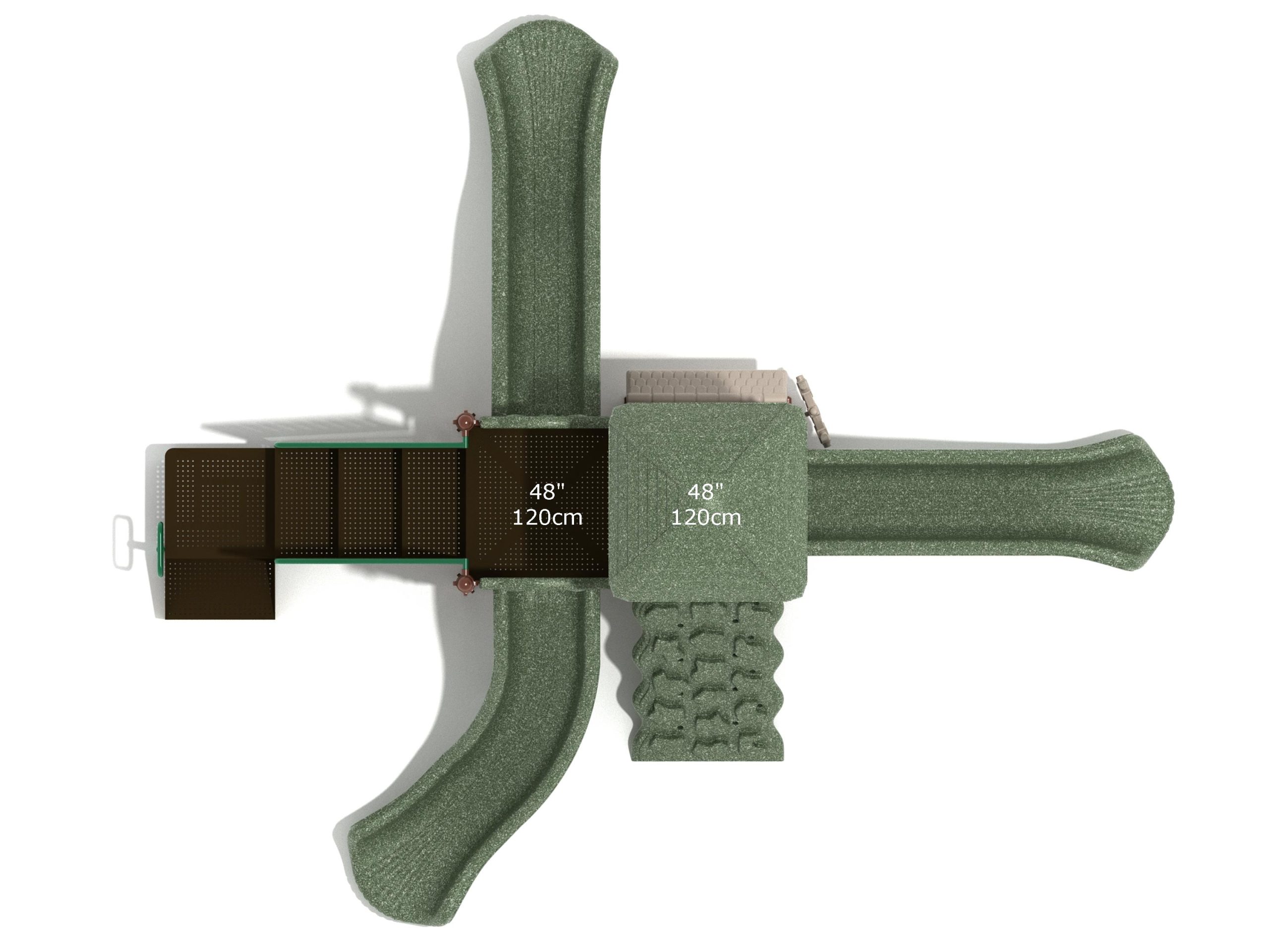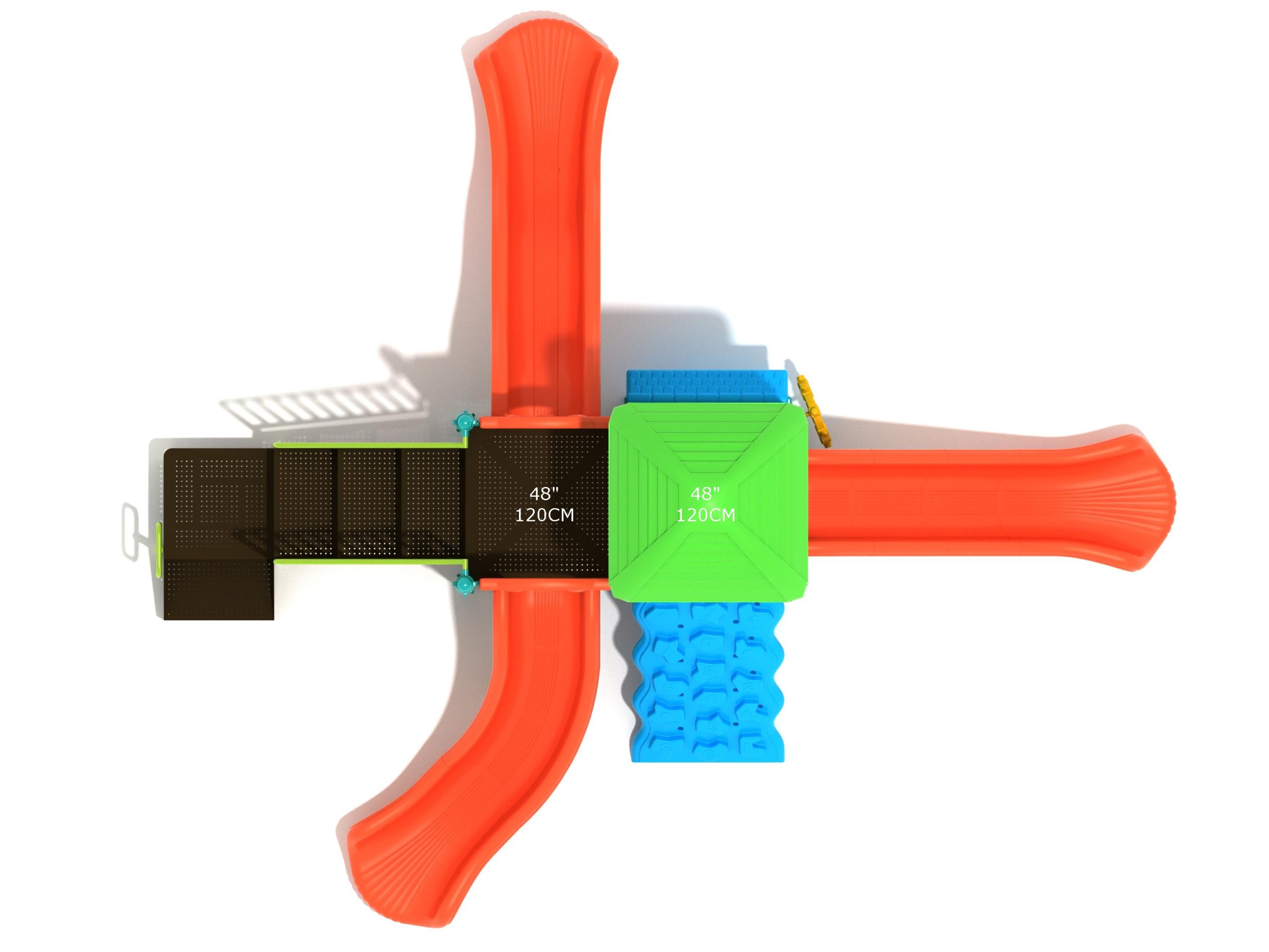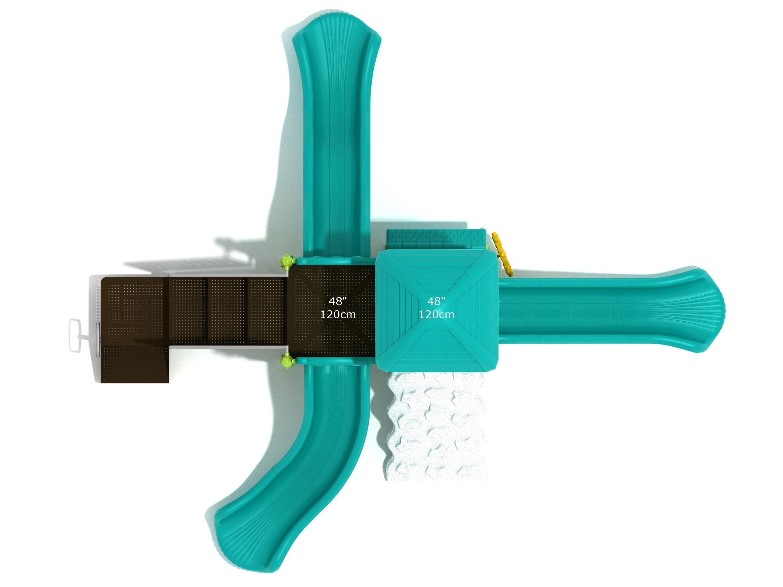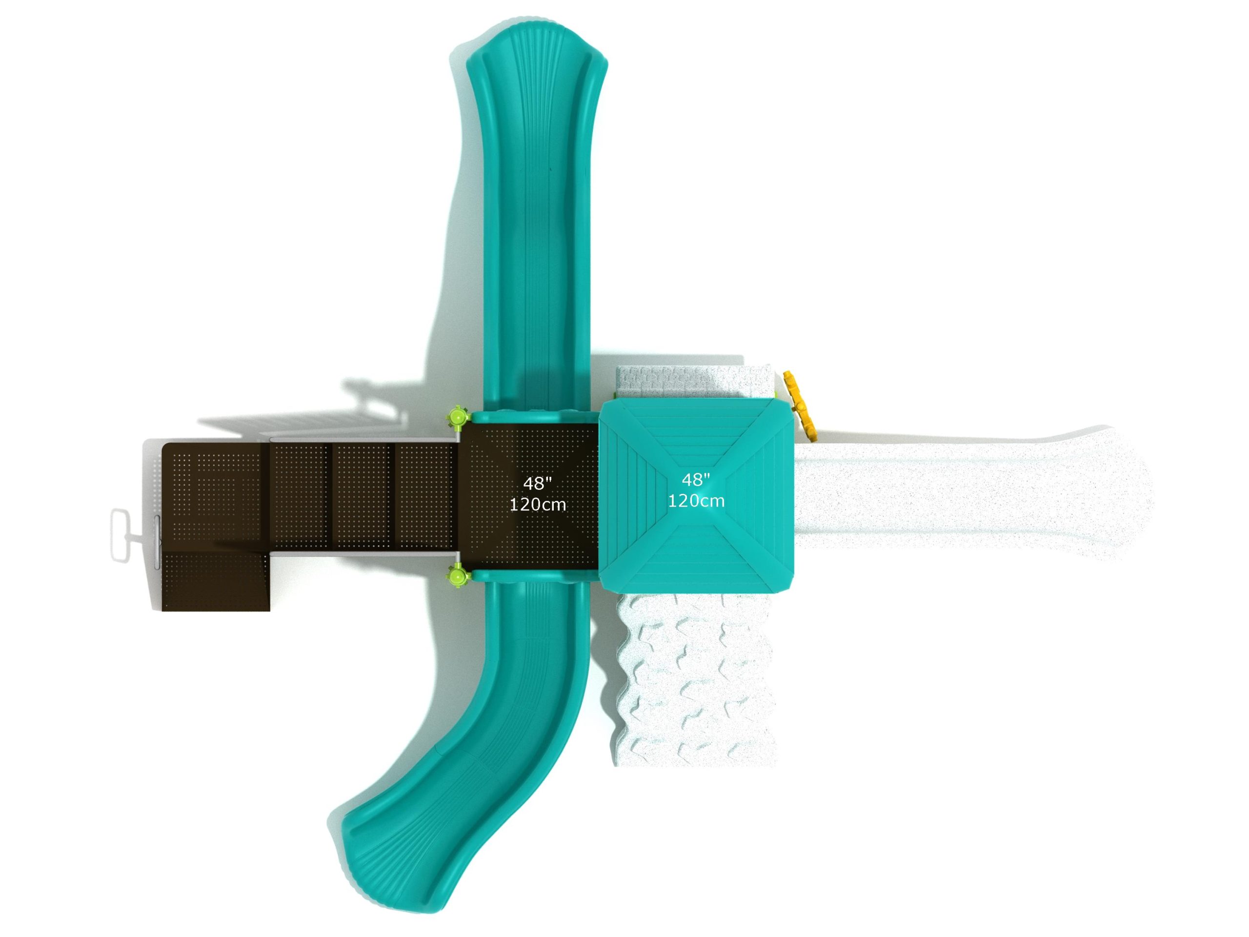 The Frederick play structure is a play structure of clustered fun, complete with a variation of many fun and exciting features. Made up of two square, 48” elevated platforms, this play structure is accessible by a number climber or by stairs. A gear panel borders one side of one of the elevated platforms, and a wave slide, a straight slide, and a right turn slide branch off of the elevated platforms, giving children a fun way off of the play structure. A ship’s wheel and a store panel found on the ground level provide opportunities for on-ground play and make the Frederick play structure ADA compliant. A line roof covers part of the play structure, providing shade and protection from the sun to children playing on the play structure during sunny days. This play structure is designed for children who are between the ages of 2 and 12 years old.