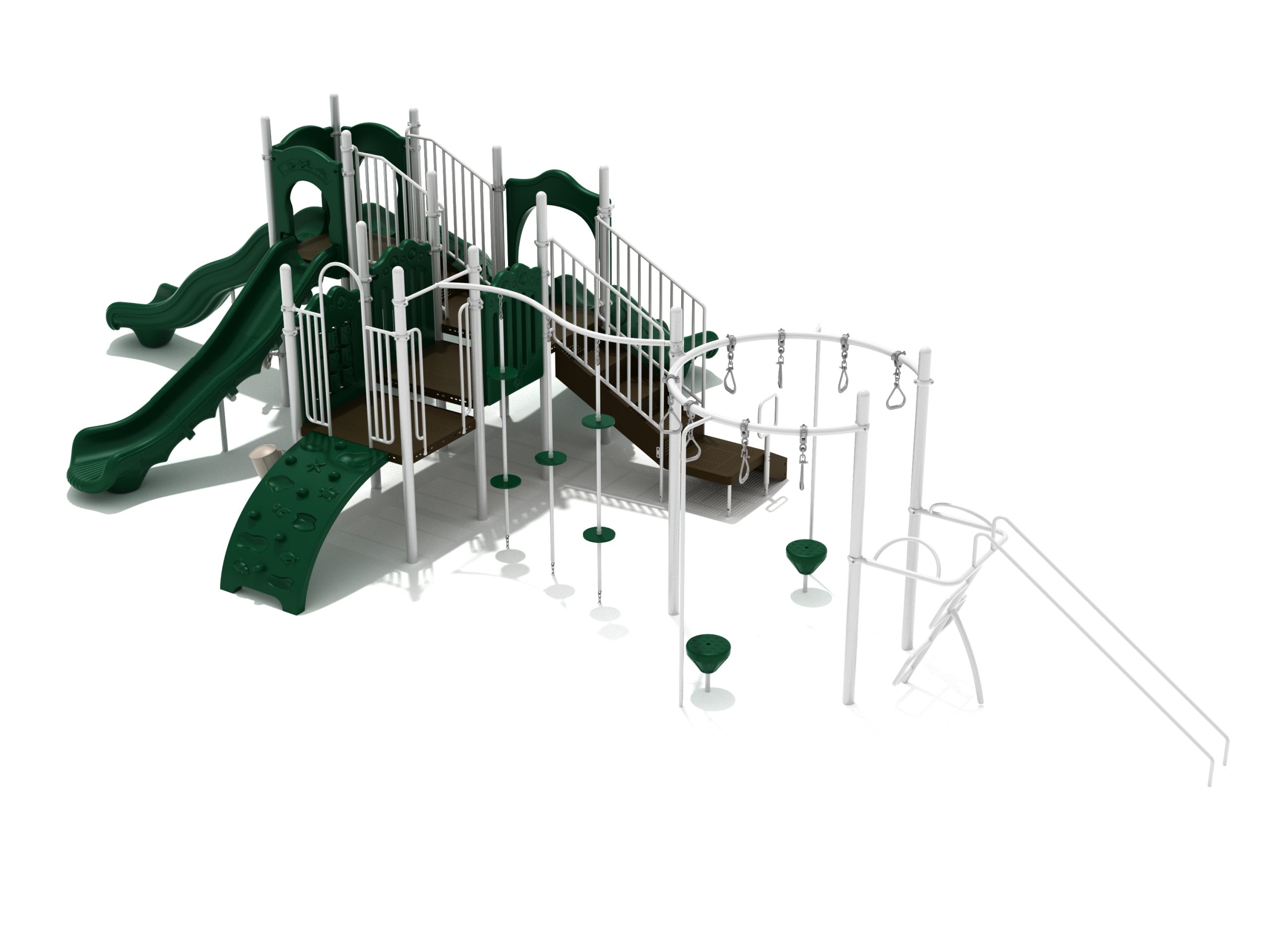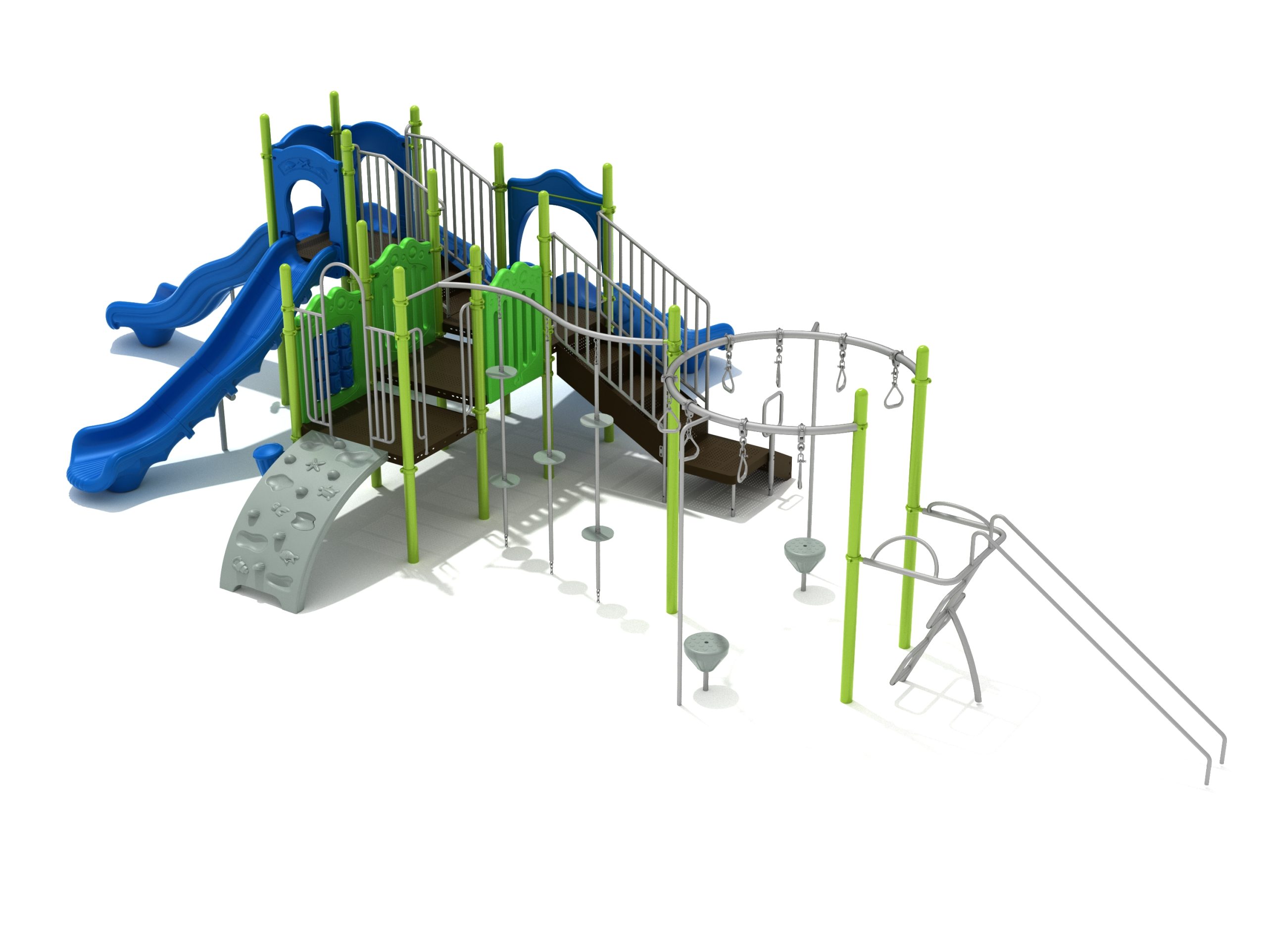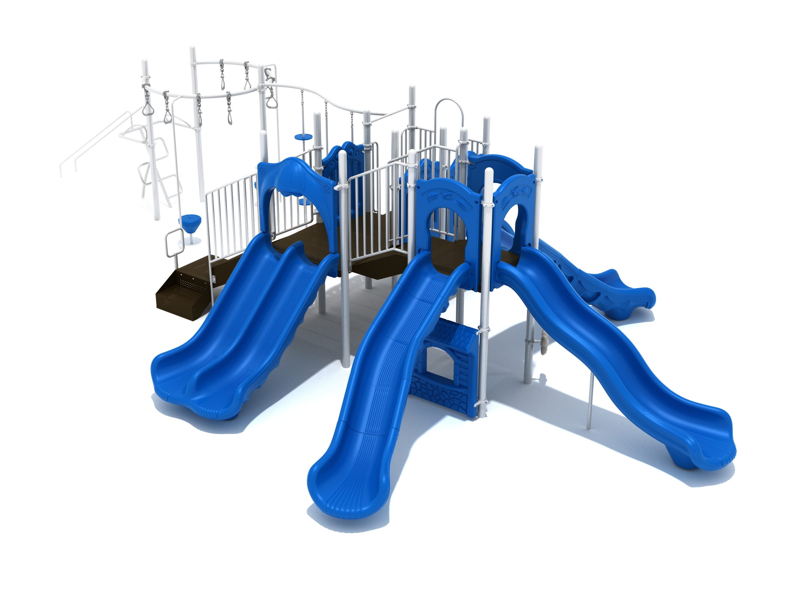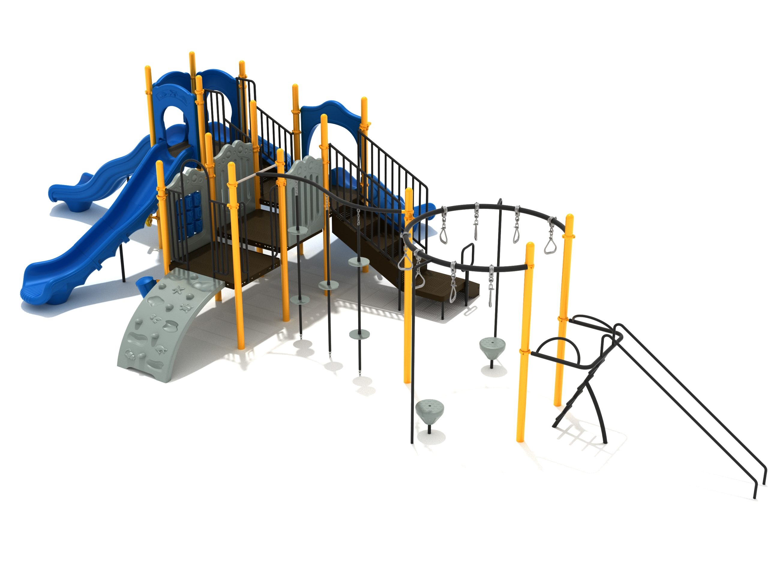 If you want to guarantee non-stop fun and adventure in a playground, choose to install the Goleta play structure as there are endless good times to be had here. The obstacle course part of the Goleta features Parallel Sliding Rails which require excellent coordination and arm strength to get across successfully either up or down. Swinging round in a circle will bring great amusement on the Double Curved Overhead Swinging Ring Ladder and it also has two Pebble Climbers to reach them. To get to the main structure there’s a Lily Pad Challenge Bridge which is sure to give a mental workout as well as a physical one. On the main structure itself the fun continues with both a Right Turn Slide and Left Turn Slide as well as a straight Wave Slide. Kids can use the fascinating Sea Creature Climber to reach the upper level and go down the Double Slide holding hands with a friend. Other features include a Store Panel for roleplaying, a Tic Tac Toe Panel to be played with peers or an adult, and a Ship’s Wheel for those dreaming of pirate adventures. A Single Drum and Rain Wheel bring a musical element to any play time.