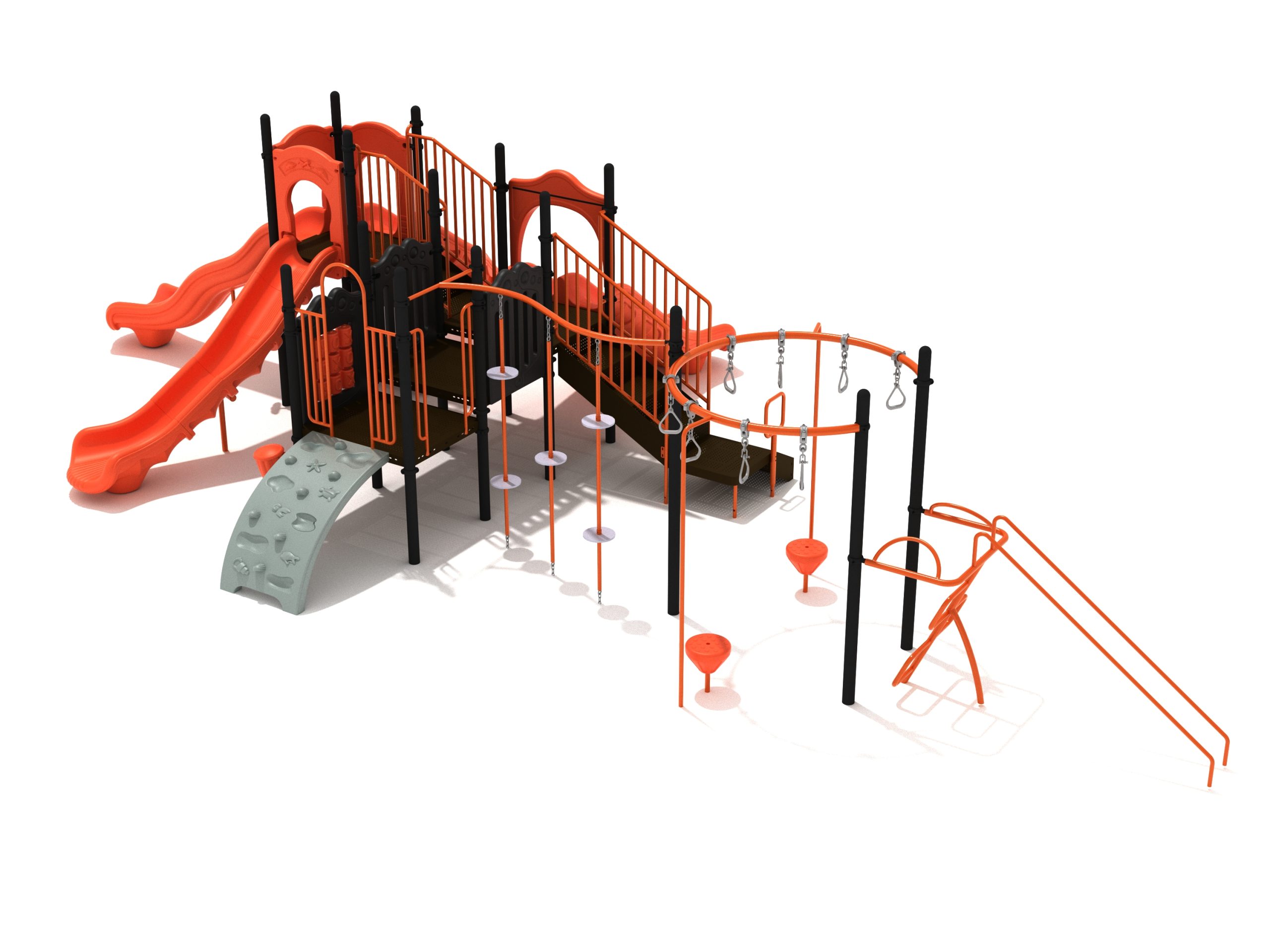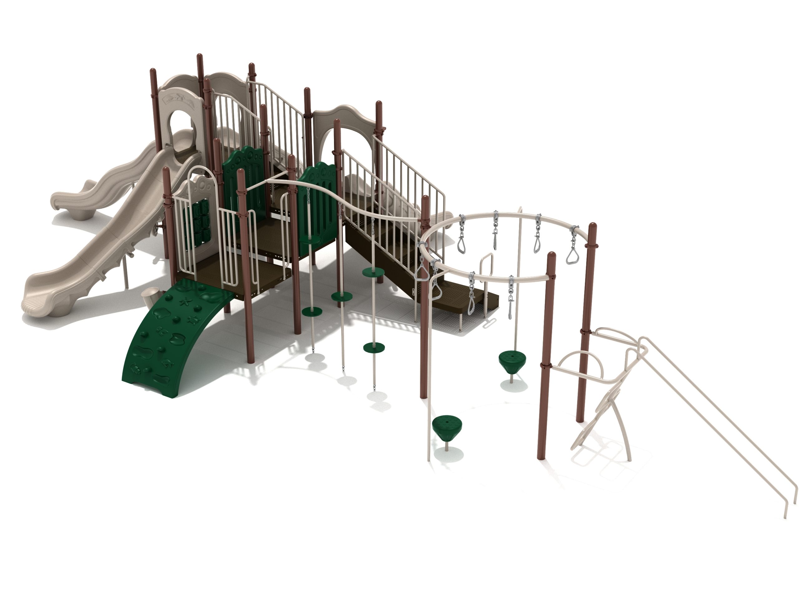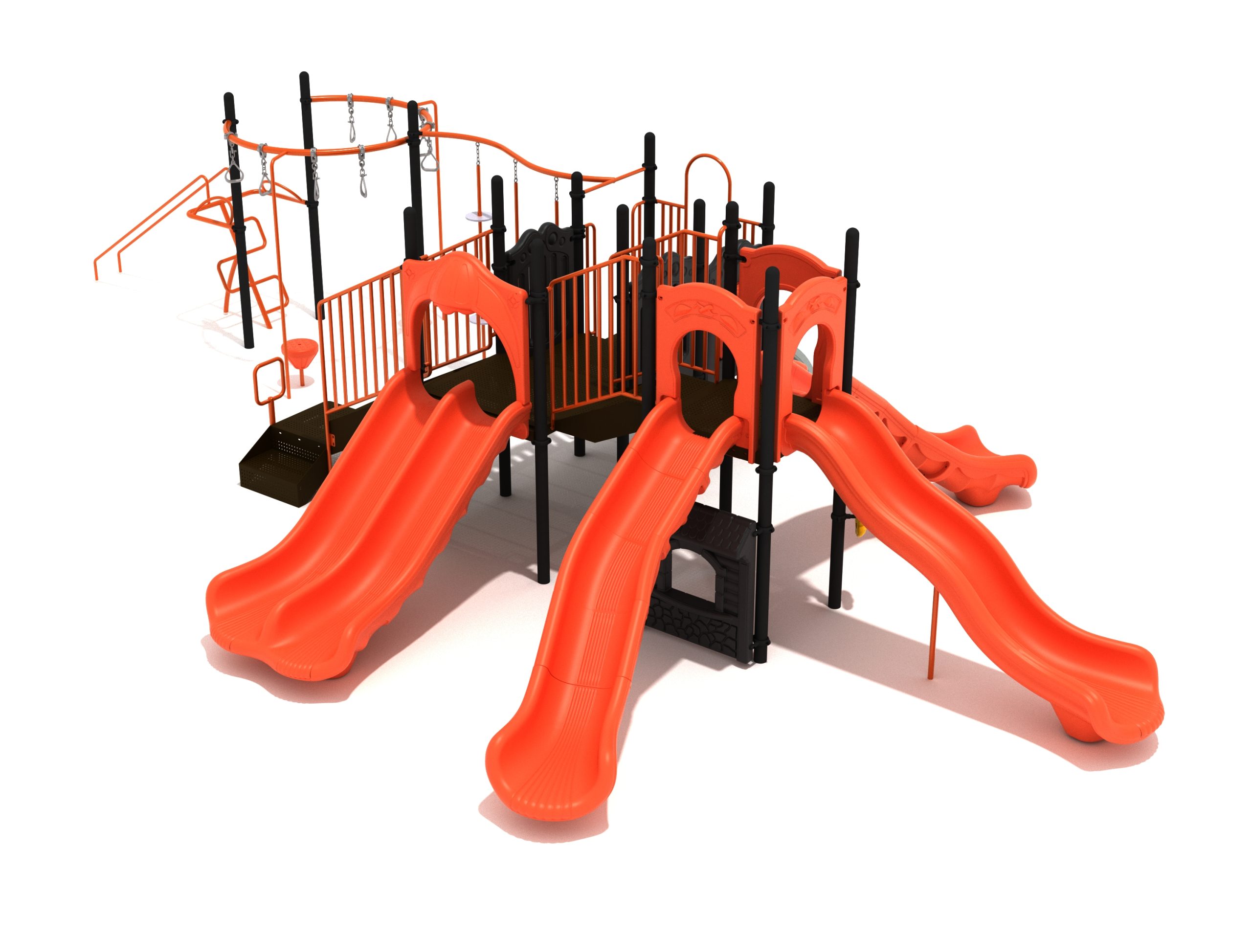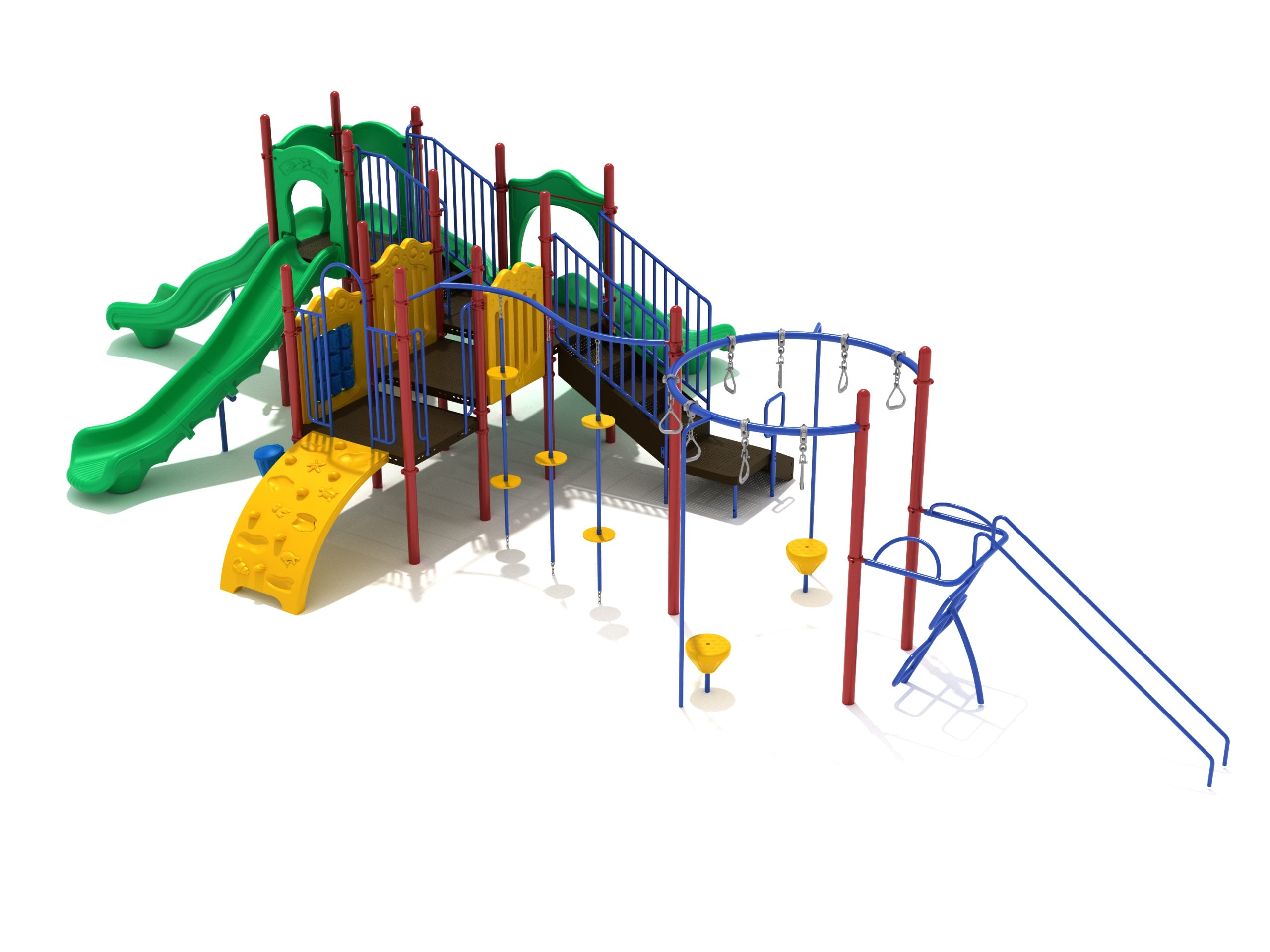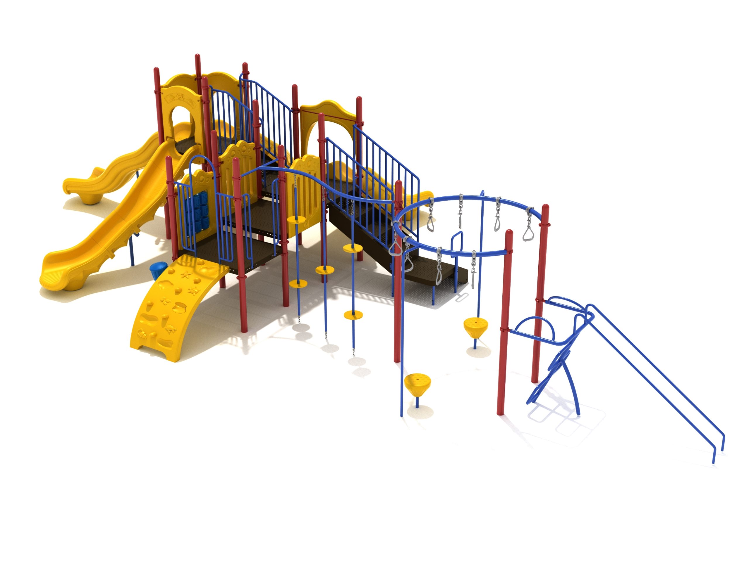 If you want to guarantee non-stop fun and adventure in a playground, choose to install the Goleta play structure as there are endless good times to be had here. The obstacle course part of the Goleta features Parallel Sliding Rails which require excellent coordination and arm strength to get across successfully either up or down. Swinging round in a circle will bring great amusement on the Double Curved Overhead Swinging Ring Ladder and it also has two Pebble Climbers to reach them. To get to the main structure there’s a Lily Pad Challenge Bridge which is sure to give a mental workout as well as a physical one. On the main structure itself the fun continues with both a Right Turn Slide and Left Turn Slide as well as a straight Wave Slide. Kids can use the fascinating Sea Creature Climber to reach the upper level and go down the Double Slide holding hands with a friend. Other features include a Store Panel for roleplaying, a Tic Tac Toe Panel to be played with peers or an adult, and a Ship’s Wheel for those dreaming of pirate adventures. A Single Drum and Rain Wheel bring a musical element to any play time.