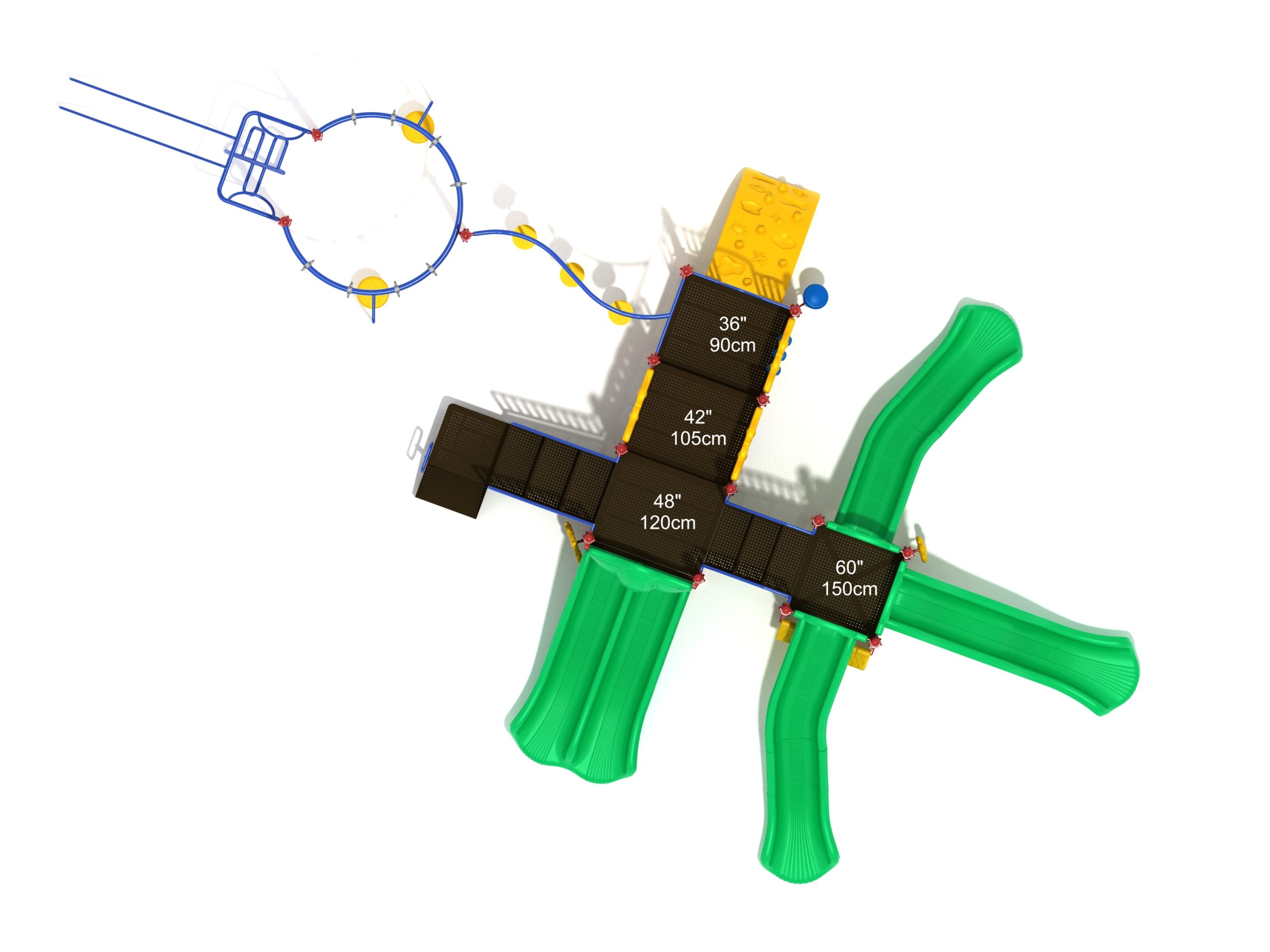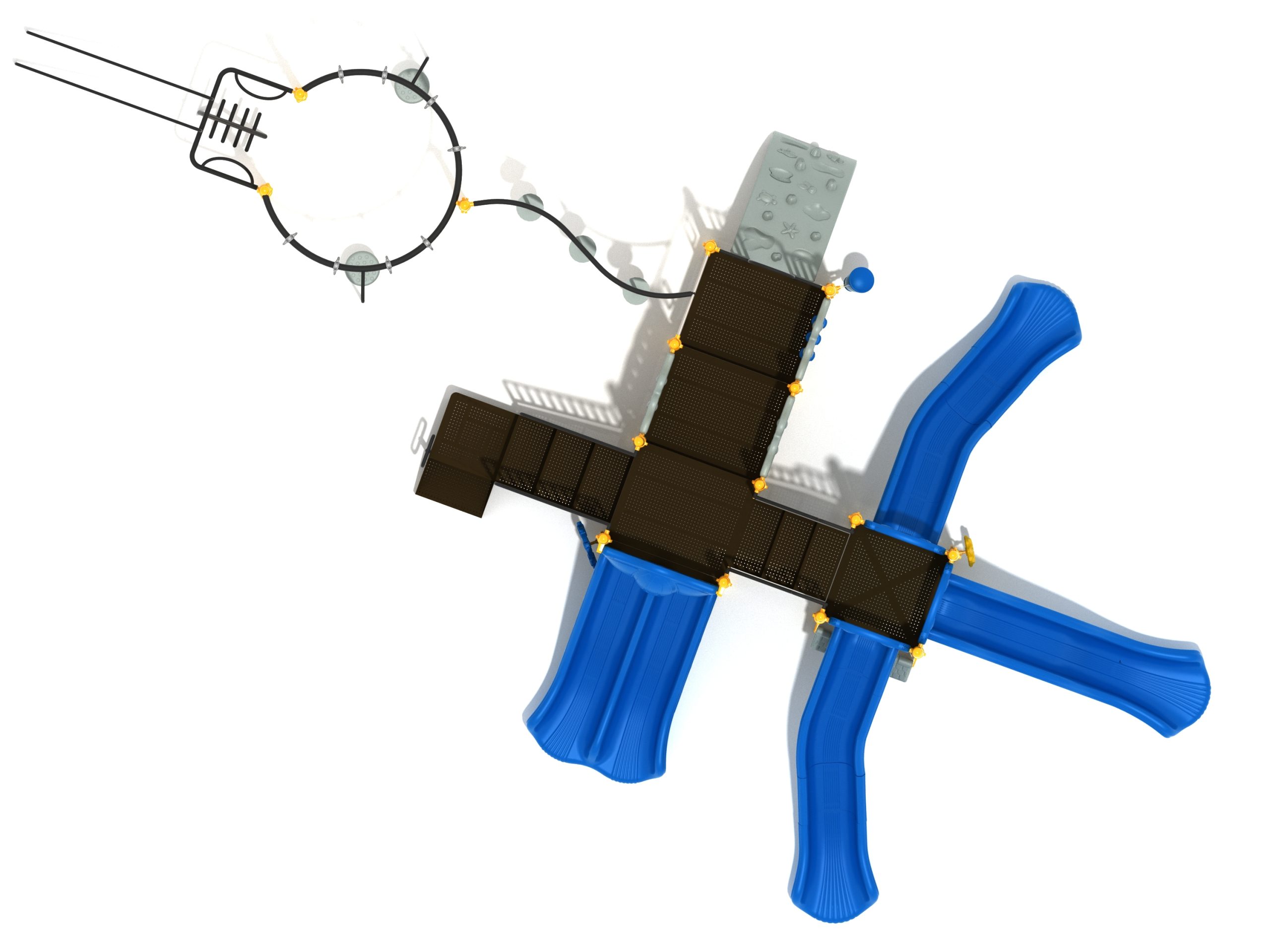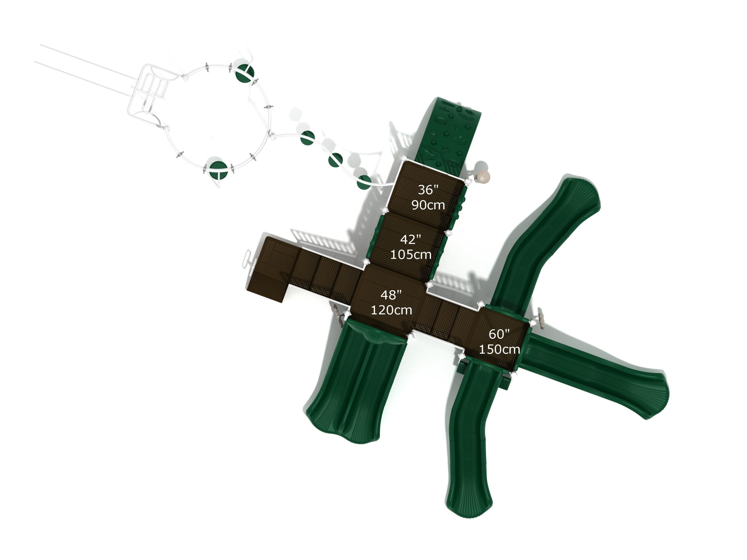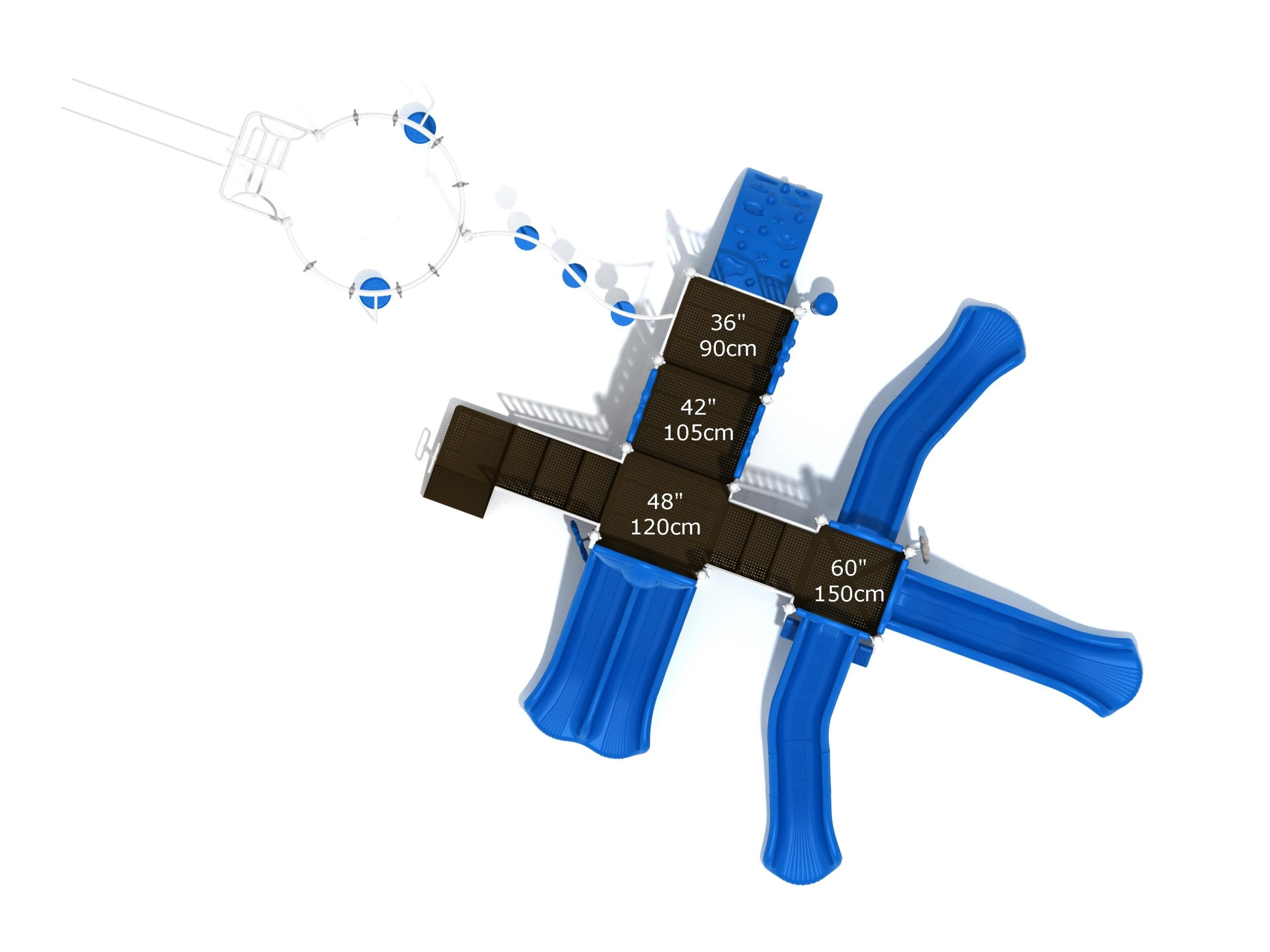 If you want to guarantee non-stop fun and adventure in a playground, choose to install the Goleta play structure as there are endless good times to be had here. The obstacle course part of the Goleta features Parallel Sliding Rails which require excellent coordination and arm strength to get across successfully either up or down. Swinging round in a circle will bring great amusement on the Double Curved Overhead Swinging Ring Ladder and it also has two Pebble Climbers to reach them. To get to the main structure there’s a Lily Pad Challenge Bridge which is sure to give a mental workout as well as a physical one. On the main structure itself the fun continues with both a Right Turn Slide and Left Turn Slide as well as a straight Wave Slide. Kids can use the fascinating Sea Creature Climber to reach the upper level and go down the Double Slide holding hands with a friend. Other features include a Store Panel for roleplaying, a Tic Tac Toe Panel to be played with peers or an adult, and a Ship’s Wheel for those dreaming of pirate adventures. A Single Drum and Rain Wheel bring a musical element to any play time.