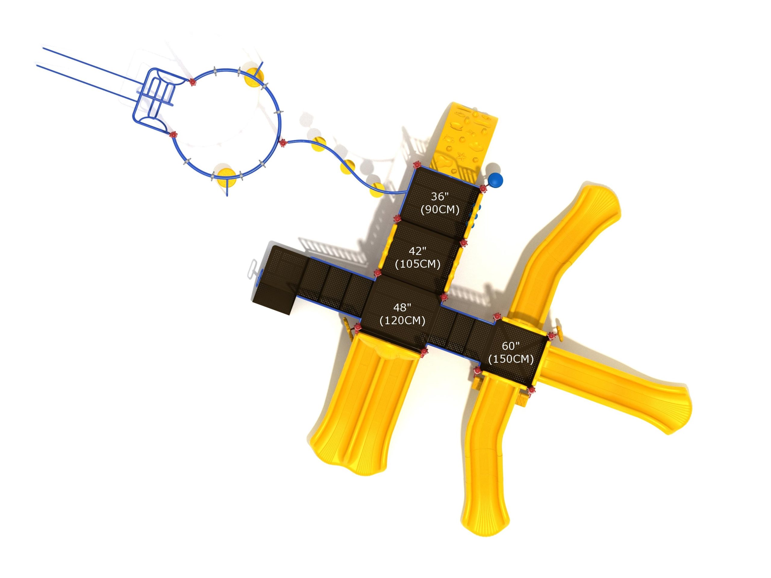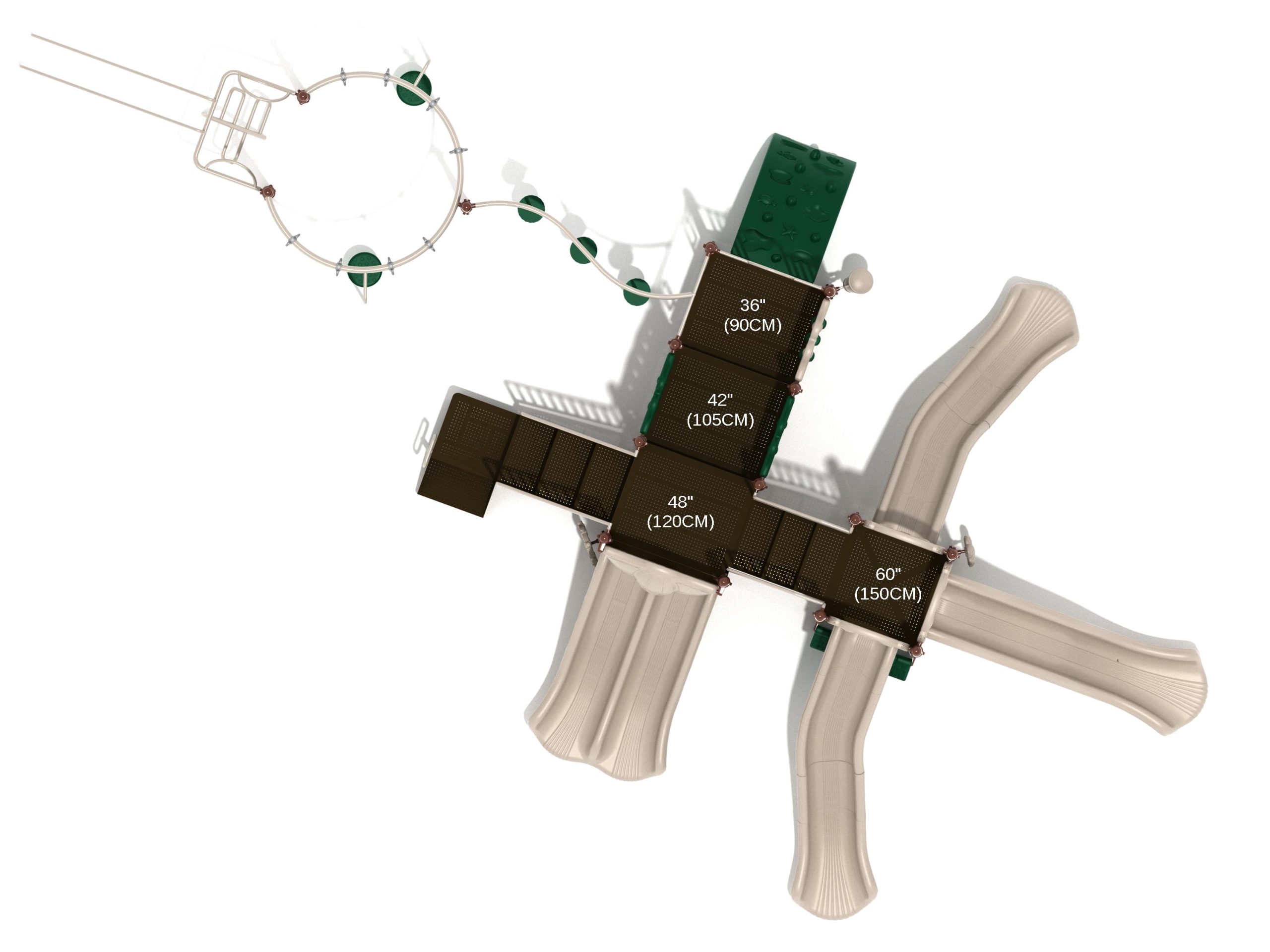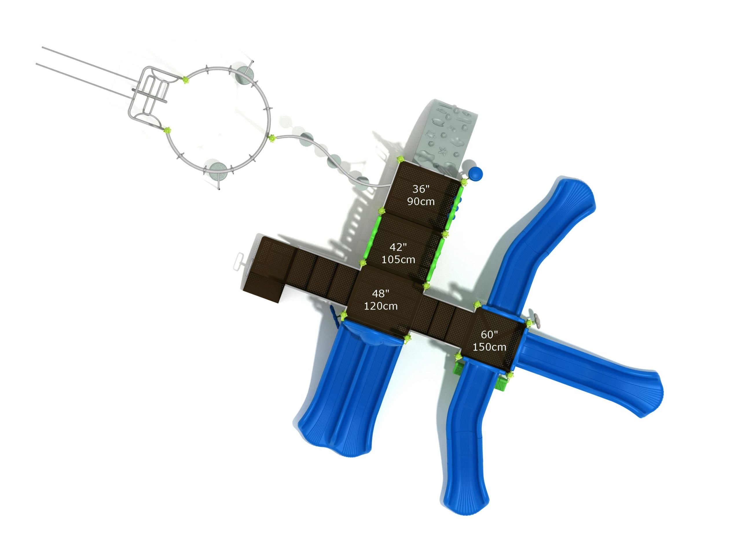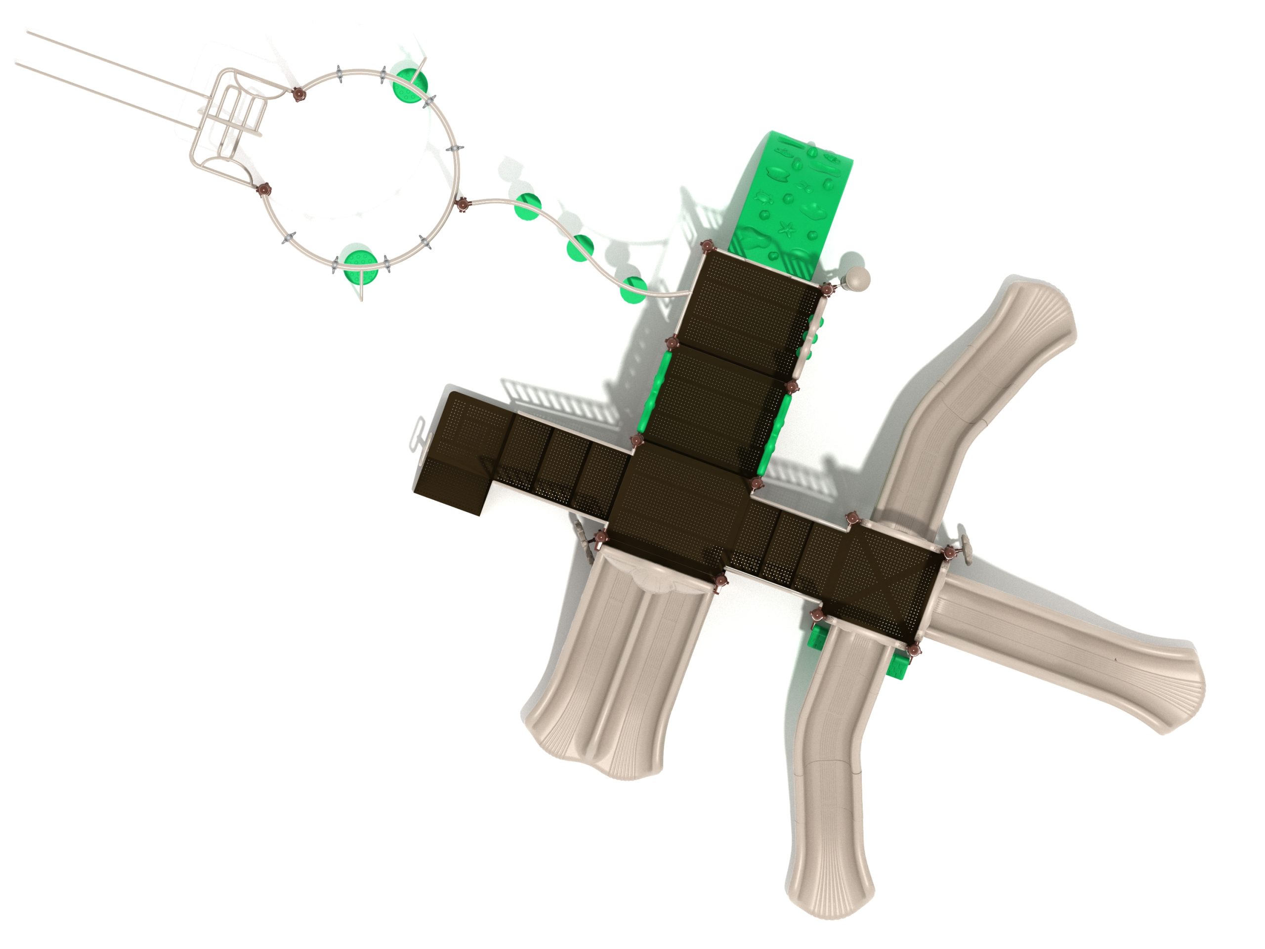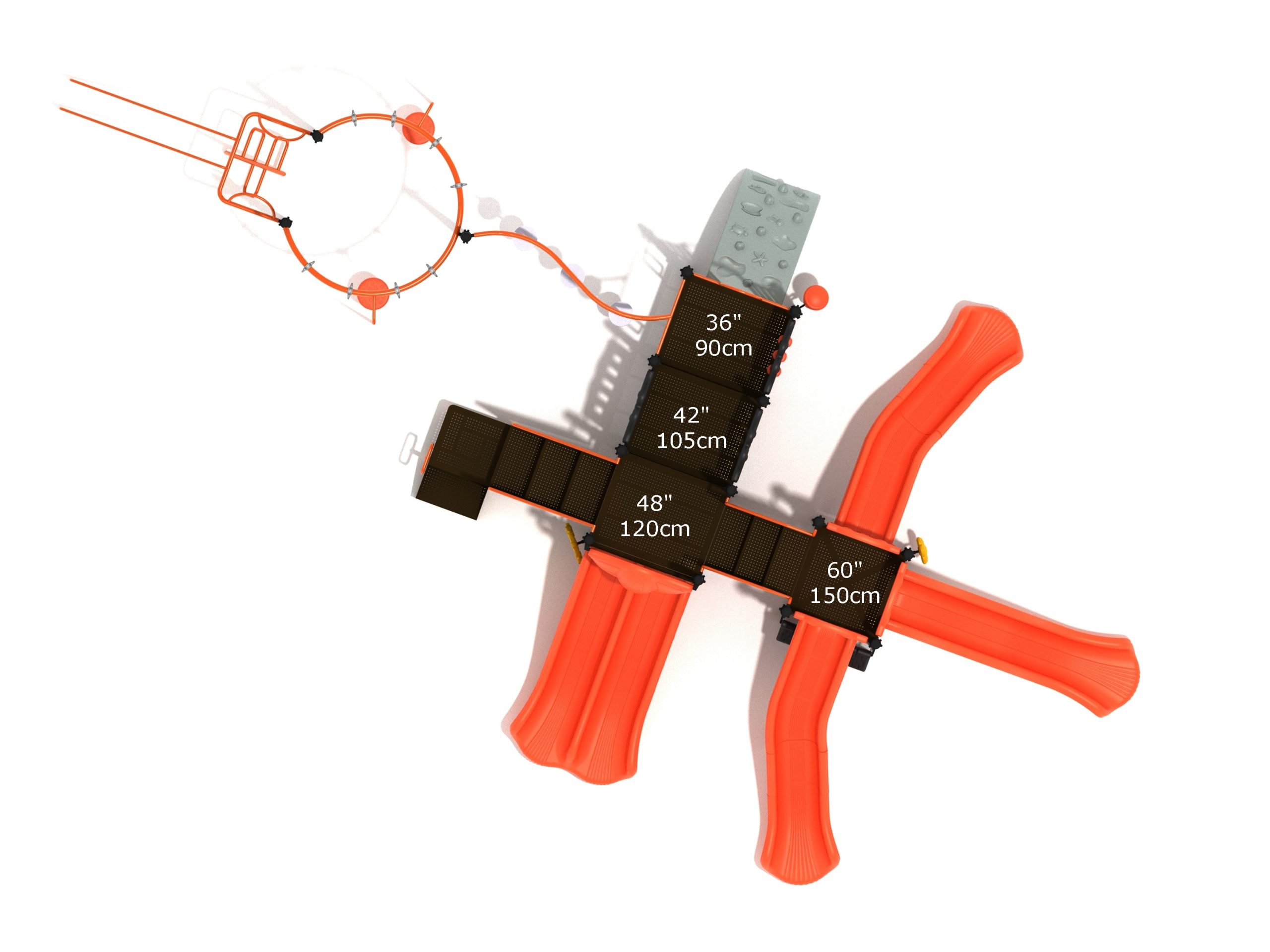 If you want to guarantee non-stop fun and adventure in a playground, choose to install the Goleta play structure as there are endless good times to be had here. The obstacle course part of the Goleta features Parallel Sliding Rails which require excellent coordination and arm strength to get across successfully either up or down. Swinging round in a circle will bring great amusement on the Double Curved Overhead Swinging Ring Ladder and it also has two Pebble Climbers to reach them. To get to the main structure there’s a Lily Pad Challenge Bridge which is sure to give a mental workout as well as a physical one. On the main structure itself the fun continues with both a Right Turn Slide and Left Turn Slide as well as a straight Wave Slide. Kids can use the fascinating Sea Creature Climber to reach the upper level and go down the Double Slide holding hands with a friend. Other features include a Store Panel for roleplaying, a Tic Tac Toe Panel to be played with peers or an adult, and a Ship’s Wheel for those dreaming of pirate adventures. A Single Drum and Rain Wheel bring a musical element to any play time.