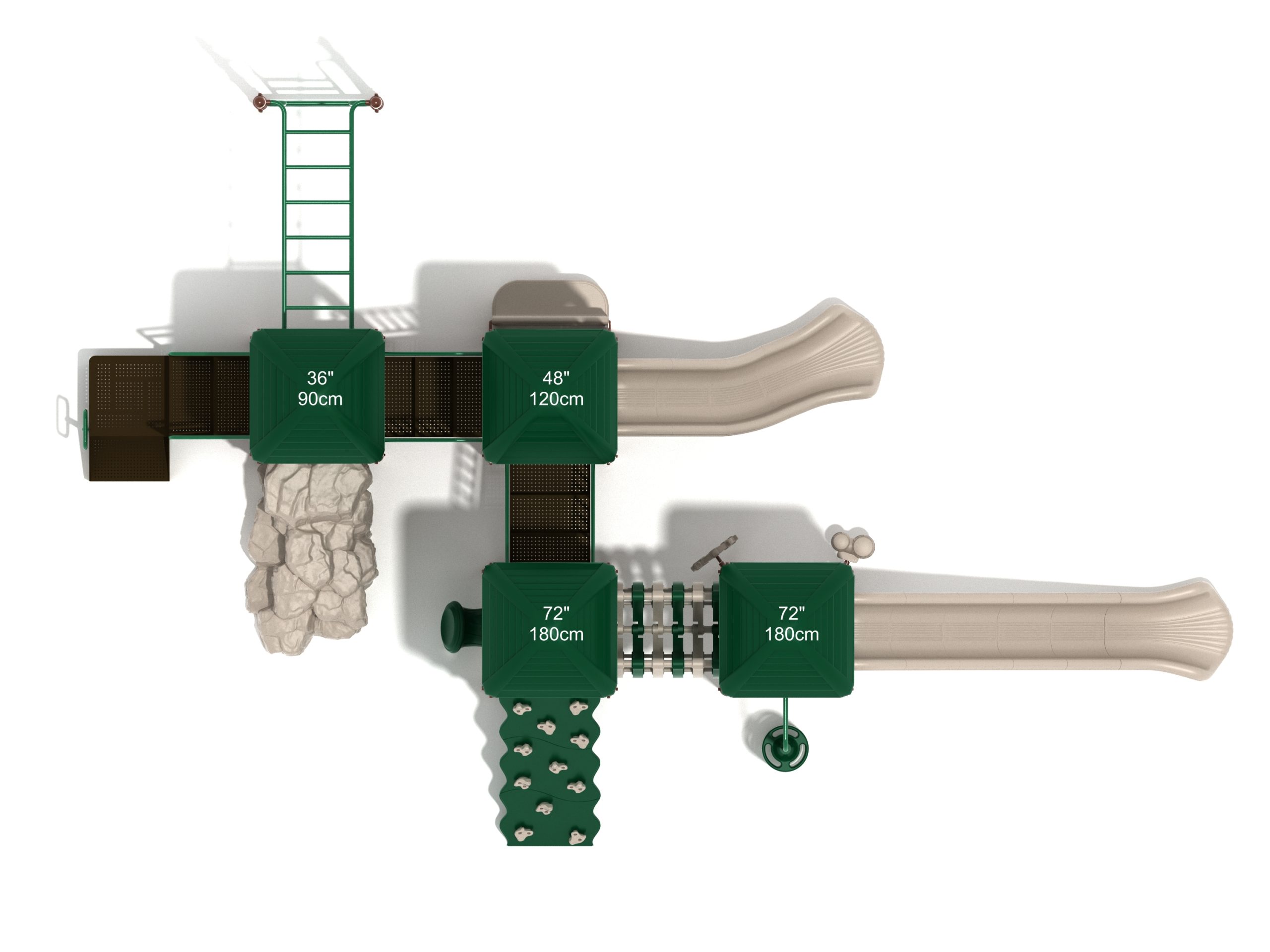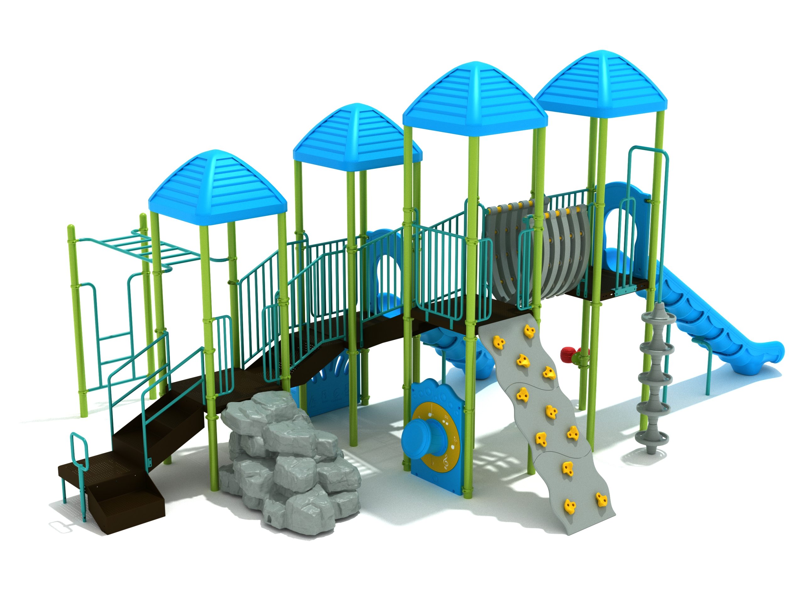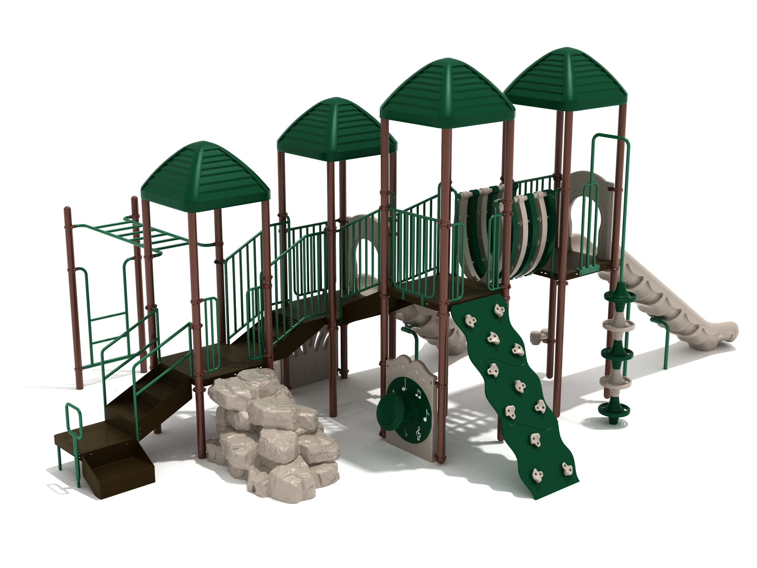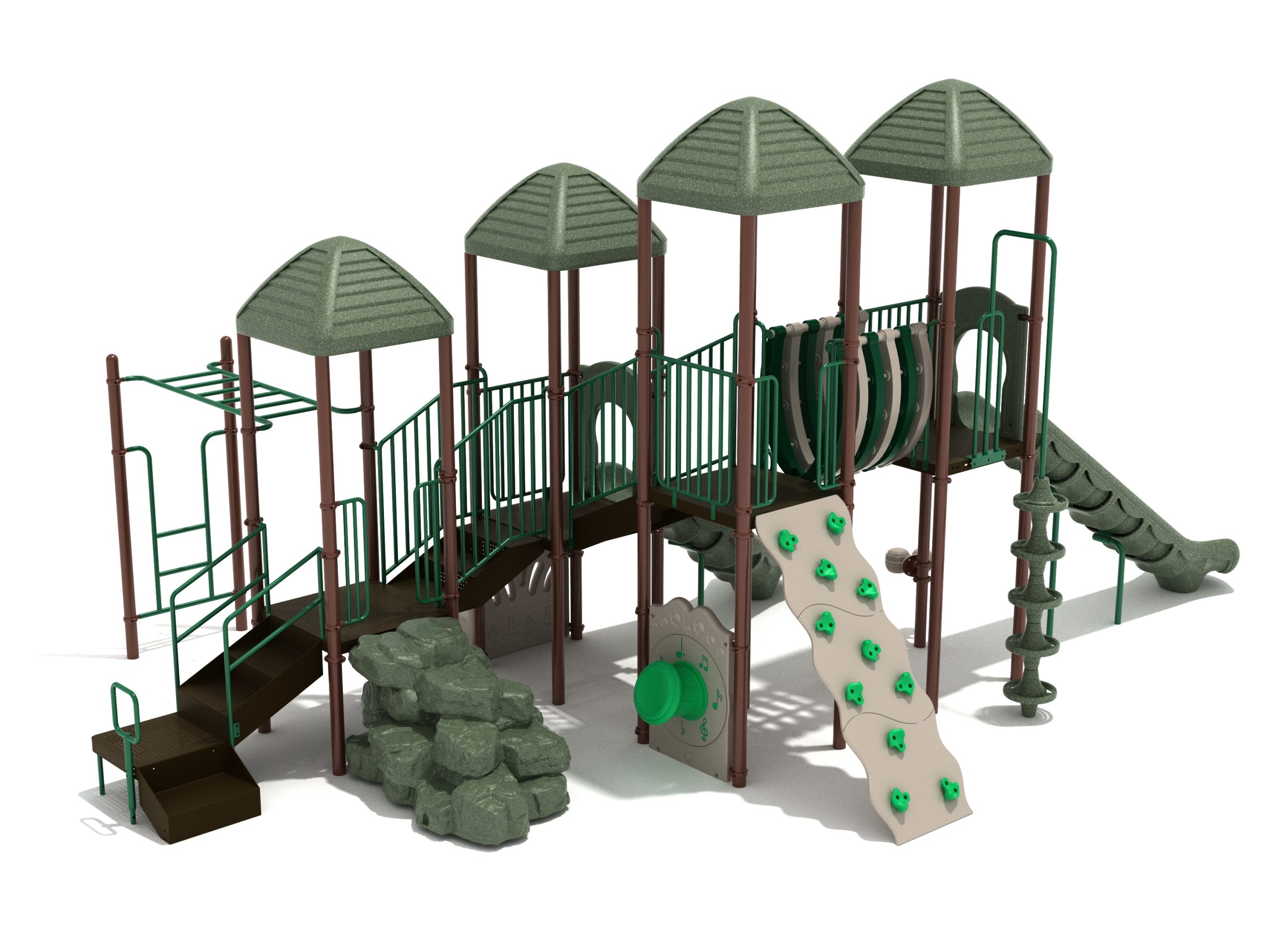 When you need outdoor play equipment to entertain around fifty children at the same time in a playground or park, choose the Greenville play structure. Kids can choose a rocky mountain path on the Boulder Climber or use their strength and agility to climb up using the Rock Climbing Wall with multiple holds. The Pod Climber offers a different experience and needs careful coordination to climb, or they can swing in the jungle on the Overhead Straight Rung Horizontal Ladder accessed by a small Vertical Ladder. As they work their way through the Greenville underneath four Line Roofs to protect from the sun and rain, children can cross the wobbly Bones Bridge before experiencing the twists and turns of the Left Hand Slide or head down the speedy Straight Slide. There’s a Drum Panel and Bongos that children can hit to make deep tribal sounds which add to the atmosphere of the playground, and a Ship’s Wheel for taking others on ocean adventures. The Bench Panel offers a place to sit and relax before deciding which fun activity to enjoy next.