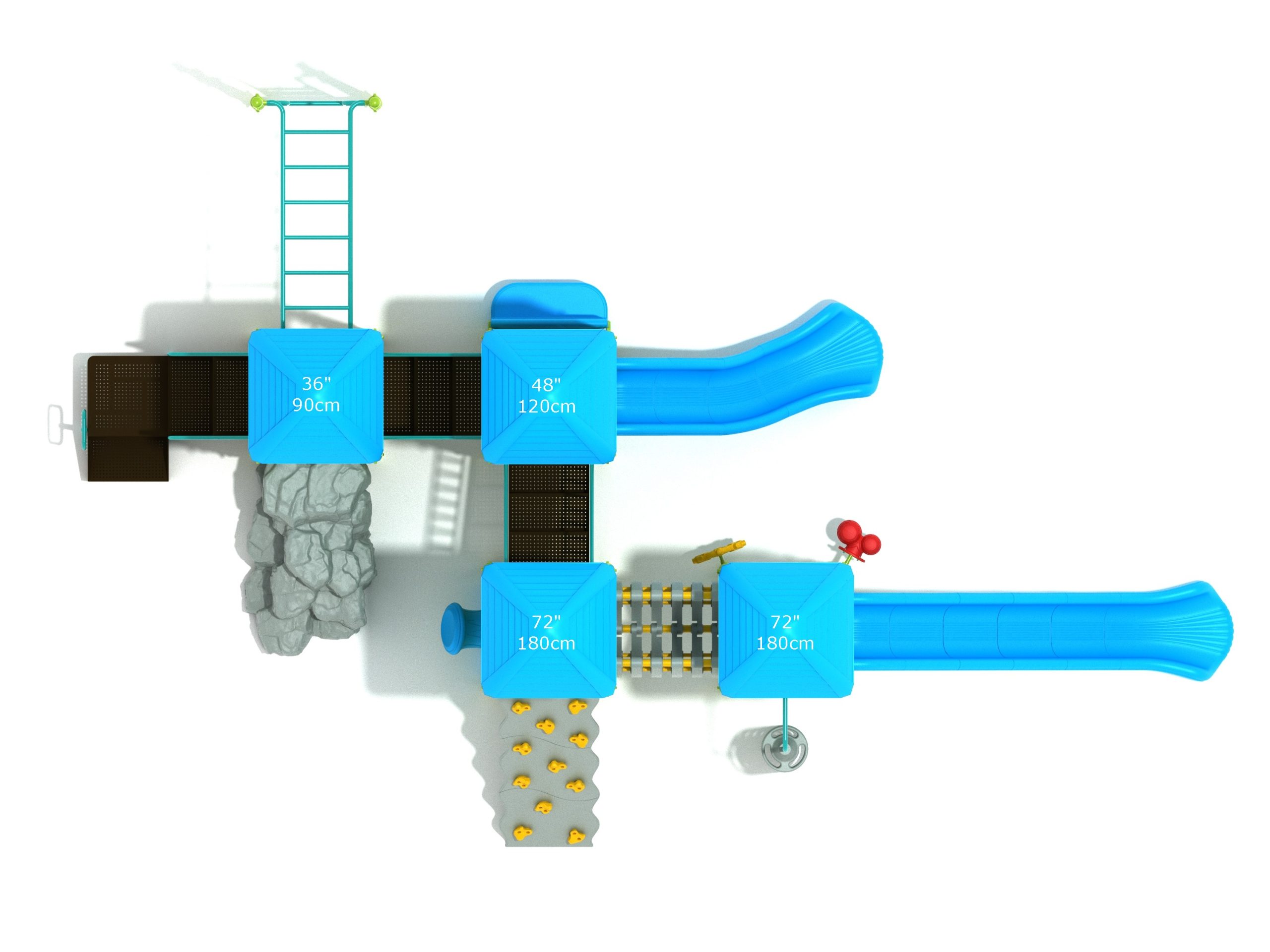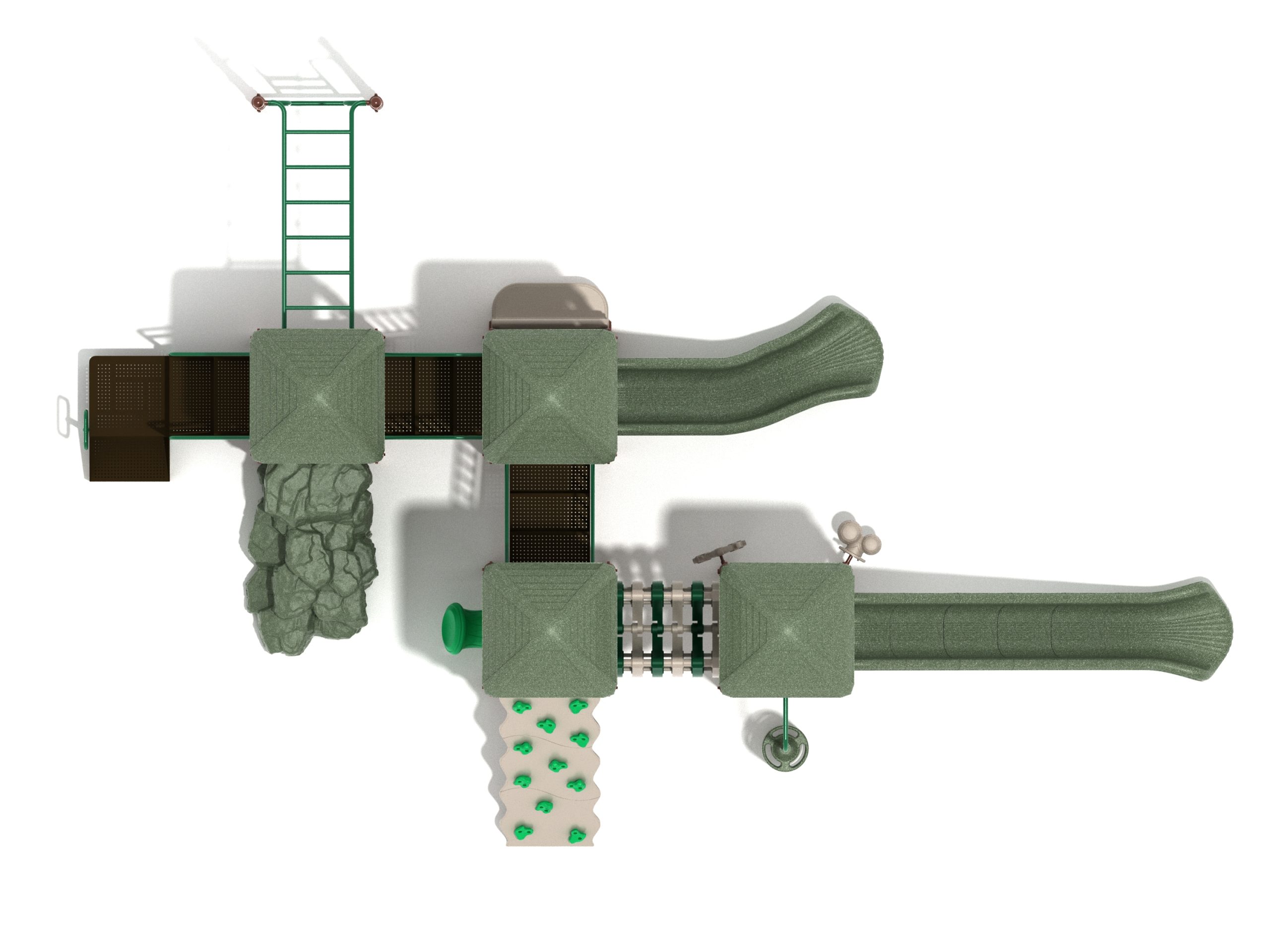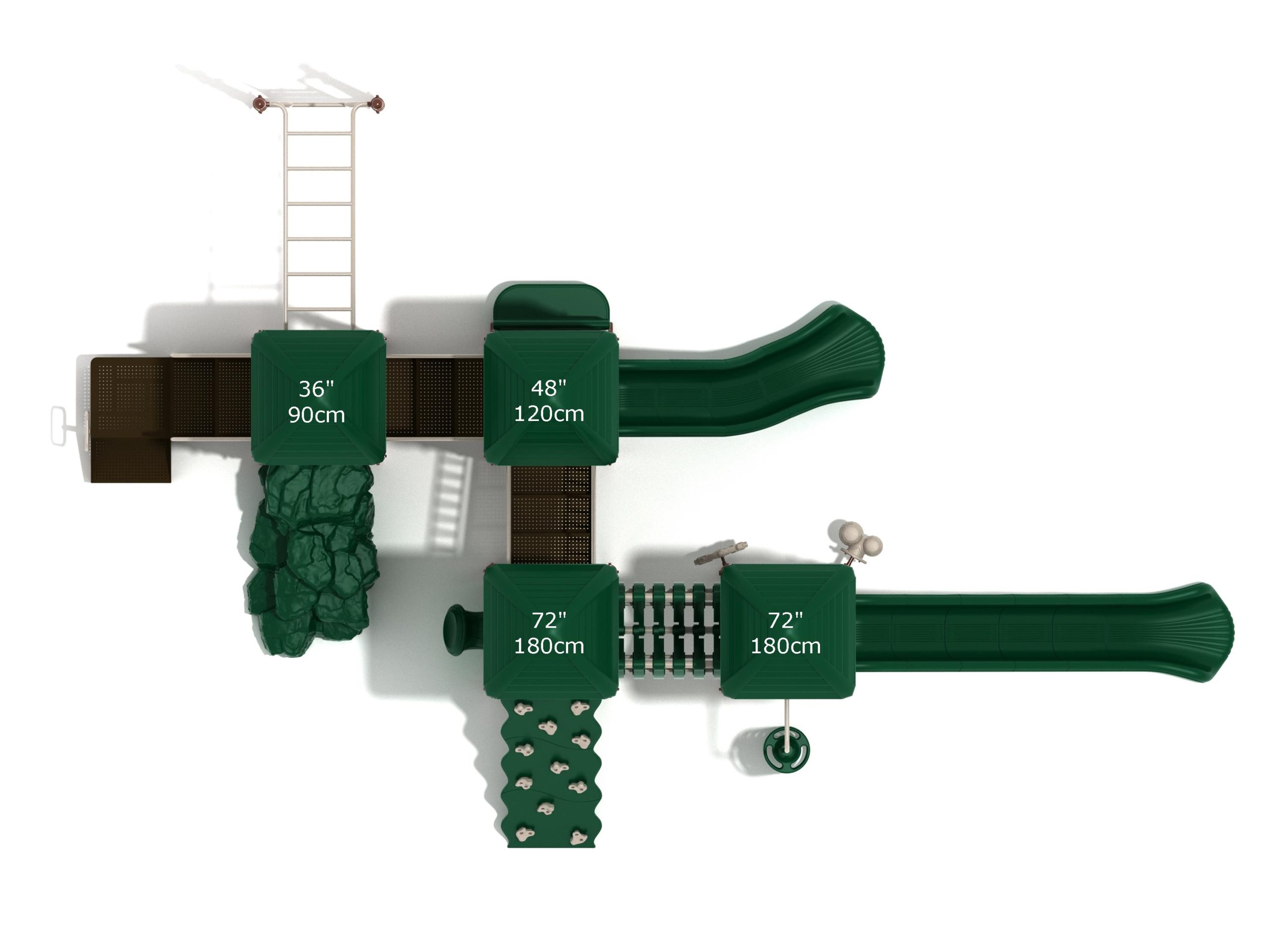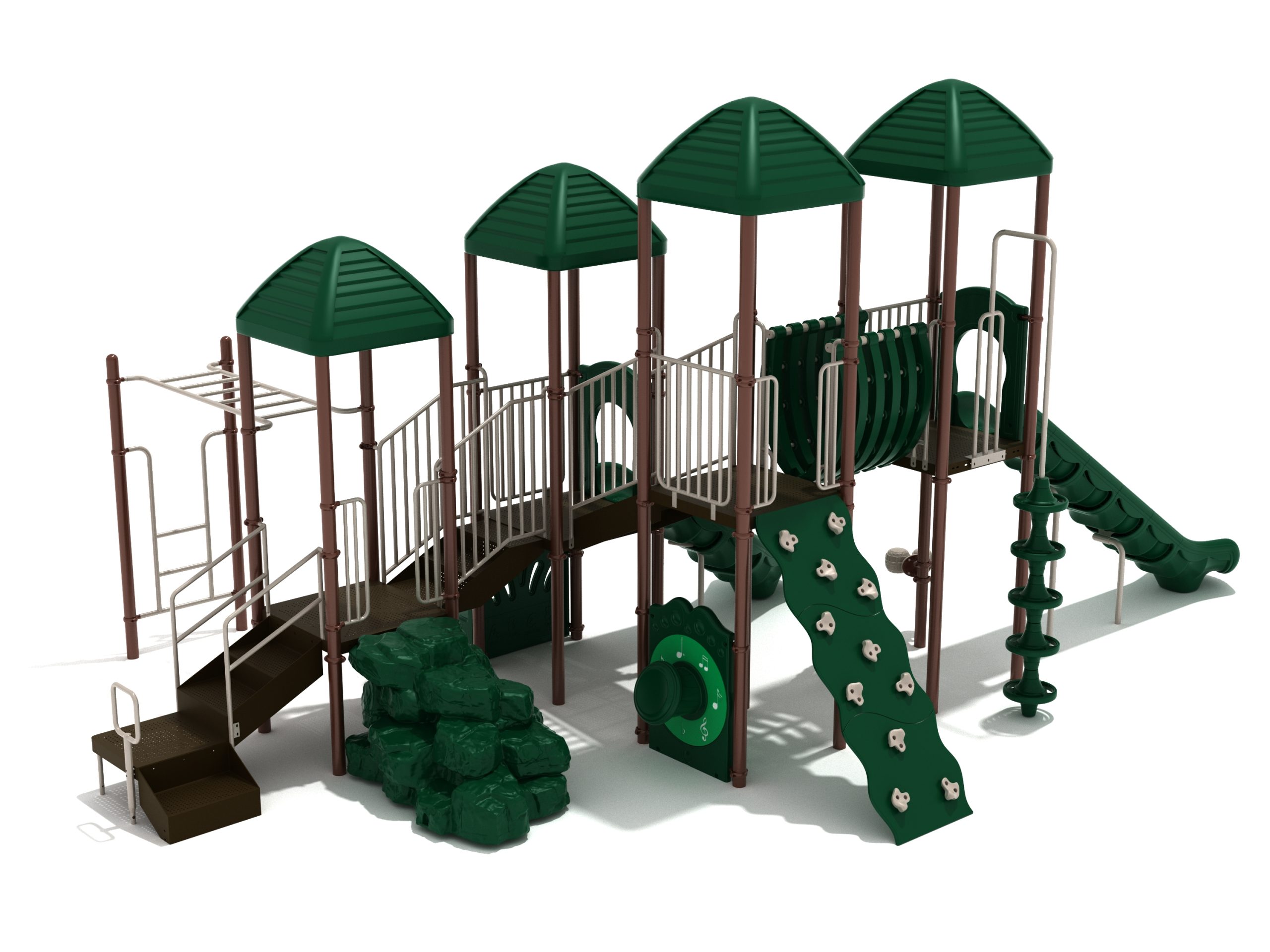 When you need outdoor play equipment to entertain around fifty children at the same time in a playground or park, choose the Greenville play structure. Kids can choose a rocky mountain path on the Boulder Climber or use their strength and agility to climb up using the Rock Climbing Wall with multiple holds. The Pod Climber offers a different experience and needs careful coordination to climb, or they can swing in the jungle on the Overhead Straight Rung Horizontal Ladder accessed by a small Vertical Ladder. As they work their way through the Greenville underneath four Line Roofs to protect from the sun and rain, children can cross the wobbly Bones Bridge before experiencing the twists and turns of the Left Hand Slide or head down the speedy Straight Slide. There’s a Drum Panel and Bongos that children can hit to make deep tribal sounds which add to the atmosphere of the playground, and a Ship’s Wheel for taking others on ocean adventures. The Bench Panel offers a place to sit and relax before deciding which fun activity to enjoy next.