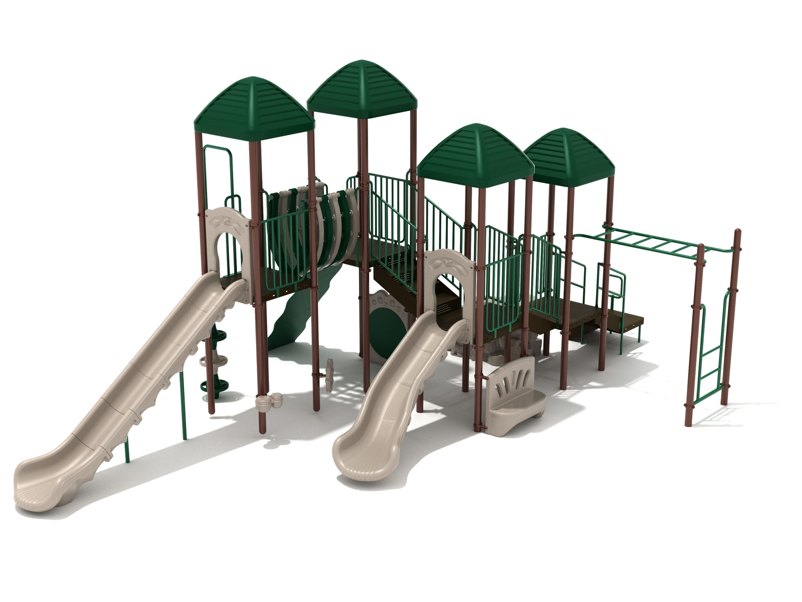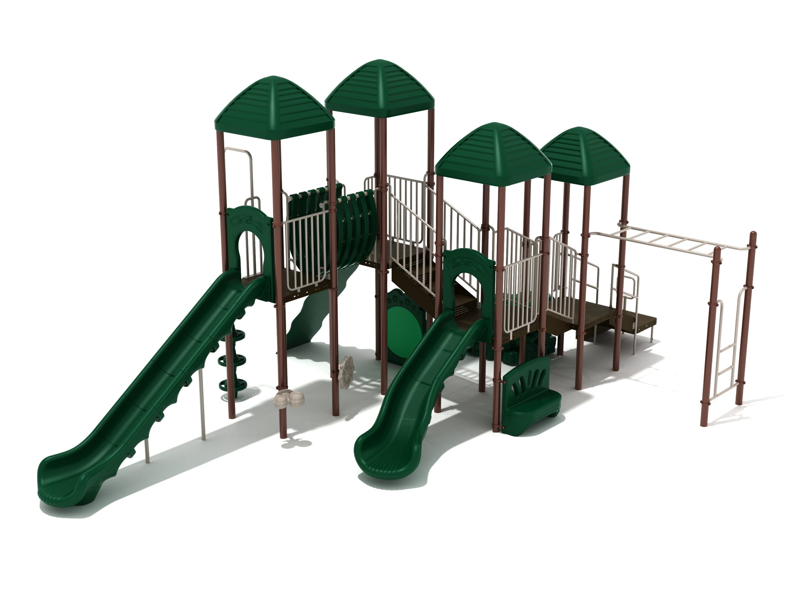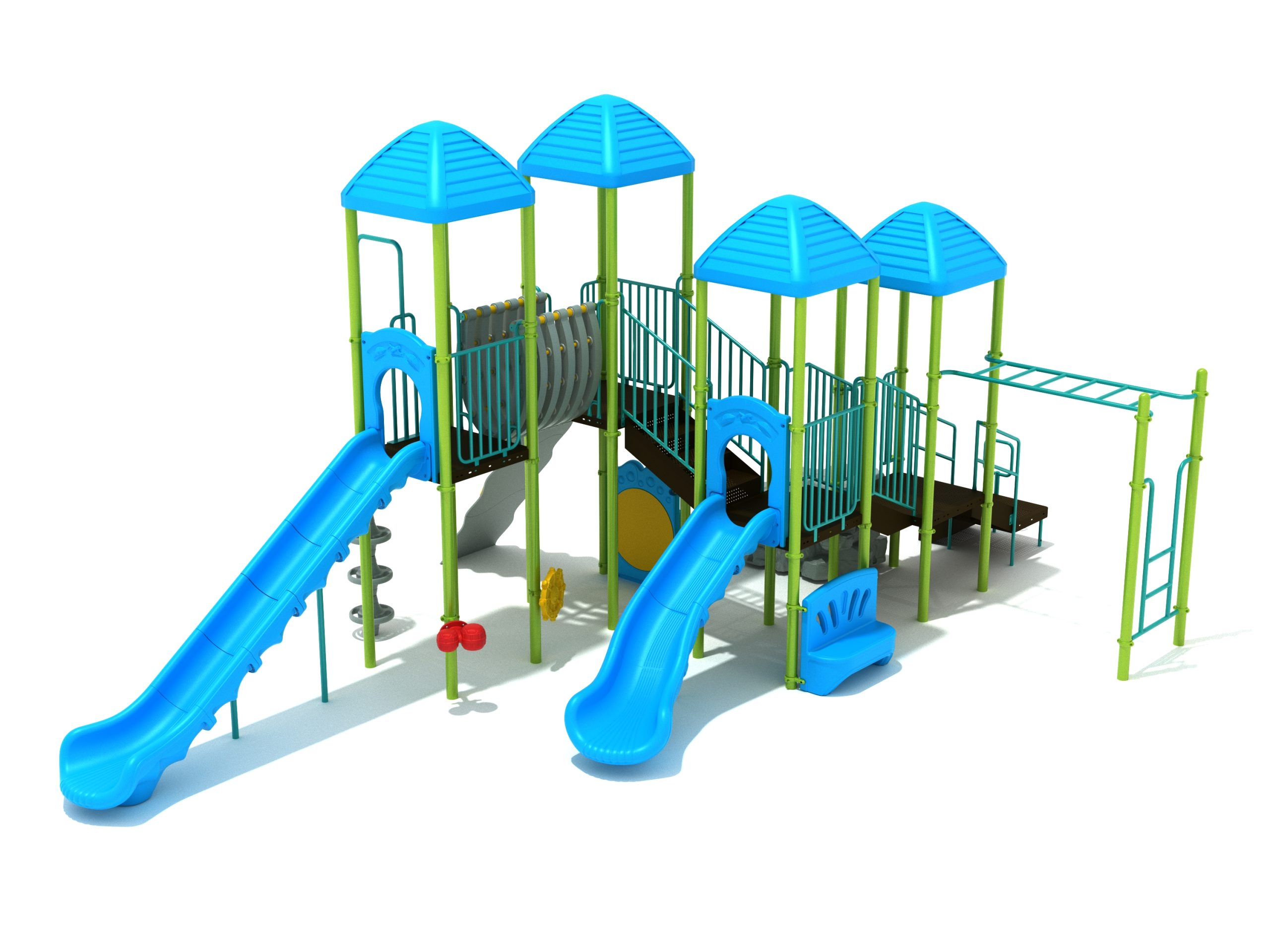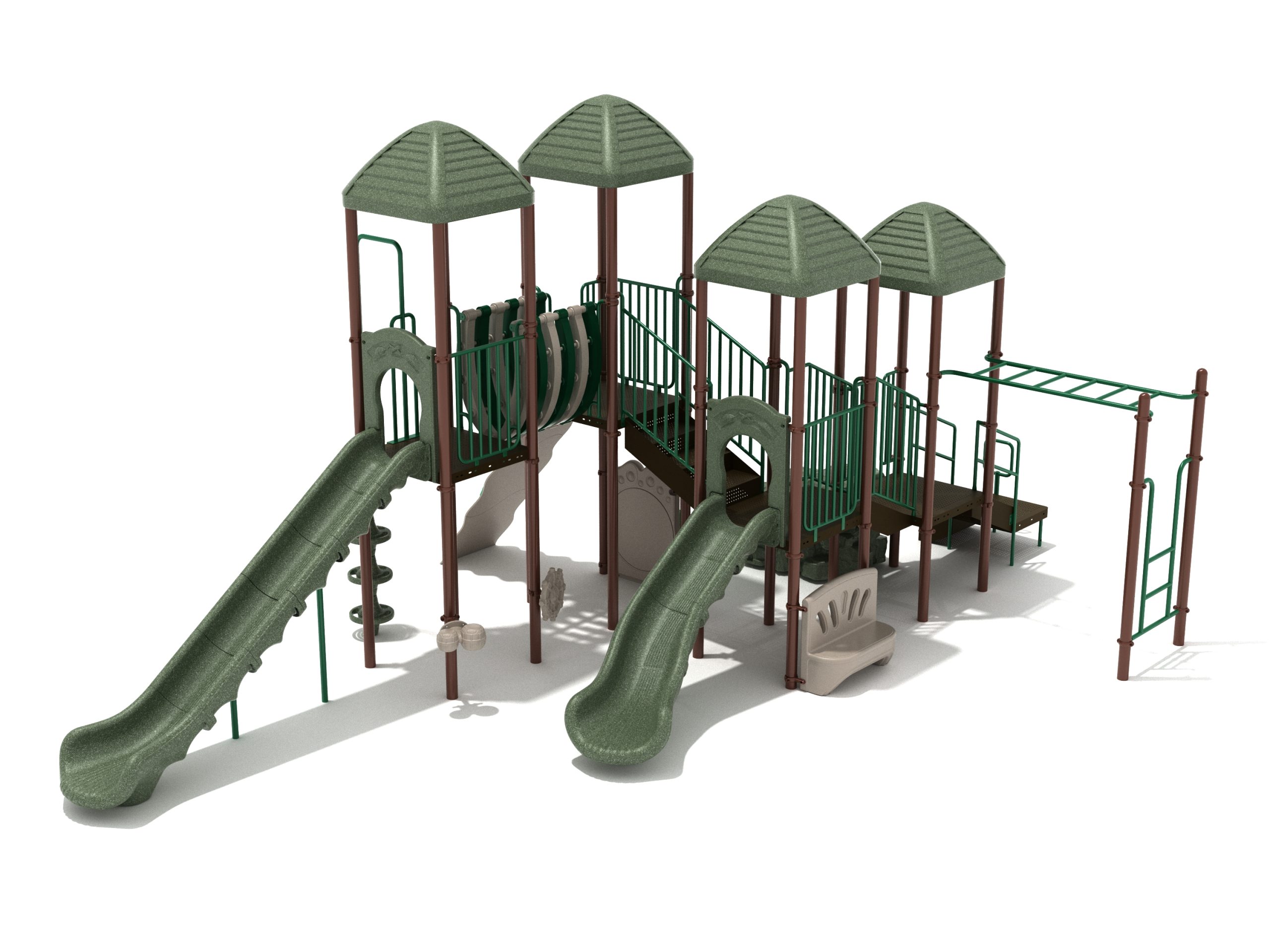 When you need outdoor play equipment to entertain around fifty children at the same time in a playground or park, choose the Greenville play structure. Kids can choose a rocky mountain path on the Boulder Climber or use their strength and agility to climb up using the Rock Climbing Wall with multiple holds. The Pod Climber offers a different experience and needs careful coordination to climb, or they can swing in the jungle on the Overhead Straight Rung Horizontal Ladder accessed by a small Vertical Ladder. As they work their way through the Greenville underneath four Line Roofs to protect from the sun and rain, children can cross the wobbly Bones Bridge before experiencing the twists and turns of the Left Hand Slide or head down the speedy Straight Slide. There’s a Drum Panel and Bongos that children can hit to make deep tribal sounds which add to the atmosphere of the playground, and a Ship’s Wheel for taking others on ocean adventures. The Bench Panel offers a place to sit and relax before deciding which fun activity to enjoy next.