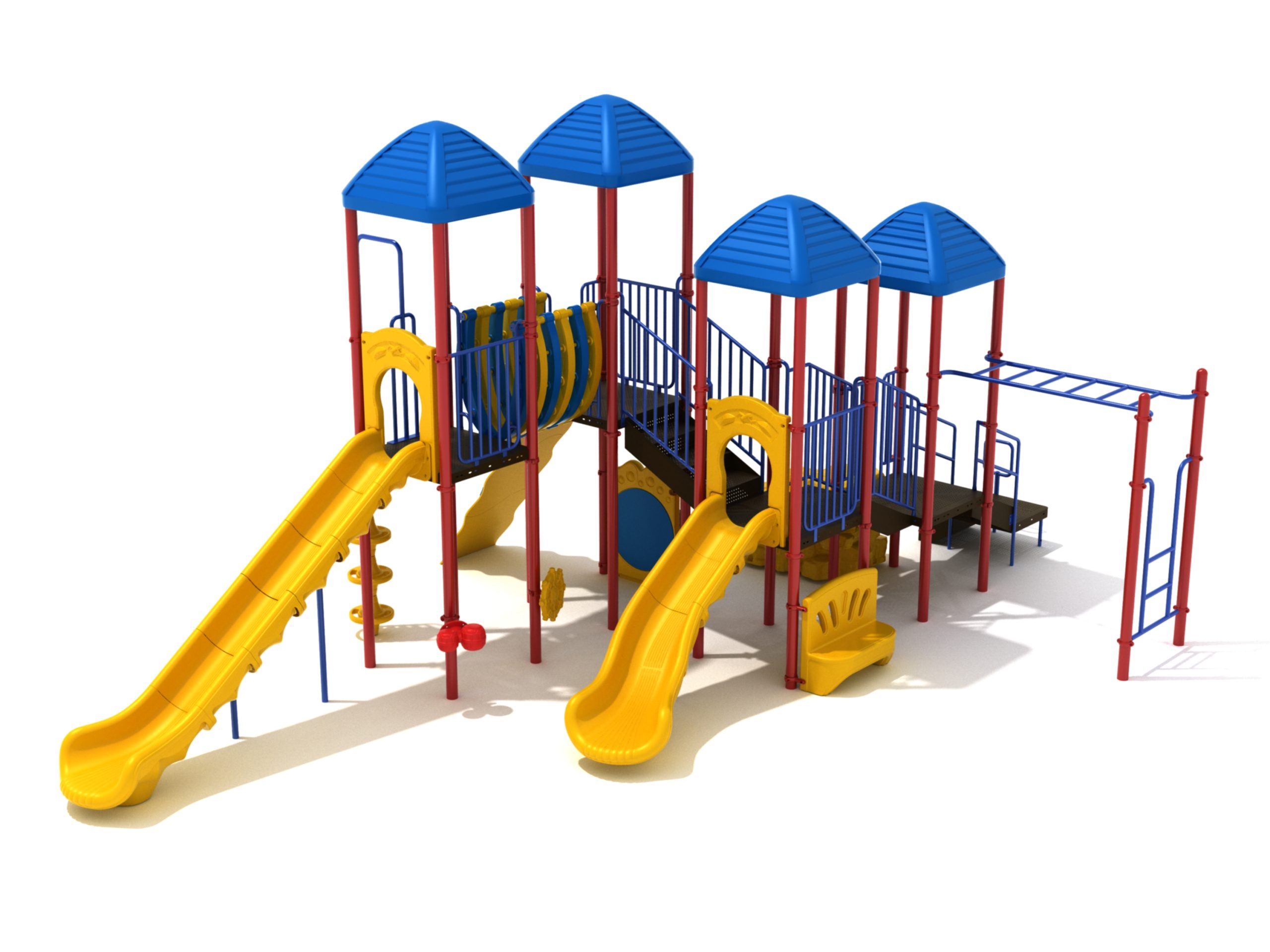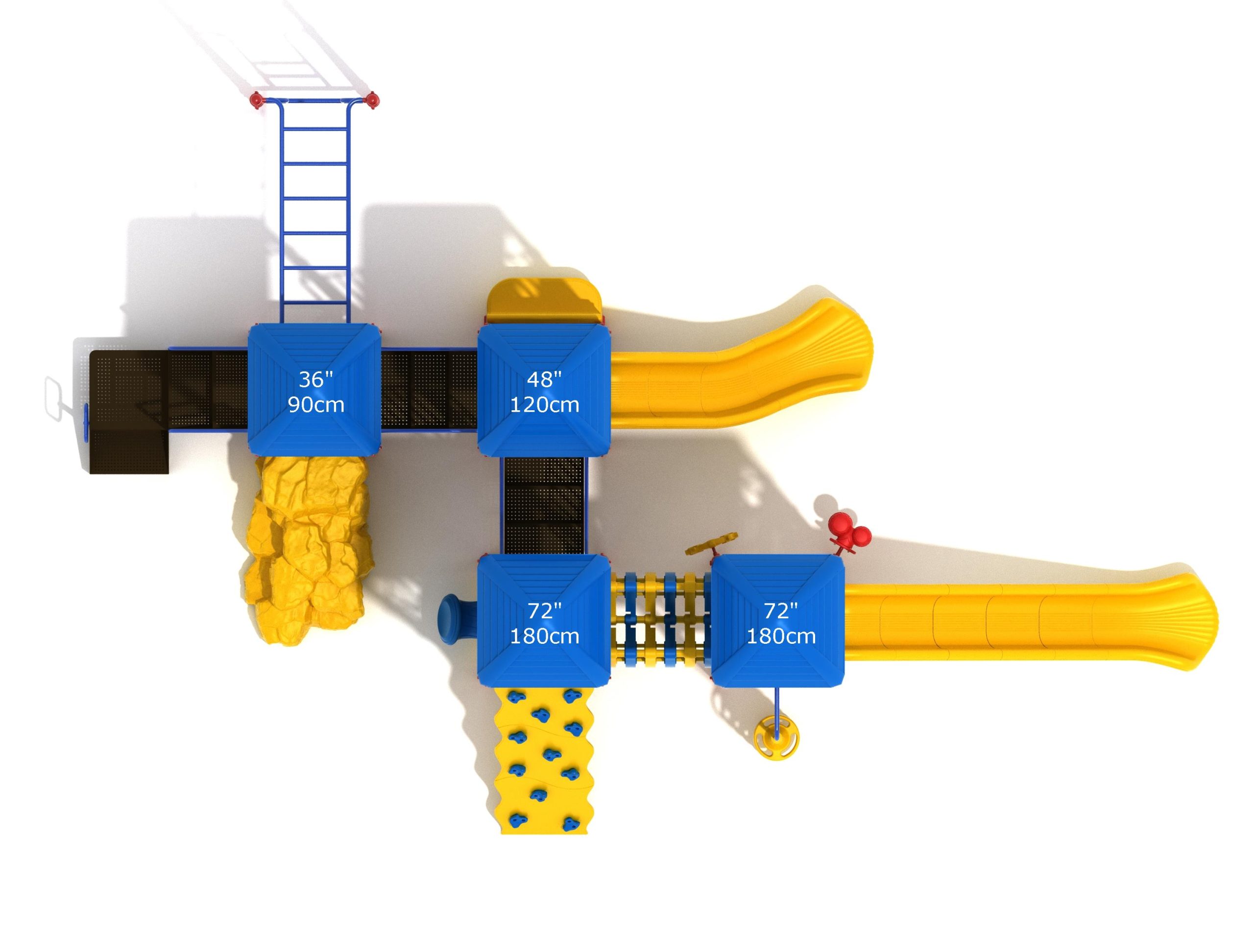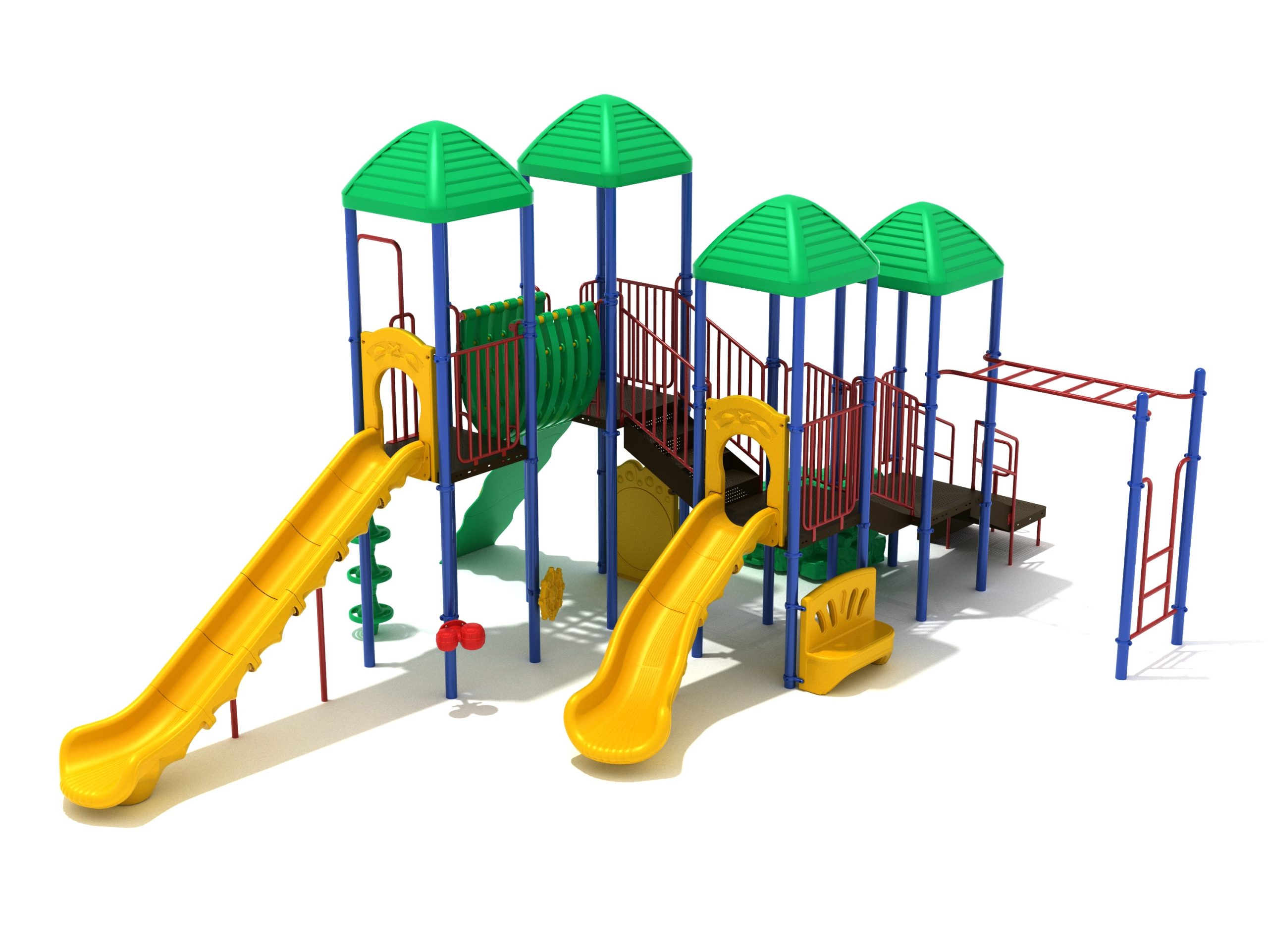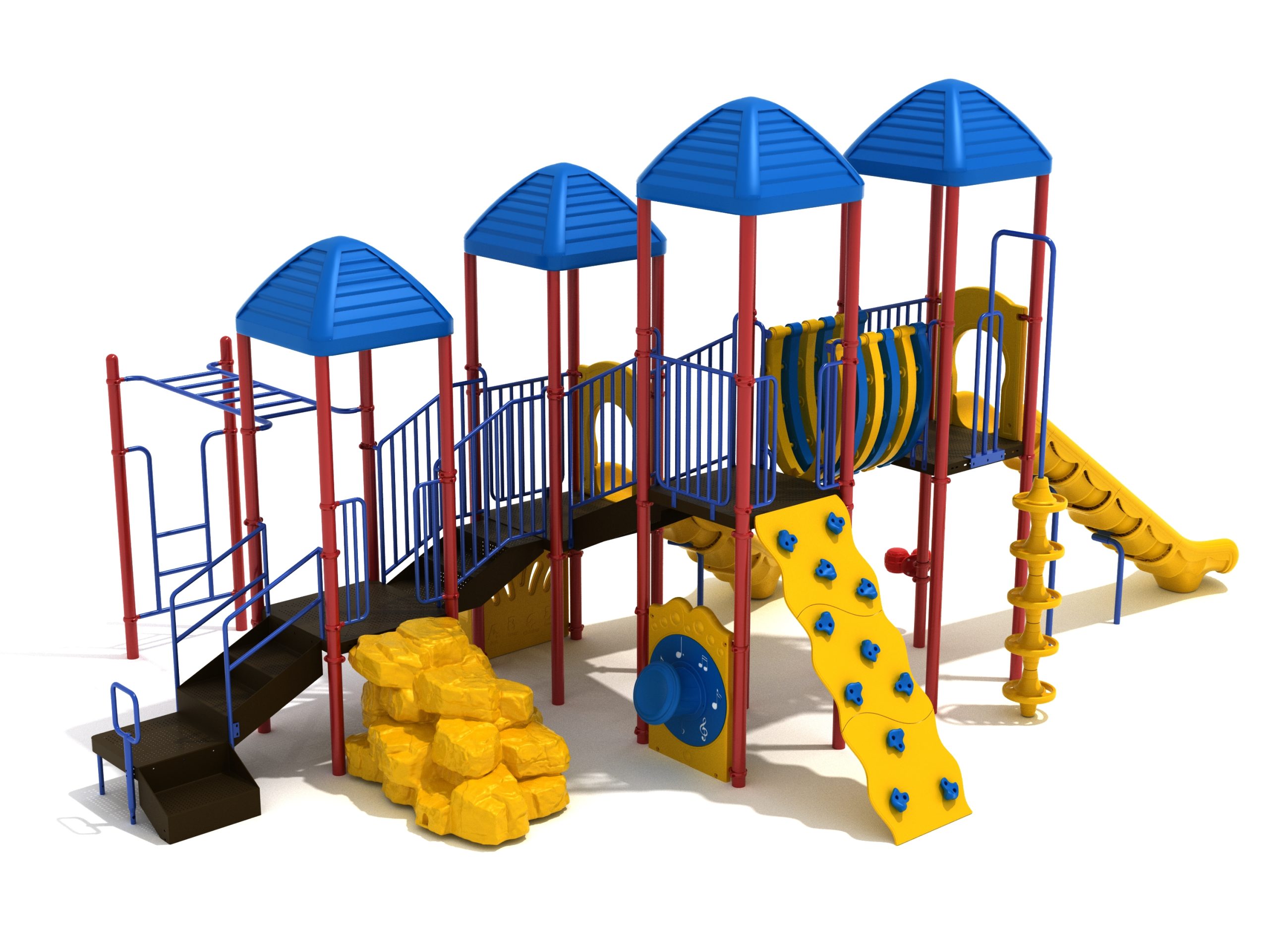 When you need outdoor play equipment to entertain around fifty children at the same time in a playground or park, choose the Greenville play structure. Kids can choose a rocky mountain path on the Boulder Climber or use their strength and agility to climb up using the Rock Climbing Wall with multiple holds. The Pod Climber offers a different experience and needs careful coordination to climb, or they can swing in the jungle on the Overhead Straight Rung Horizontal Ladder accessed by a small Vertical Ladder. As they work their way through the Greenville underneath four Line Roofs to protect from the sun and rain, children can cross the wobbly Bones Bridge before experiencing the twists and turns of the Left Hand Slide or head down the speedy Straight Slide. There’s a Drum Panel and Bongos that children can hit to make deep tribal sounds which add to the atmosphere of the playground, and a Ship’s Wheel for taking others on ocean adventures. The Bench Panel offers a place to sit and relax before deciding which fun activity to enjoy next.