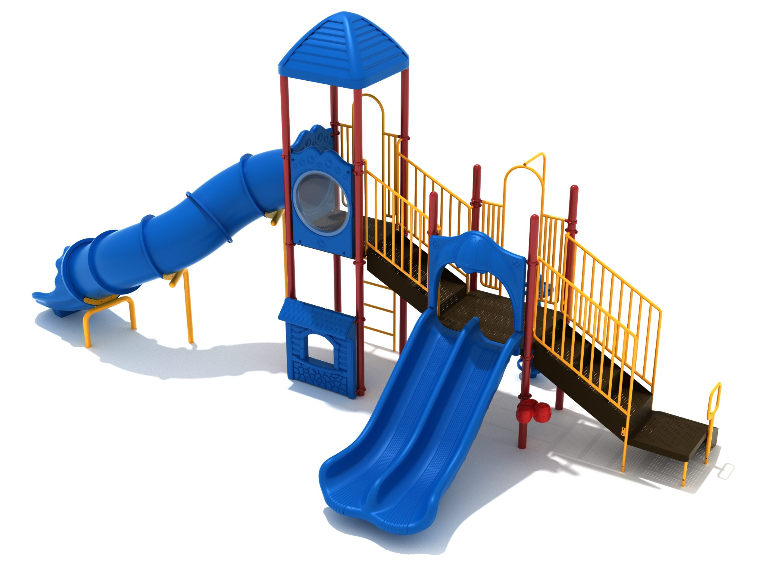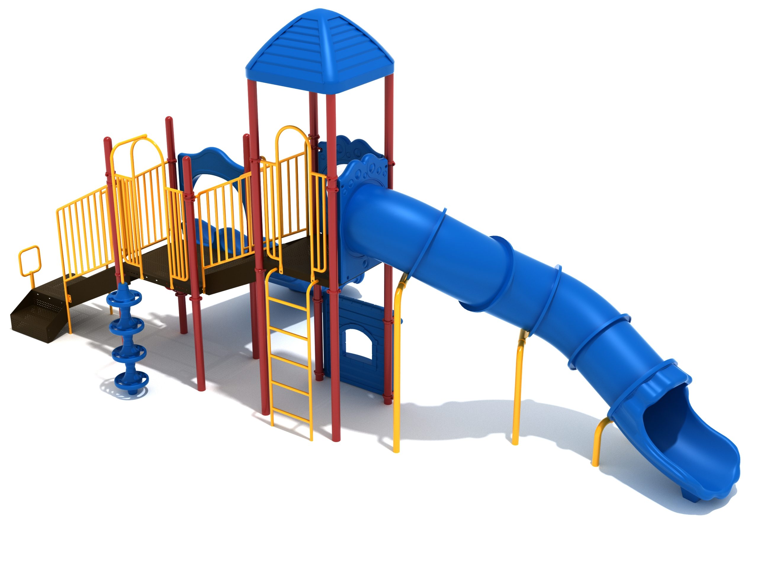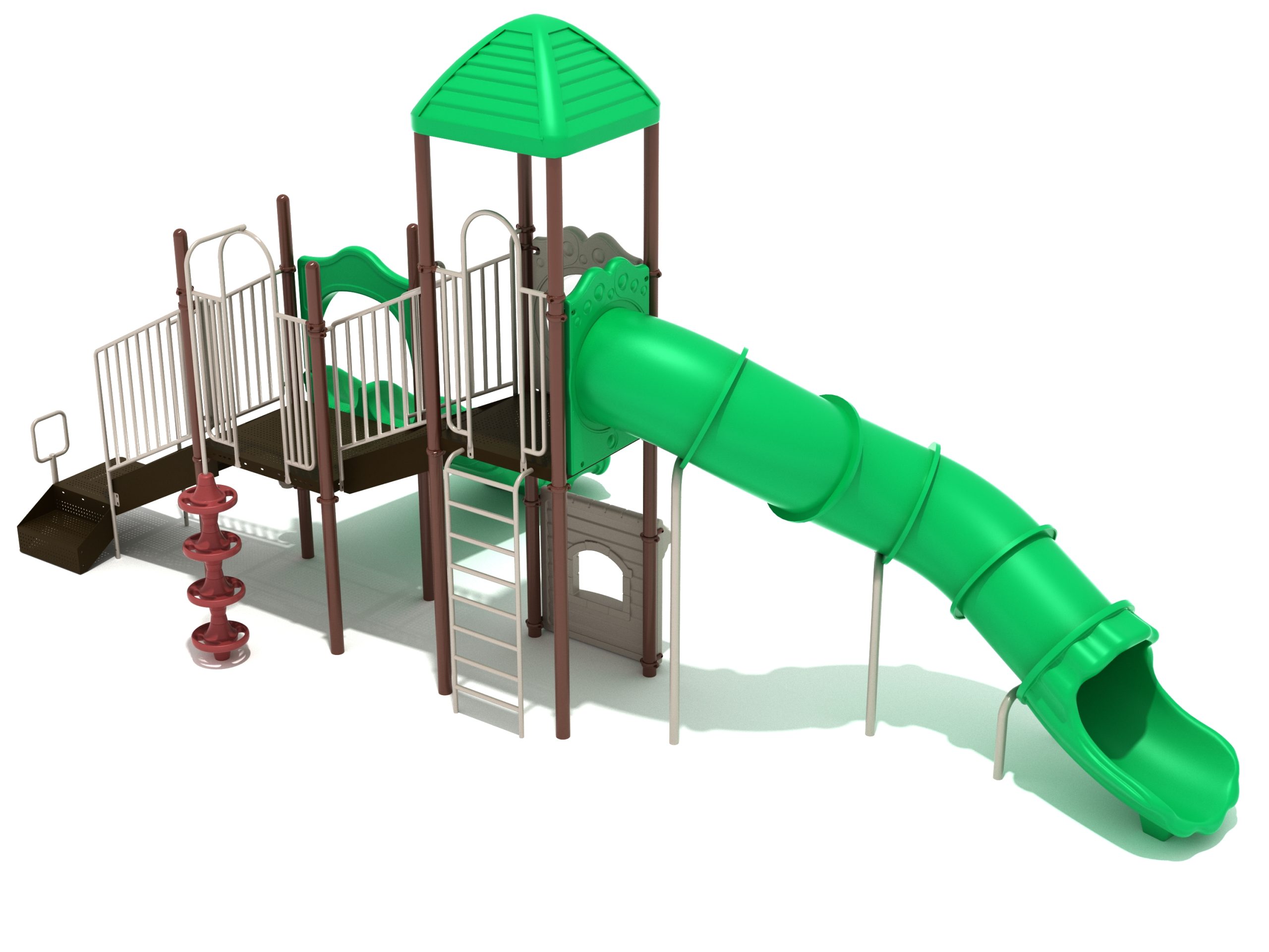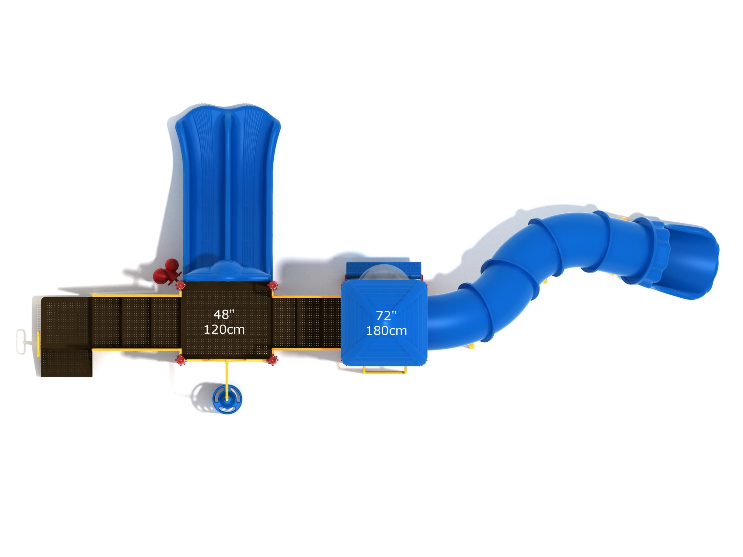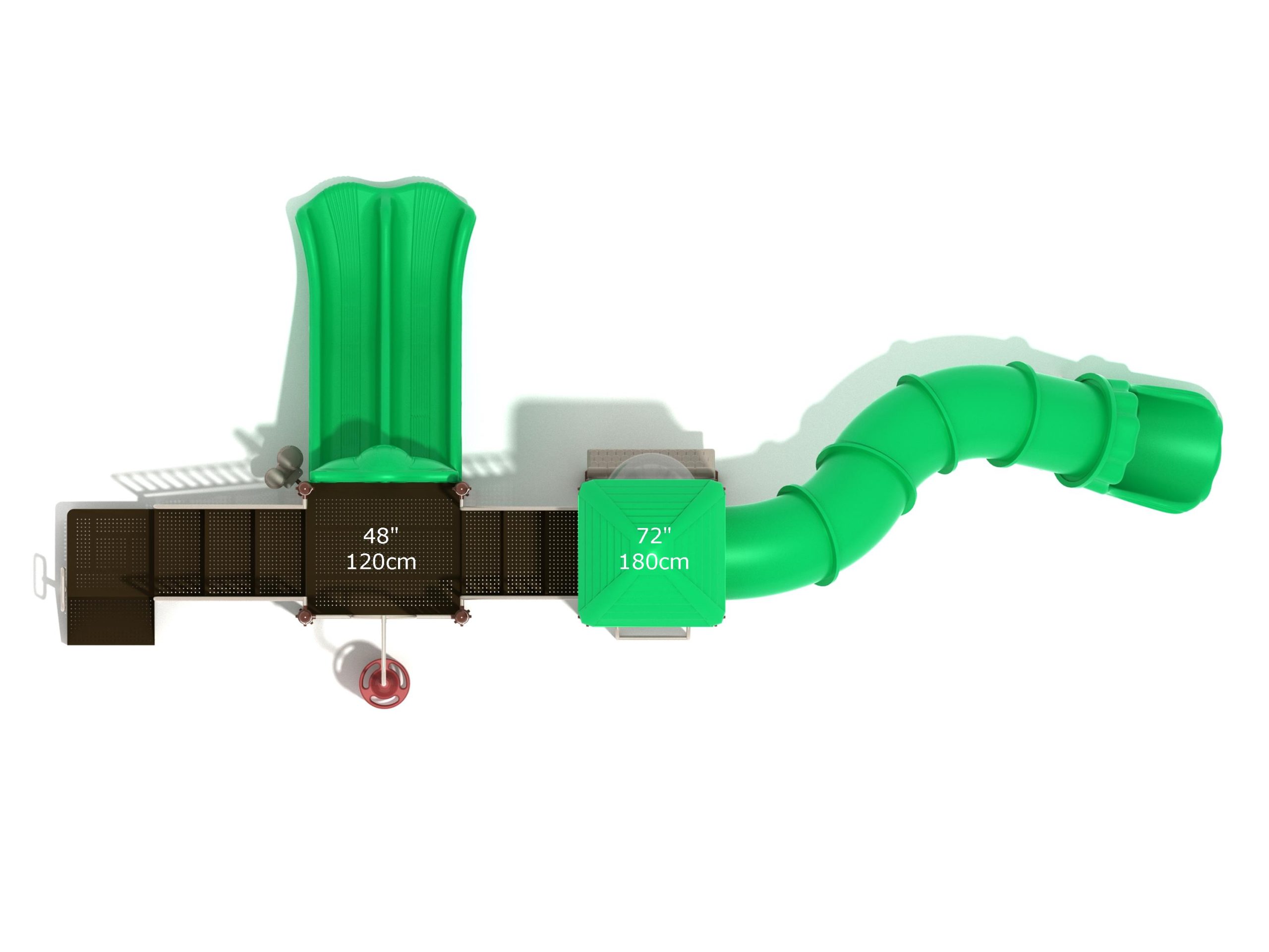 The Transfer Station on the Haywood provides easy access for children of all abilities to get onto the play structure and it leads up to two higher platforms. The lower platform can be accessed by the Pod Climber which has four circular discs with holes in them for little hands to grab hold of. At the top there’s a Double Slide straight in front of them to whizz down or they can continue to the higher deck and sit in the Bubble Panel and pretend they’re looking out of a spaceship window or a submarine. A Vertical Ladder also gives easy access to this deck which features a Line Roof to keep it shady and dry. The main feature of the Haywood is a long and swirly Curved Tube Slide which provides a real adventure as they twist and bump their way down. Around the bottom of the playset there’s a set of Bongos and a Store Panel to help kids engage in creative playtime.