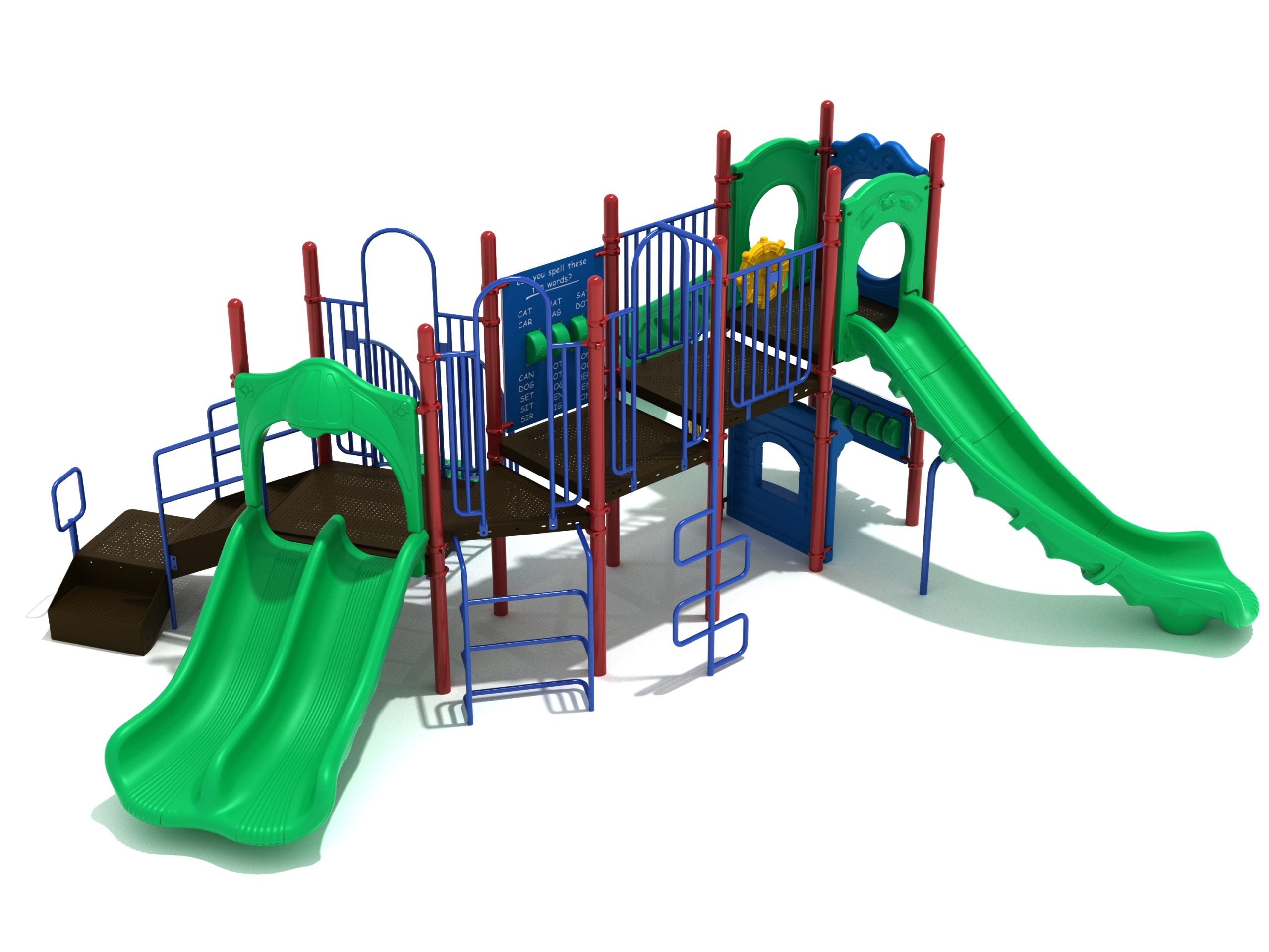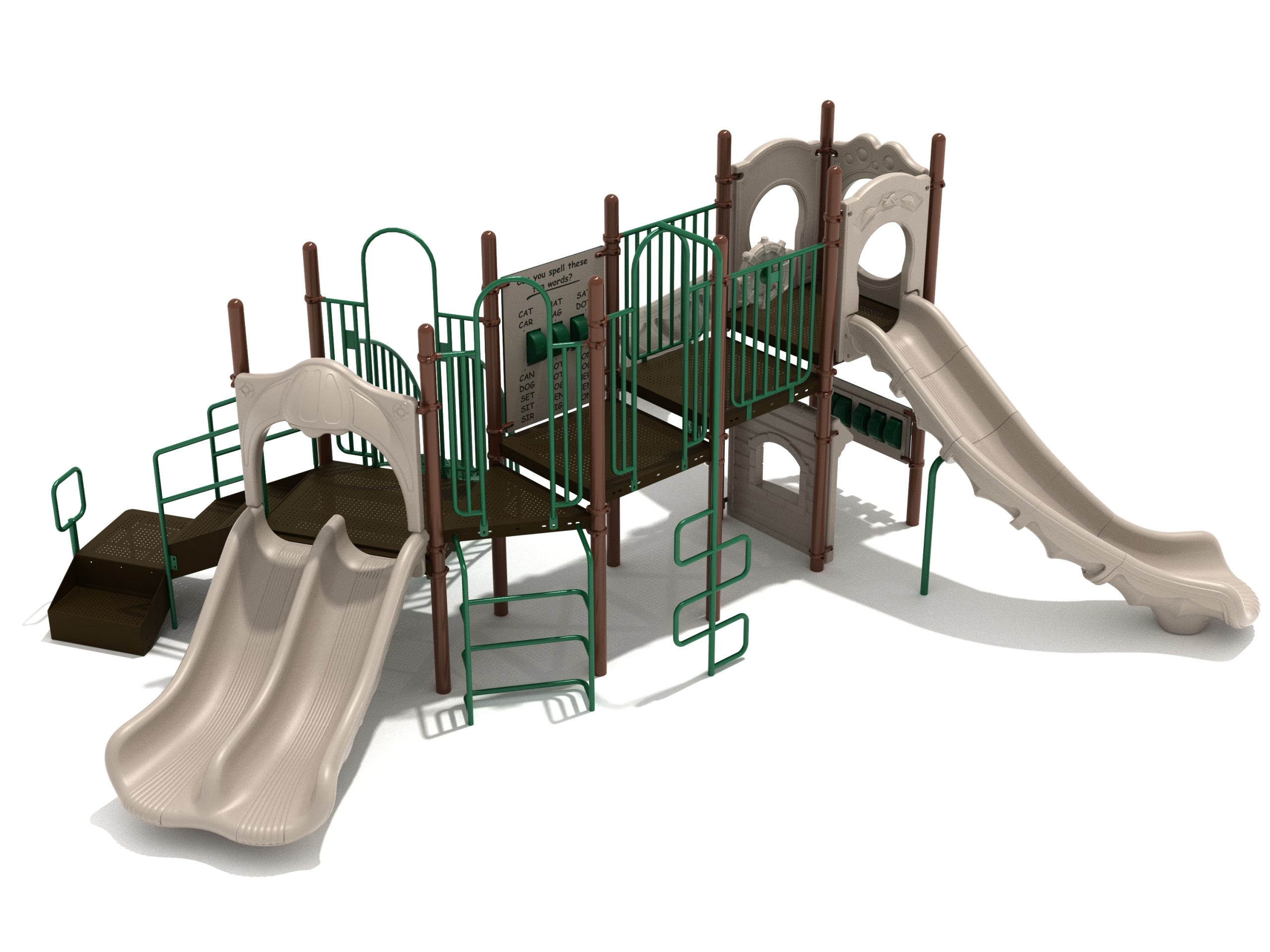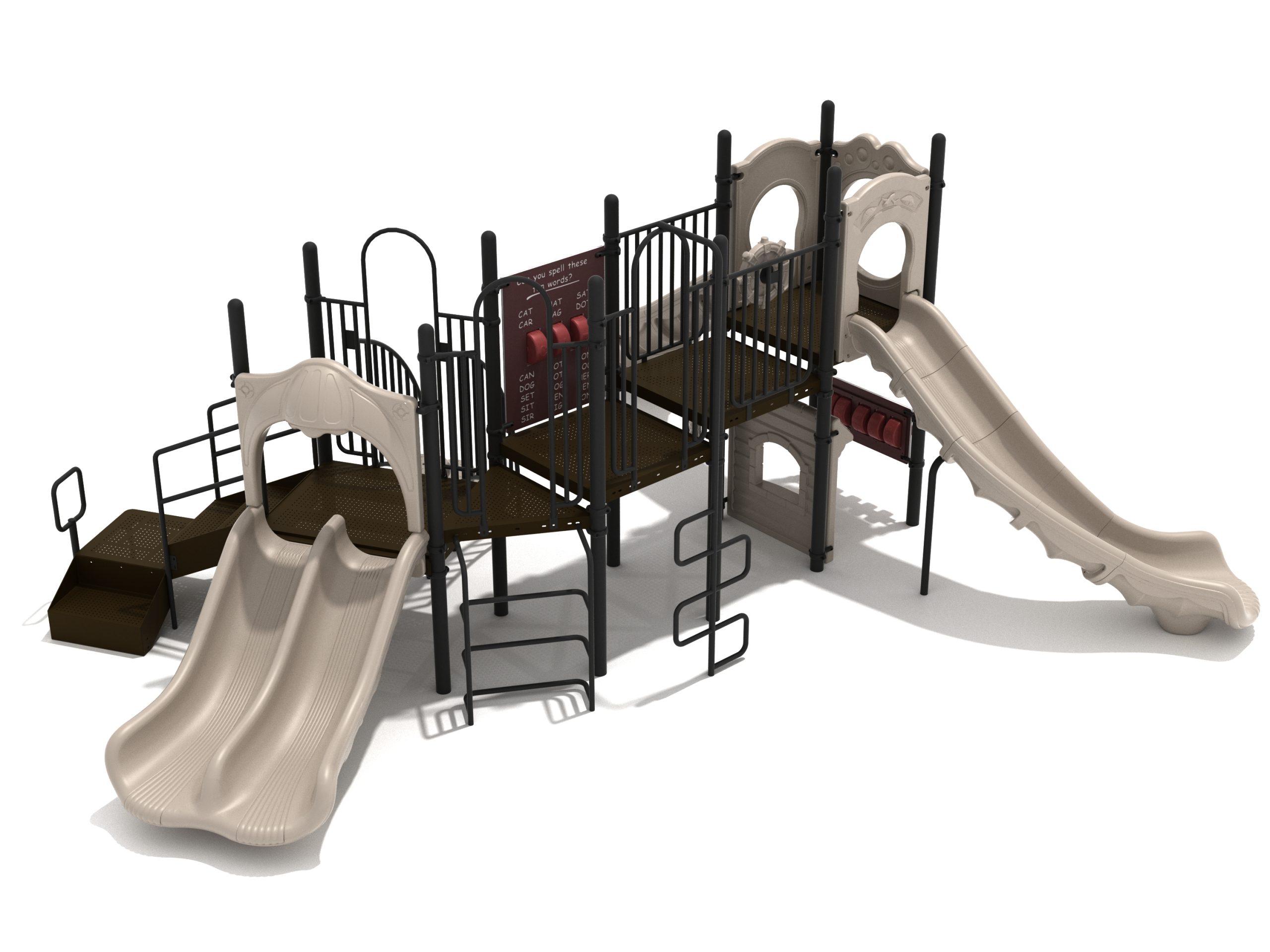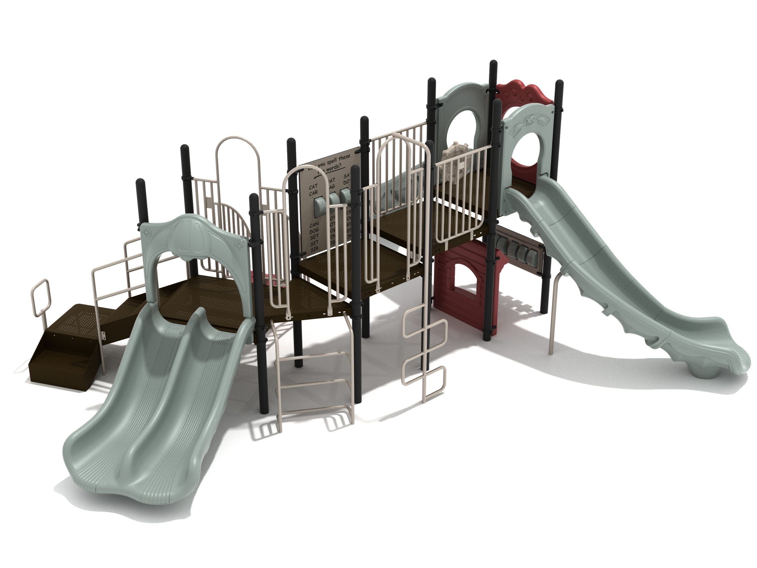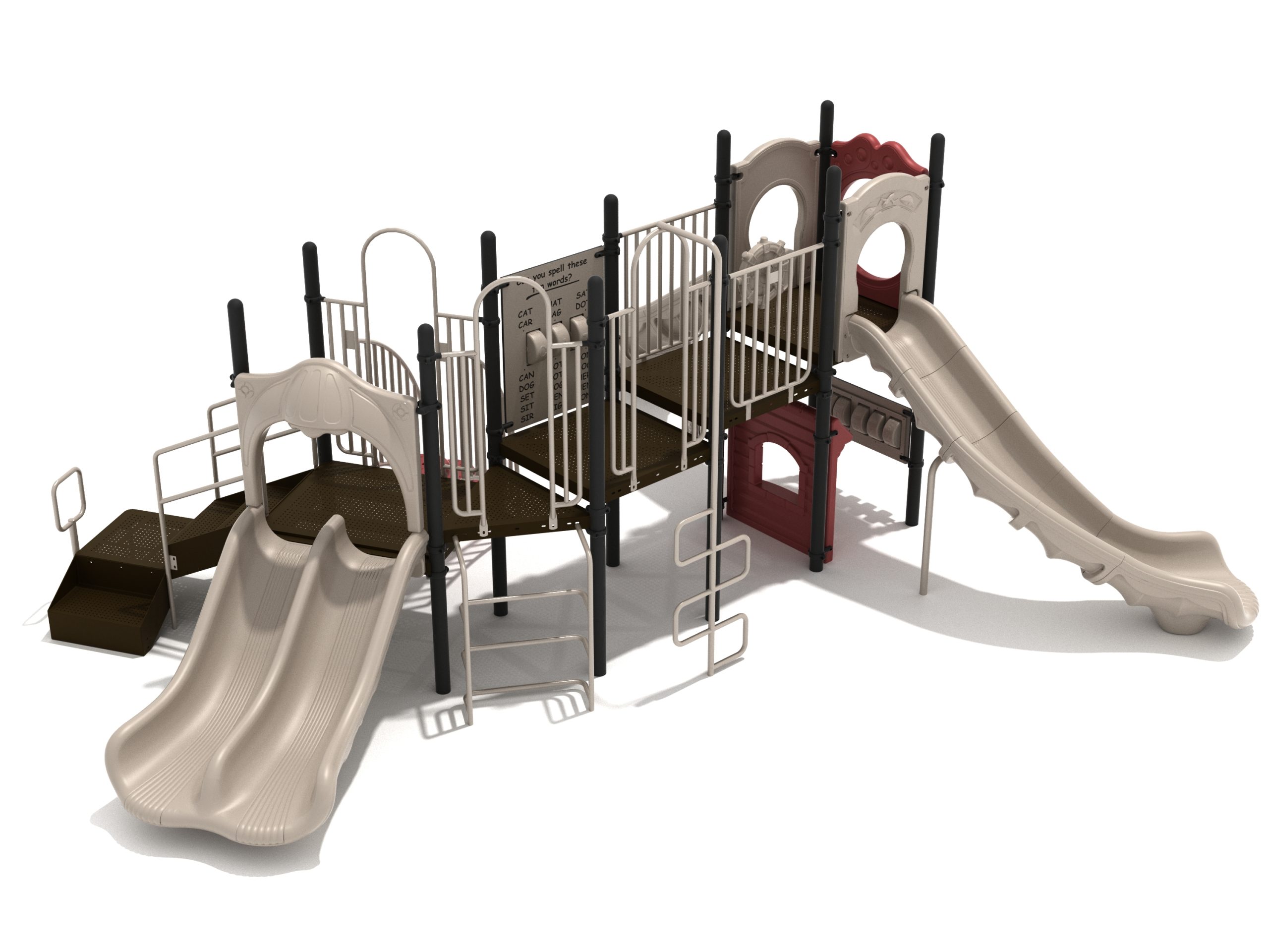 The Henderson play system might not be as challenging as our other play systems, but it certainly does not lack in the fun department at all. It has several entry points like the easiest Transfer Station, a Pebble Climber, a Snake Climber, and a Staright Vertical Ladder. Kids can race towards any of them to reach the deck. Once they are up, there’s a Spelling Panel to keep them company while teaching basic 3-word spellings like CAT and DOG. If they move further along the deck, they will see a Ship Wheel, which is perfect for them to play pretend games with their friends. On top of everything, the Henderson play system consists of four slides in total to let kids have the sliding experience of their lives. Once they are done with climbing and sliding, they can come down beneath the structure where a little club house consisting of Store and Half Math Panel is waiting for them.