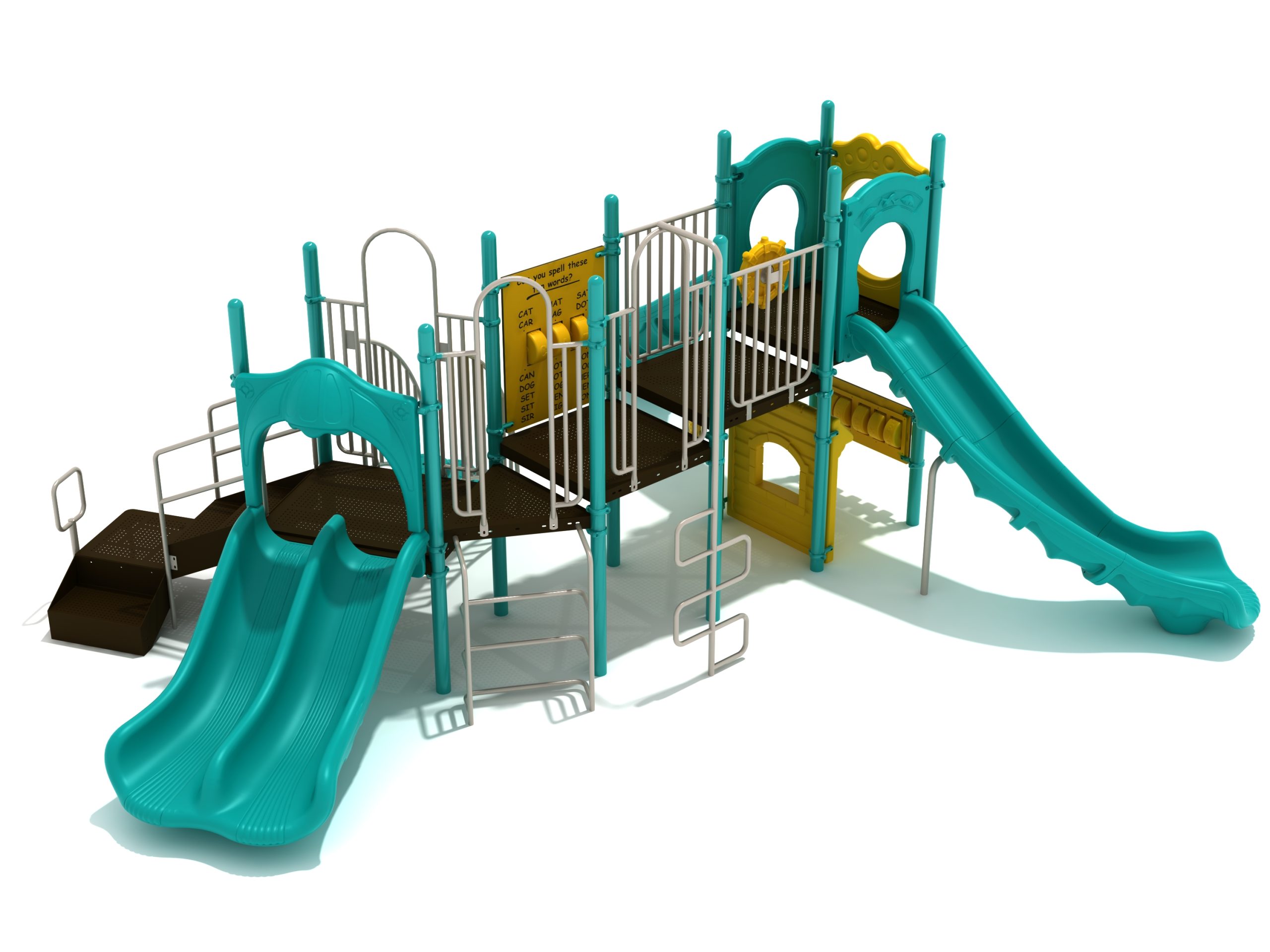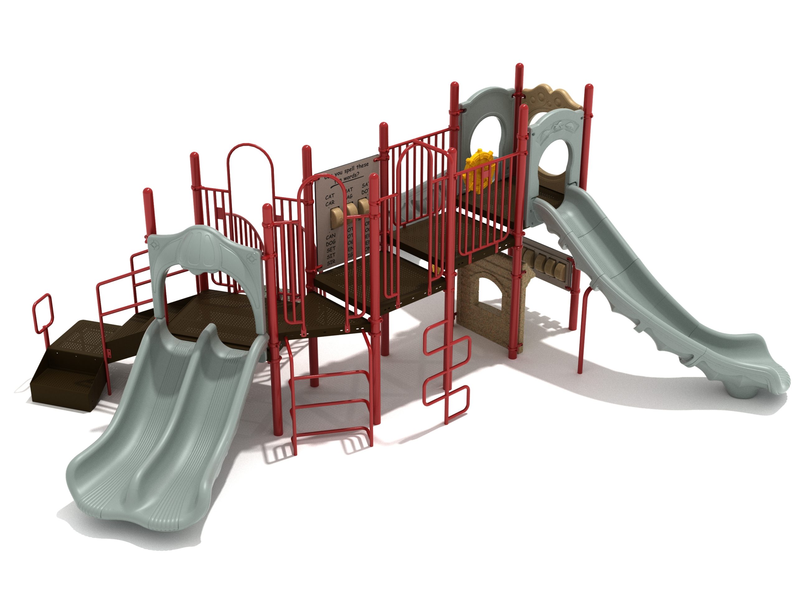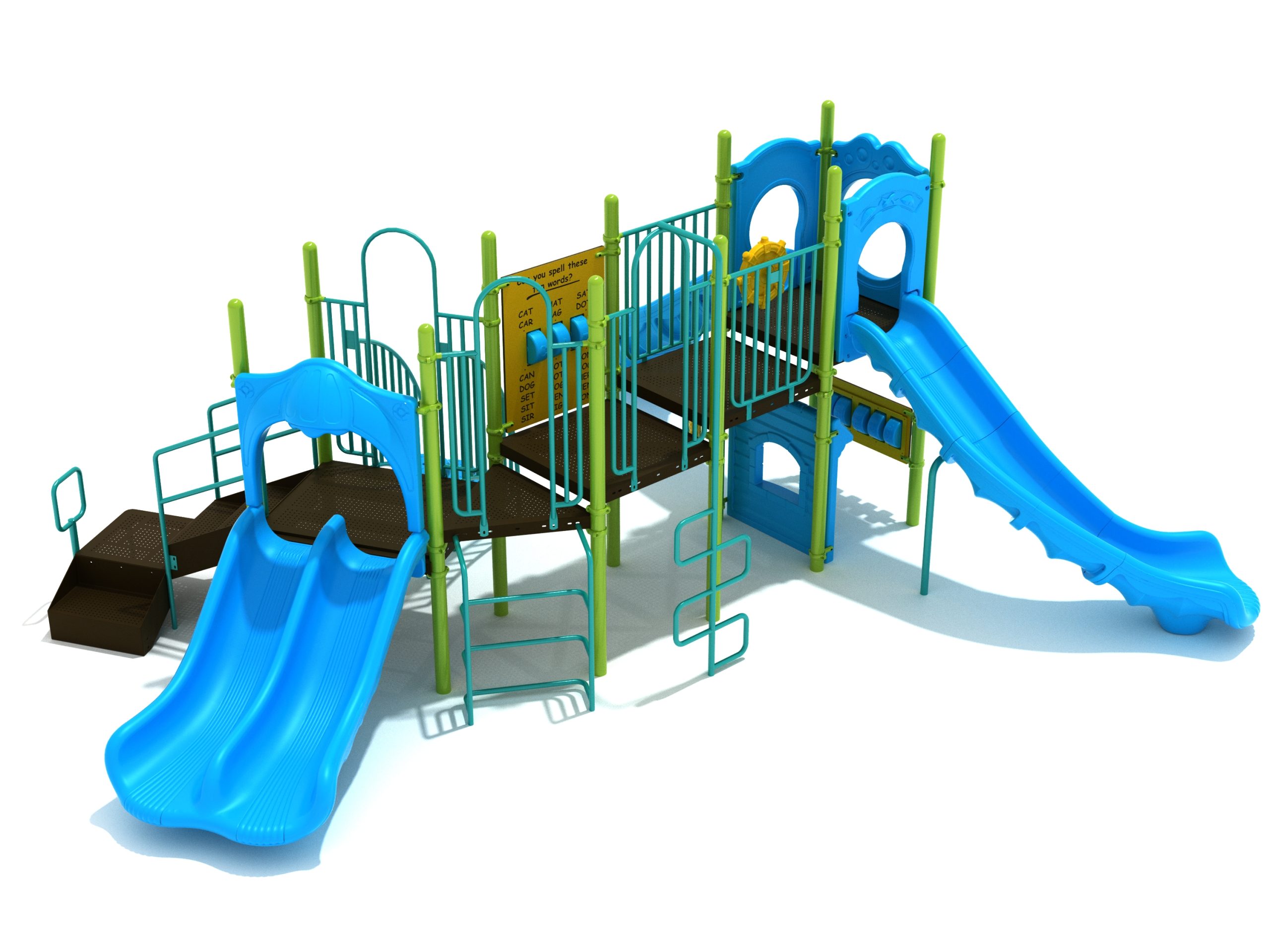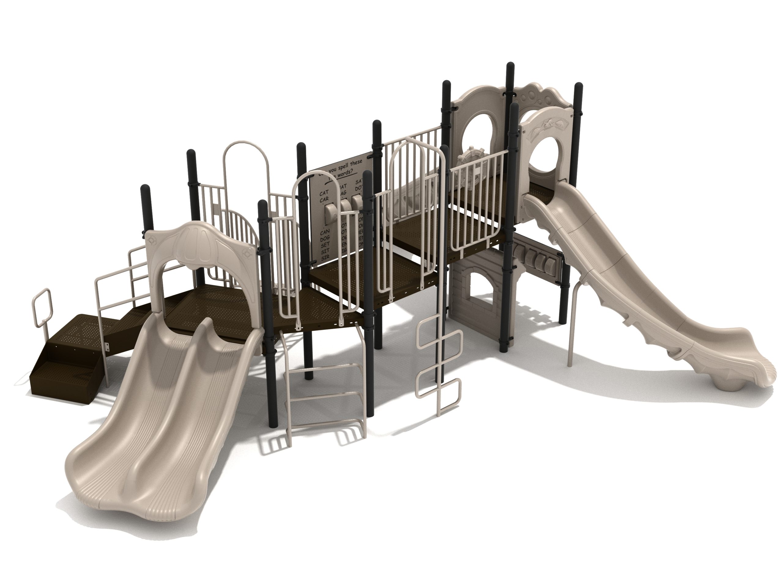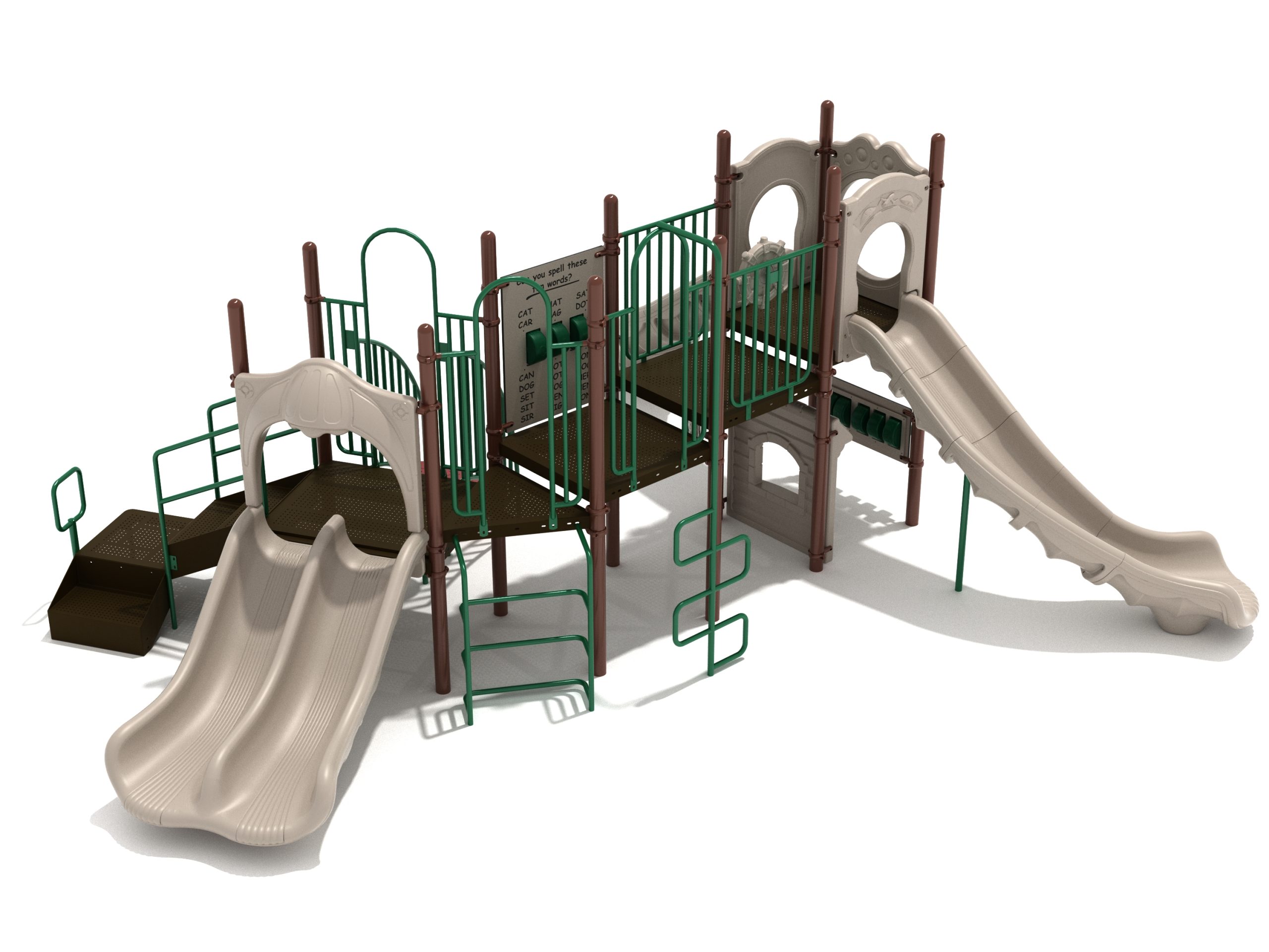 The Henderson play system might not be as challenging as our other play systems, but it certainly does not lack in the fun department at all. It has several entry points like the easiest Transfer Station, a Pebble Climber, a Snake Climber, and a Staright Vertical Ladder. Kids can race towards any of them to reach the deck. Once they are up, there’s a Spelling Panel to keep them company while teaching basic 3-word spellings like CAT and DOG. If they move further along the deck, they will see a Ship Wheel, which is perfect for them to play pretend games with their friends. On top of everything, the Henderson play system consists of four slides in total to let kids have the sliding experience of their lives. Once they are done with climbing and sliding, they can come down beneath the structure where a little club house consisting of Store and Half Math Panel is waiting for them.
