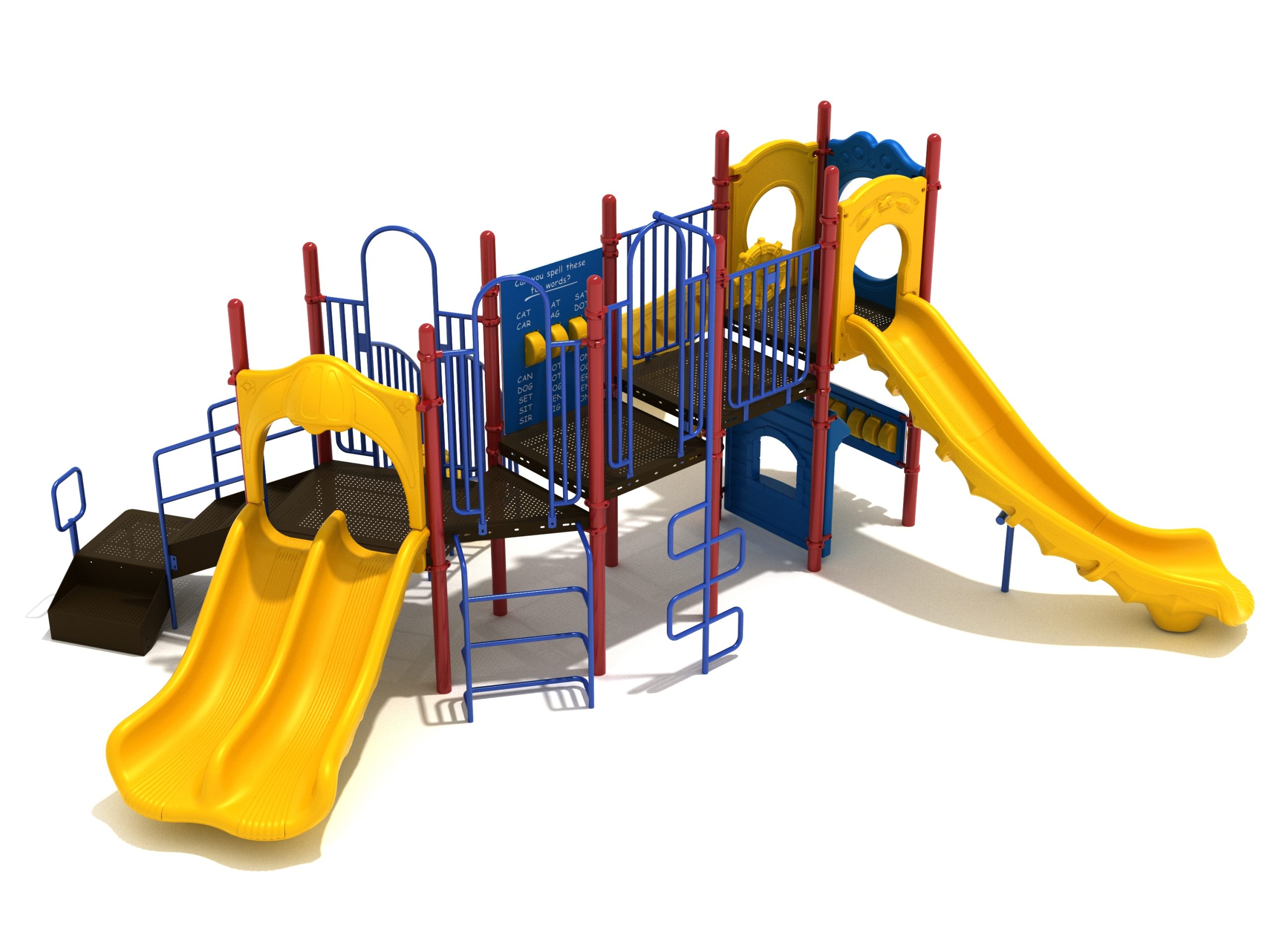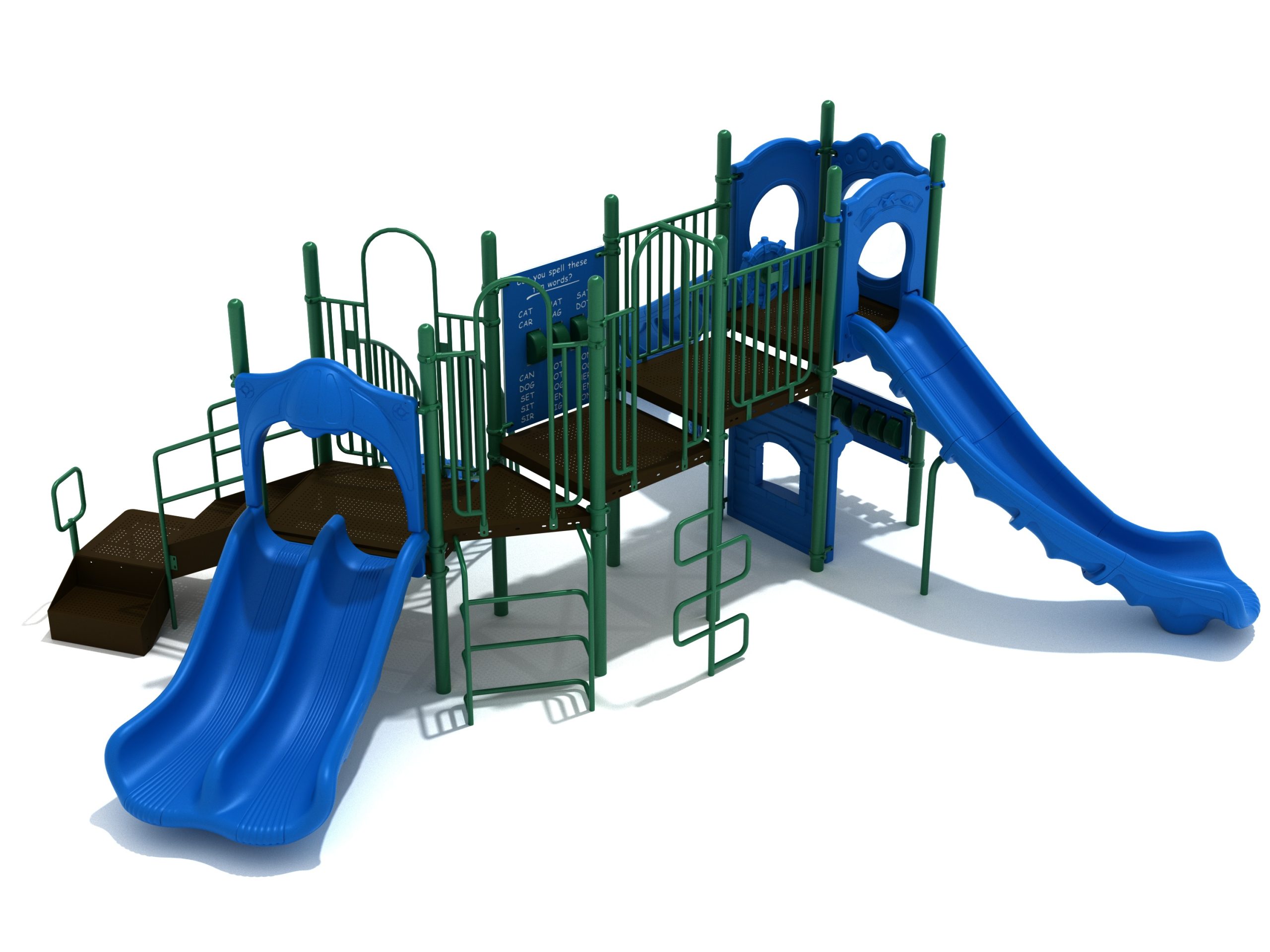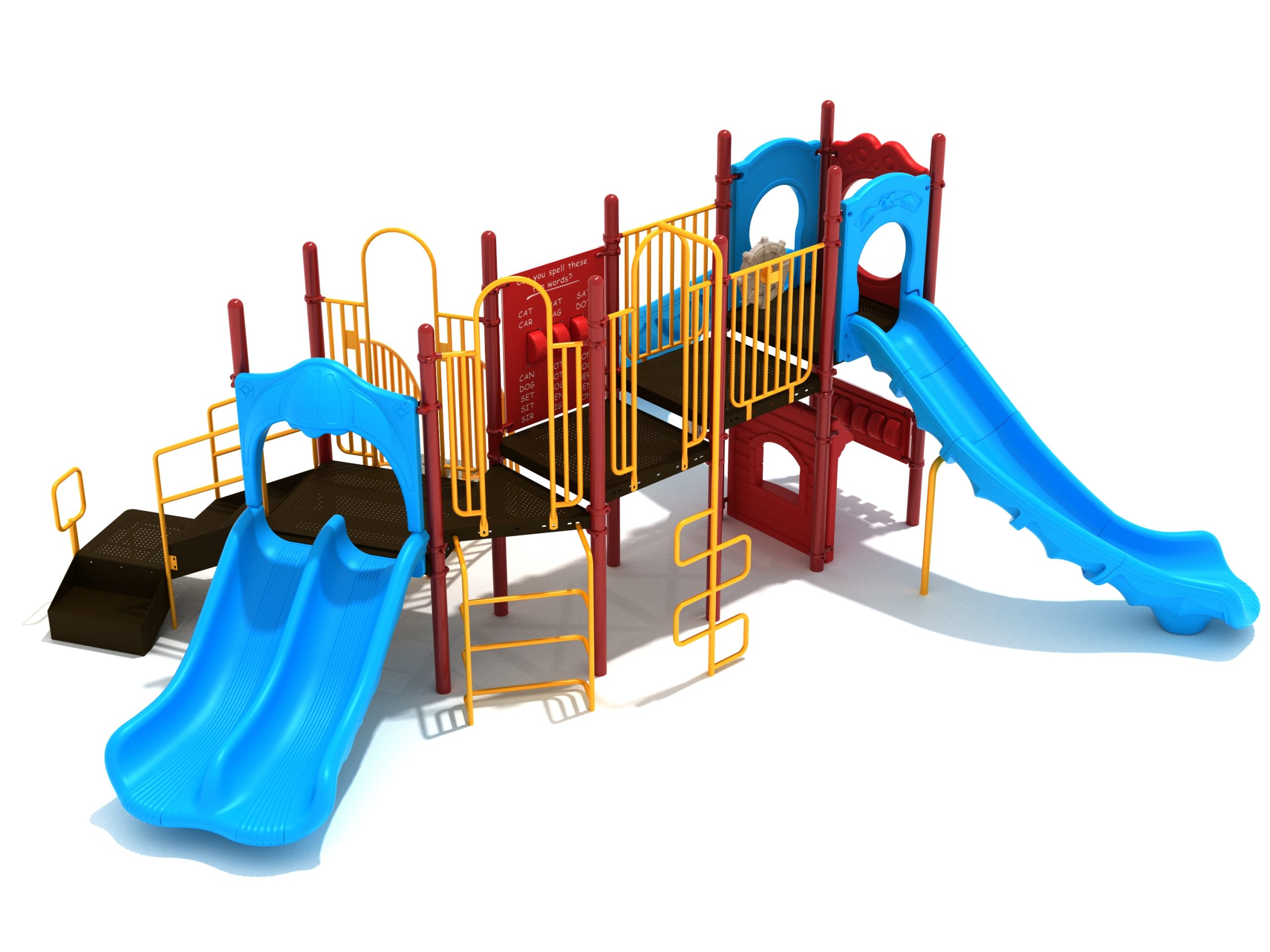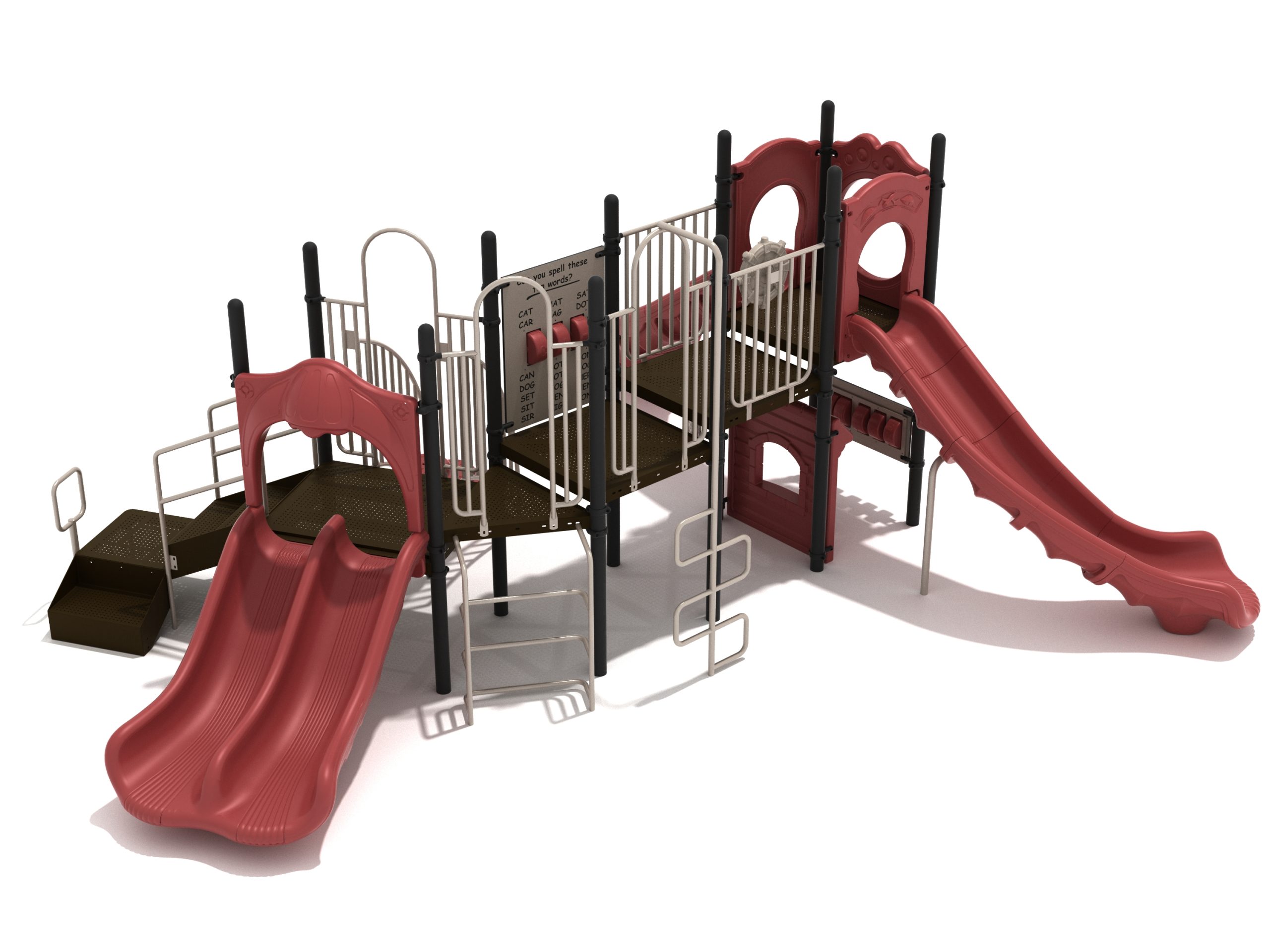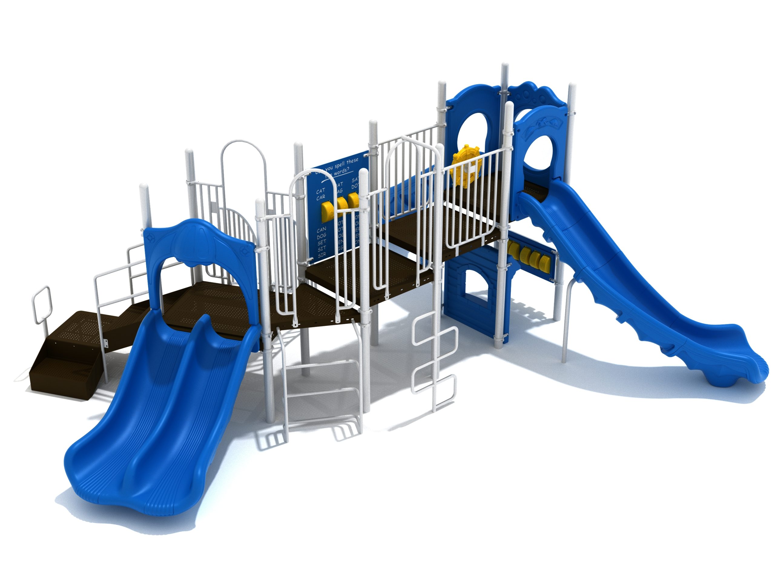 The Henderson play system might not be as challenging as our other play systems, but it certainly does not lack in the fun department at all. It has several entry points like the easiest Transfer Station, a Pebble Climber, a Snake Climber, and a Staright Vertical Ladder. Kids can race towards any of them to reach the deck. Once they are up, there’s a Spelling Panel to keep them company while teaching basic 3-word spellings like CAT and DOG. If they move further along the deck, they will see a Ship Wheel, which is perfect for them to play pretend games with their friends. On top of everything, the Henderson play system consists of four slides in total to let kids have the sliding experience of their lives. Once they are done with climbing and sliding, they can come down beneath the structure where a little club house consisting of Store and Half Math Panel is waiting for them.