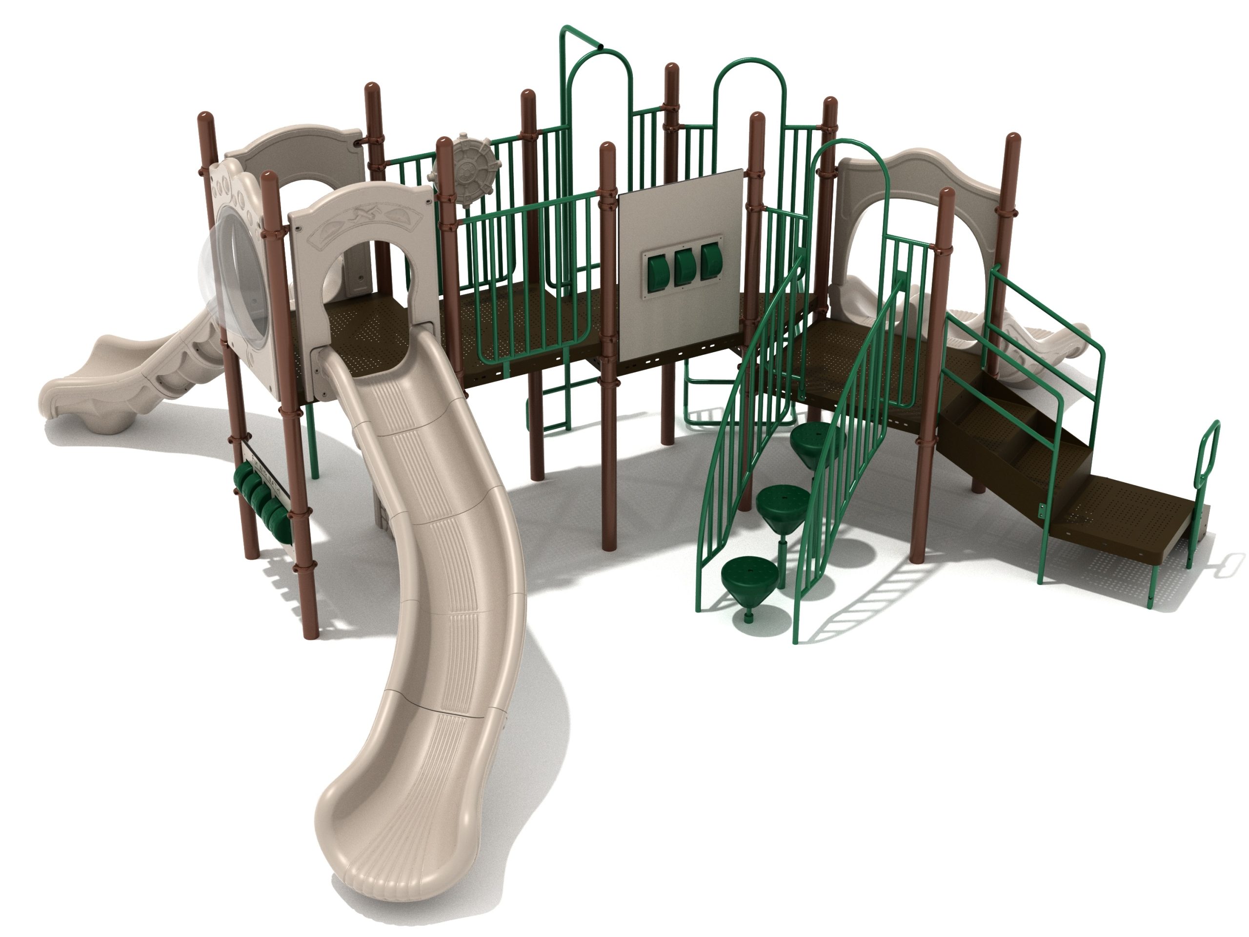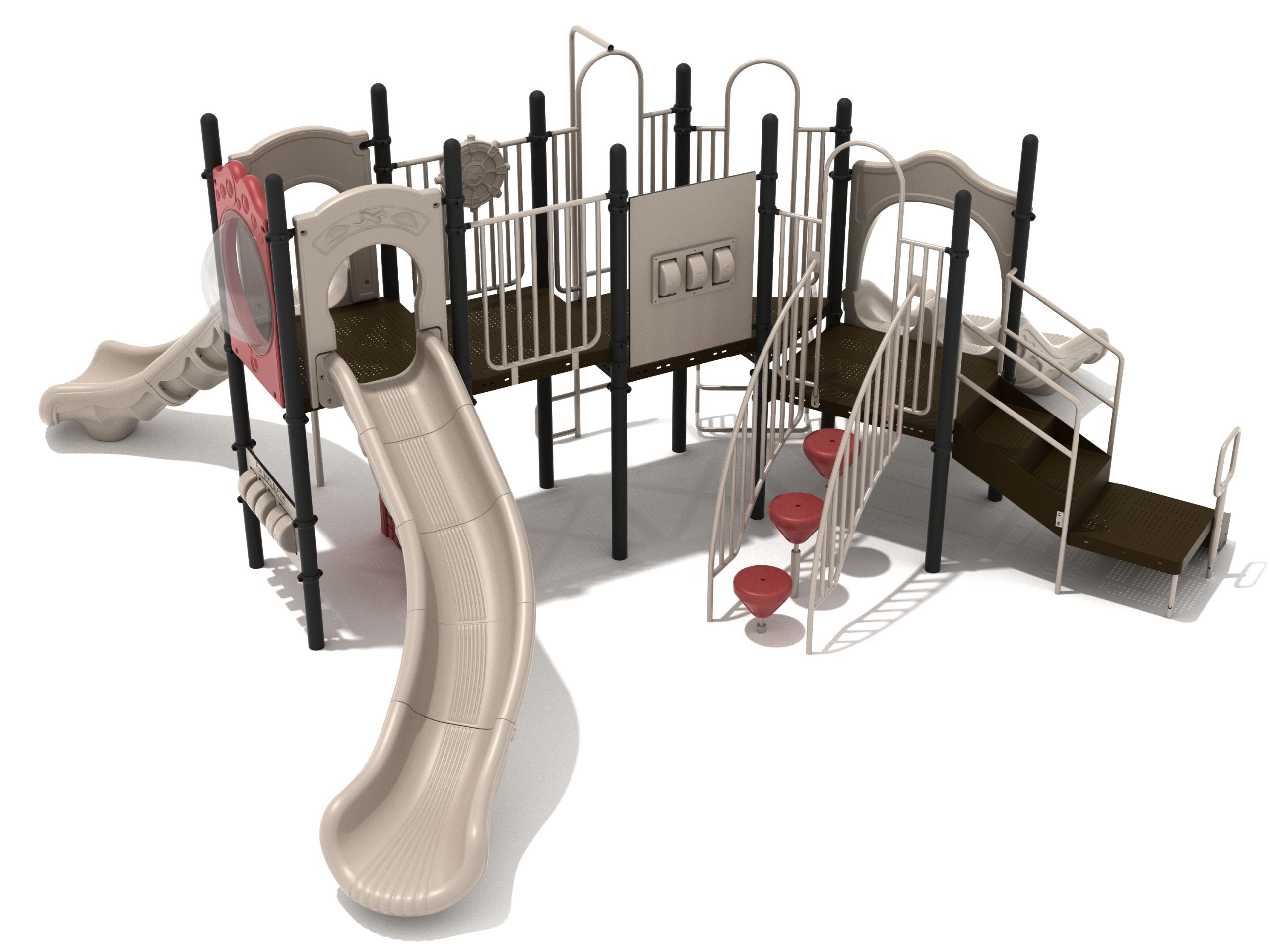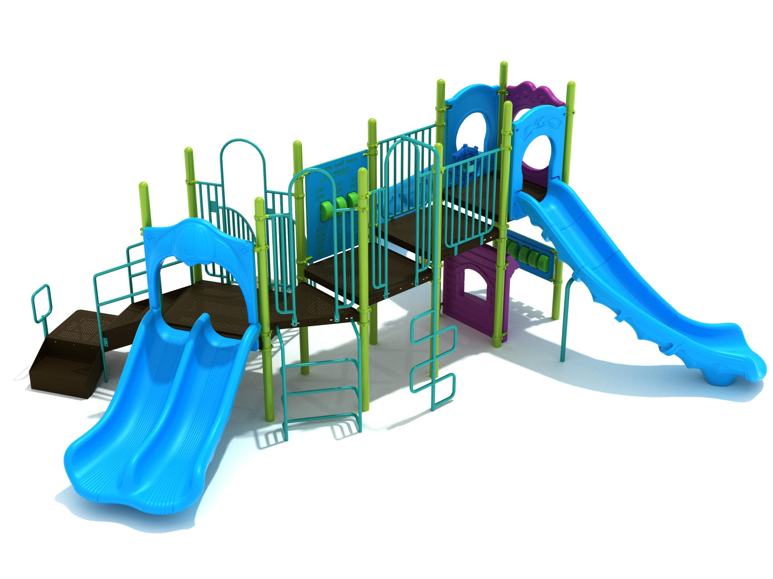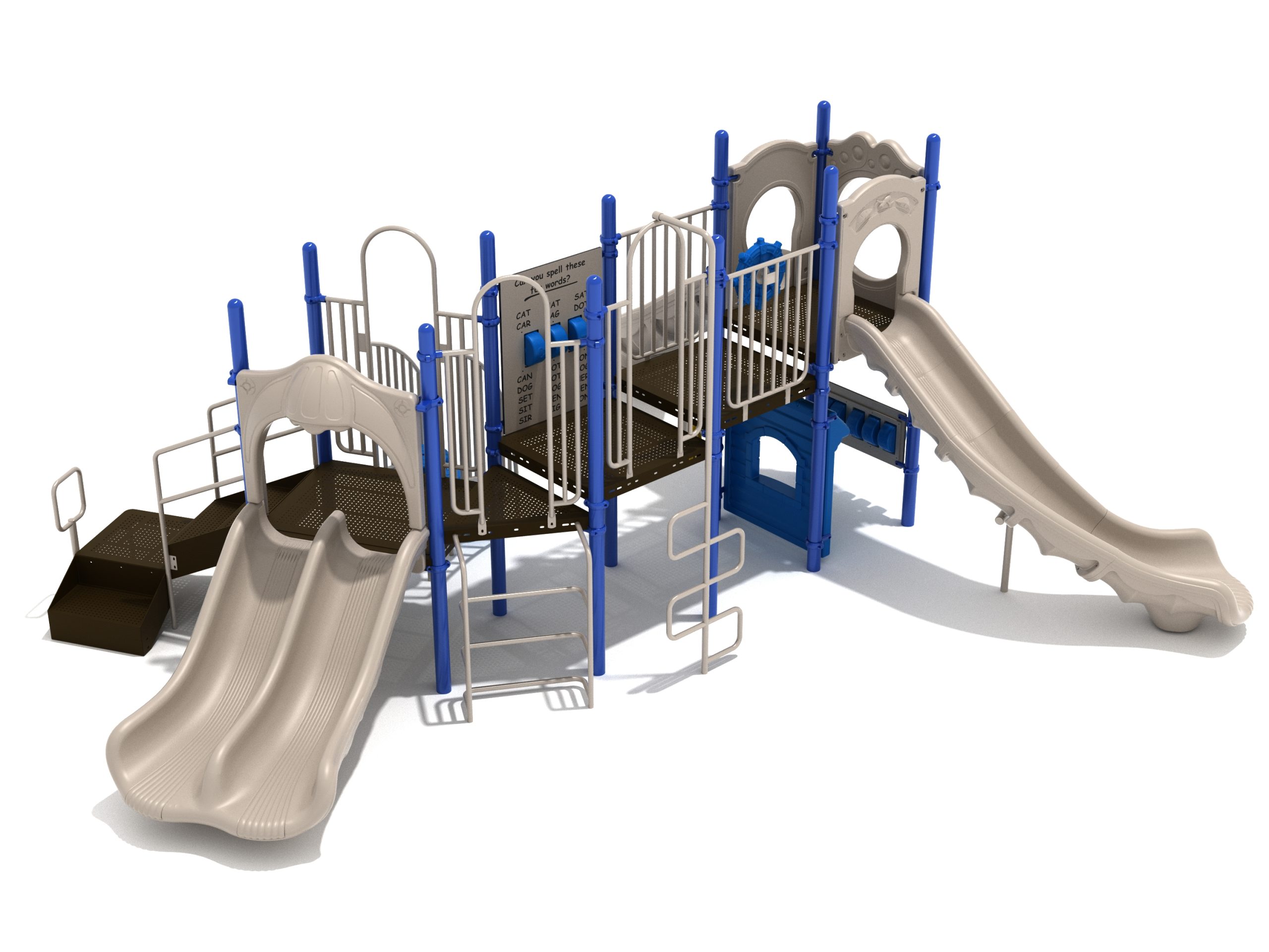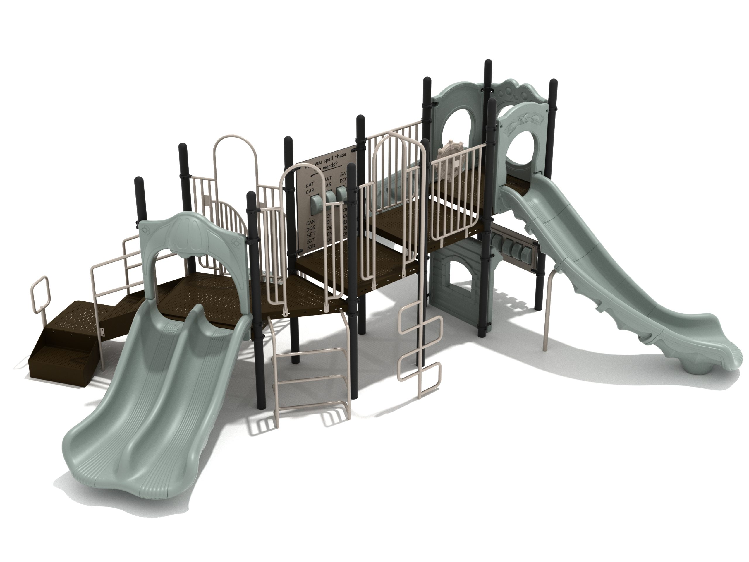 The Henderson play system might not be as challenging as our other play systems, but it certainly does not lack in the fun department at all. It has several entry points like the easiest Transfer Station, a Pebble Climber, a Snake Climber, and a Staright Vertical Ladder. Kids can race towards any of them to reach the deck. Once they are up, there’s a Spelling Panel to keep them company while teaching basic 3-word spellings like CAT and DOG. If they move further along the deck, they will see a Ship Wheel, which is perfect for them to play pretend games with their friends. On top of everything, the Henderson play system consists of four slides in total to let kids have the sliding experience of their lives. Once they are done with climbing and sliding, they can come down beneath the structure where a little club house consisting of Store and Half Math Panel is waiting for them.