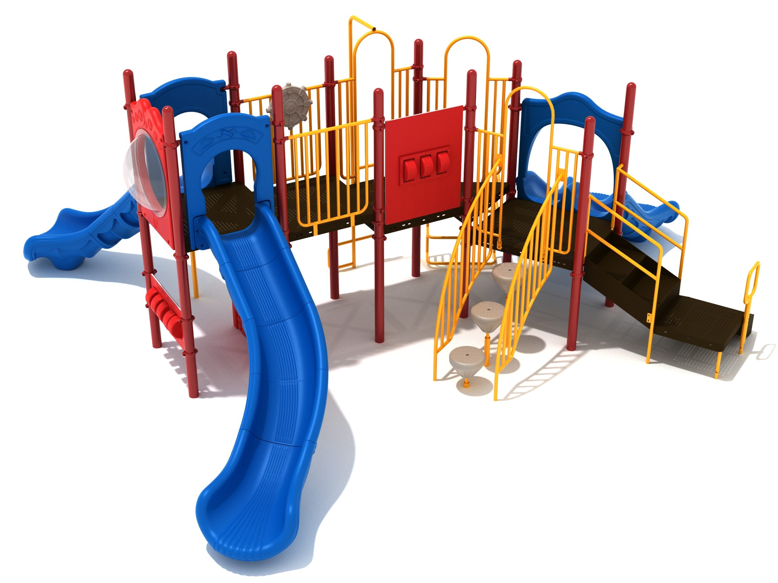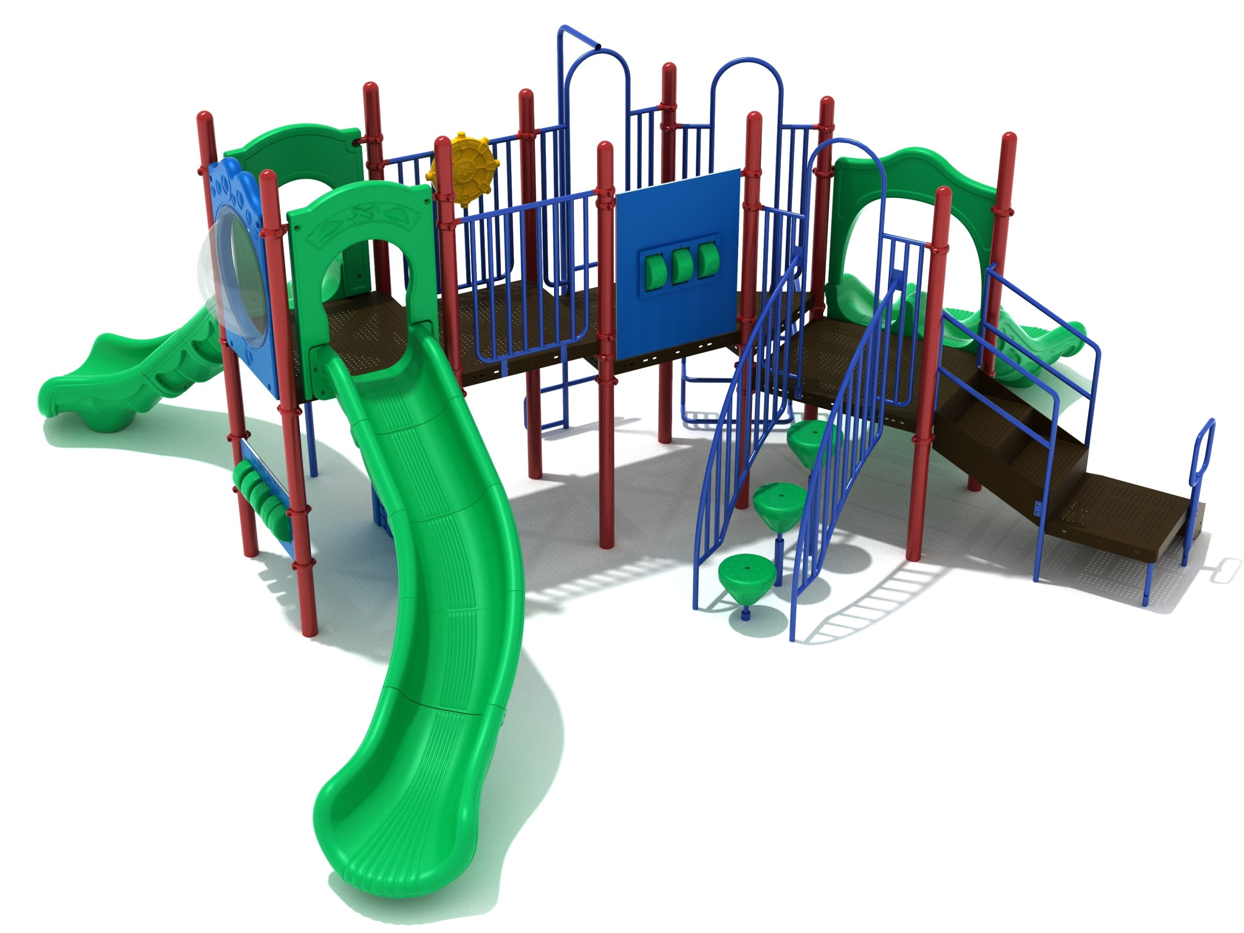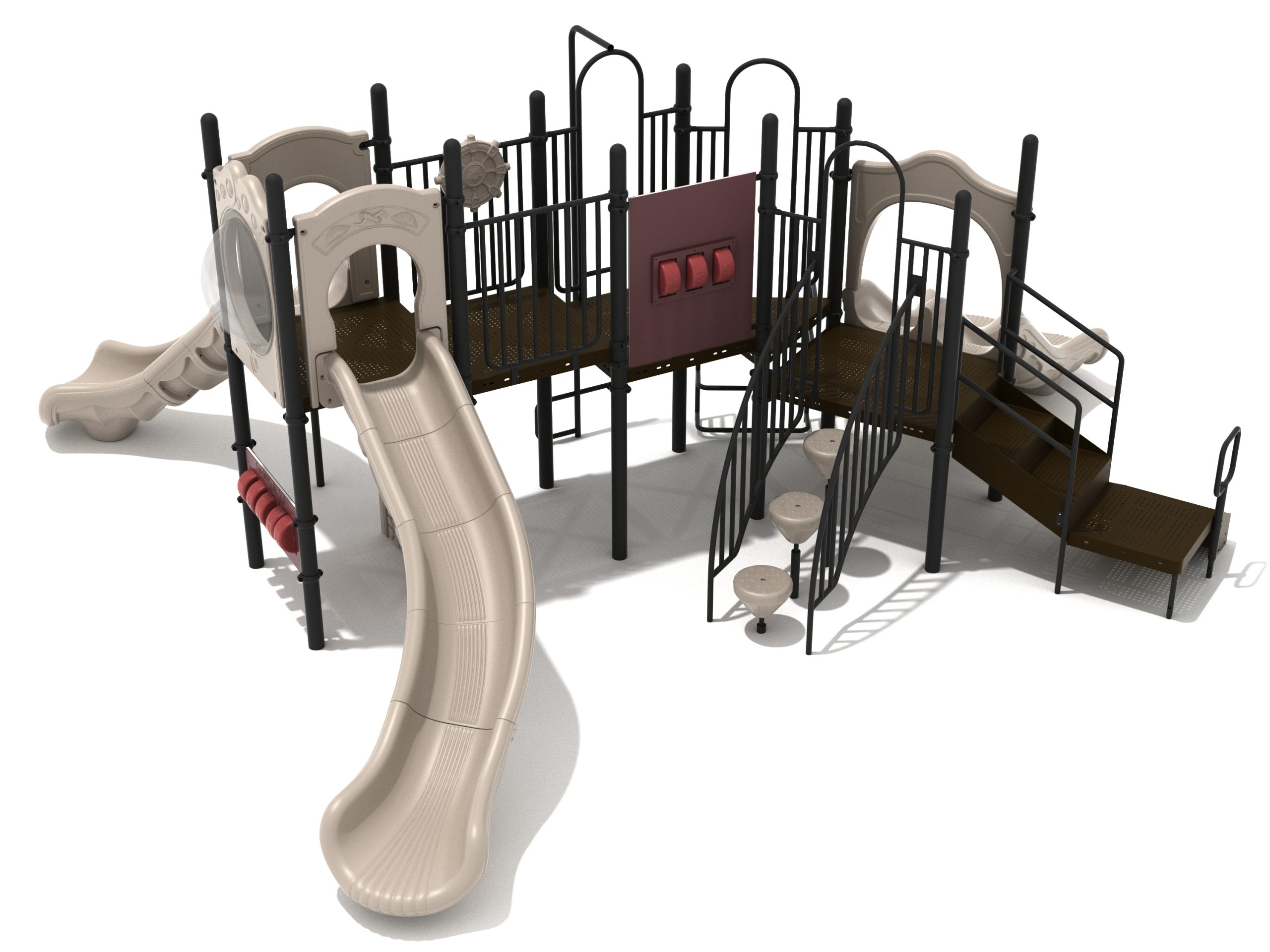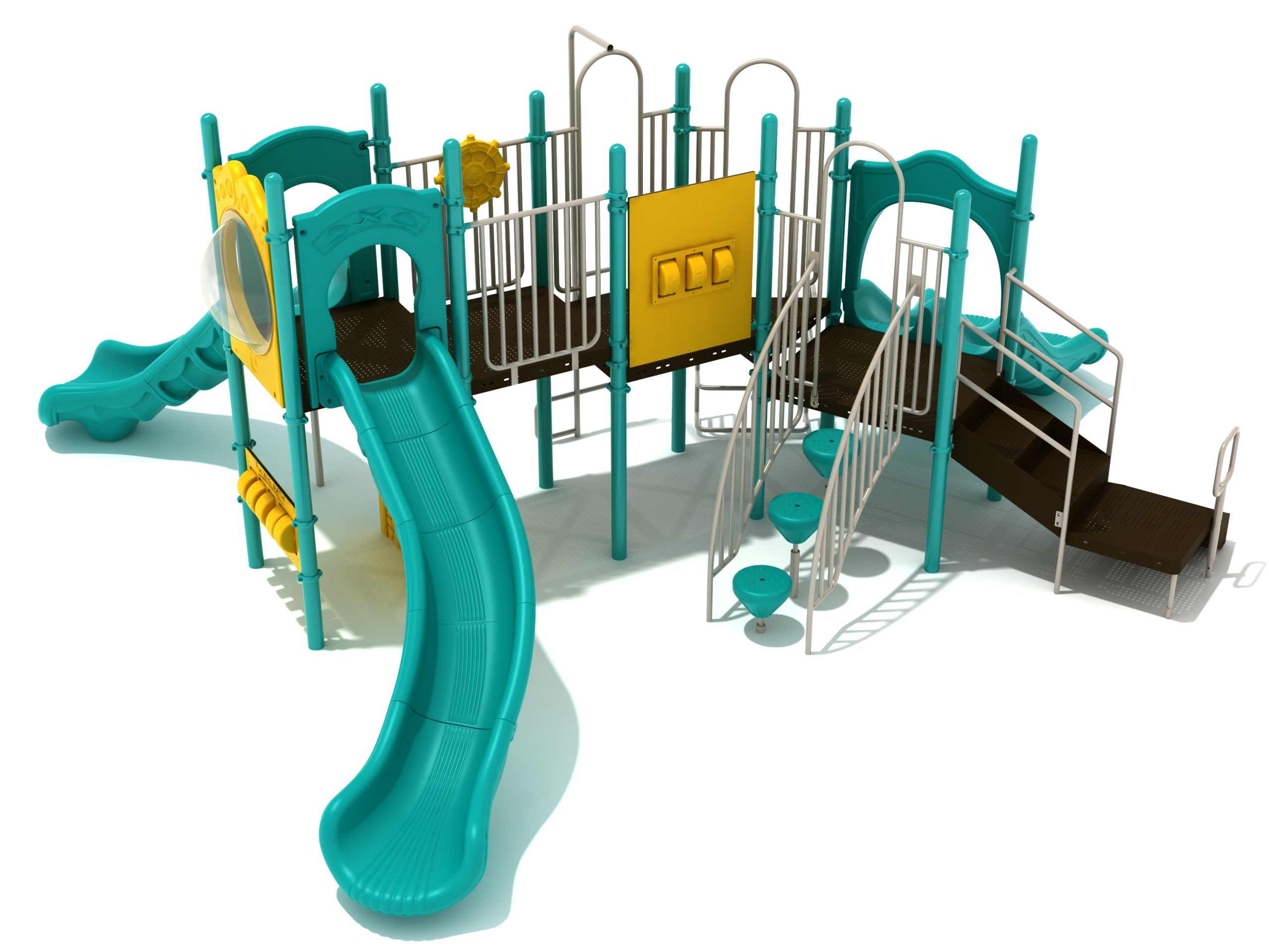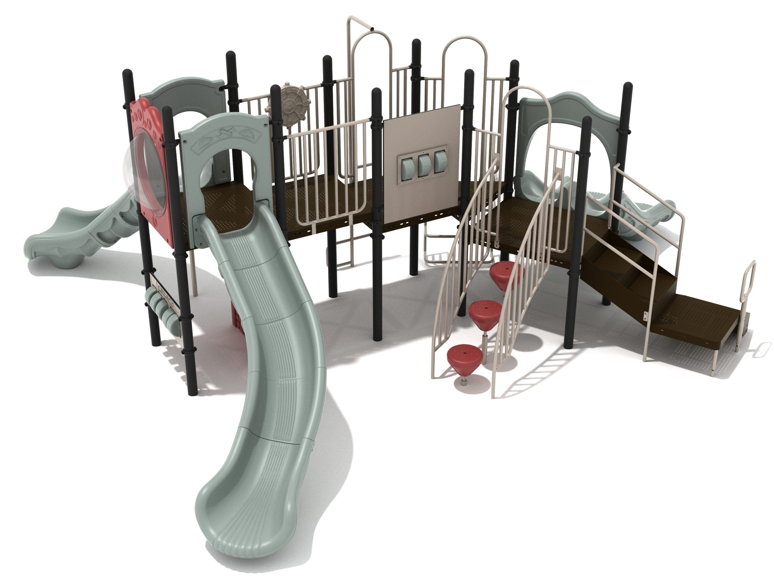 The Henderson play system might not be as challenging as our other play systems, but it certainly does not lack in the fun department at all. It has several entry points like the easiest Transfer Station, a Pebble Climber, a Snake Climber, and a Staright Vertical Ladder. Kids can race towards any of them to reach the deck. Once they are up, there’s a Spelling Panel to keep them company while teaching basic 3-word spellings like CAT and DOG. If they move further along the deck, they will see a Ship Wheel, which is perfect for them to play pretend games with their friends. On top of everything, the Henderson play system consists of four slides in total to let kids have the sliding experience of their lives. Once they are done with climbing and sliding, they can come down beneath the structure where a little club house consisting of Store and Half Math Panel is waiting for them.