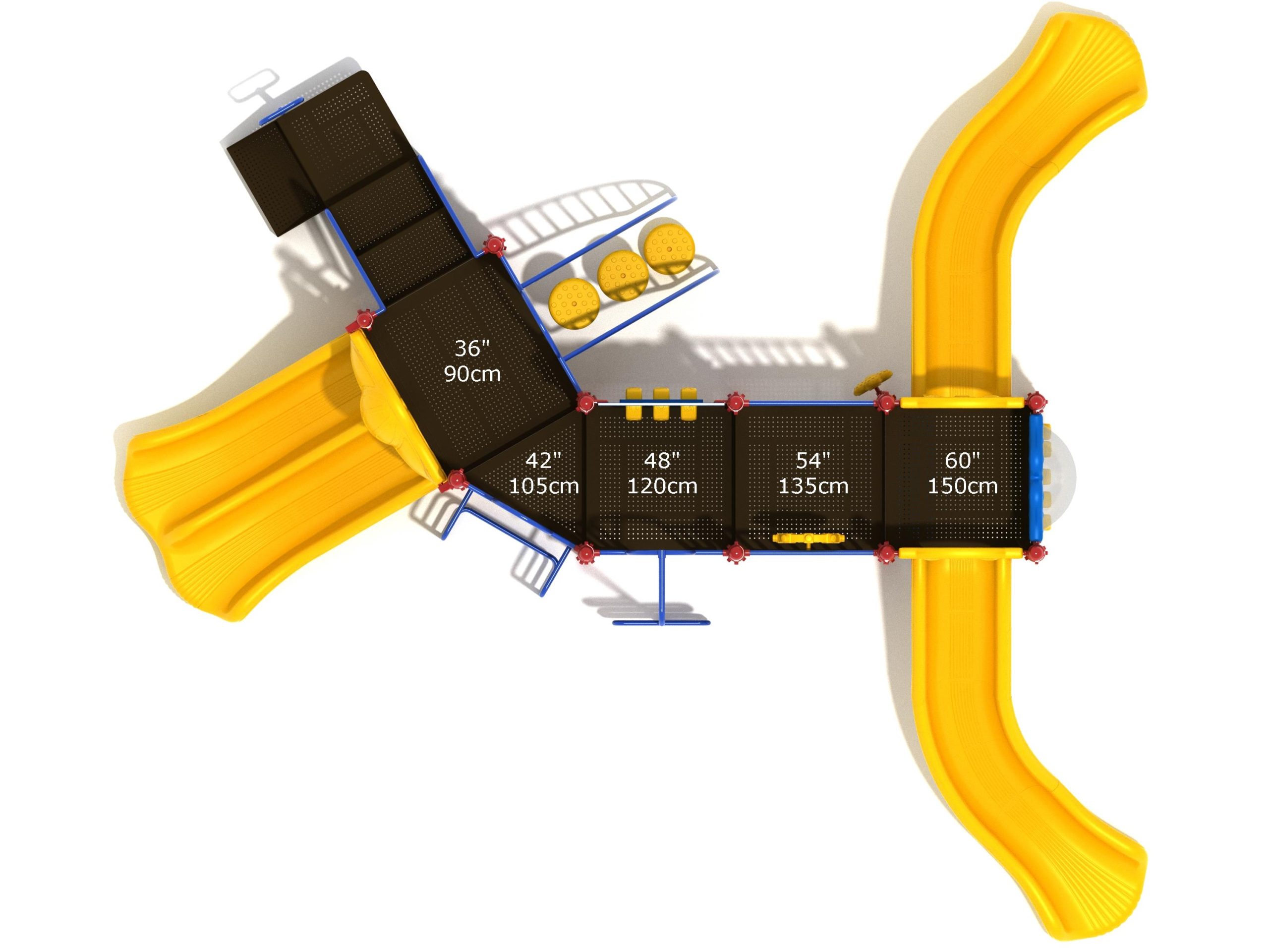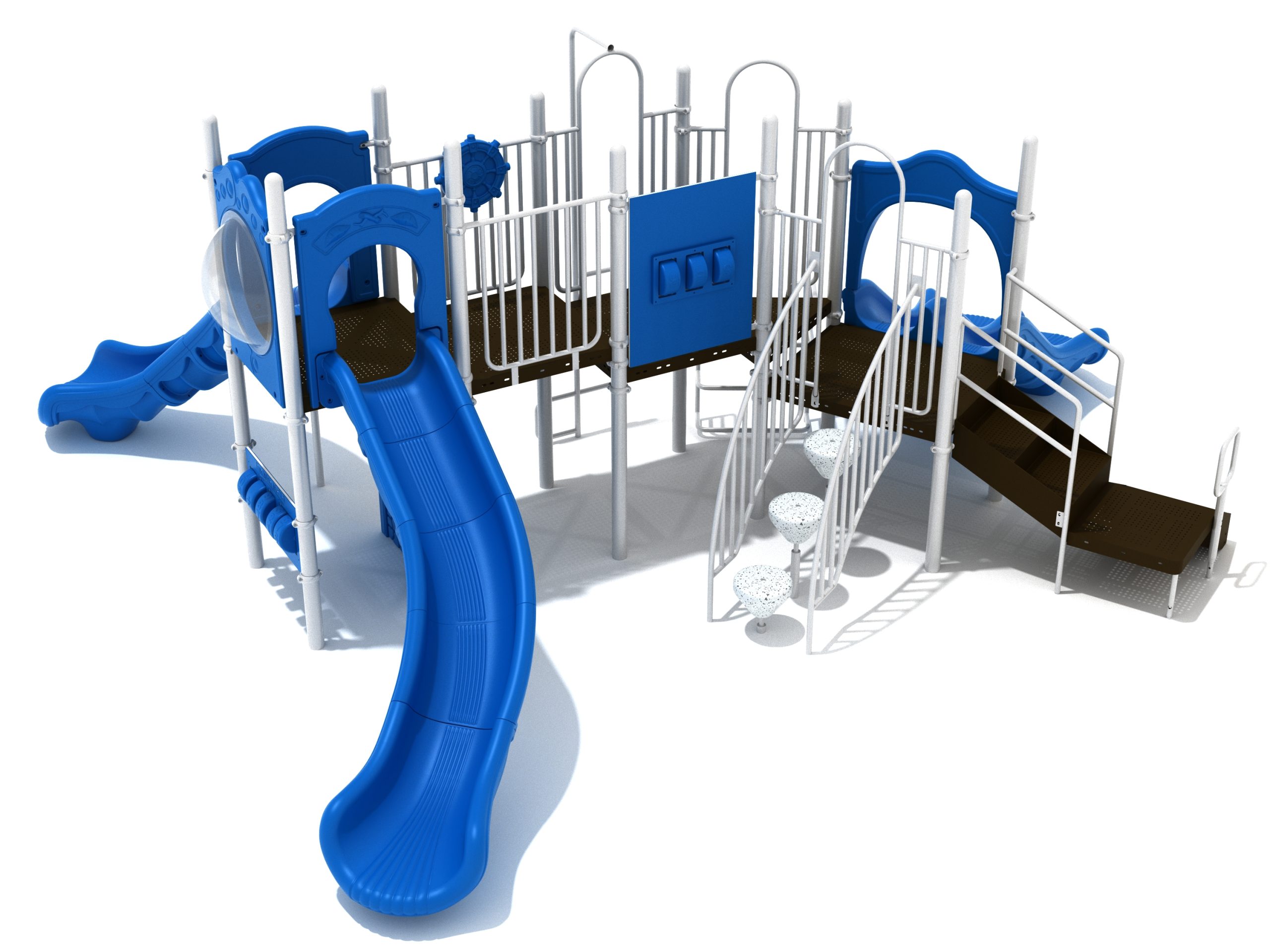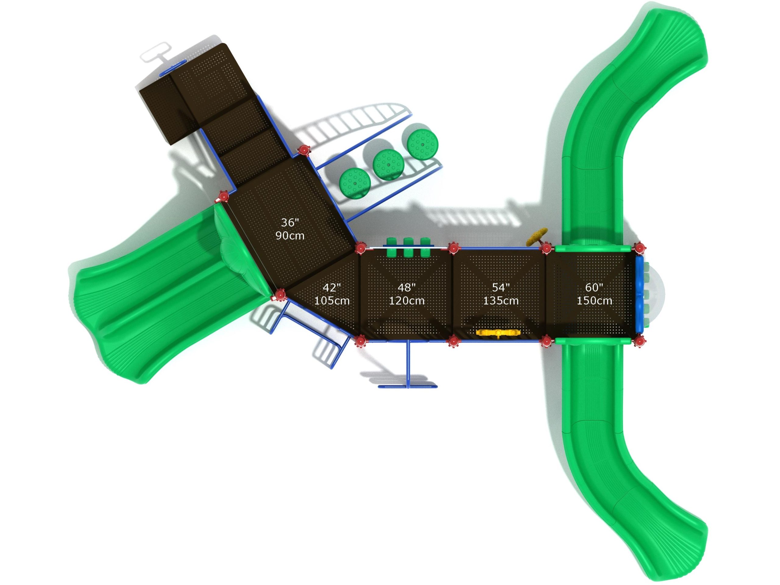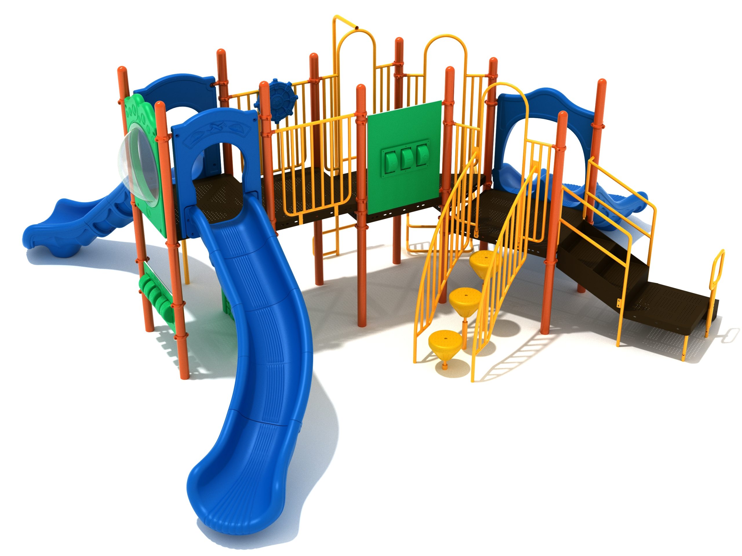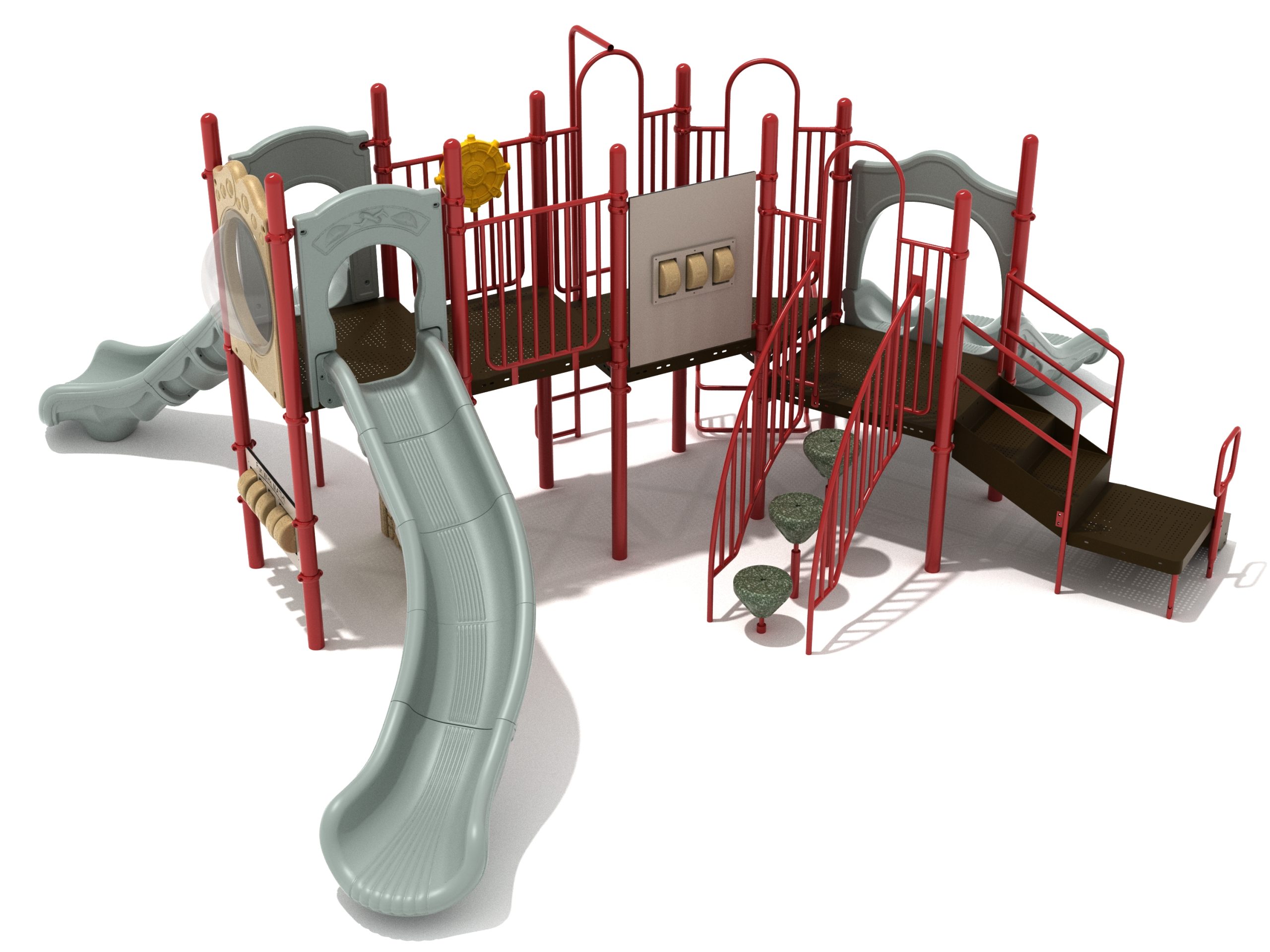 The Henderson play system might not be as challenging as our other play systems, but it certainly does not lack in the fun department at all. It has several entry points like the easiest Transfer Station, a Pebble Climber, a Snake Climber, and a Staright Vertical Ladder. Kids can race towards any of them to reach the deck. Once they are up, there’s a Spelling Panel to keep them company while teaching basic 3-word spellings like CAT and DOG. If they move further along the deck, they will see a Ship Wheel, which is perfect for them to play pretend games with their friends. On top of everything, the Henderson play system consists of four slides in total to let kids have the sliding experience of their lives. Once they are done with climbing and sliding, they can come down beneath the structure where a little club house consisting of Store and Half Math Panel is waiting for them.