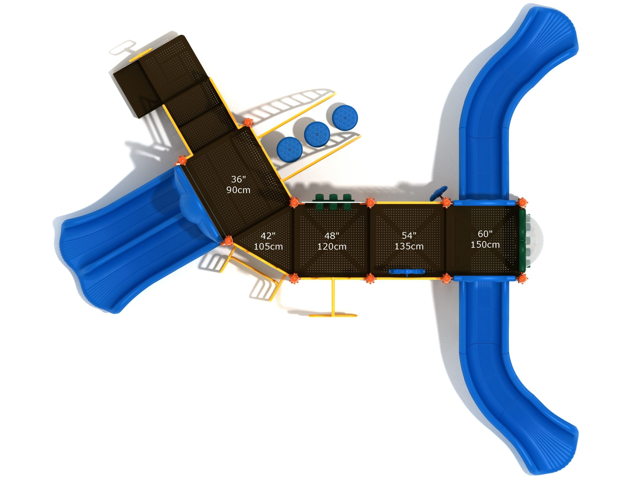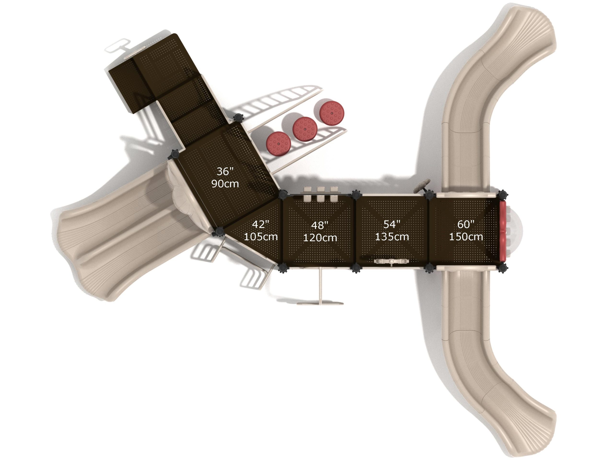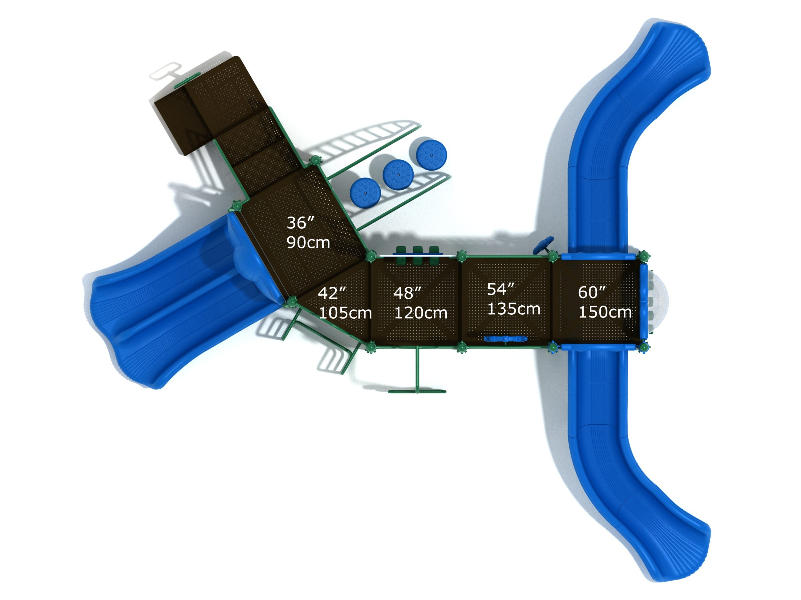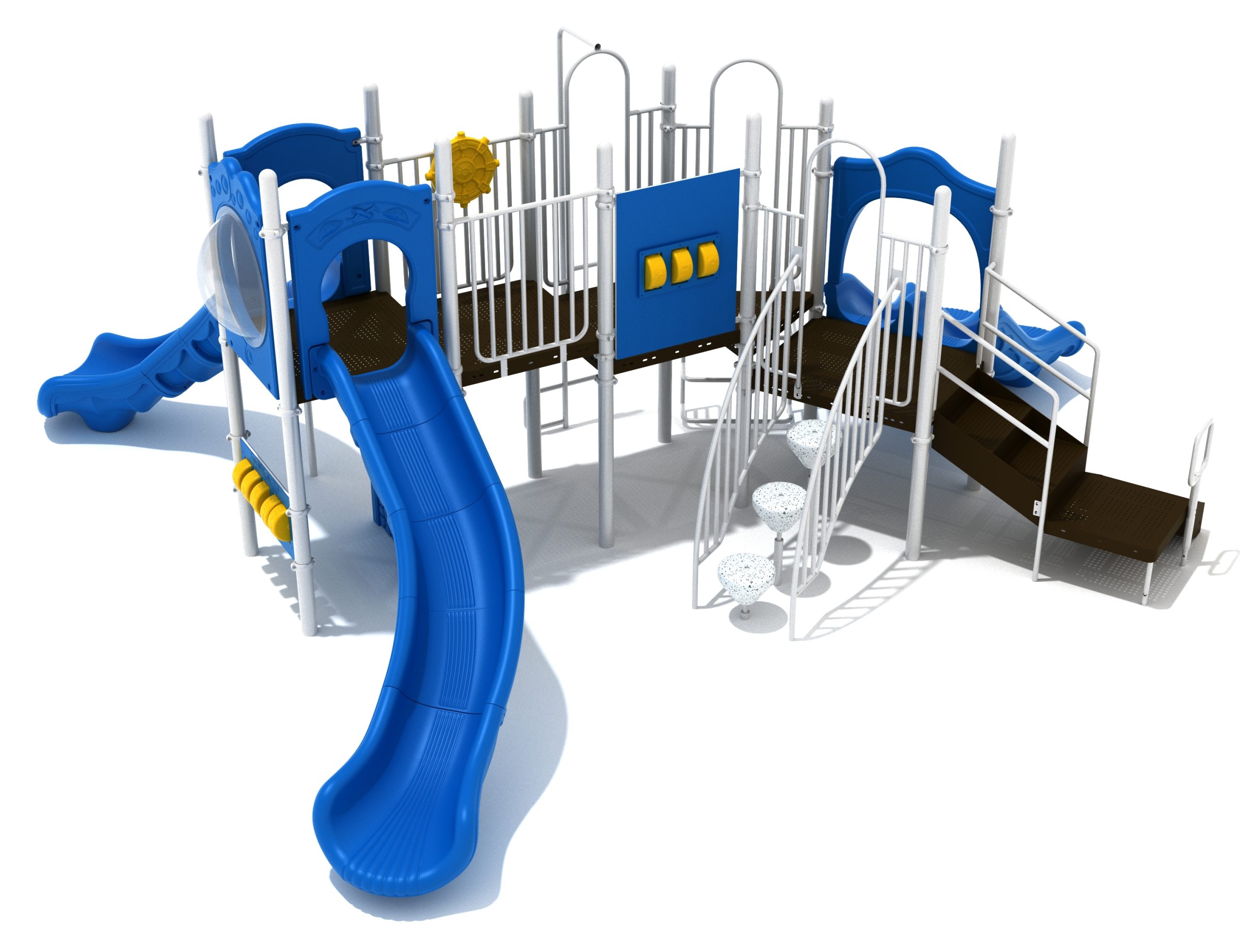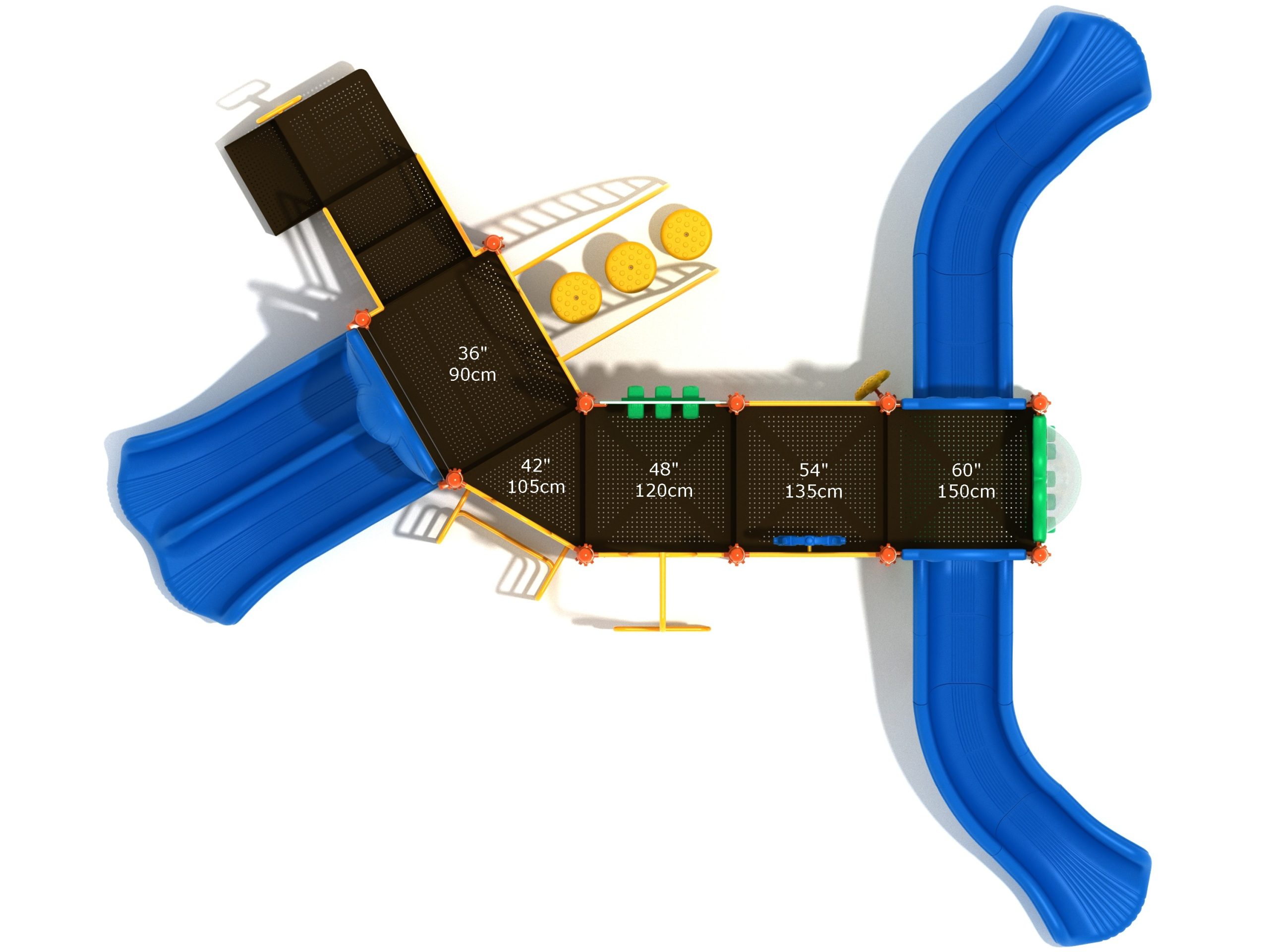 The Henderson play system might not be as challenging as our other play systems, but it certainly does not lack in the fun department at all. It has several entry points like the easiest Transfer Station, a Pebble Climber, a Snake Climber, and a Staright Vertical Ladder. Kids can race towards any of them to reach the deck. Once they are up, there’s a Spelling Panel to keep them company while teaching basic 3-word spellings like CAT and DOG. If they move further along the deck, they will see a Ship Wheel, which is perfect for them to play pretend games with their friends. On top of everything, the Henderson play system consists of four slides in total to let kids have the sliding experience of their lives. Once they are done with climbing and sliding, they can come down beneath the structure where a little club house consisting of Store and Half Math Panel is waiting for them.