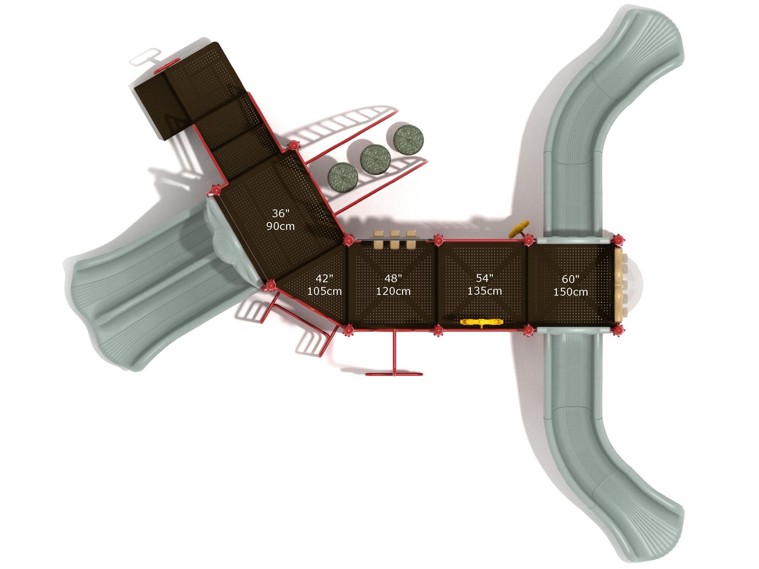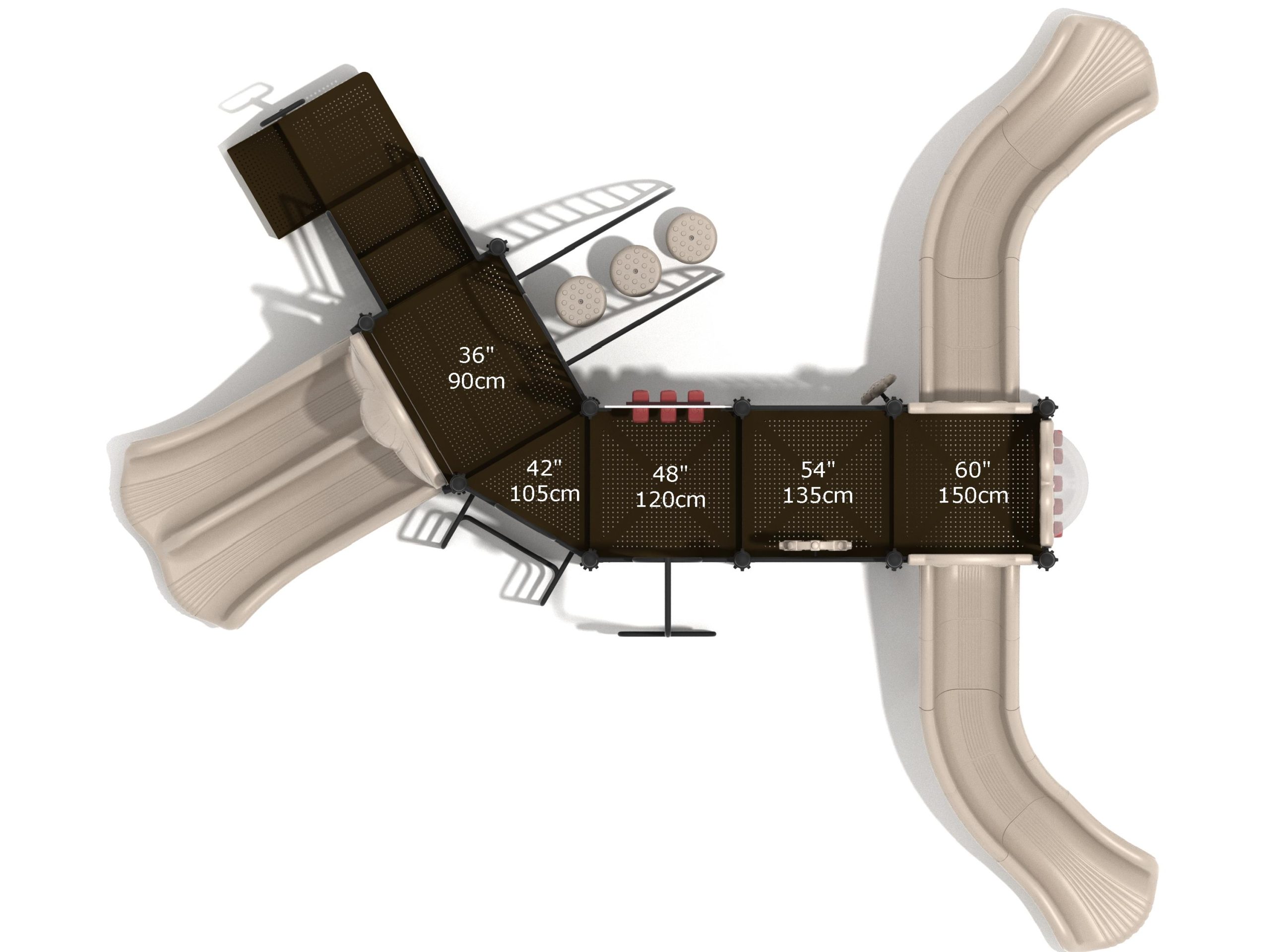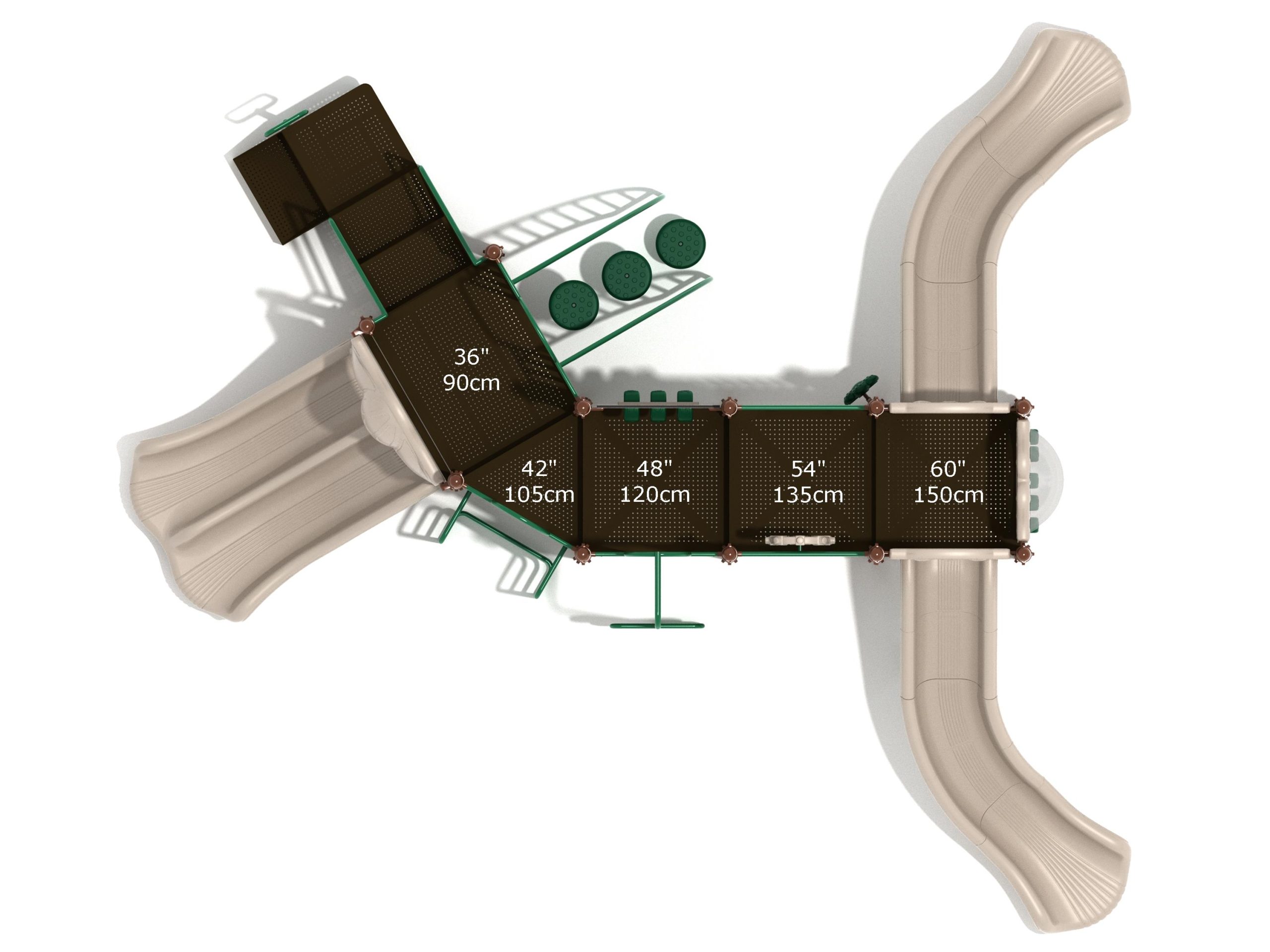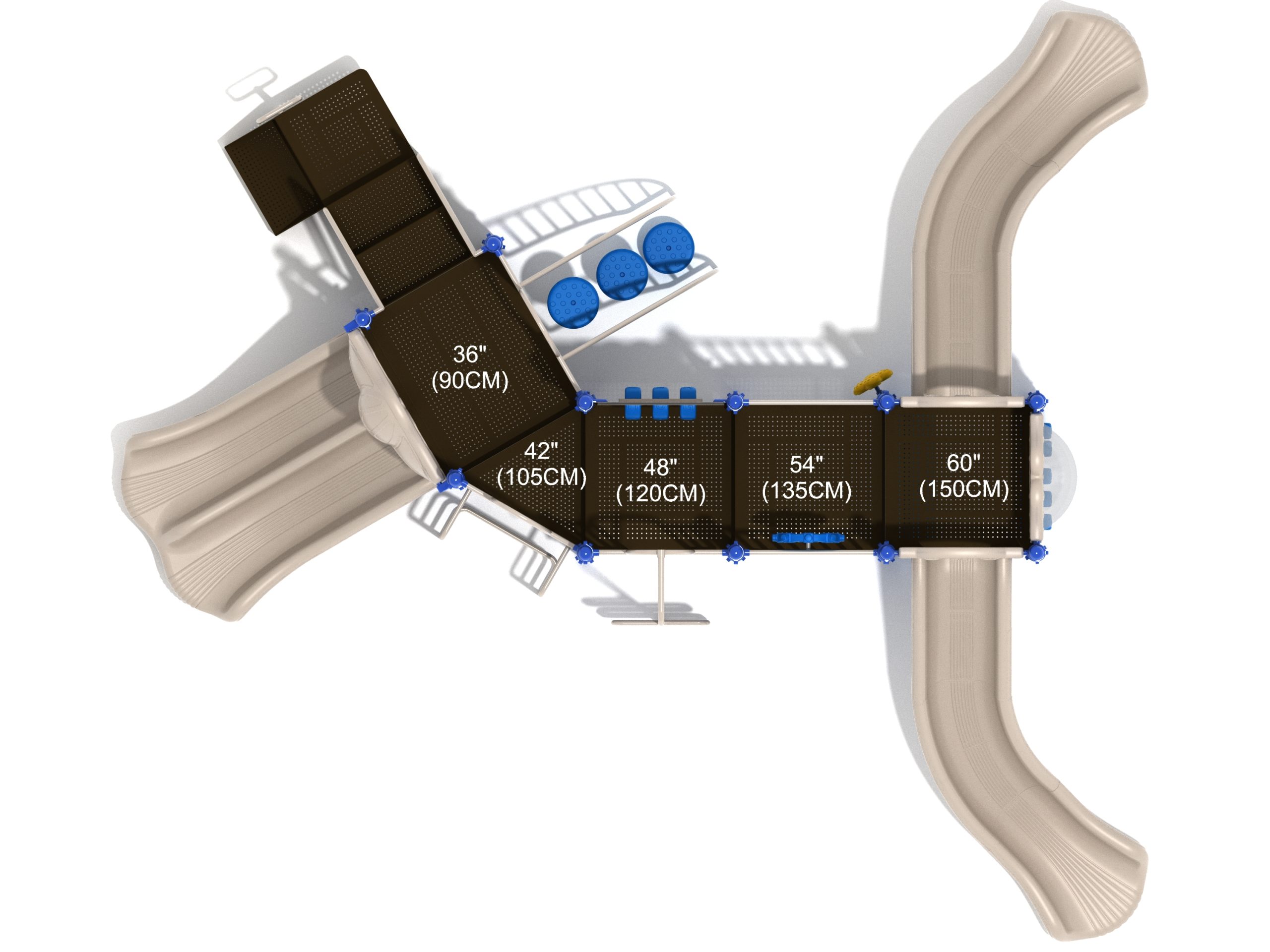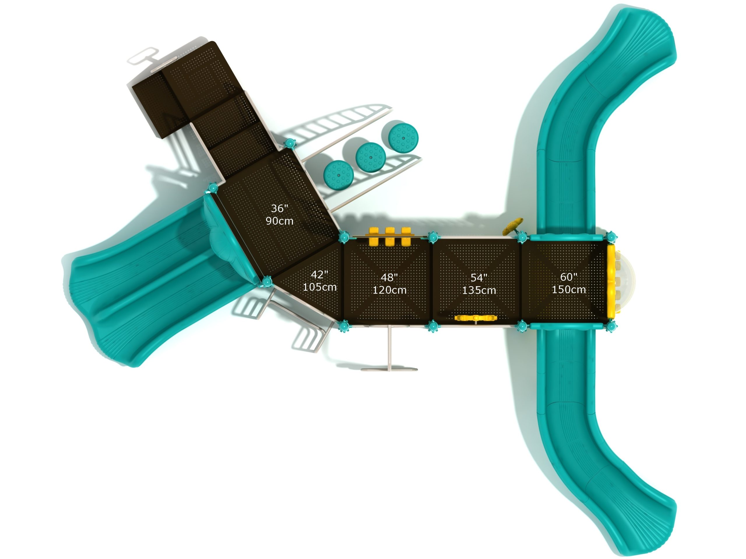 The Henderson play system might not be as challenging as our other play systems, but it certainly does not lack in the fun department at all. It has several entry points like the easiest Transfer Station, a Pebble Climber, a Snake Climber, and a Staright Vertical Ladder. Kids can race towards any of them to reach the deck. Once they are up, there’s a Spelling Panel to keep them company while teaching basic 3-word spellings like CAT and DOG. If they move further along the deck, they will see a Ship Wheel, which is perfect for them to play pretend games with their friends. On top of everything, the Henderson play system consists of four slides in total to let kids have the sliding experience of their lives. Once they are done with climbing and sliding, they can come down beneath the structure where a little club house consisting of Store and Half Math Panel is waiting for them.