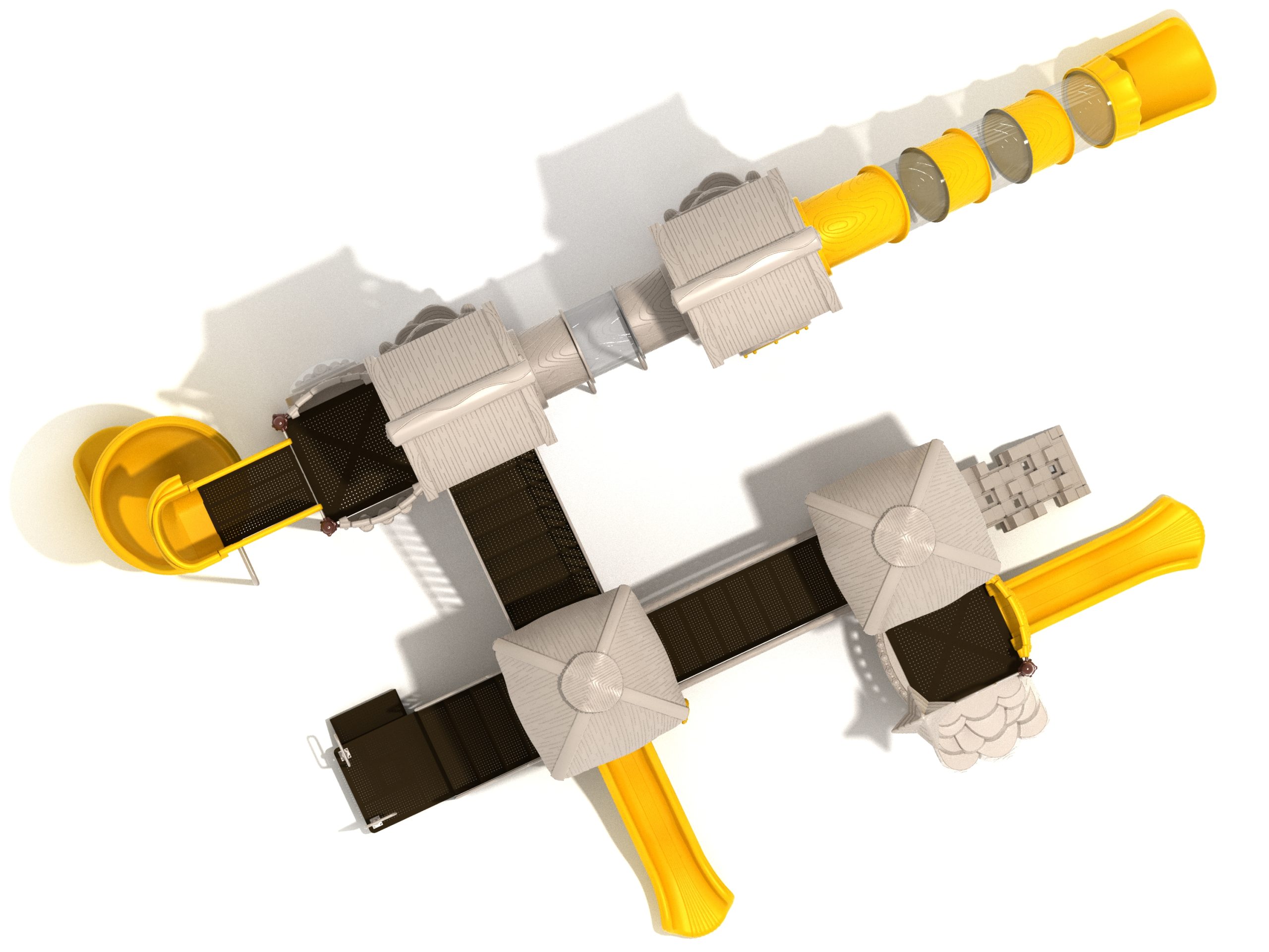 The Hyena Hideout appears like an African village right in the middle of the playground with a lower level covered by Club House Roofs joined by a realistic Bamboo Arch Bridge, and a higher level under two Gable Roofs connected by a Tube Bridge with a transparent center. Children will love to run up and down all over this structure, passing numerous fun activities along the way such as a Maze Panel and Plinko Panel to play with, as well as a Percussion Panel to make some music on. A huge Tube Slide with alternating transparent and covered sections is sure to be a feature kids will love to play on time and time again. Two Wave Slides also offer an undulating experience as kids don’t slide down smoothly, instead experiencing numerous bumps which adds to the fun. A Spiral Slide sits next to a Bubble Panel and Tic Tac Toe Panel, so once they’ve played a few games the winner might get to go down the twisting and turning slide first.