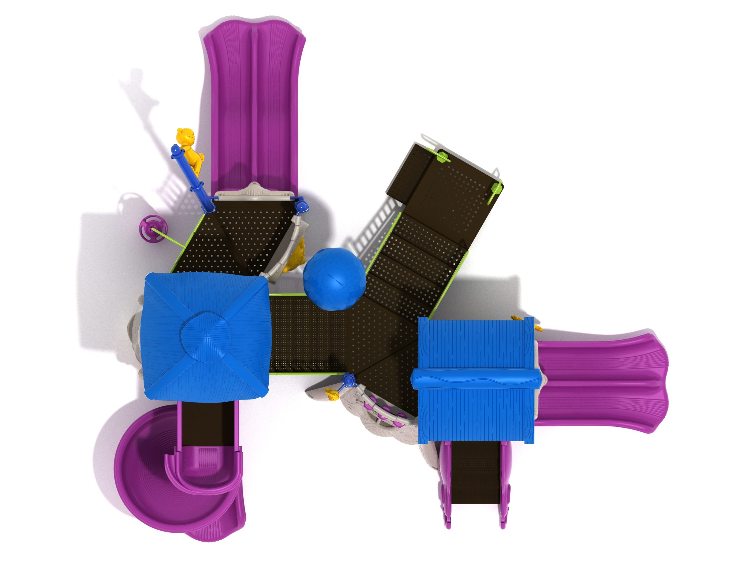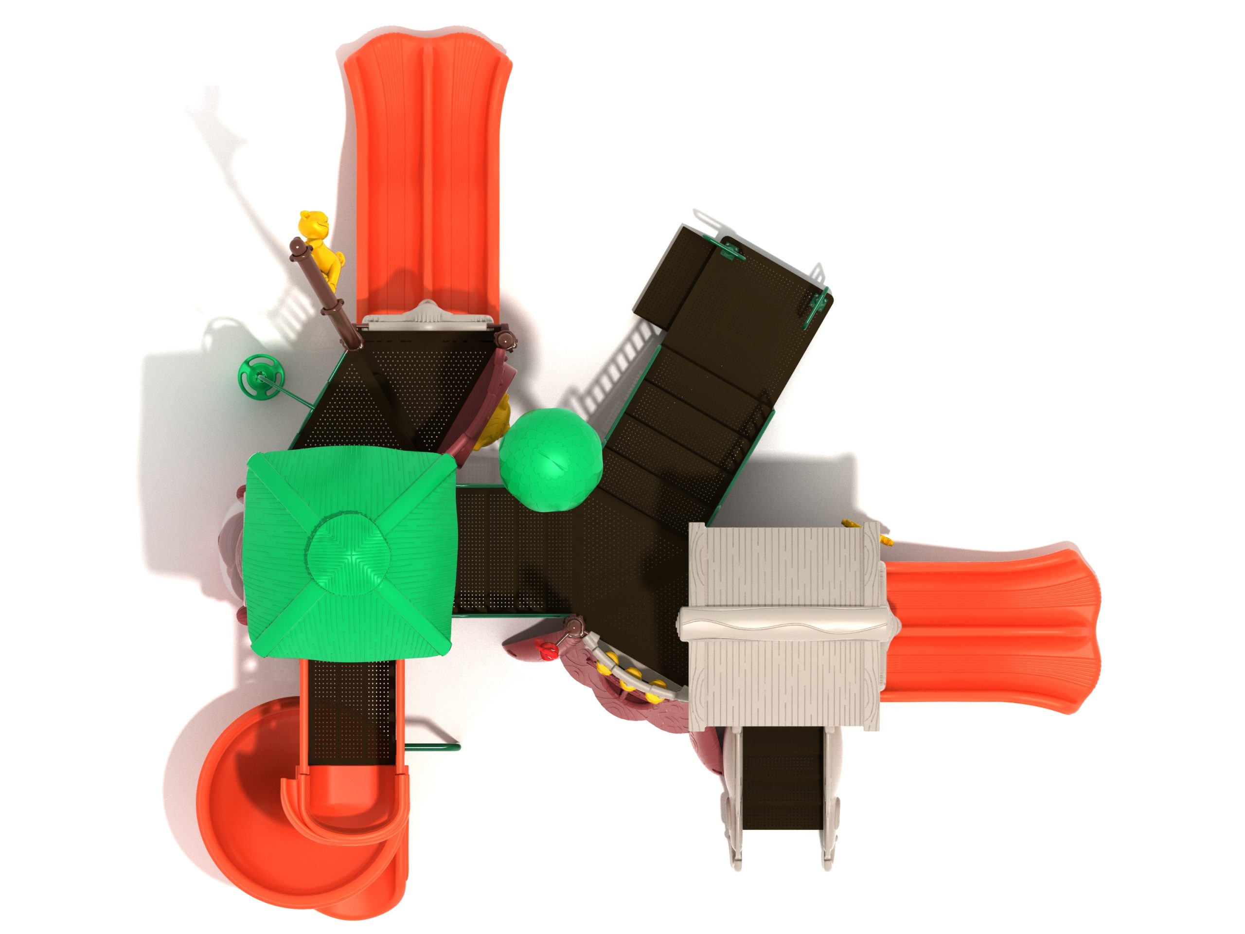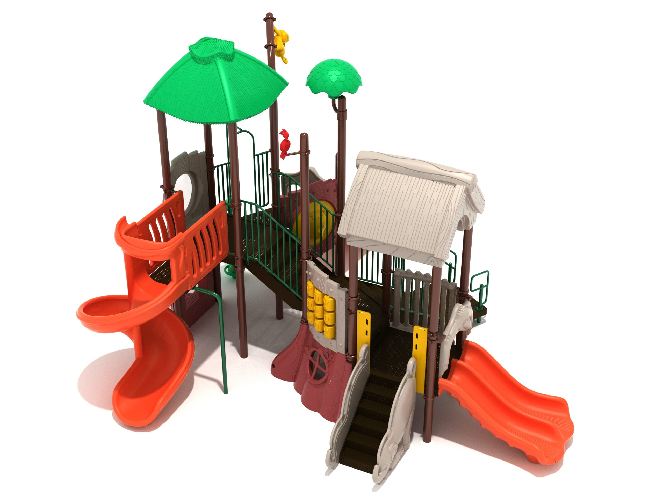 Underneath the watchful gaze of a cheeky Monkey topper and a colorful Parrot Topper, children can roam around this magical forest structure taking in everything it has to offer. Kids can take a trip up the multiple discs of the Pod Climber to reach the upper platform where there’s a friendly Bear Panel to greet them and a towering Tree Topper to really give that forest vibe. A Bubble Panel and Bamboo Panel are ideally positioned so kids can look out at their friends below and the addition of both a jungle-themed Stump Store Panel and Stump Window Panel reinforce the inspiration that they’re really in a magical forest. The Elephant Stair adds a playful element to playtime and a Ship’s Wheel puts kids in charge of a steamboat traveling up the mighty Amazon River in search of adventure. The whole play experience is topped off in the best way possible with a Double Slide, a Double Wave Slide for added bounce and a slippery, swervy Spiral Slide.