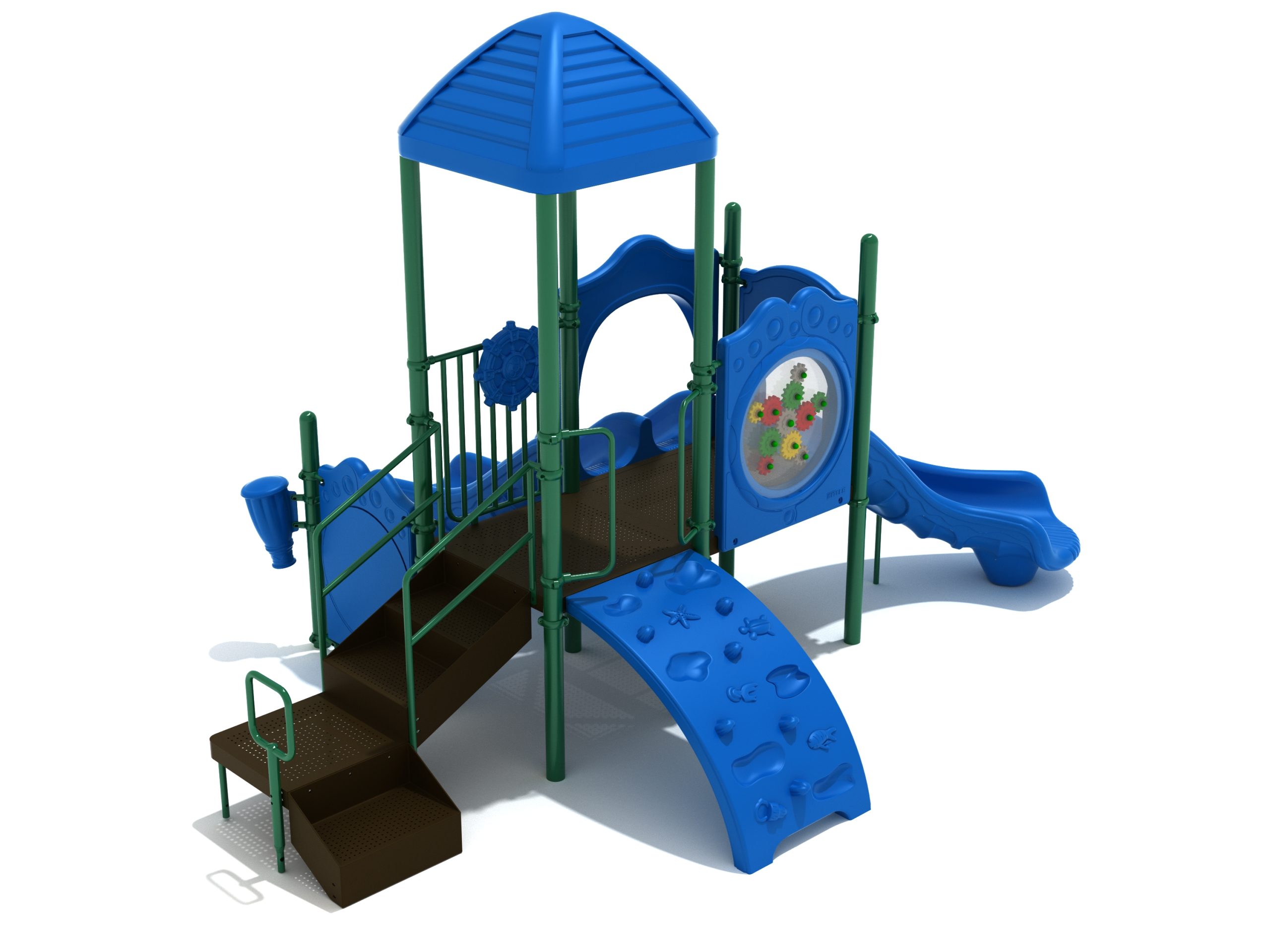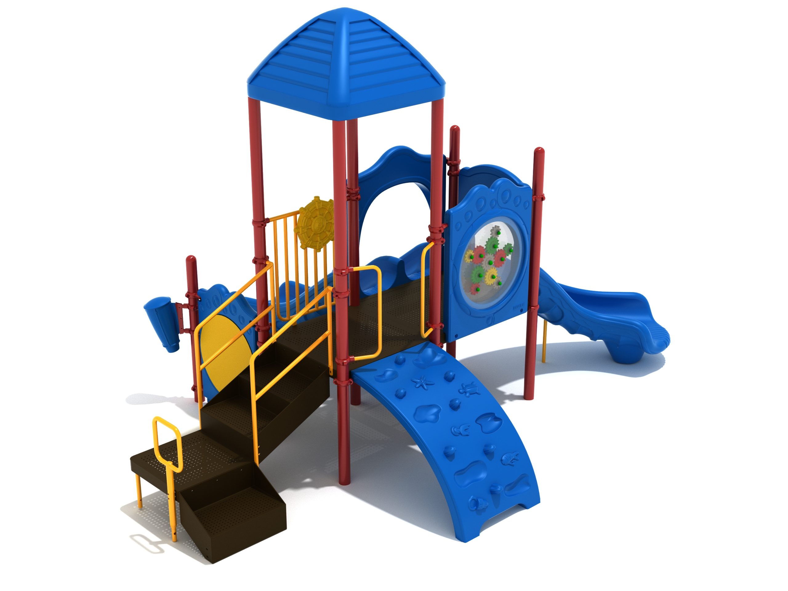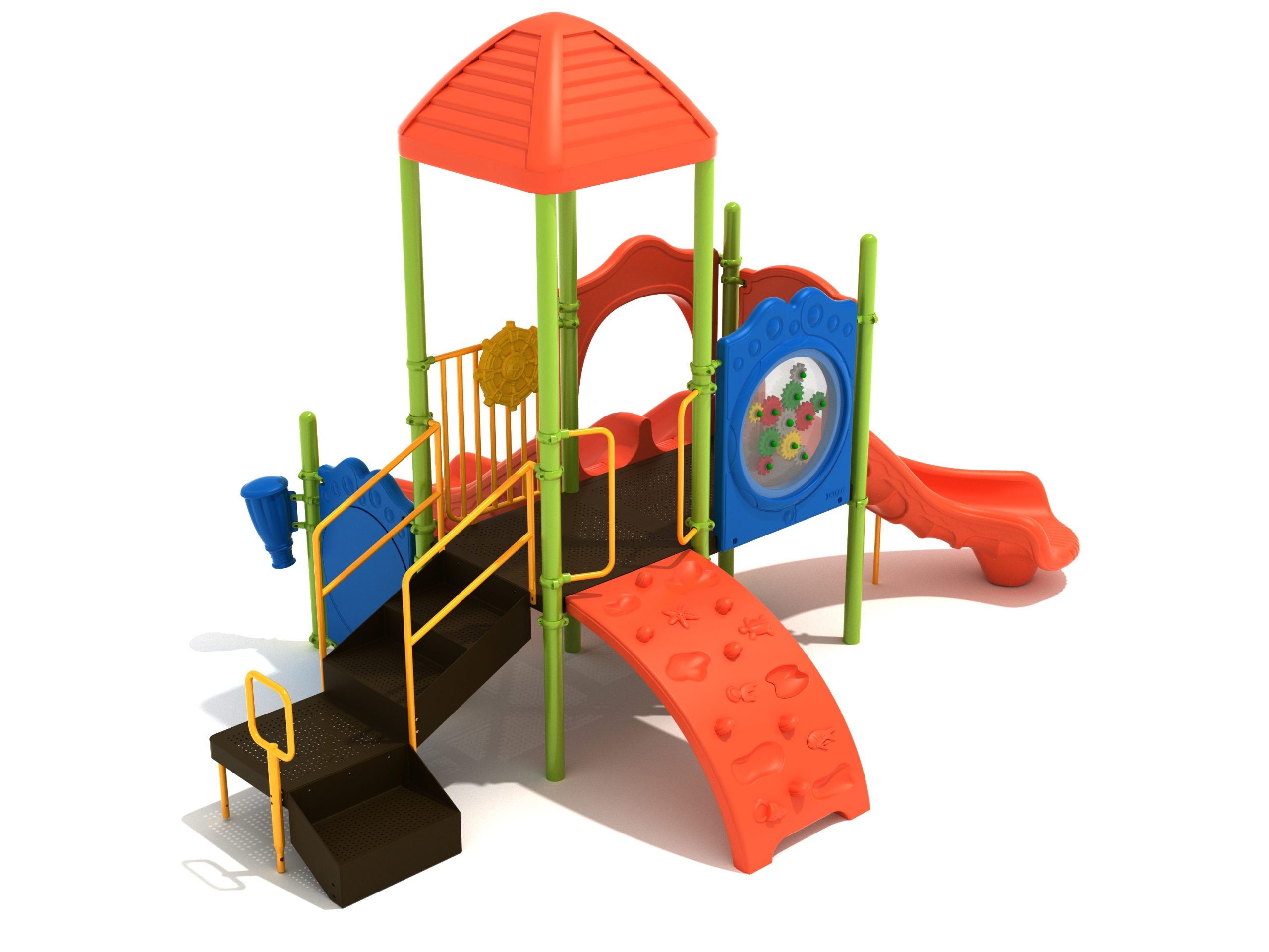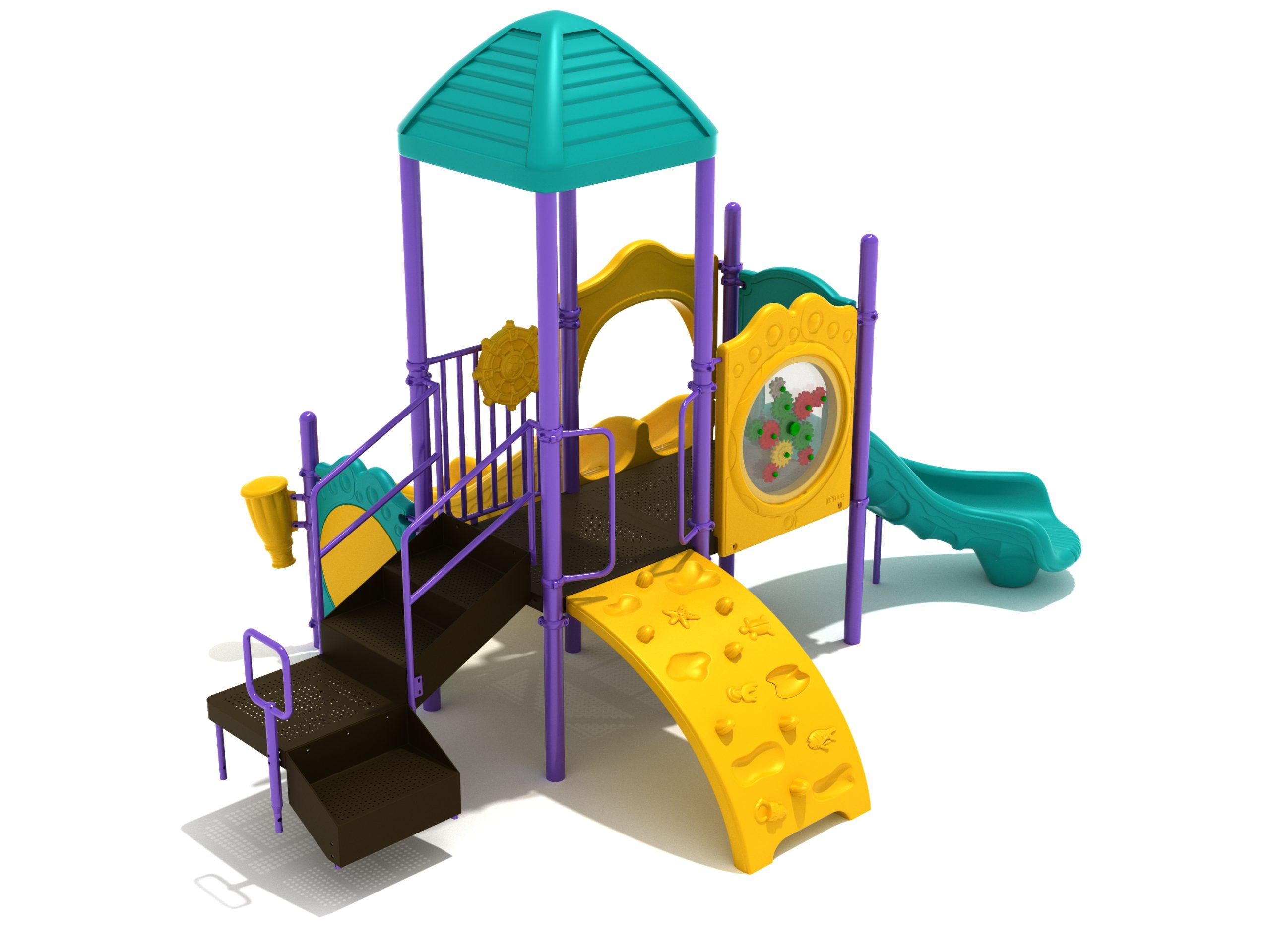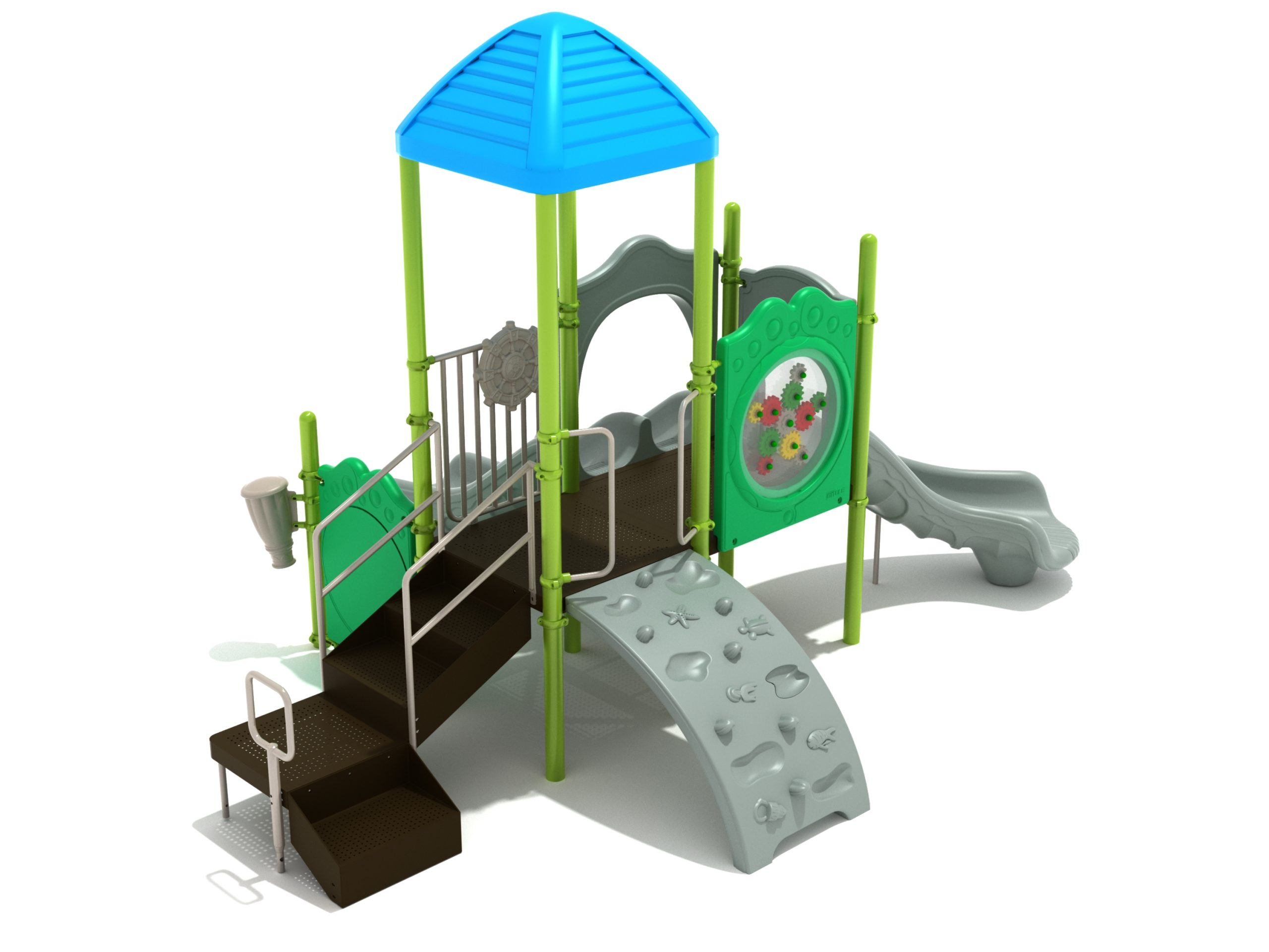The Lincoln play structure will be the star of the playground, made up of two 36” elevated, square platforms, and lots of fun features, this play structure is sure to be a hit. This play structure is accessible by a sea creature climber, and by stairs. A double slide and a right turn slide are attached to an elevated platform, giving children a fun way off of the play structure. A gear panel and a metal barrier with a ship’s wheel also border sides of the elevated platform. A single drum and a drum panel are found on the ground level, providing opportunities for on-ground play and make the Lincoln play structure ADA compliant. A line roof covers part of the structure, providing shade and protection from the sun to children playing on the play structure during sunny days. This play structure is designed for children who are between the ages of 2 and 12 years old.