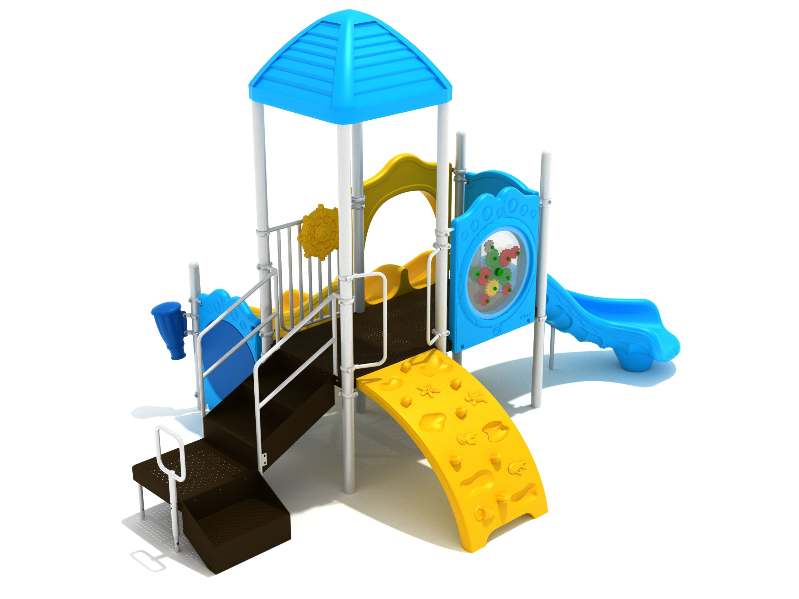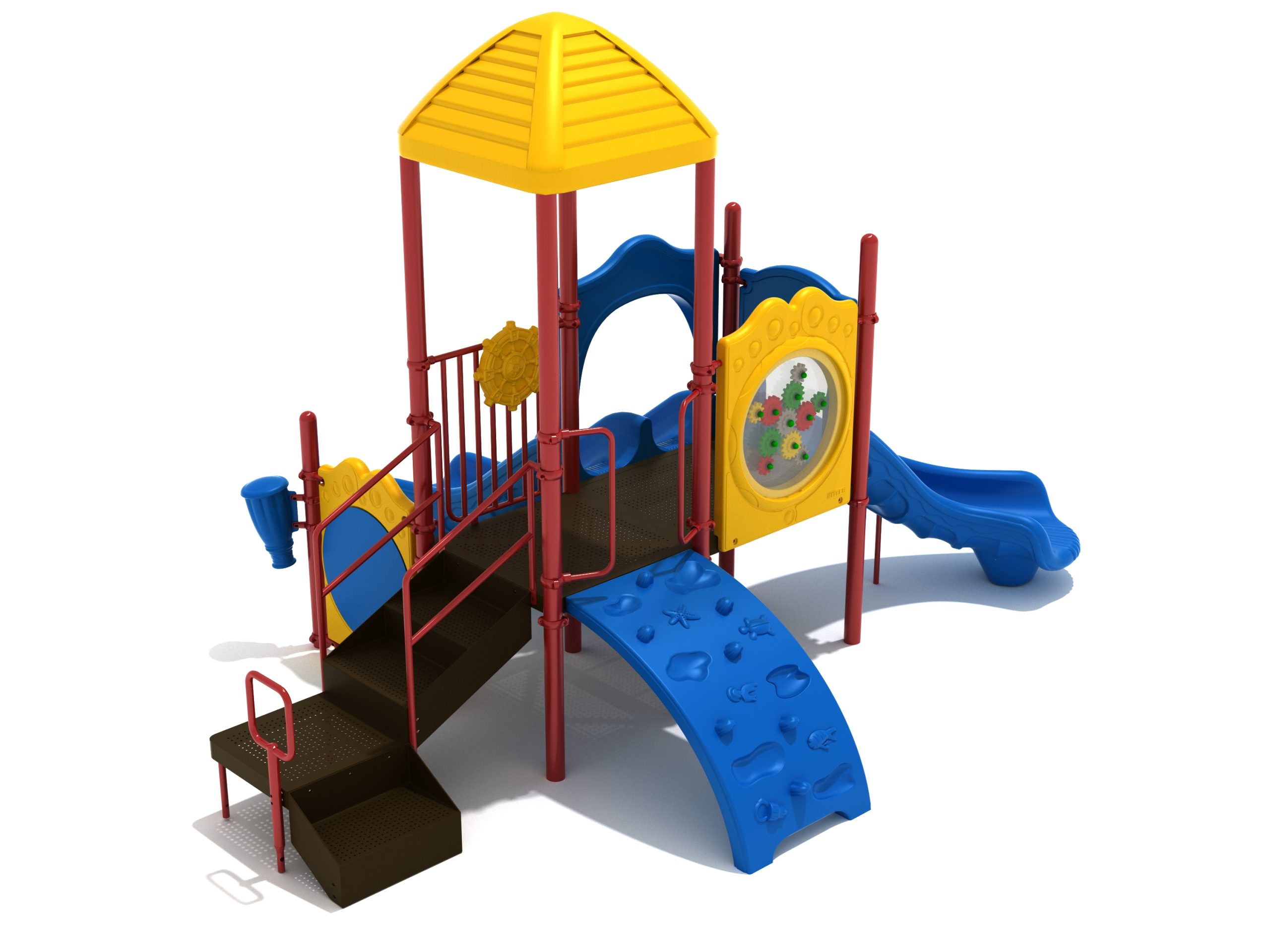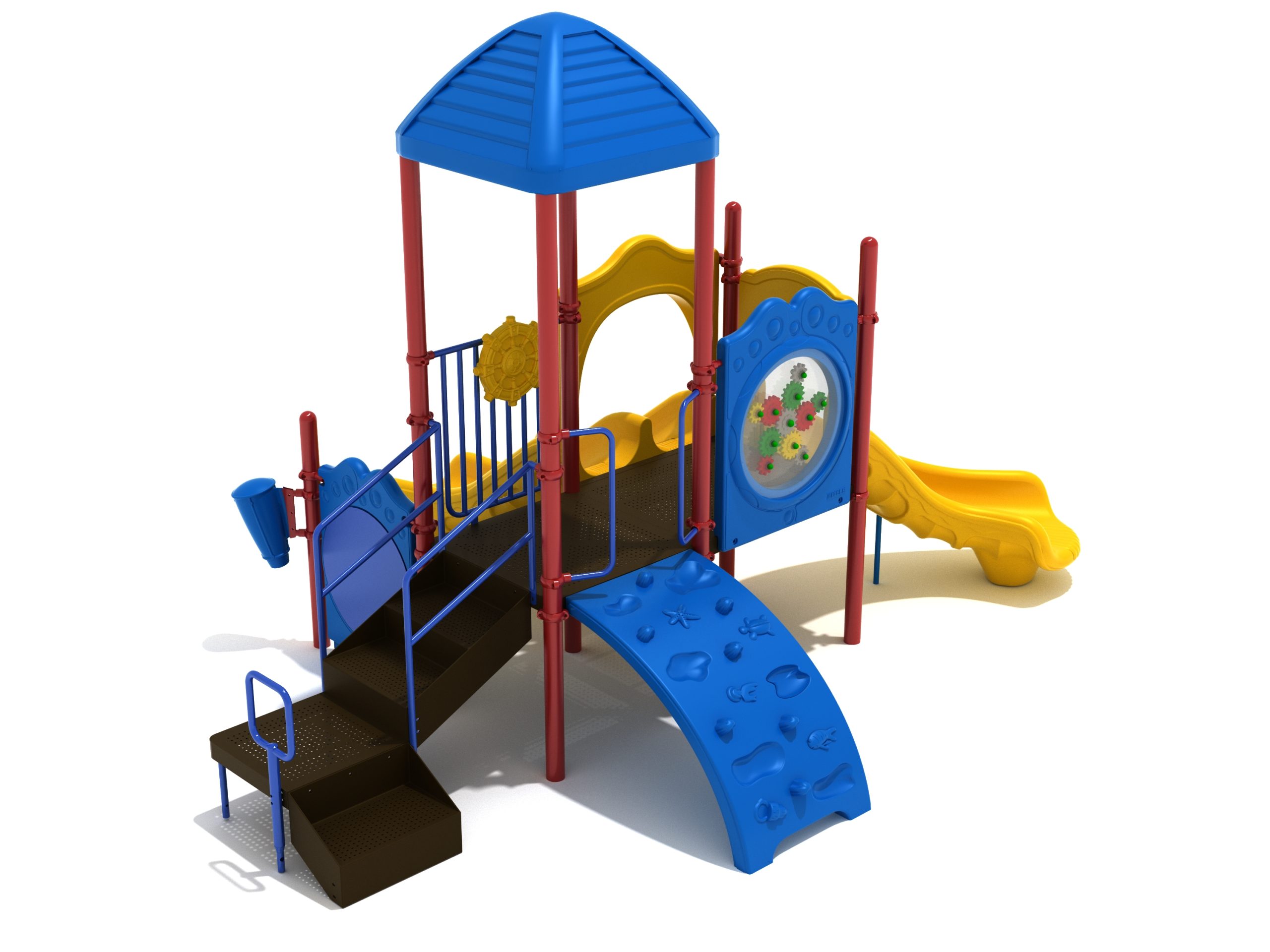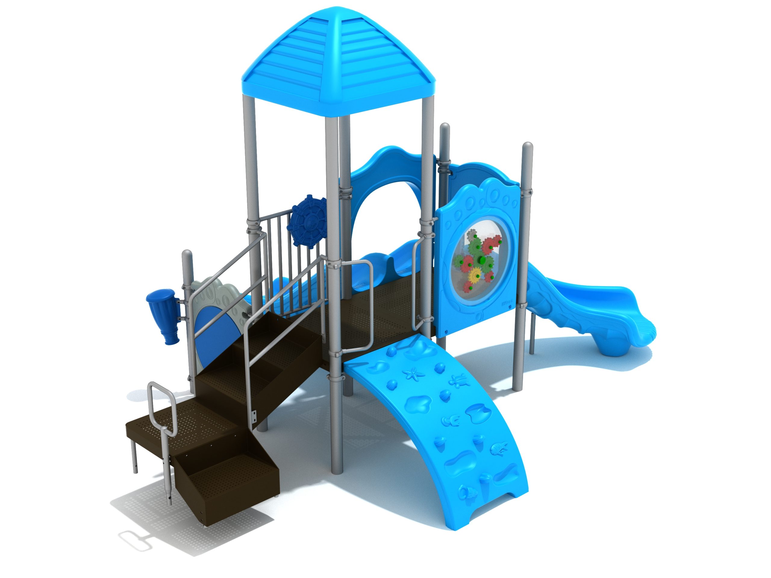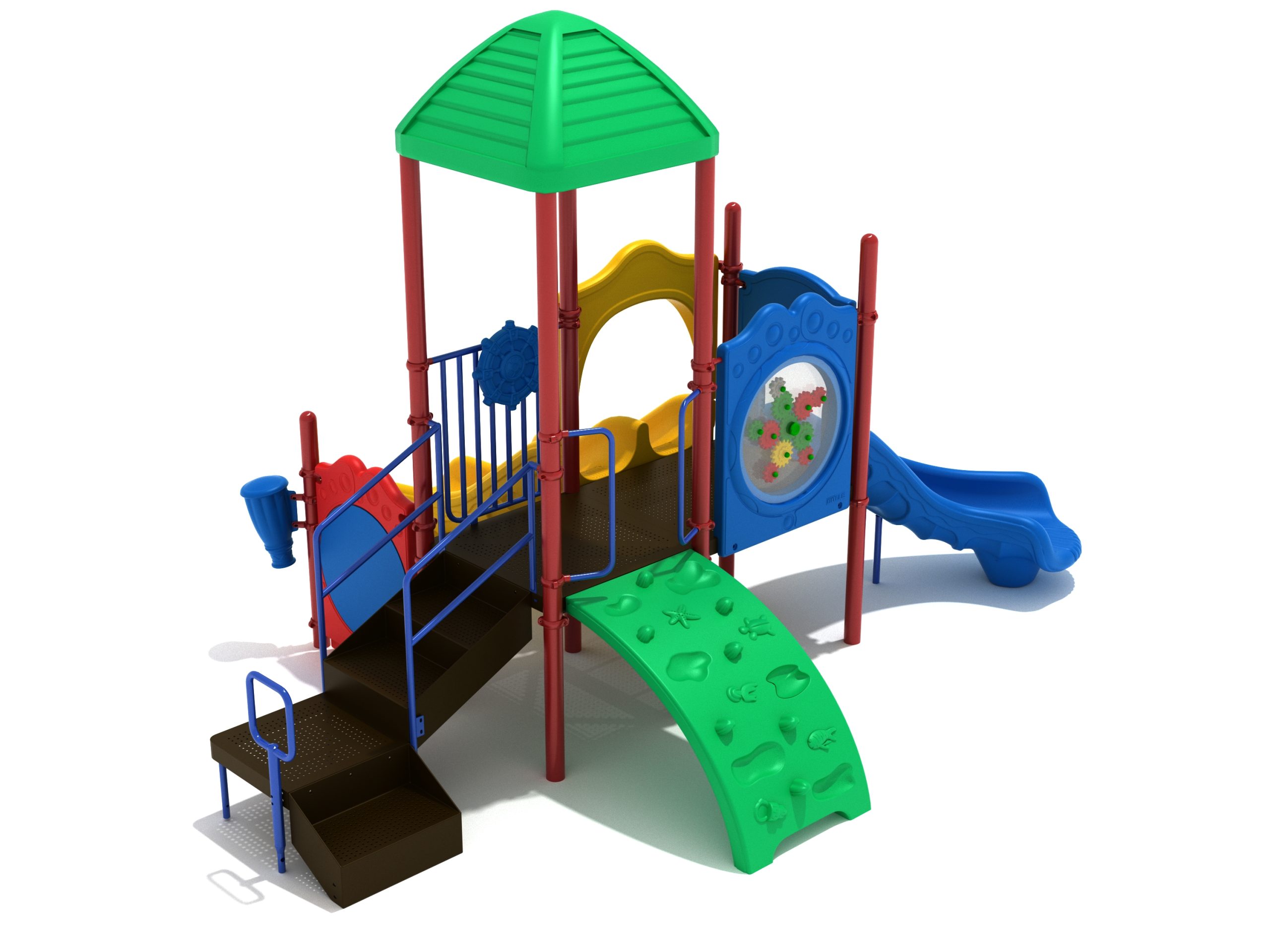 The Lincoln play structure will be the star of the playground, made up of two 36” elevated, square platforms, and lots of fun features, this play structure is sure to be a hit. This play structure is accessible by a sea creature climber, and by stairs. A double slide and a right turn slide are attached to an elevated platform, giving children a fun way off of the play structure. A gear panel and a metal barrier with a ship’s wheel also border sides of the elevated platform. A single drum and a drum panel are found on the ground level, providing opportunities for on-ground play and make the Lincoln play structure ADA compliant. A line roof covers part of the structure, providing shade and protection from the sun to children playing on the play structure during sunny days. This play structure is designed for children who are between the ages of 2 and 12 years old.