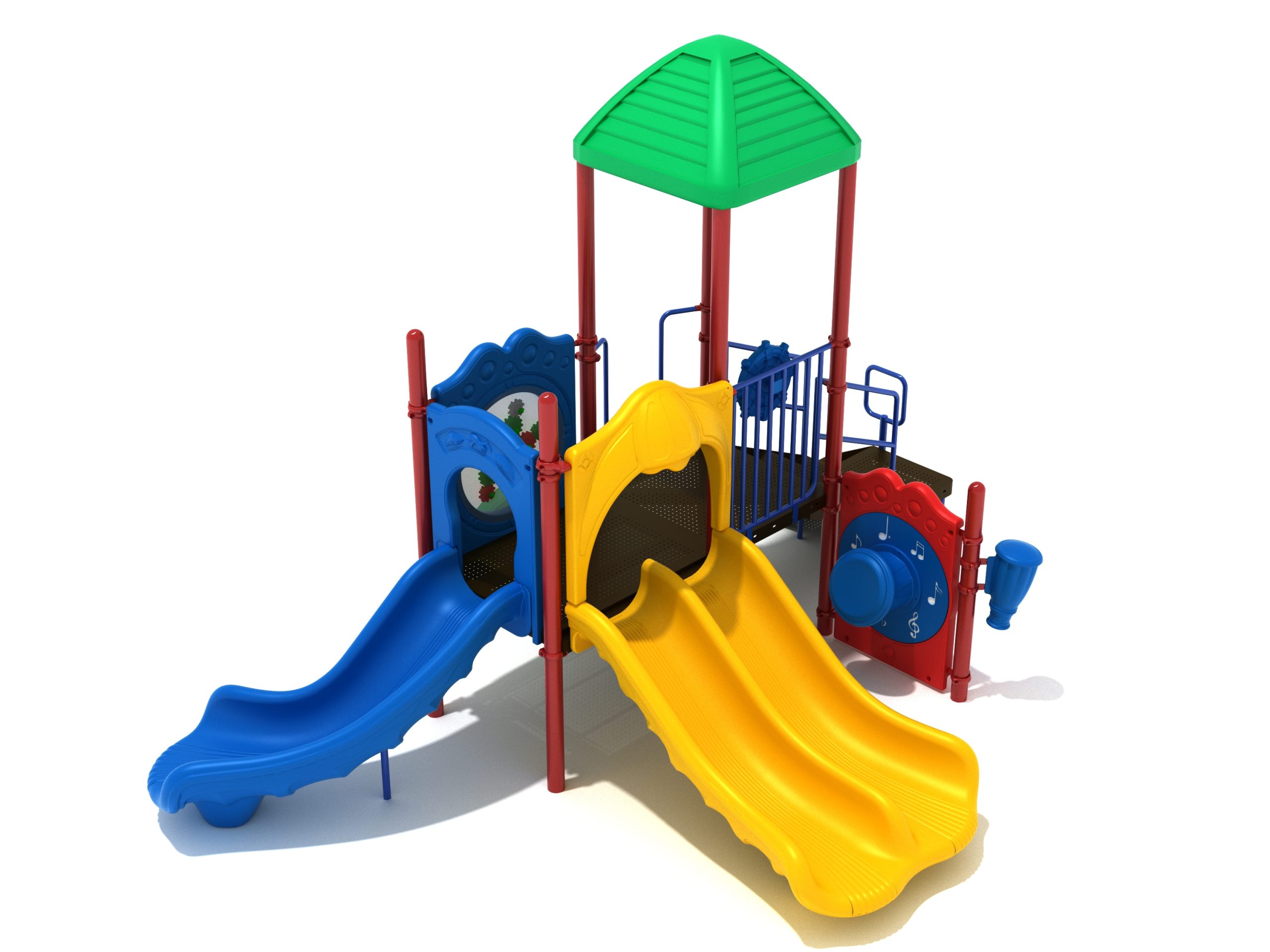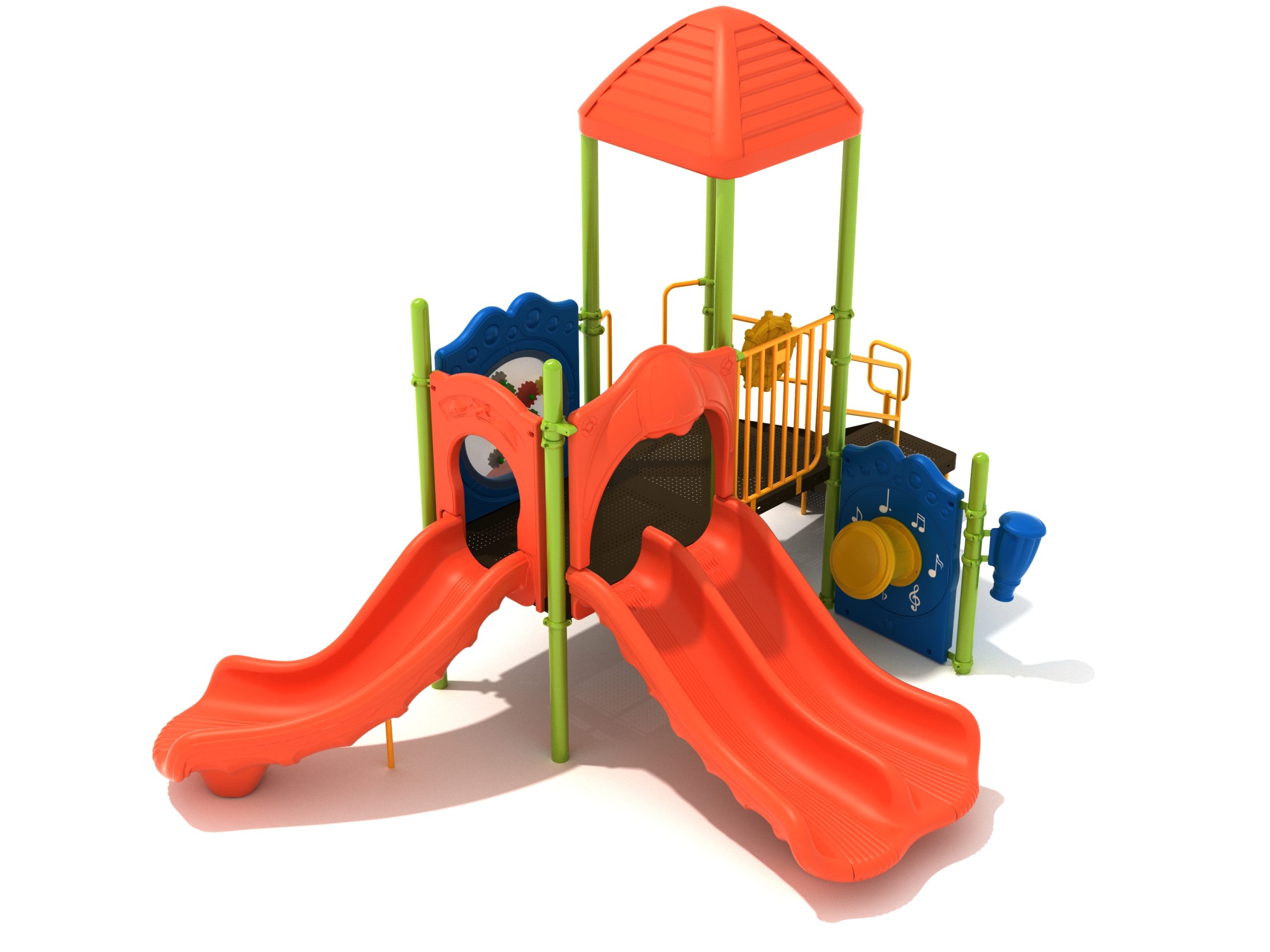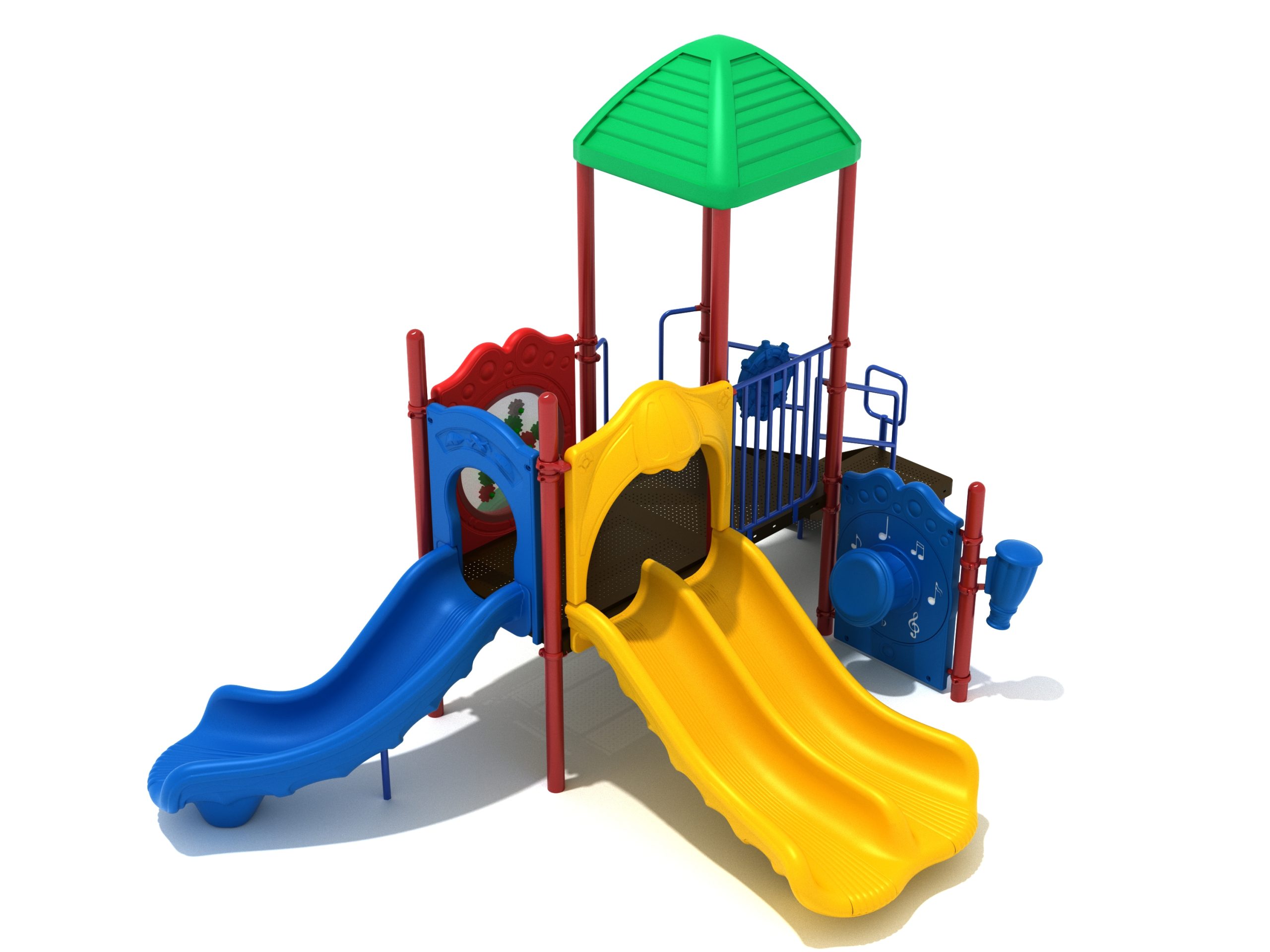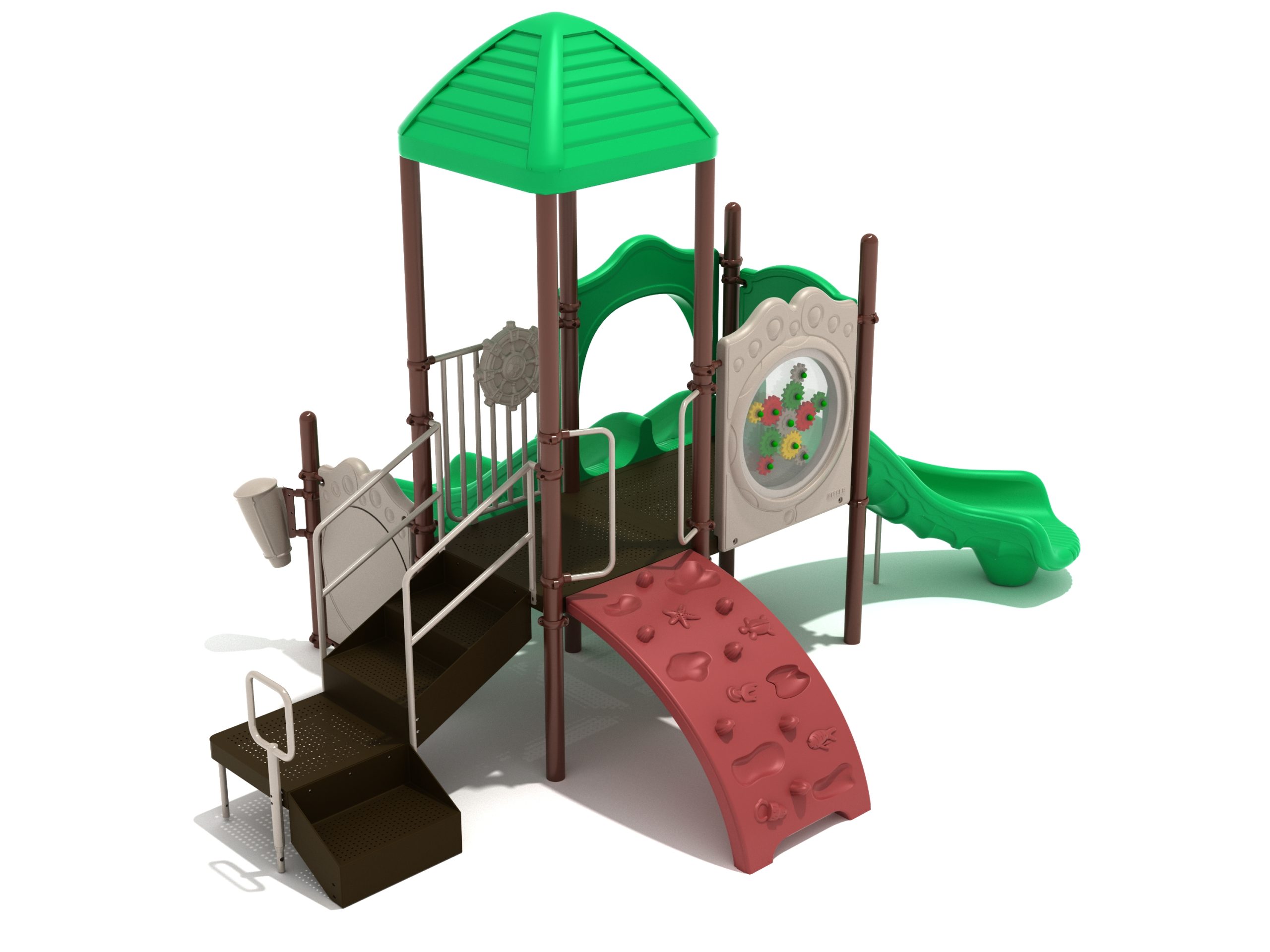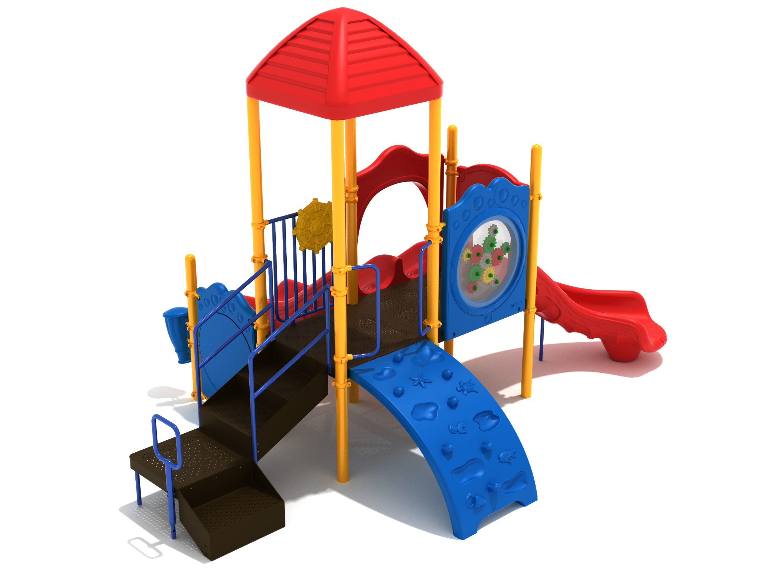 The Lincoln play structure will be the star of the playground, made up of two 36” elevated, square platforms, and lots of fun features, this play structure is sure to be a hit. This play structure is accessible by a sea creature climber, and by stairs. A double slide and a right turn slide are attached to an elevated platform, giving children a fun way off of the play structure. A gear panel and a metal barrier with a ship’s wheel also border sides of the elevated platform. A single drum and a drum panel are found on the ground level, providing opportunities for on-ground play and make the Lincoln play structure ADA compliant. A line roof covers part of the structure, providing shade and protection from the sun to children playing on the play structure during sunny days. This play structure is designed for children who are between the ages of 2 and 12 years old.