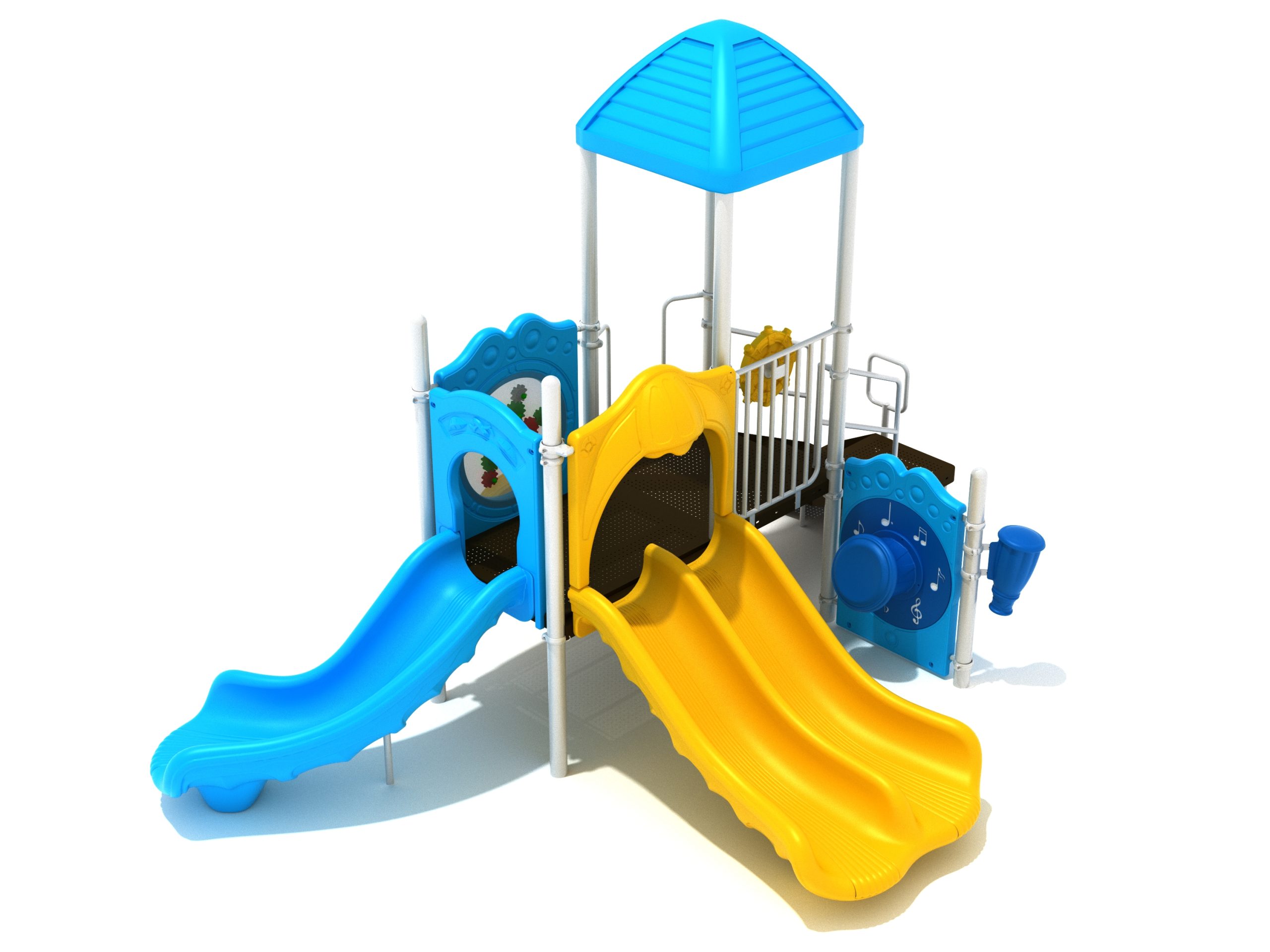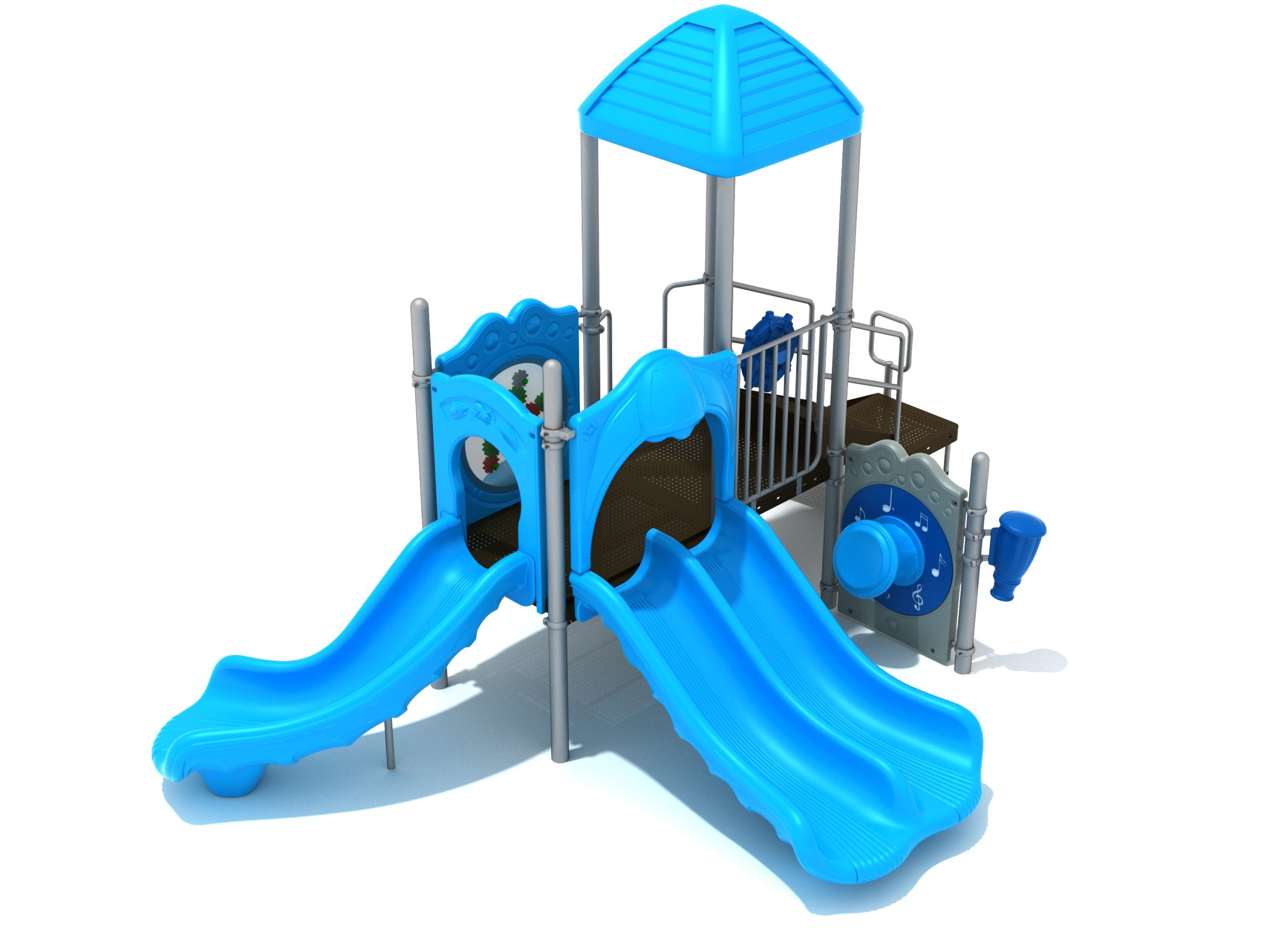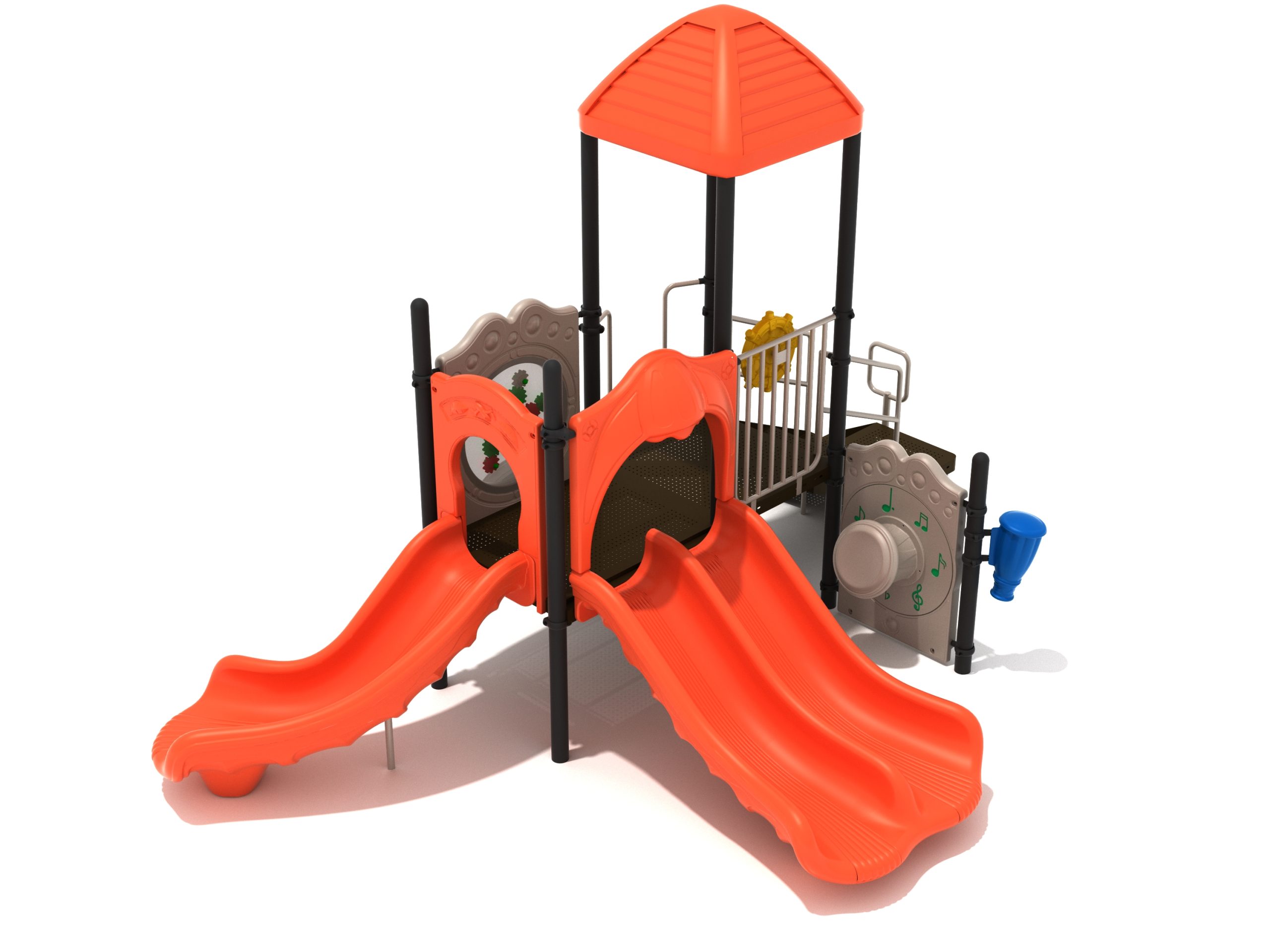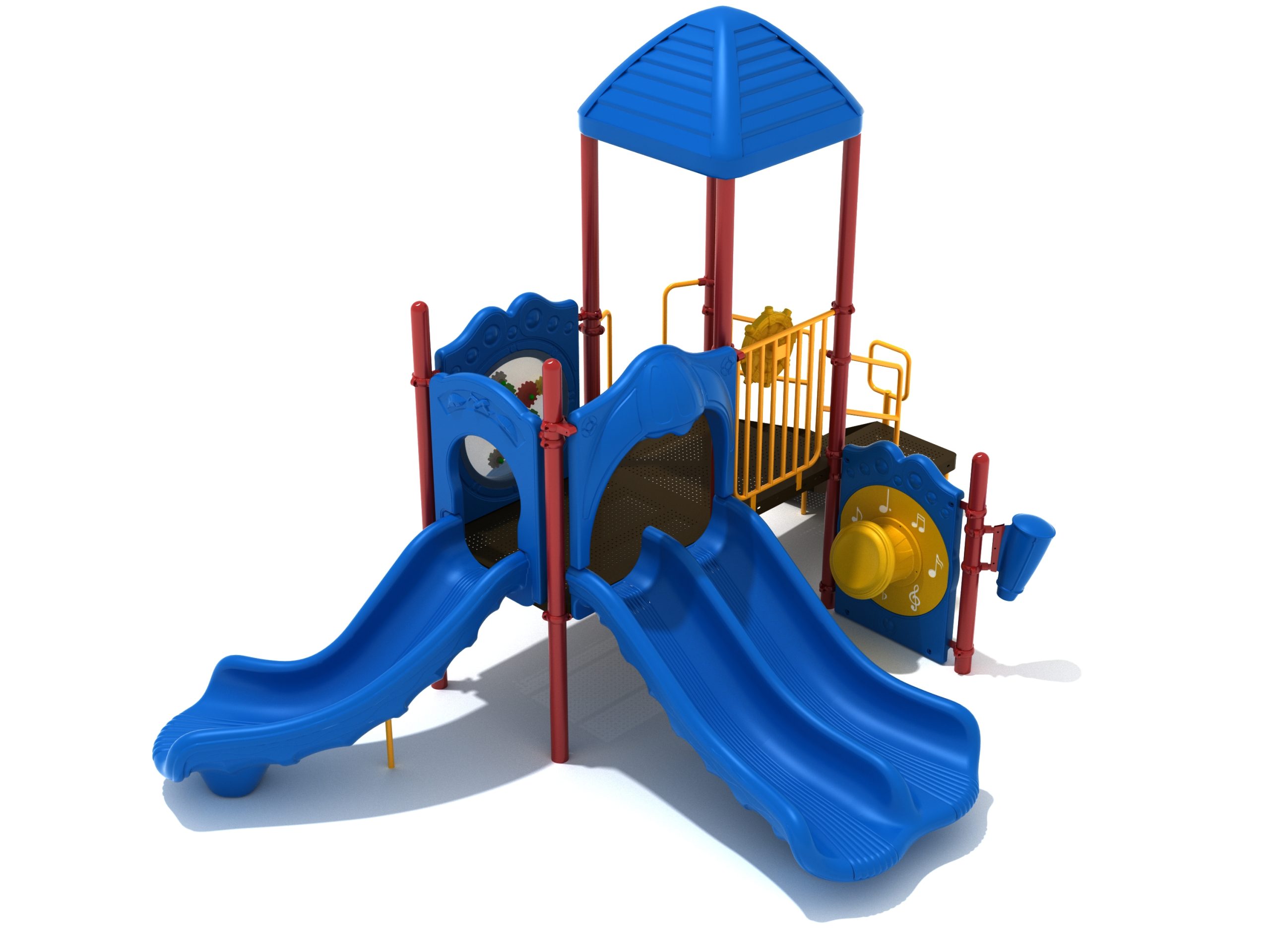 The Lincoln play structure will be the star of the playground, made up of two 36” elevated, square platforms, and lots of fun features, this play structure is sure to be a hit. This play structure is accessible by a sea creature climber, and by stairs. A double slide and a right turn slide are attached to an elevated platform, giving children a fun way off of the play structure. A gear panel and a metal barrier with a ship’s wheel also border sides of the elevated platform. A single drum and a drum panel are found on the ground level, providing opportunities for on-ground play and make the Lincoln play structure ADA compliant. A line roof covers part of the structure, providing shade and protection from the sun to children playing on the play structure during sunny days. This play structure is designed for children who are between the ages of 2 and 12 years old.