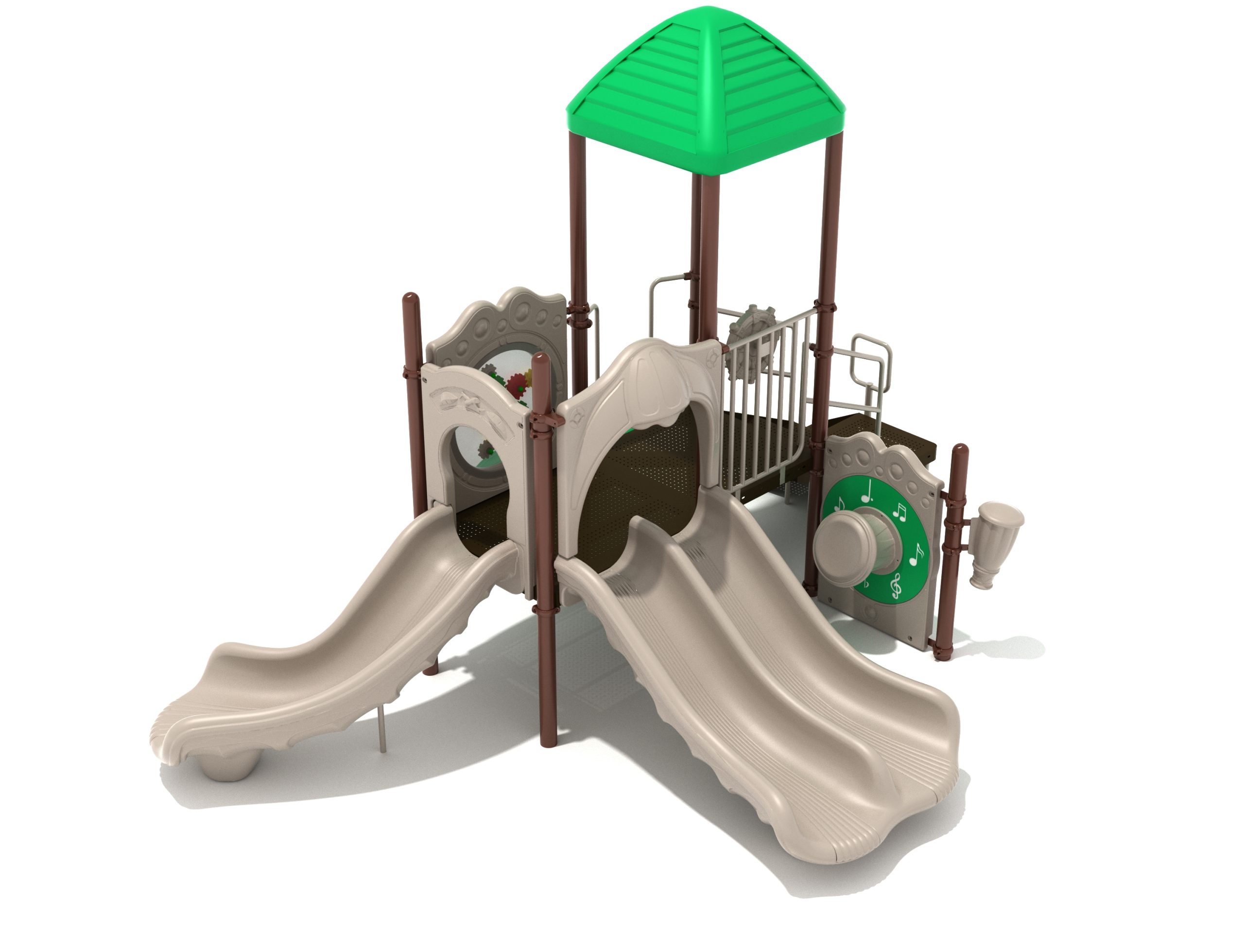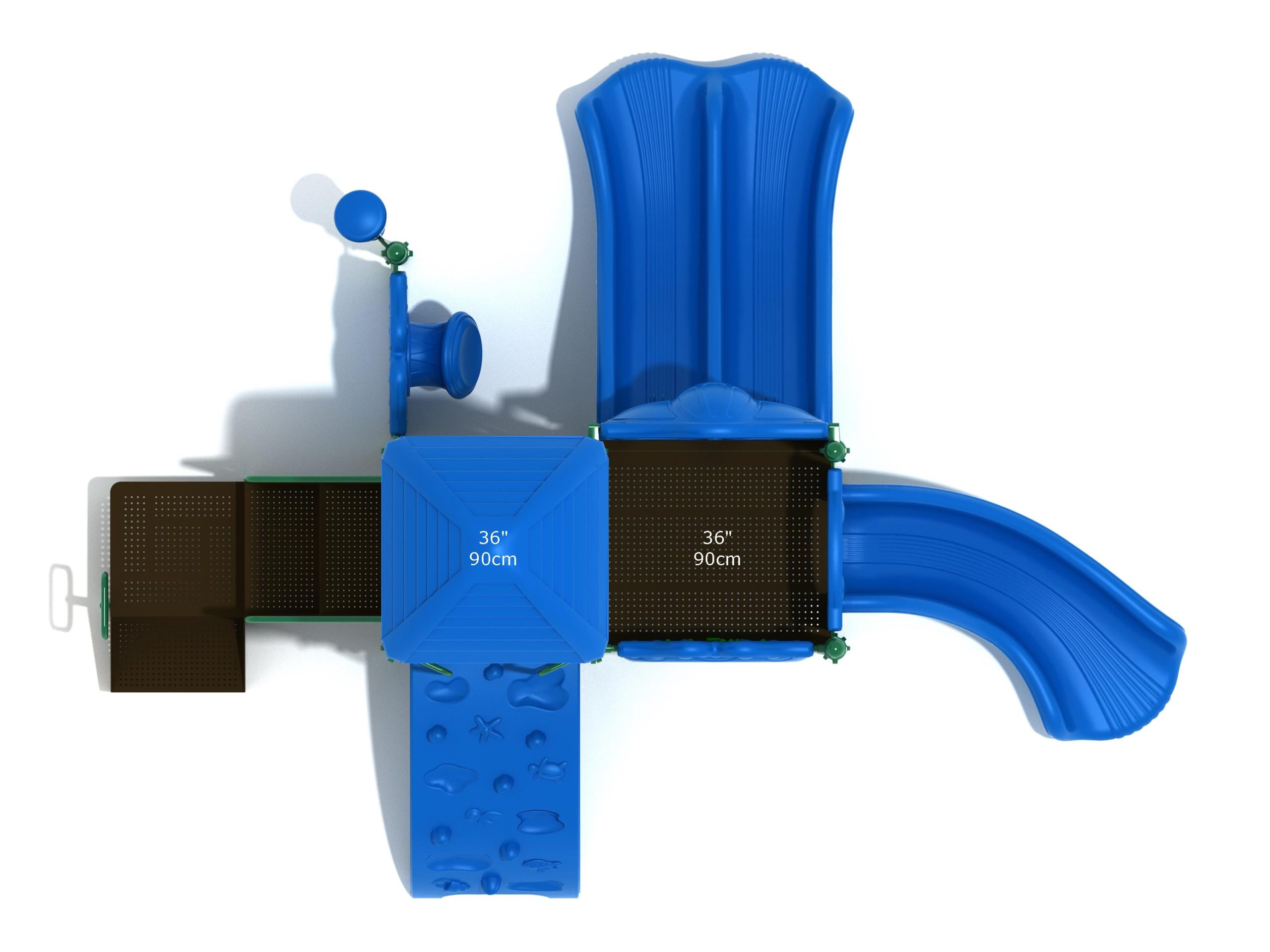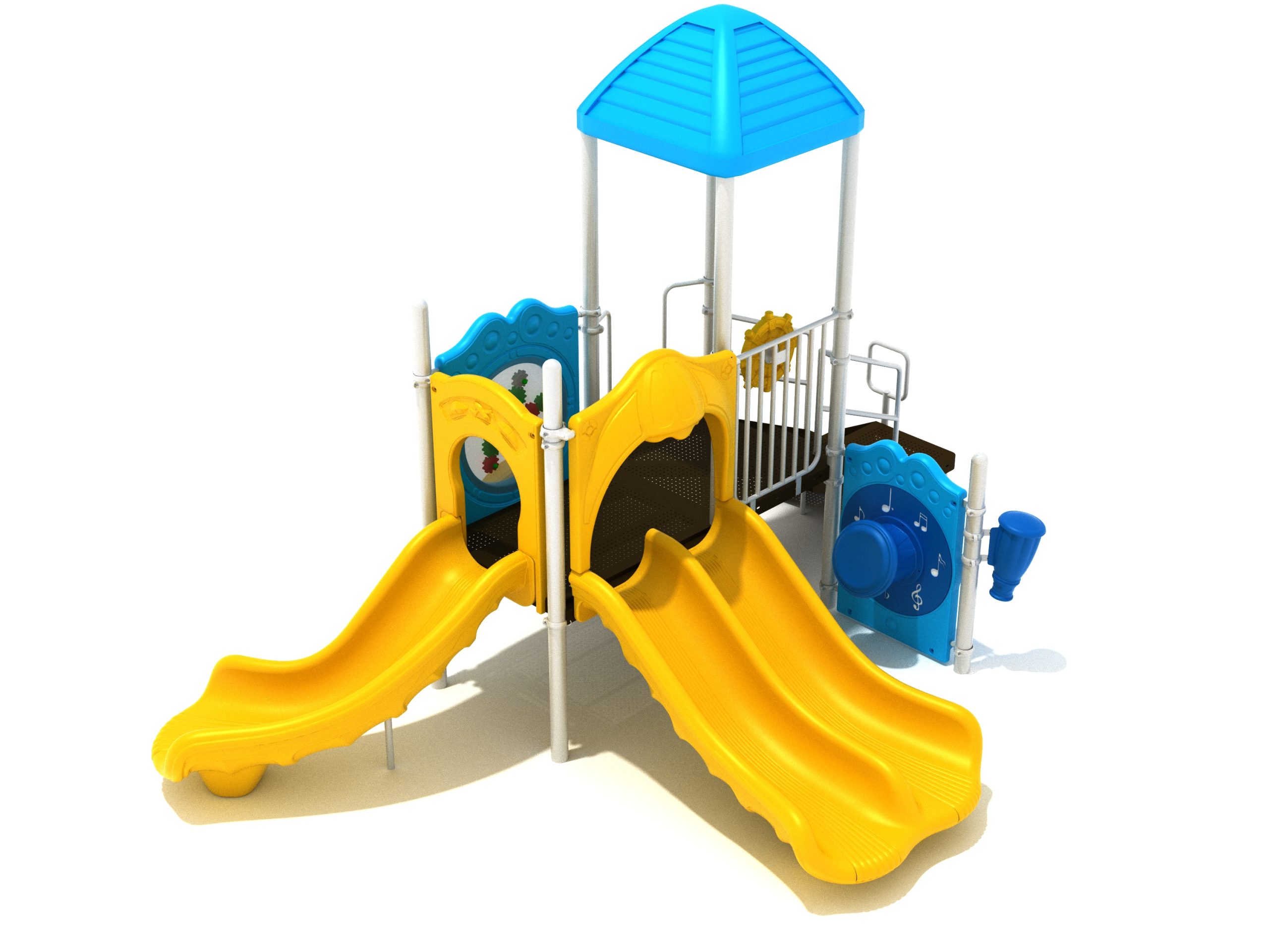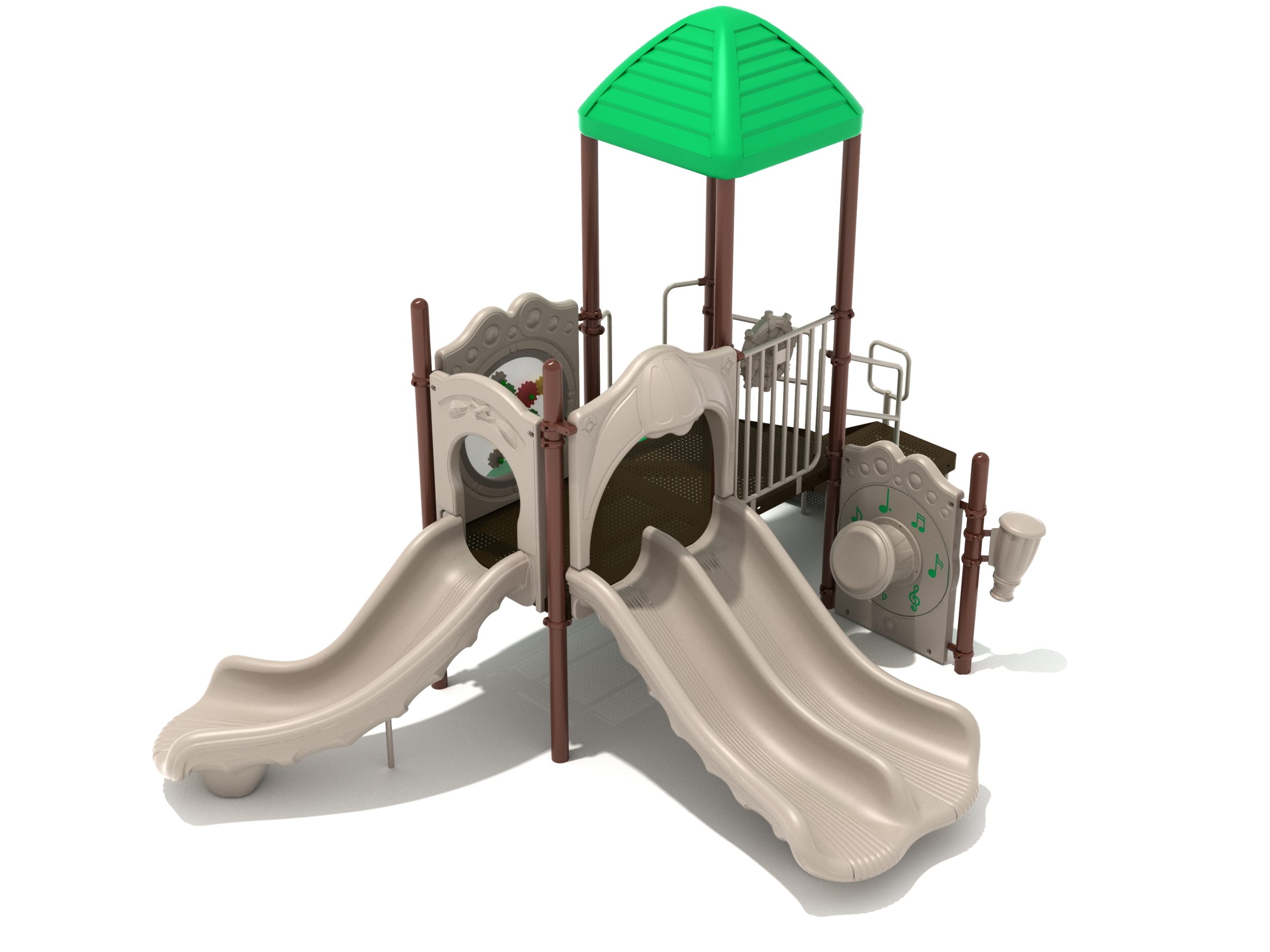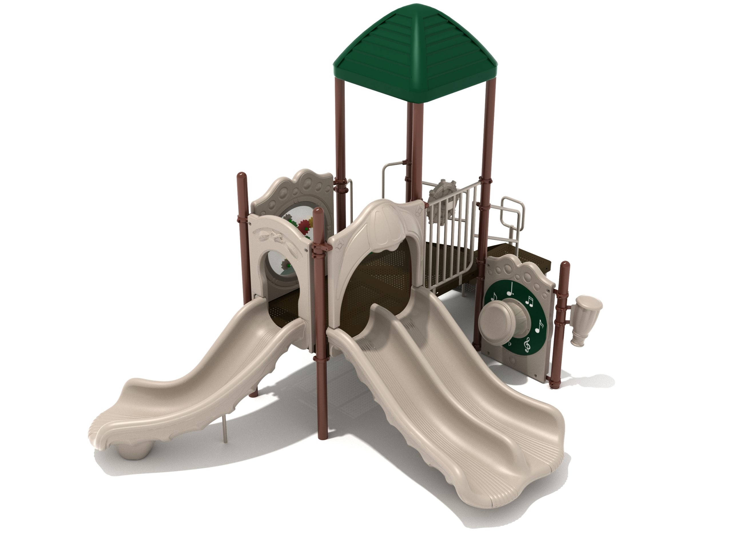 The Lincoln play structure will be the star of the playground, made up of two 36” elevated, square platforms, and lots of fun features, this play structure is sure to be a hit. This play structure is accessible by a sea creature climber, and by stairs. A double slide and a right turn slide are attached to an elevated platform, giving children a fun way off of the play structure. A gear panel and a metal barrier with a ship’s wheel also border sides of the elevated platform. A single drum and a drum panel are found on the ground level, providing opportunities for on-ground play and make the Lincoln play structure ADA compliant. A line roof covers part of the structure, providing shade and protection from the sun to children playing on the play structure during sunny days. This play structure is designed for children who are between the ages of 2 and 12 years old.