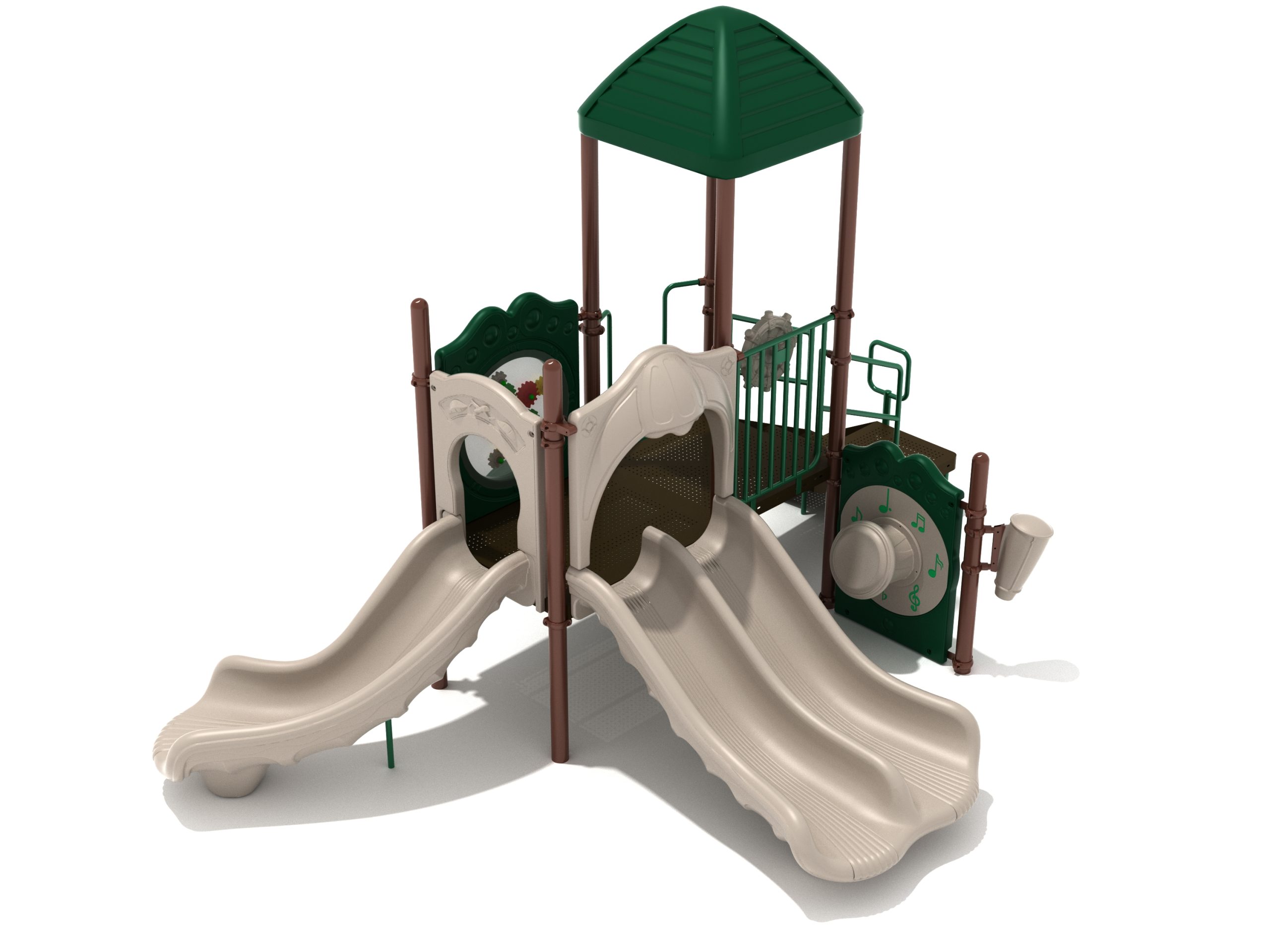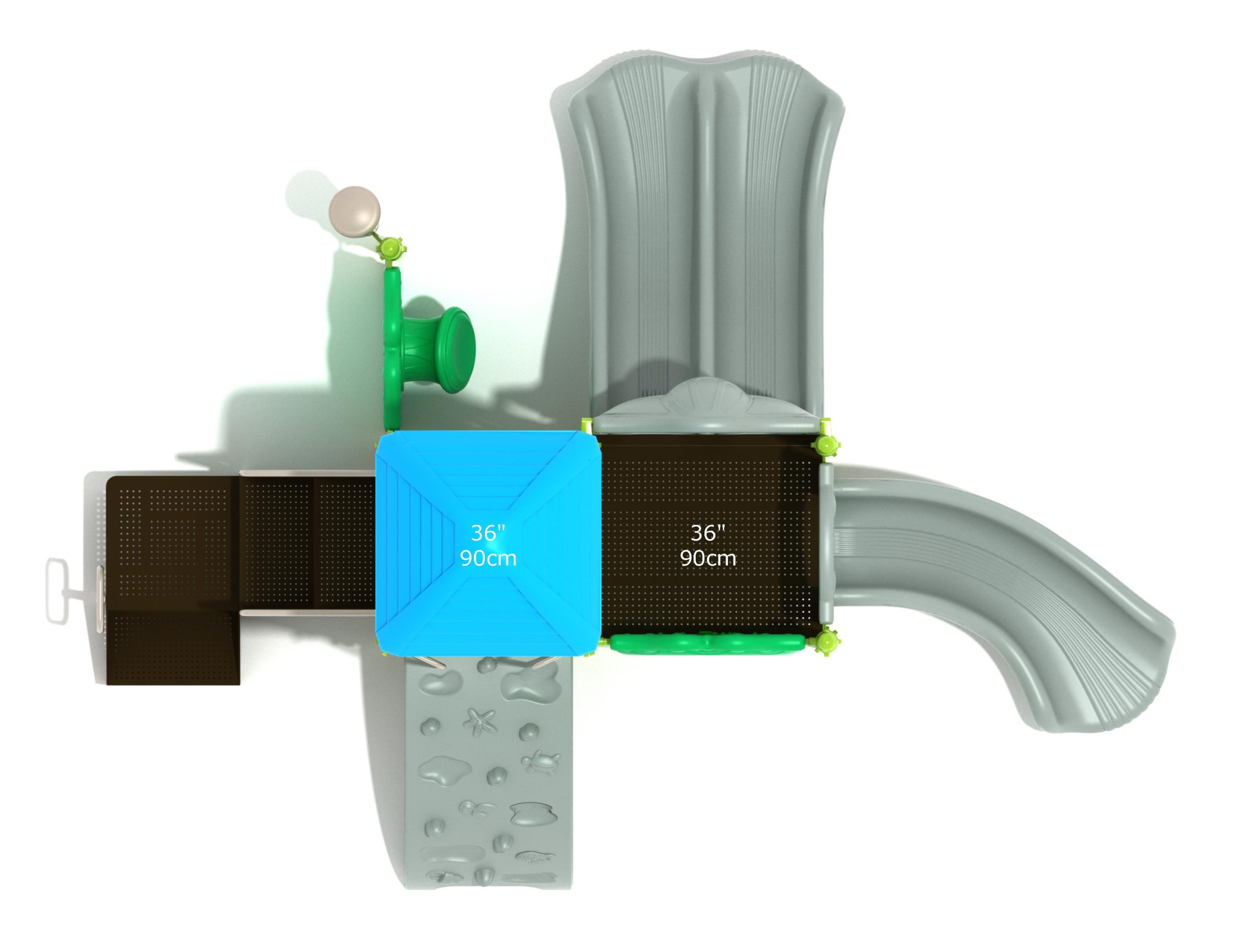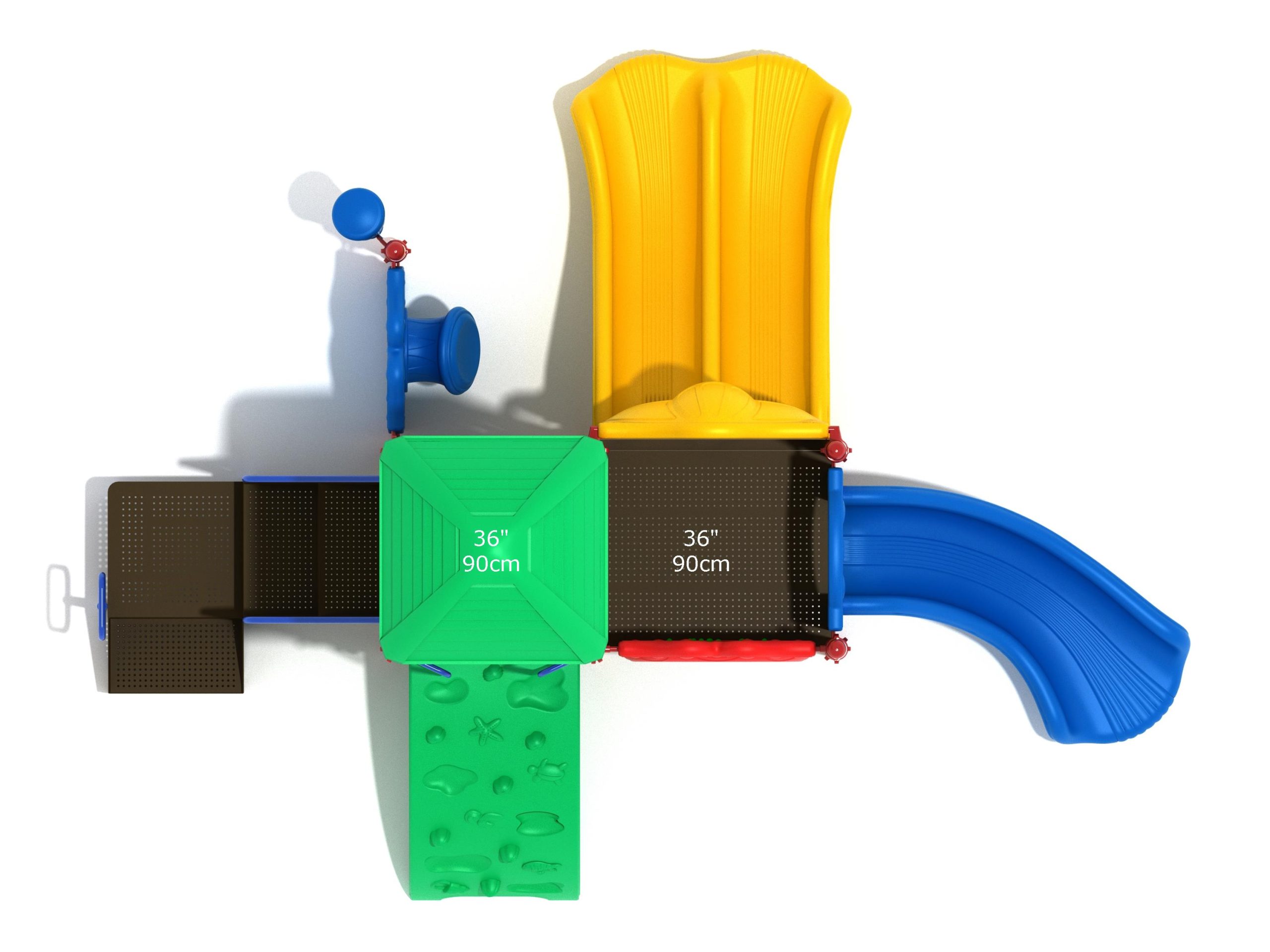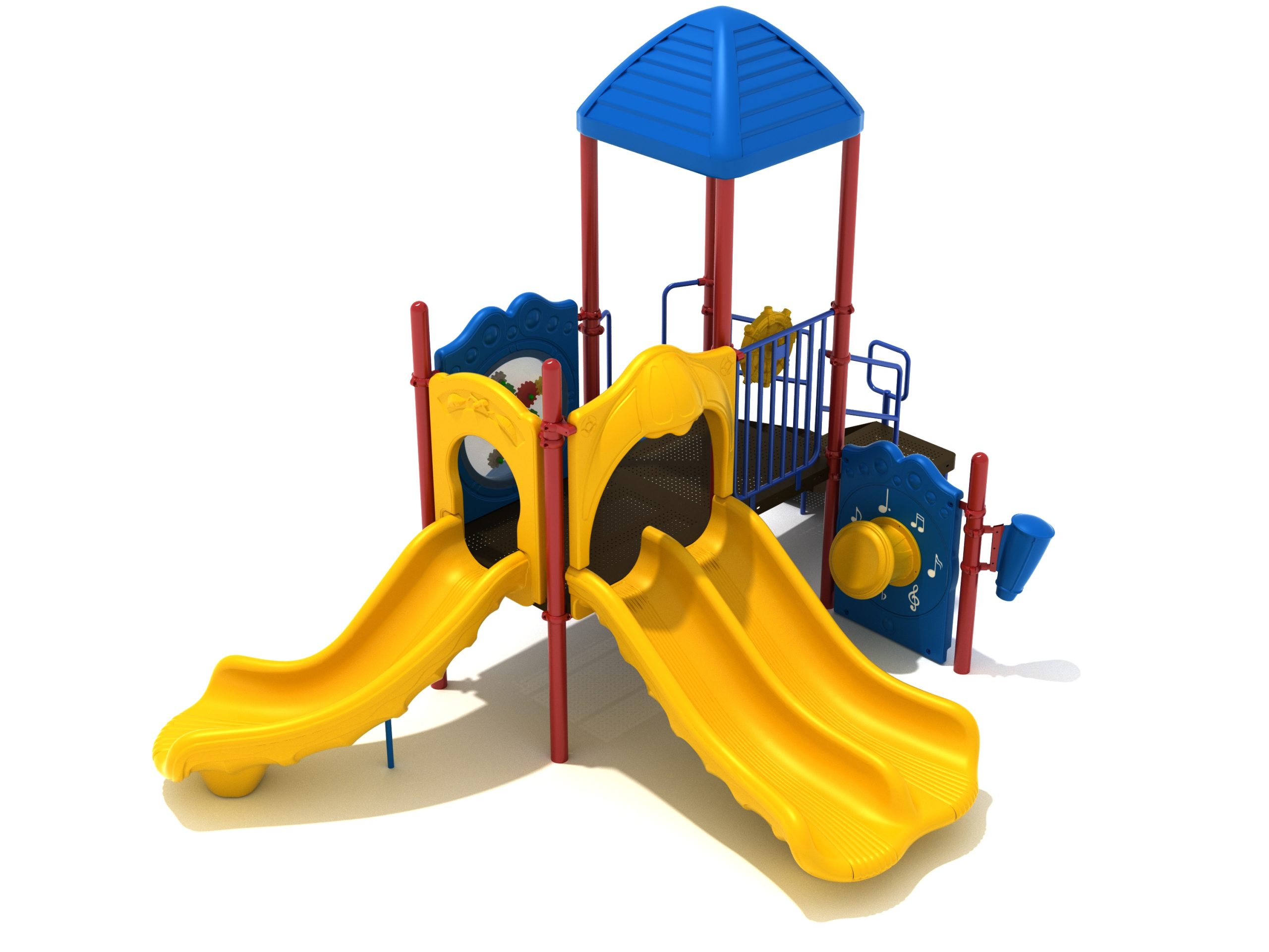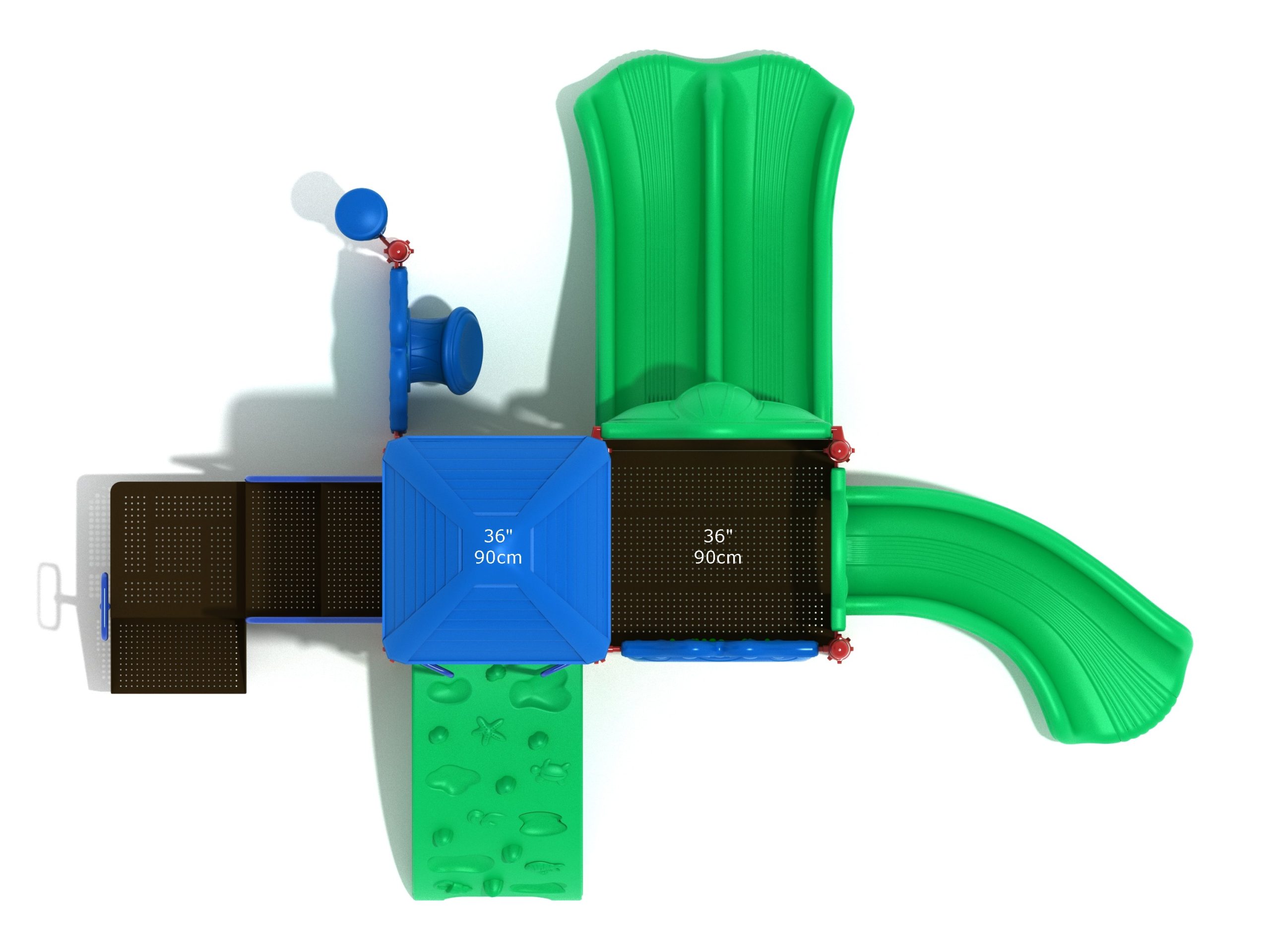 The Lincoln play structure will be the star of the playground, made up of two 36” elevated, square platforms, and lots of fun features, this play structure is sure to be a hit. This play structure is accessible by a sea creature climber, and by stairs. A double slide and a right turn slide are attached to an elevated platform, giving children a fun way off of the play structure. A gear panel and a metal barrier with a ship’s wheel also border sides of the elevated platform. A single drum and a drum panel are found on the ground level, providing opportunities for on-ground play and make the Lincoln play structure ADA compliant. A line roof covers part of the structure, providing shade and protection from the sun to children playing on the play structure during sunny days. This play structure is designed for children who are between the ages of 2 and 12 years old.
