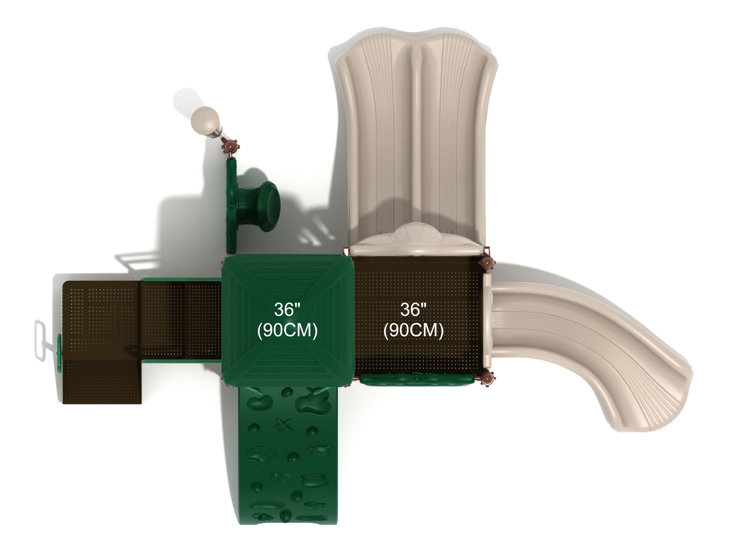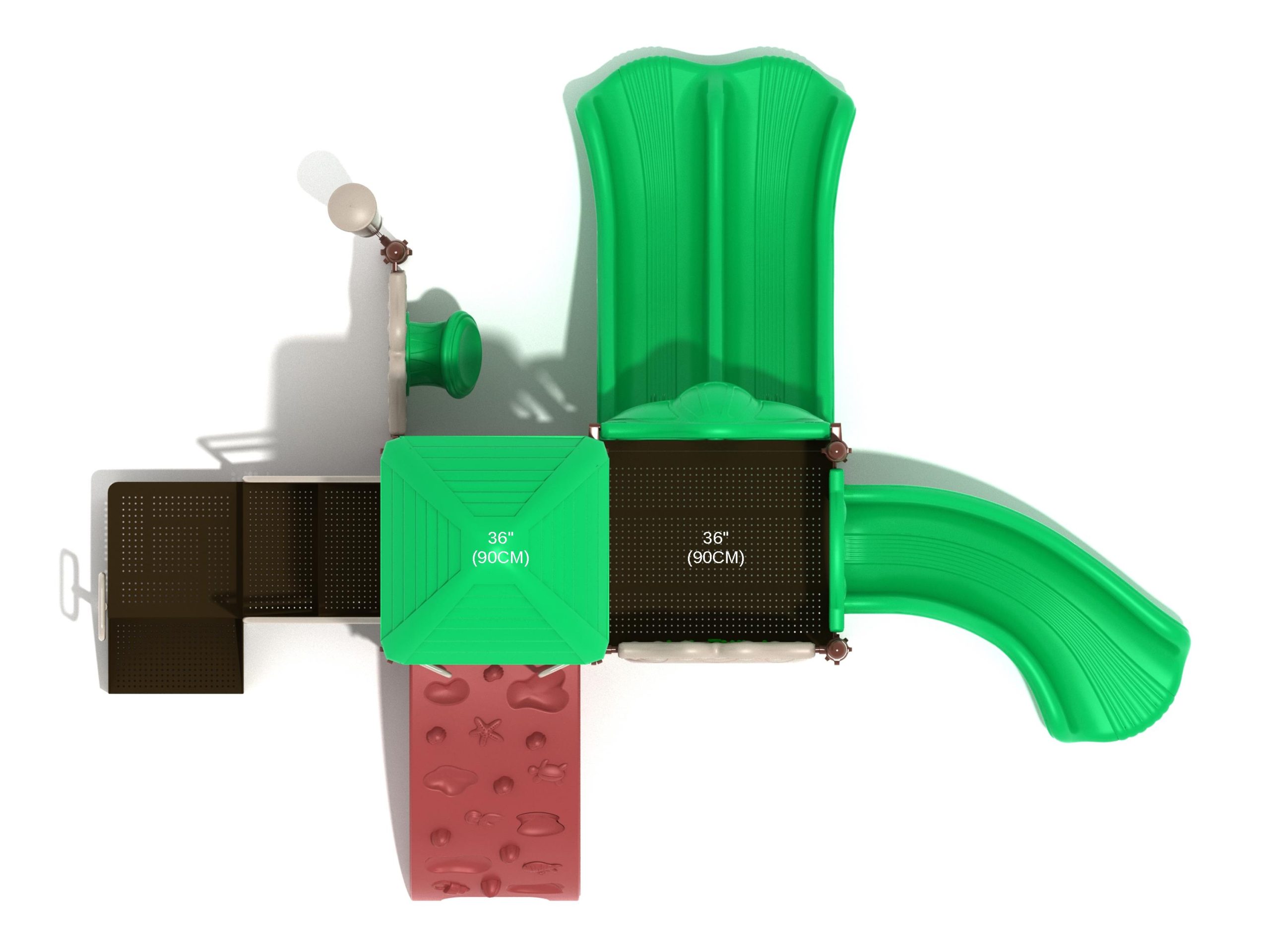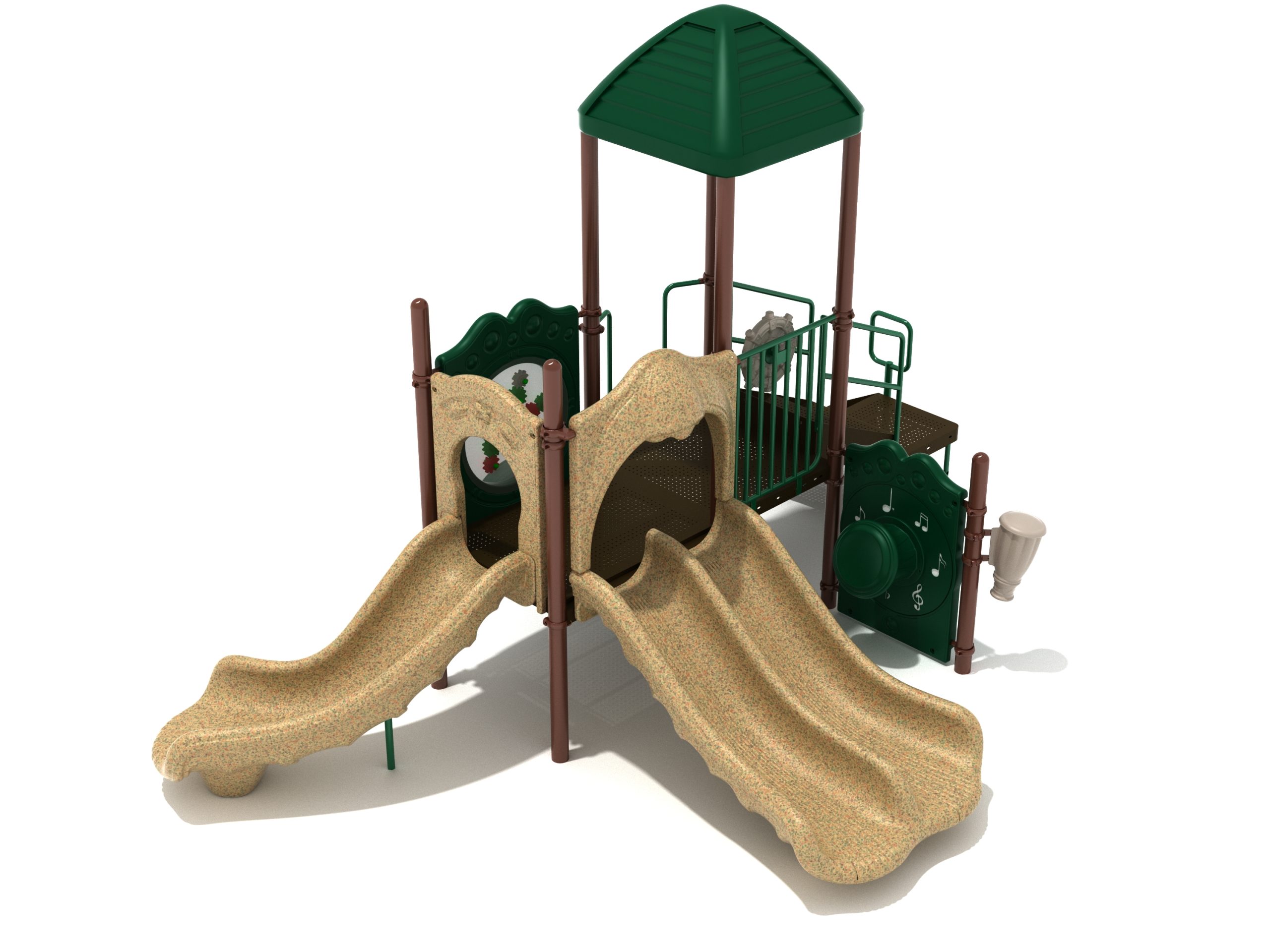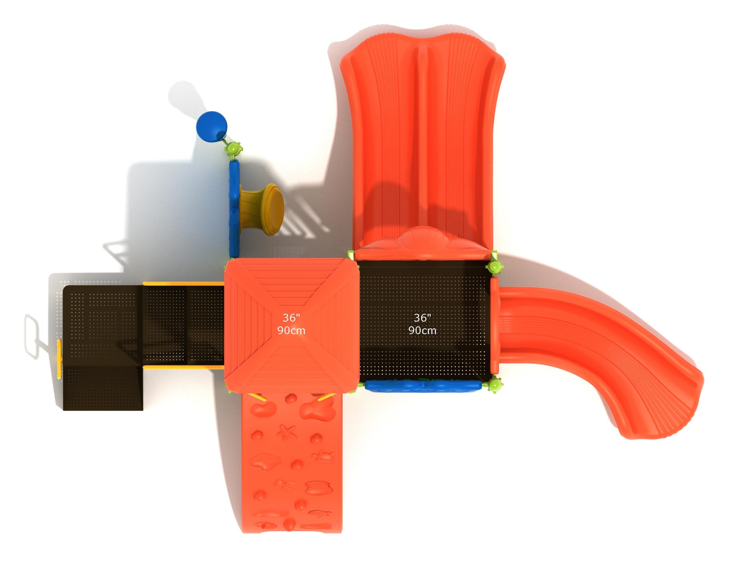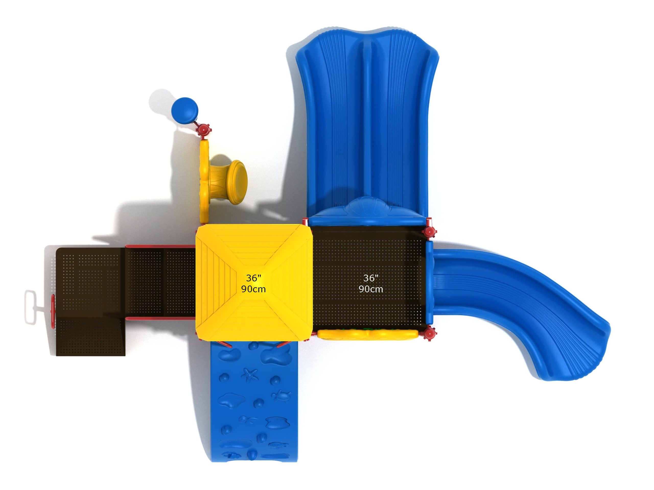 The Lincoln play structure will be the star of the playground, made up of two 36” elevated, square platforms, and lots of fun features, this play structure is sure to be a hit. This play structure is accessible by a sea creature climber, and by stairs. A double slide and a right turn slide are attached to an elevated platform, giving children a fun way off of the play structure. A gear panel and a metal barrier with a ship’s wheel also border sides of the elevated platform. A single drum and a drum panel are found on the ground level, providing opportunities for on-ground play and make the Lincoln play structure ADA compliant. A line roof covers part of the structure, providing shade and protection from the sun to children playing on the play structure during sunny days. This play structure is designed for children who are between the ages of 2 and 12 years old.