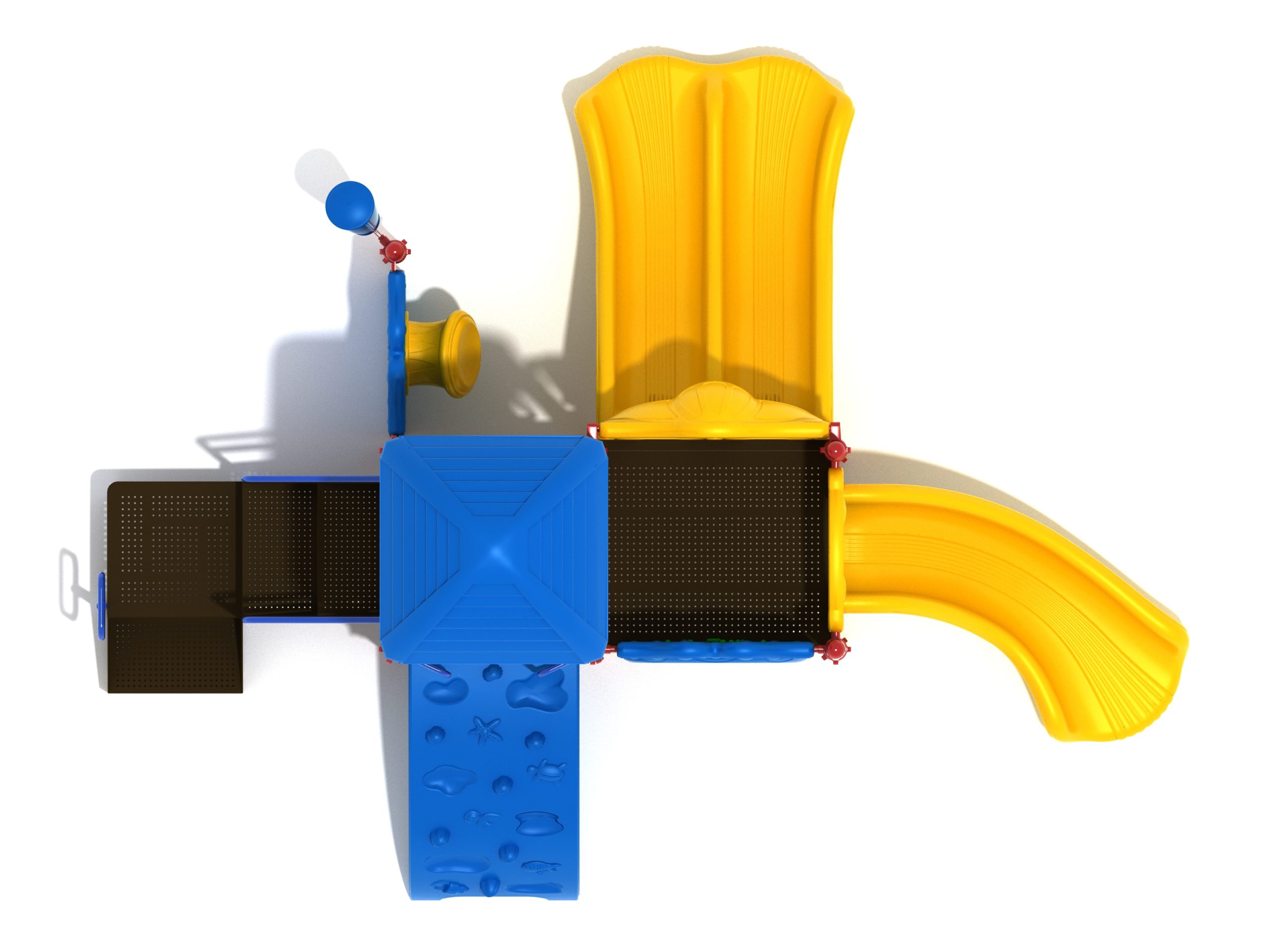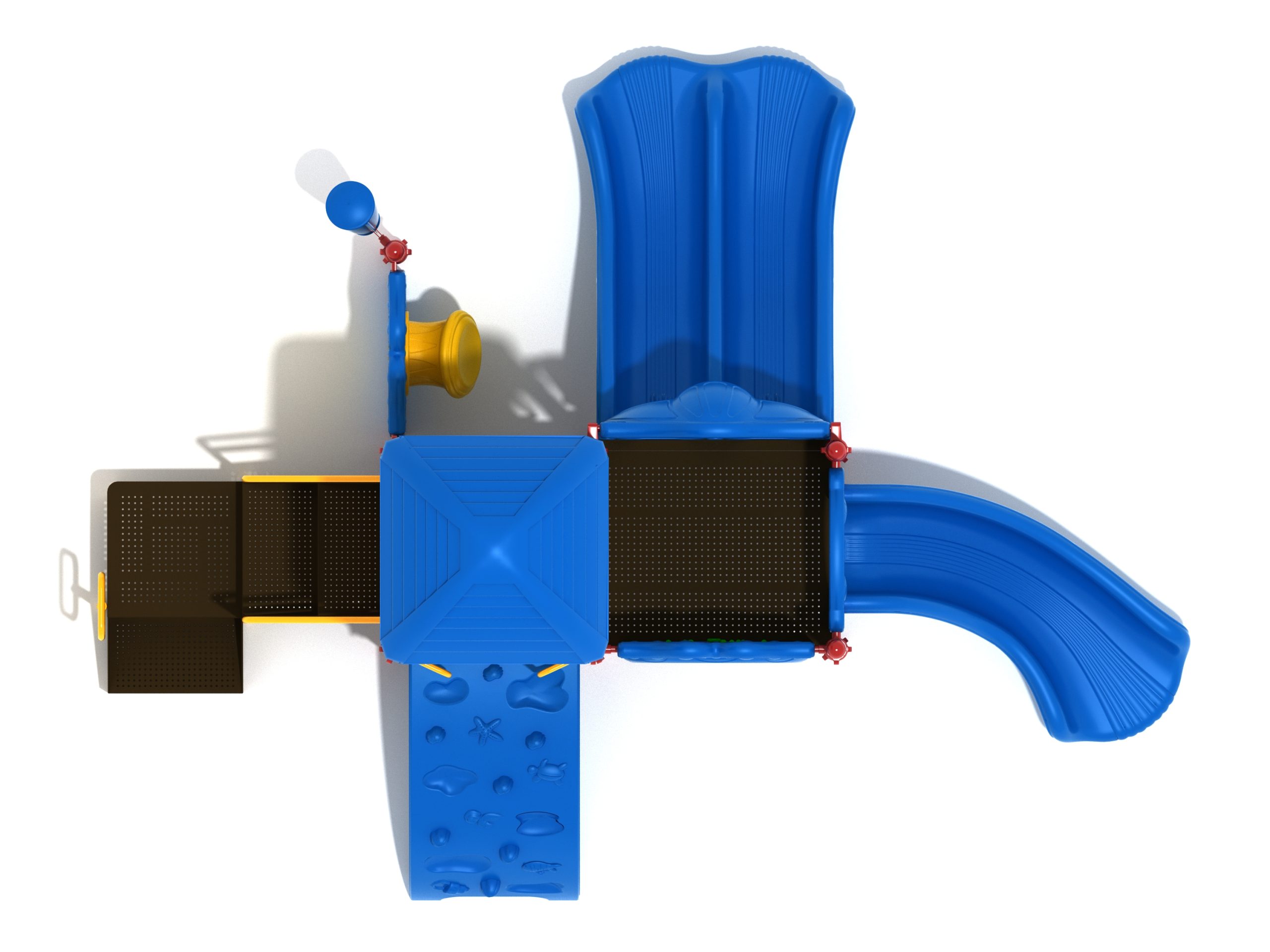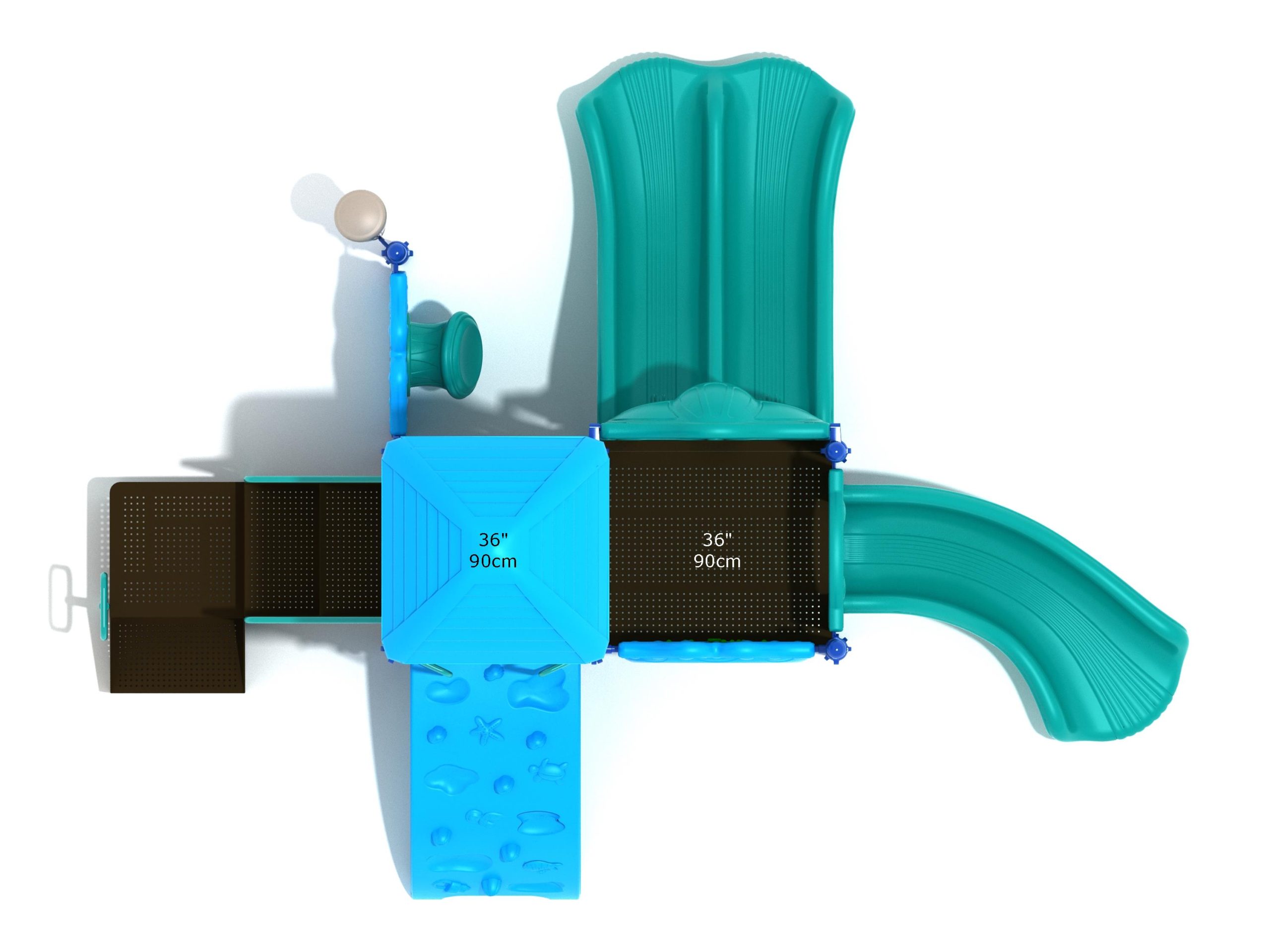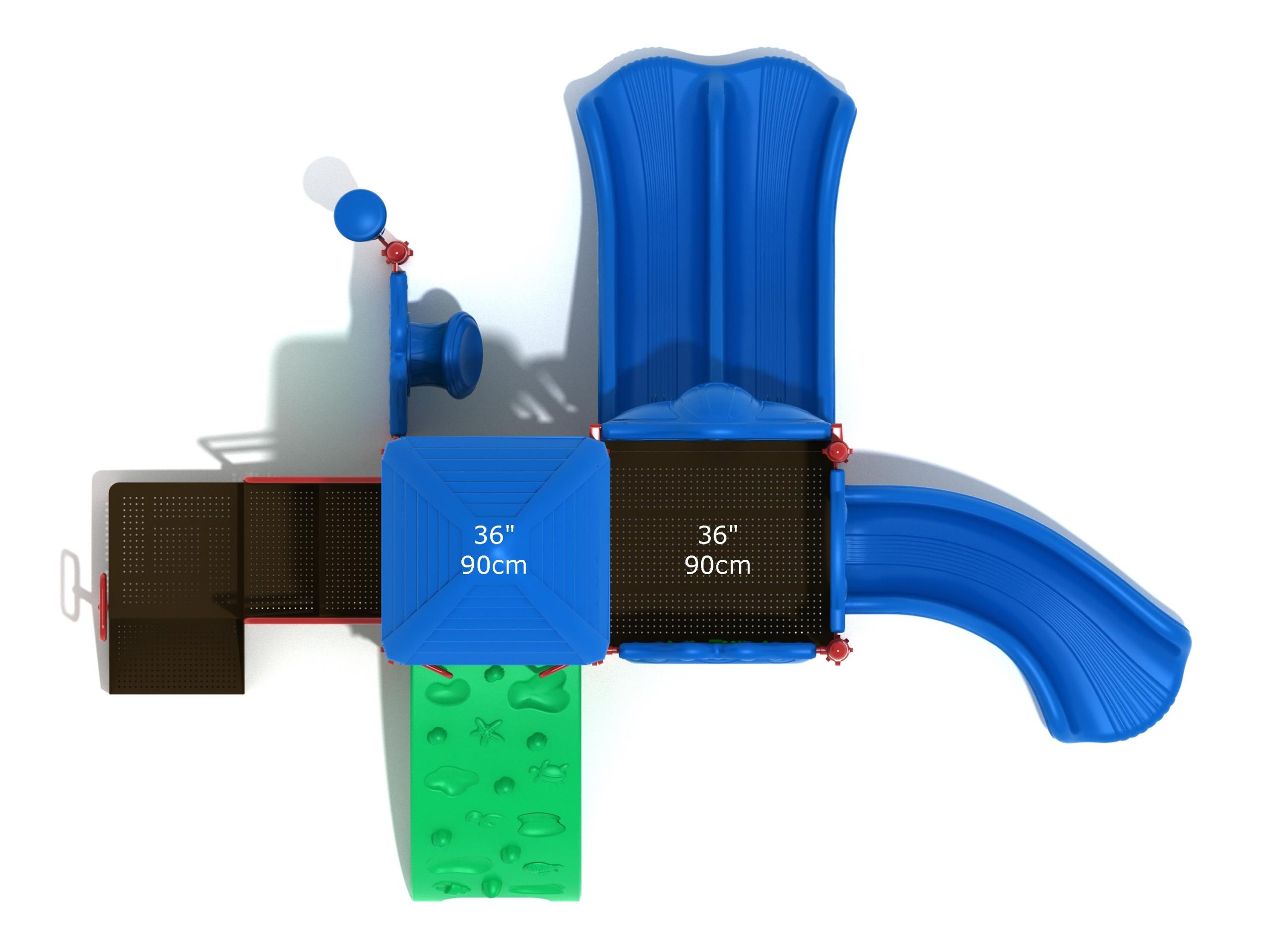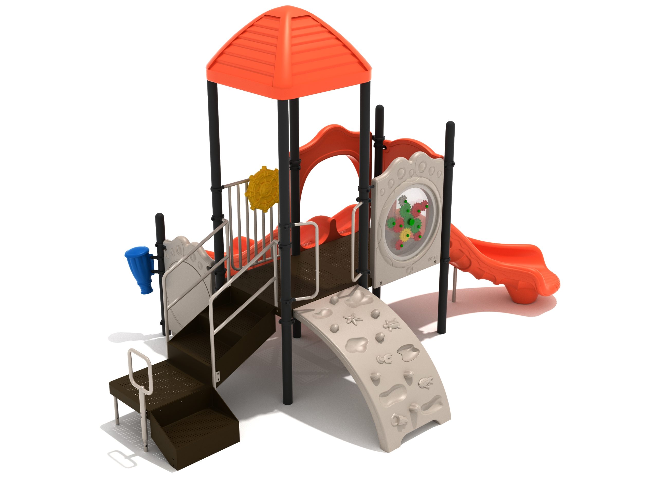 Whether kids enter the Lincoln play structure via the Transfer Station or by exploring underwater worlds on the Sea Creature Climber complete with 3D fish and shells, they’ll enjoy flying down one of the two slides on offer heading off in opposite directions. The Right Turn Slide provides a gentle curve which requires children to maintain their balance with core strength, and the Double Slide is perfect for engaging in healthy competition with their peers to see who can land first. And you can be sure they’ll be racing back to the top to try it again and again. There’s a Gear Panel to experience on the upper level alongside a Ship’s Wheel on a metal railing to give them a great view of the playground as they chart a course over choppy seas. The Single Drum and larger Drum Panel encourage musical ability from a young age and creates a sensory backdrop to the screams of laughter guaranteed on the Lincoln play center.