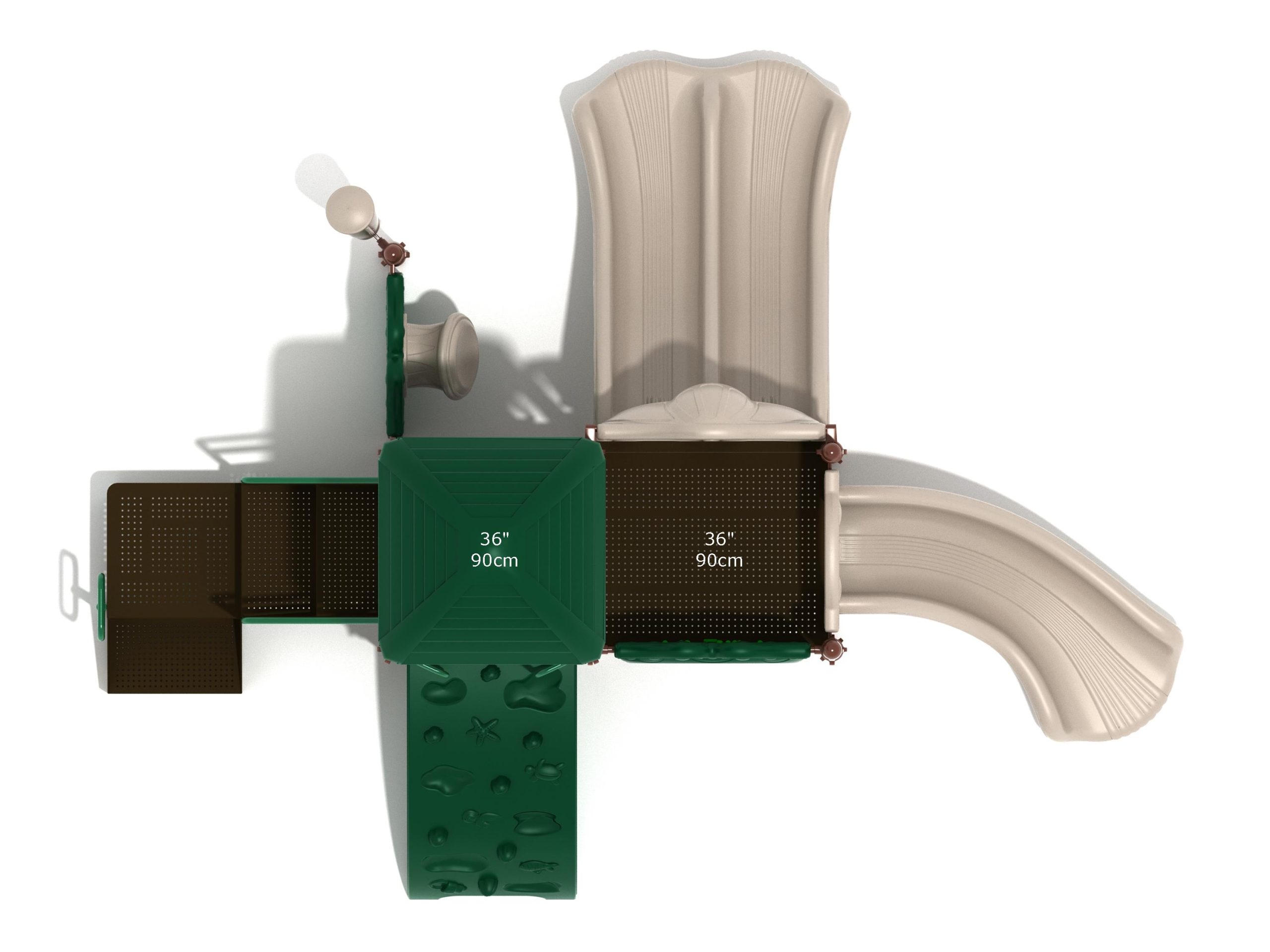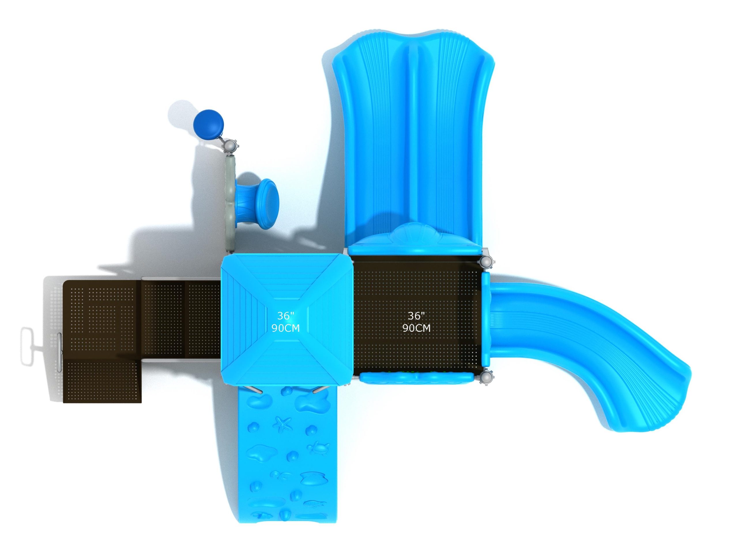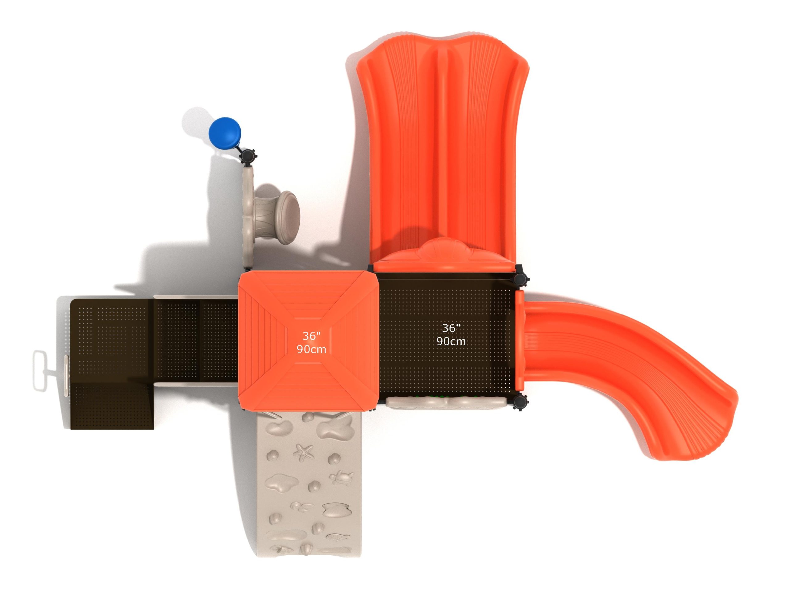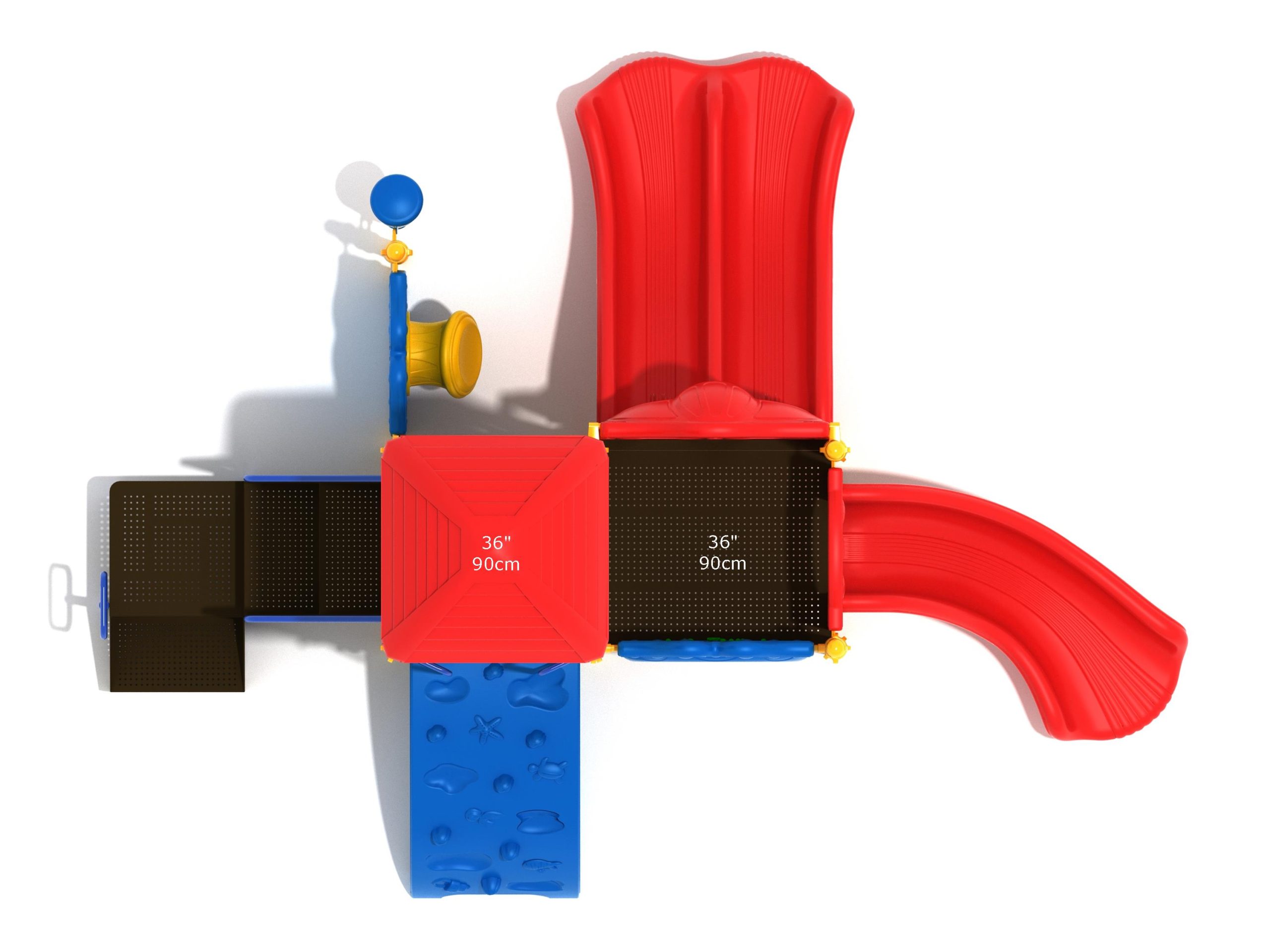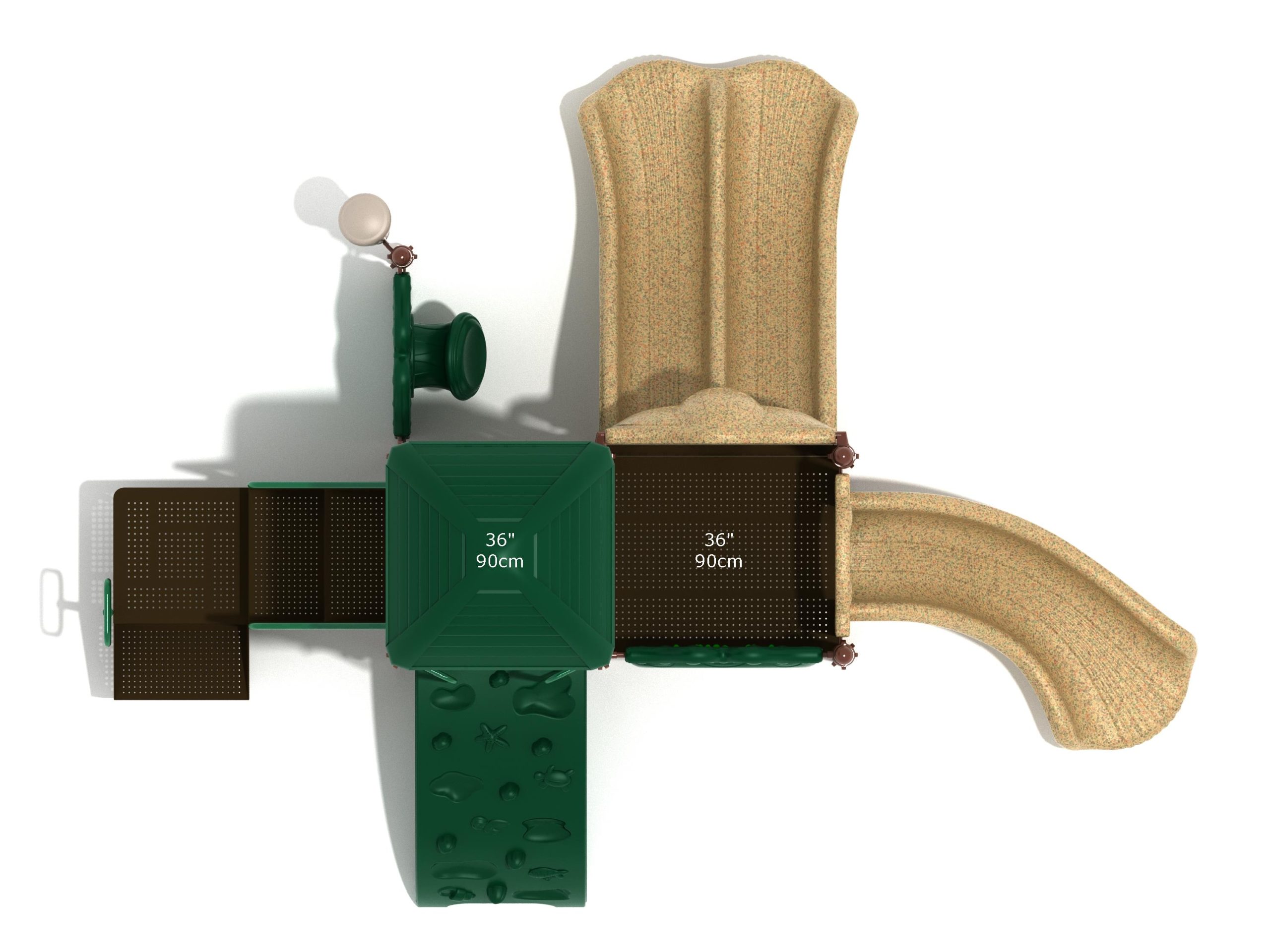 Whether kids enter the Lincoln play structure via the Transfer Station or by exploring underwater worlds on the Sea Creature Climber complete with 3D fish and shells, they’ll enjoy flying down one of the two slides on offer heading off in opposite directions. The Right Turn Slide provides a gentle curve which requires children to maintain their balance with core strength, and the Double Slide is perfect for engaging in healthy competition with their peers to see who can land first. And you can be sure they’ll be racing back to the top to try it again and again. There’s a Gear Panel to experience on the upper level alongside a Ship’s Wheel on a metal railing to give them a great view of the playground as they chart a course over choppy seas. The Single Drum and larger Drum Panel encourage musical ability from a young age and creates a sensory backdrop to the screams of laughter guaranteed on the Lincoln play center.