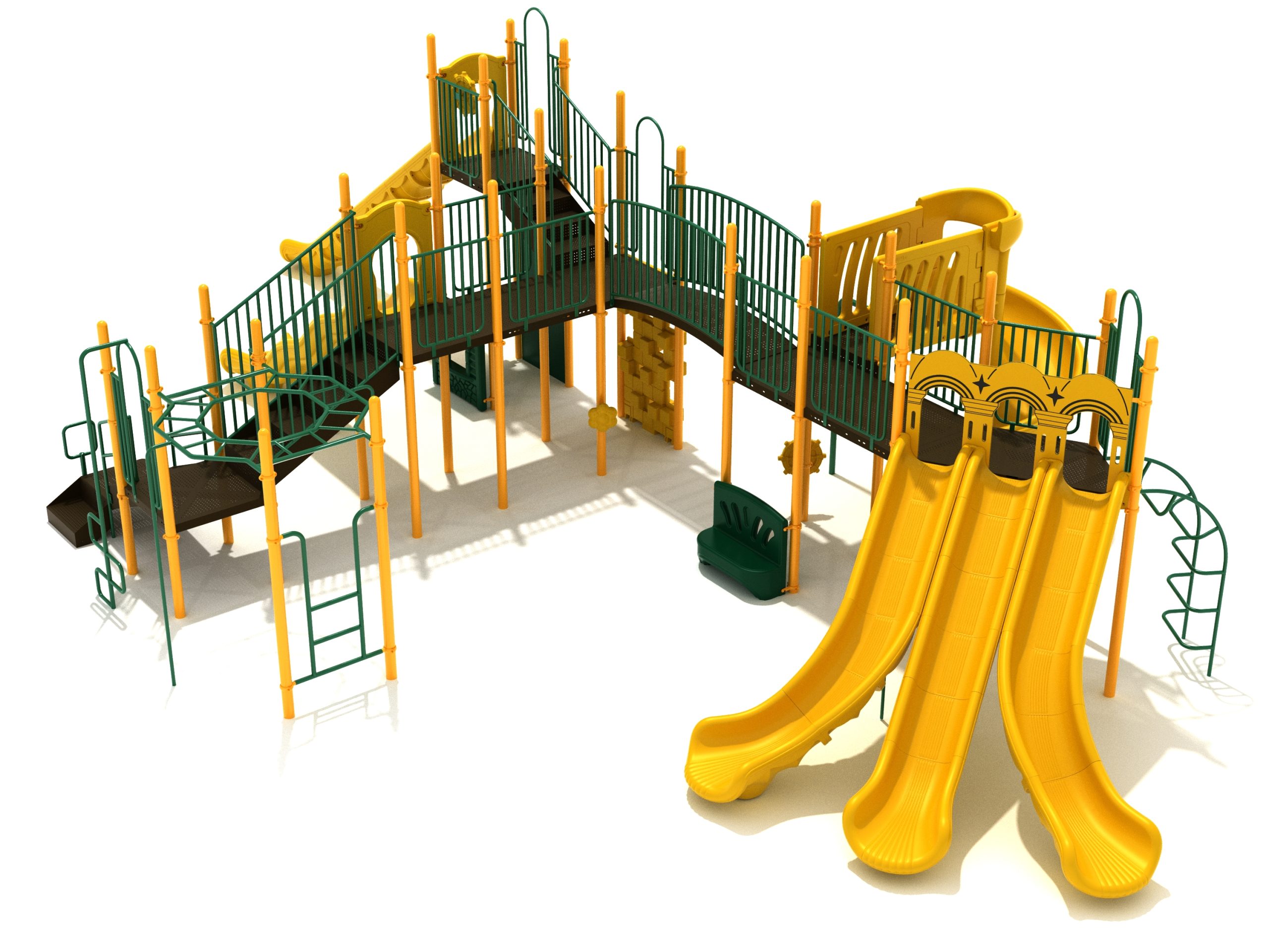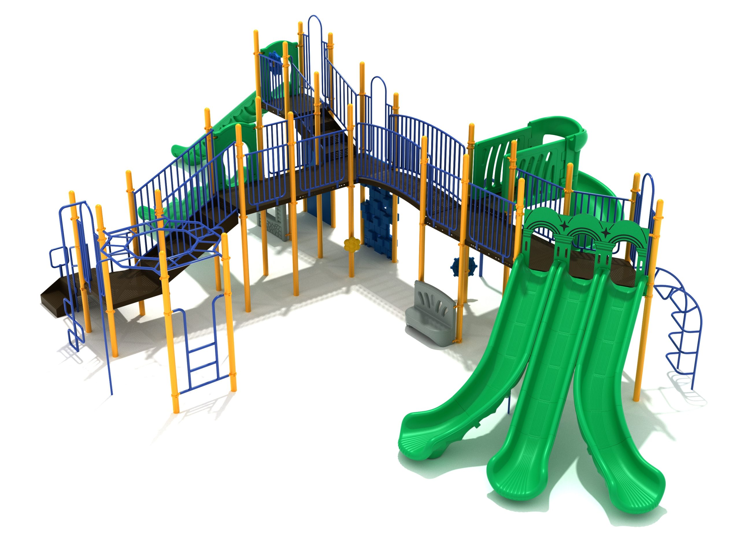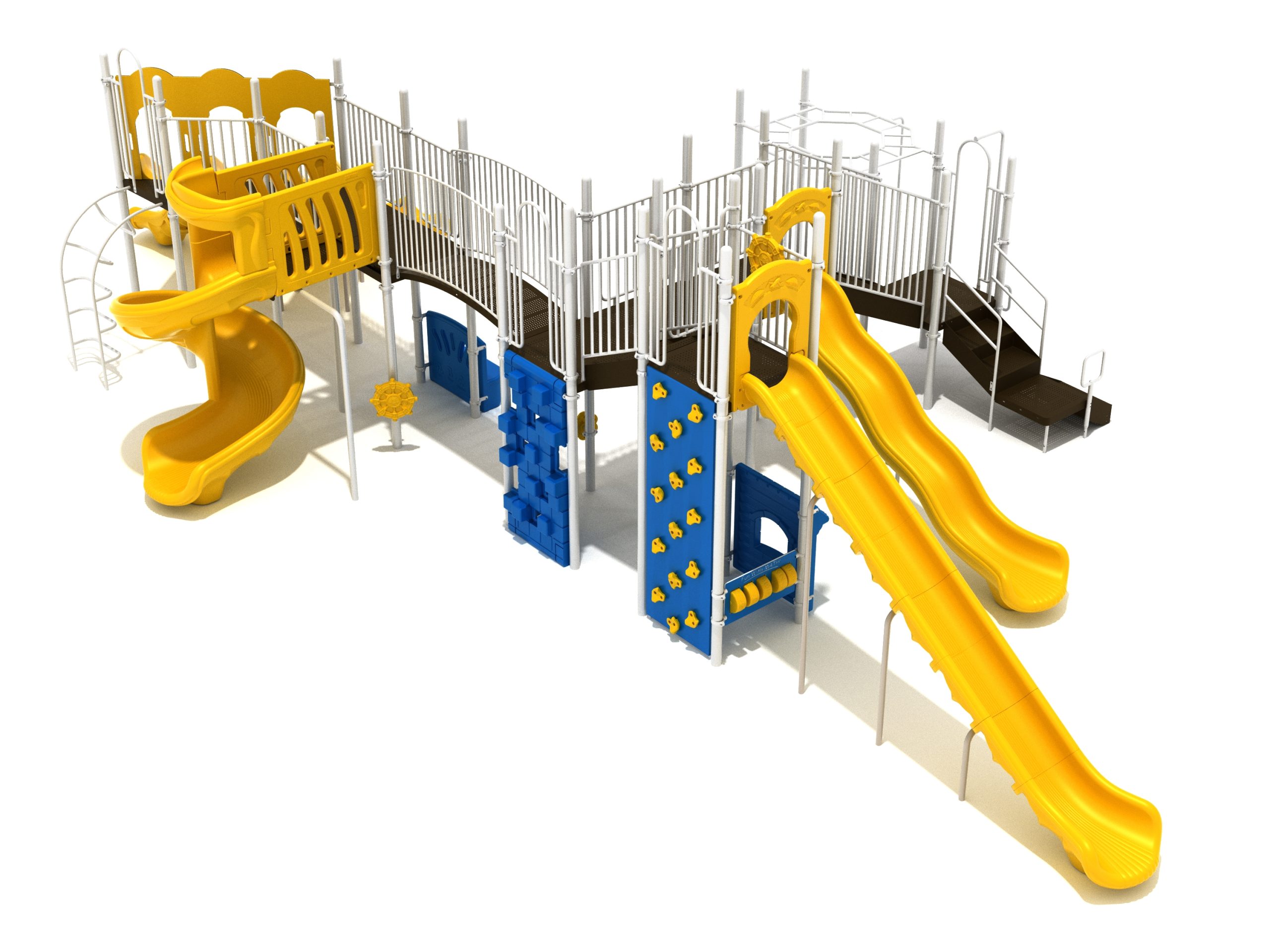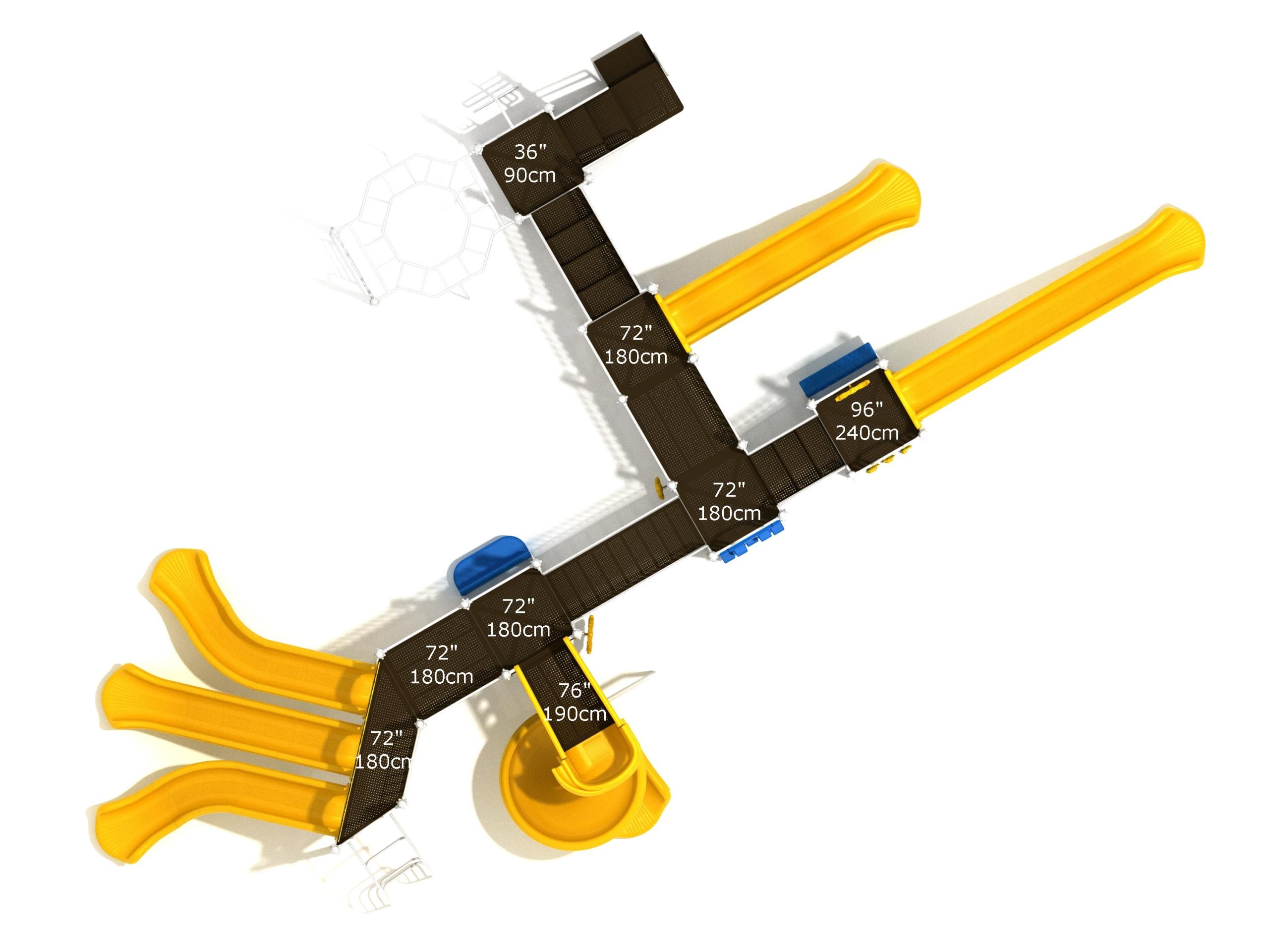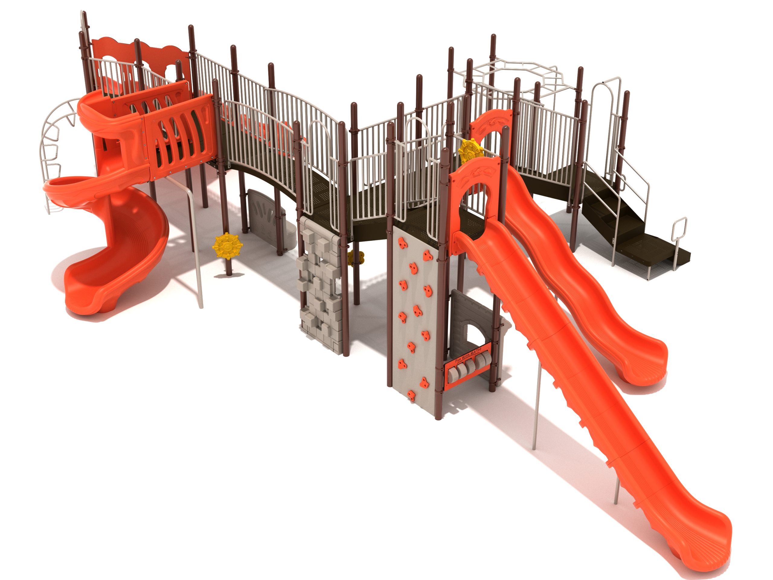 Loveland is a slide city with a number of challenging climbers of different types and difficulties. The only easy way up the Loveland is through the Transfer Station staircase. But if kids want some physical activity before rewarding themselves with slides, they can try any of the tough climbers depending on their willpower. The Snake Climber is good for beginners, followed by the fairly harder and taller Inverted Arch Ladder. If beating the fear of heights is the goal, the tallest Vertical PE Rock Climbing Wall, along with the slightly shorter Pixel Climber, also offers a challenging rock-climbing experience. A good number will also be seen swinging across the Octagon straight-rung horizontal Ladder. Once on top, the only way down is through slides like the bumpy Wave Slide, the Trio of Right Turn, Left Turn and Straight Slide, and crazy Spiral Slide or the whopping 8-foot Straight Slide. The activity Panels and Ship and Rain Wheel will also keep kids busy on the ground level.