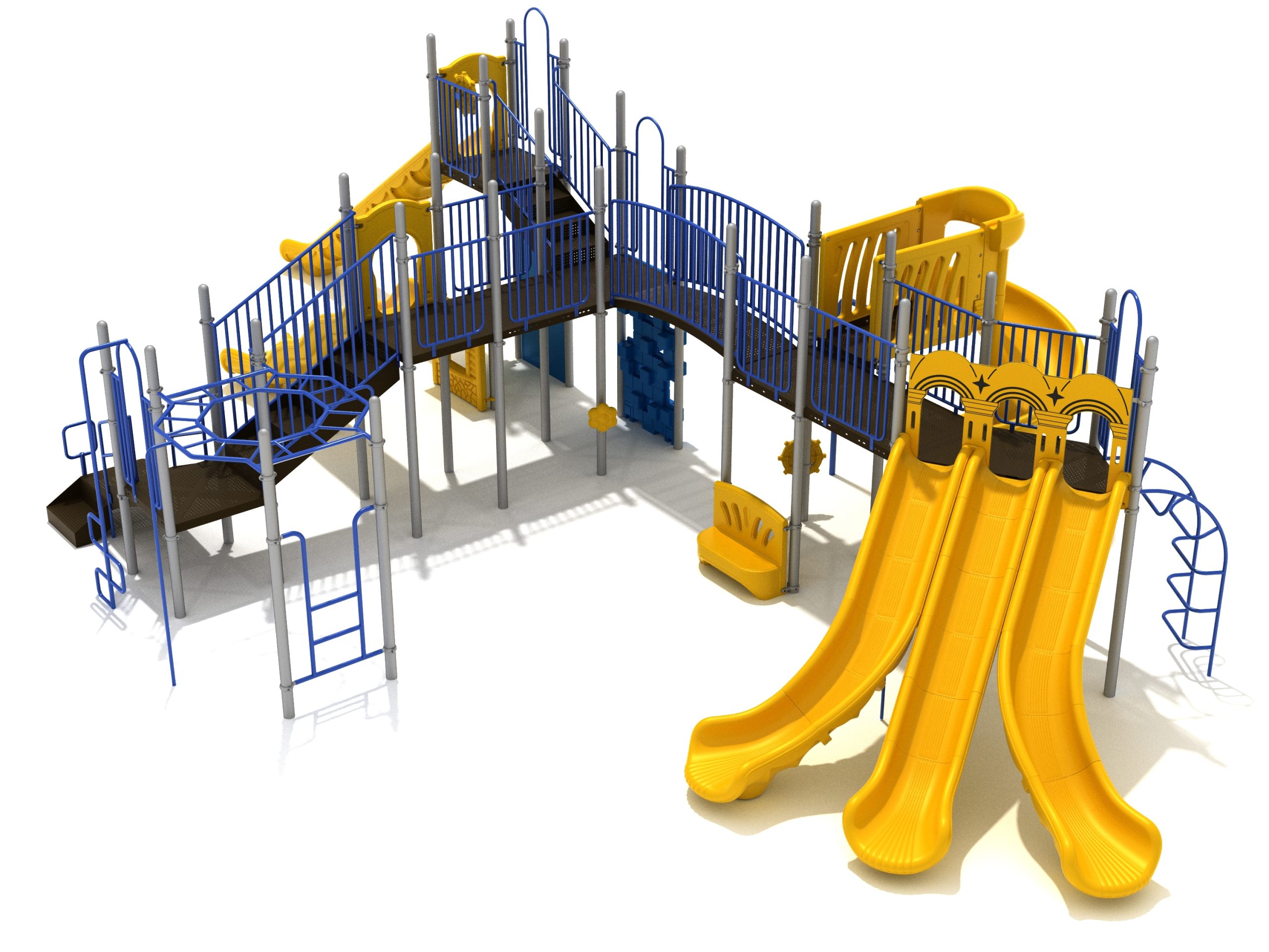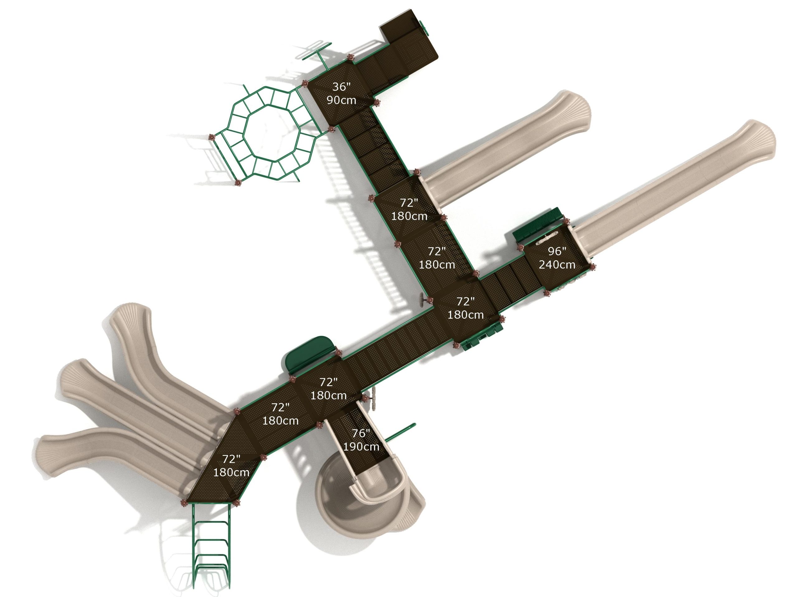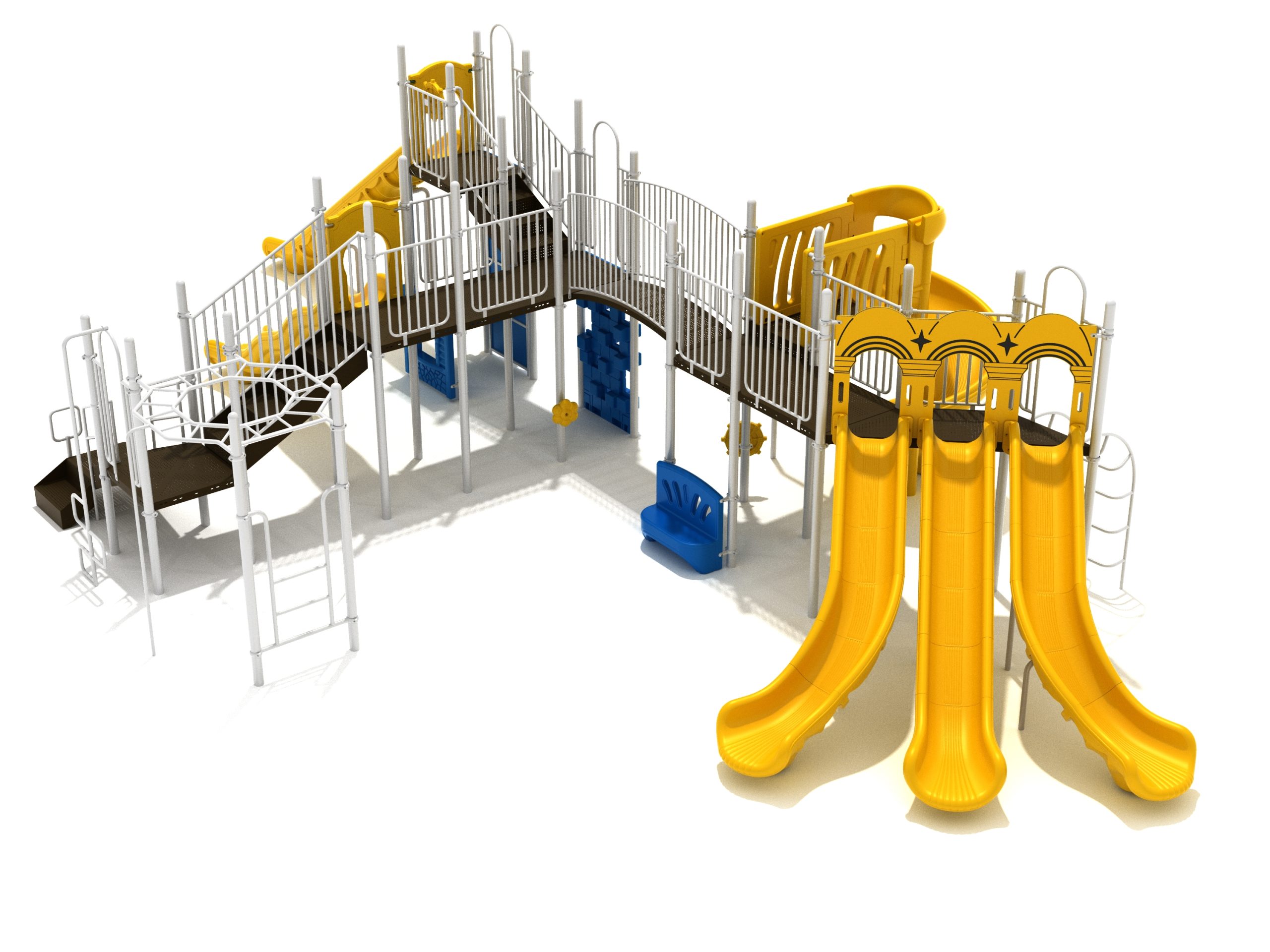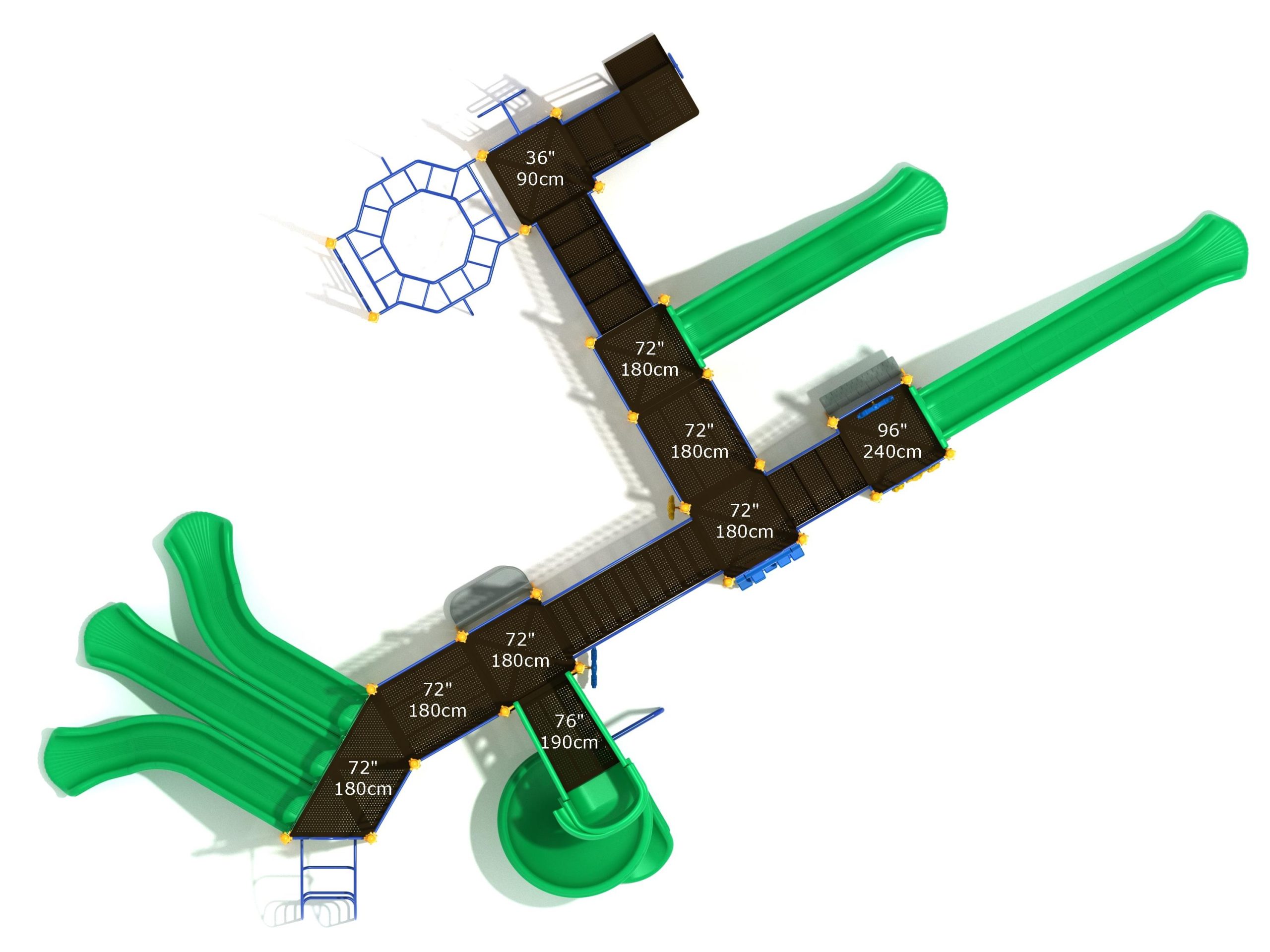 Loveland is a slide city with a number of challenging climbers of different types and difficulties. The only easy way up the Loveland is through the Transfer Station staircase. But if kids want some physical activity before rewarding themselves with slides, they can try any of the tough climbers depending on their willpower. The Snake Climber is good for beginners, followed by the fairly harder and taller Inverted Arch Ladder. If beating the fear of heights is the goal, the tallest Vertical PE Rock Climbing Wall, along with the slightly shorter Pixel Climber, also offers a challenging rock-climbing experience. A good number will also be seen swinging across the Octagon straight-rung horizontal Ladder. Once on top, the only way down is through slides like the bumpy Wave Slide, the Trio of Right Turn, Left Turn and Straight Slide, and crazy Spiral Slide or the whopping 8-foot Straight Slide. The activity Panels and Ship and Rain Wheel will also keep kids busy on the ground level.