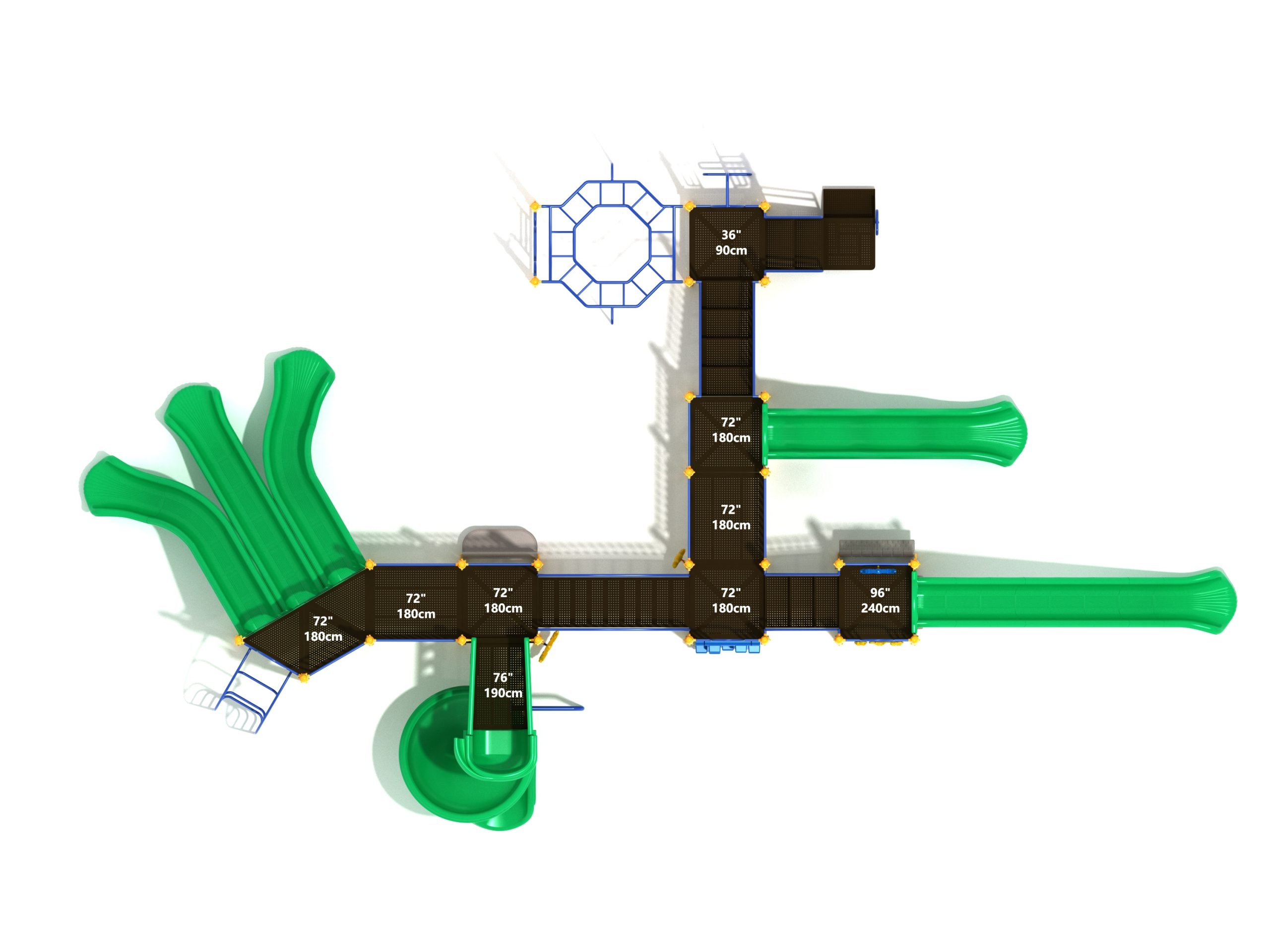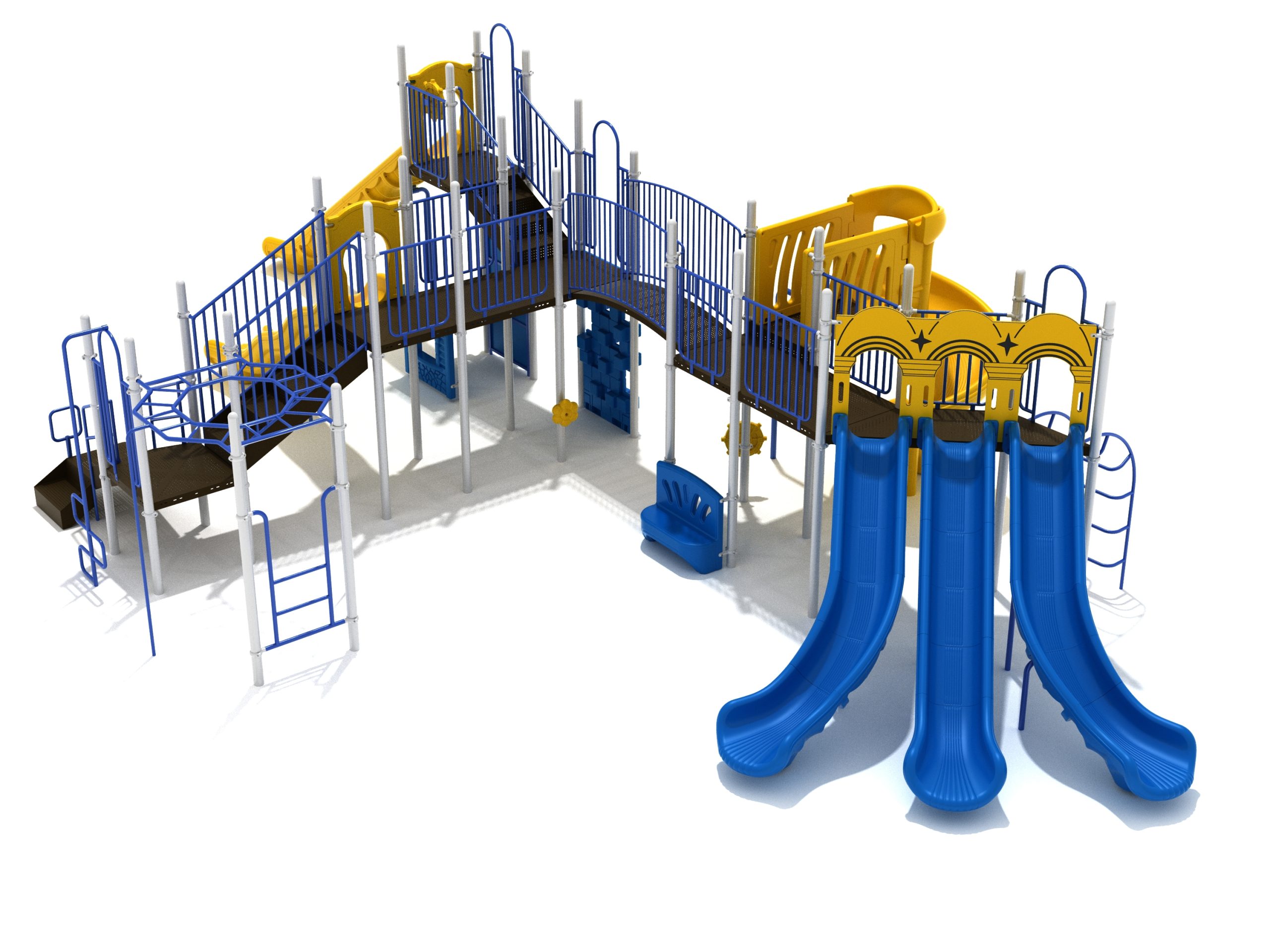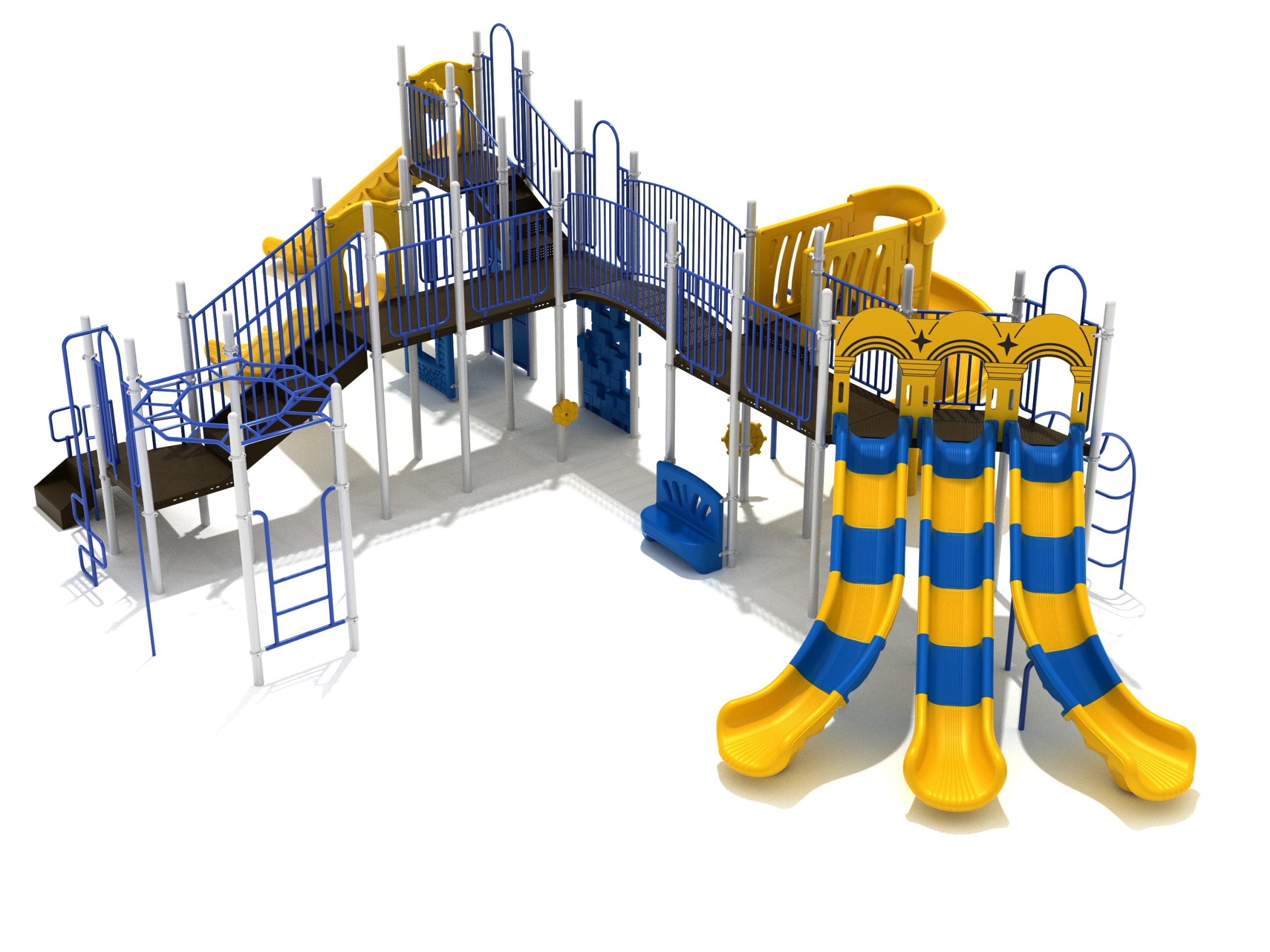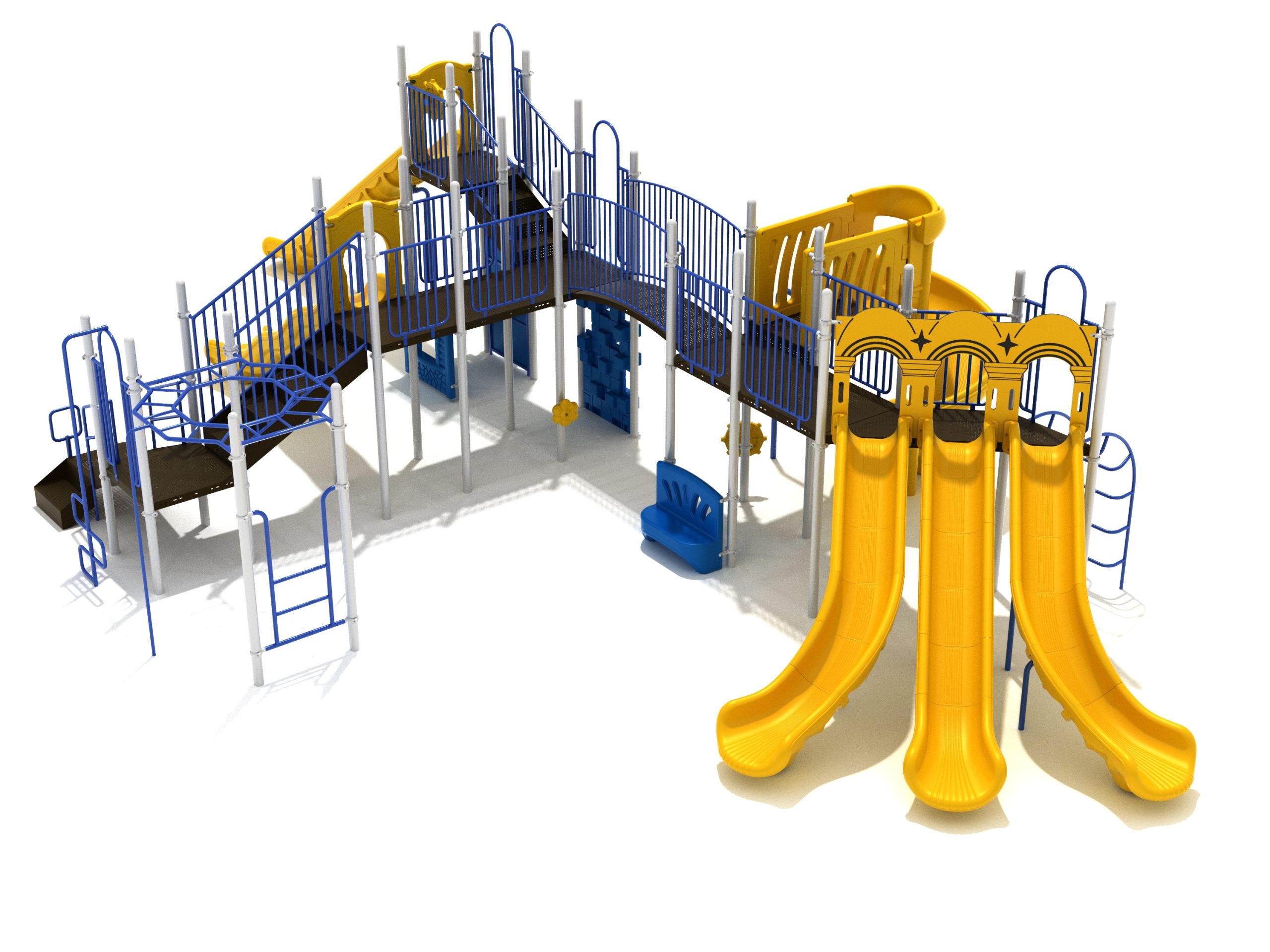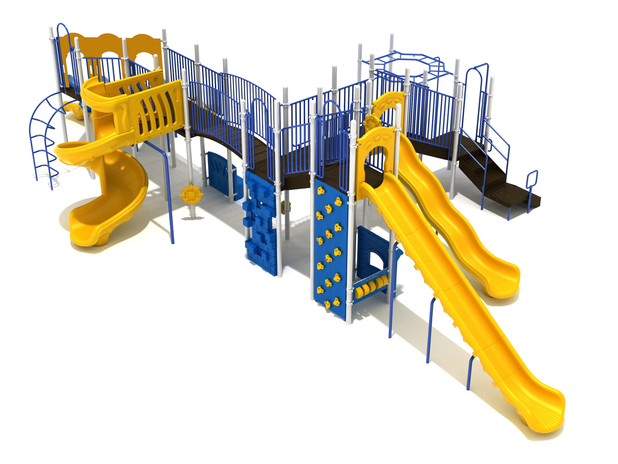 Loveland is a slide city with a number of challenging climbers of different types and difficulties. The only easy way up the Loveland is through the Transfer Station staircase. But if kids want some physical activity before rewarding themselves with slides, they can try any of the tough climbers depending on their willpower. The Snake Climber is good for beginners, followed by the fairly harder and taller Inverted Arch Ladder. If beating the fear of heights is the goal, the tallest Vertical PE Rock Climbing Wall, along with the slightly shorter Pixel Climber, also offers a challenging rock-climbing experience. A good number will also be seen swinging across the Octagon straight-rung horizontal Ladder. Once on top, the only way down is through slides like the bumpy Wave Slide, the Trio of Right Turn, Left Turn and Straight Slide, and crazy Spiral Slide or the whopping 8-foot Straight Slide. The activity Panels and Ship and Rain Wheel will also keep kids busy on the ground level.