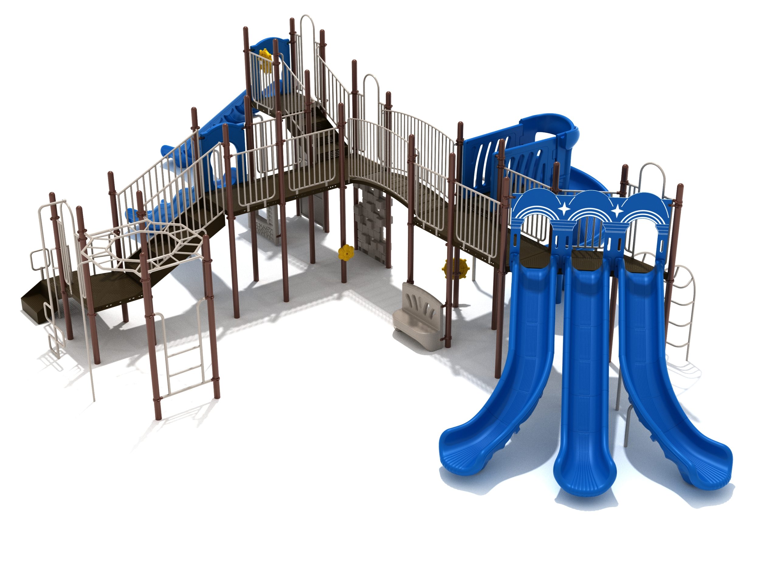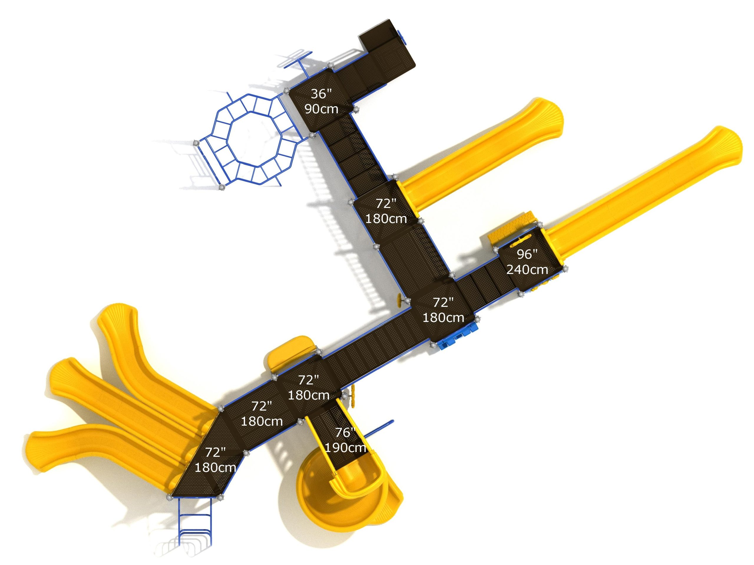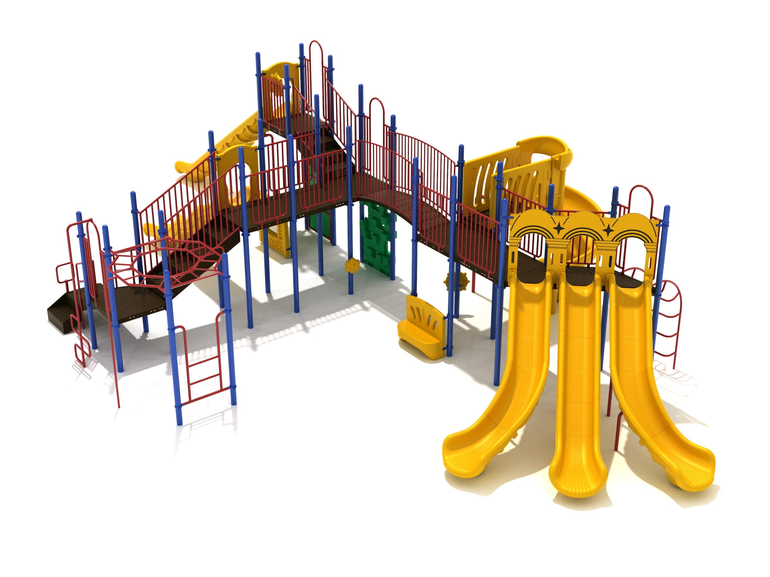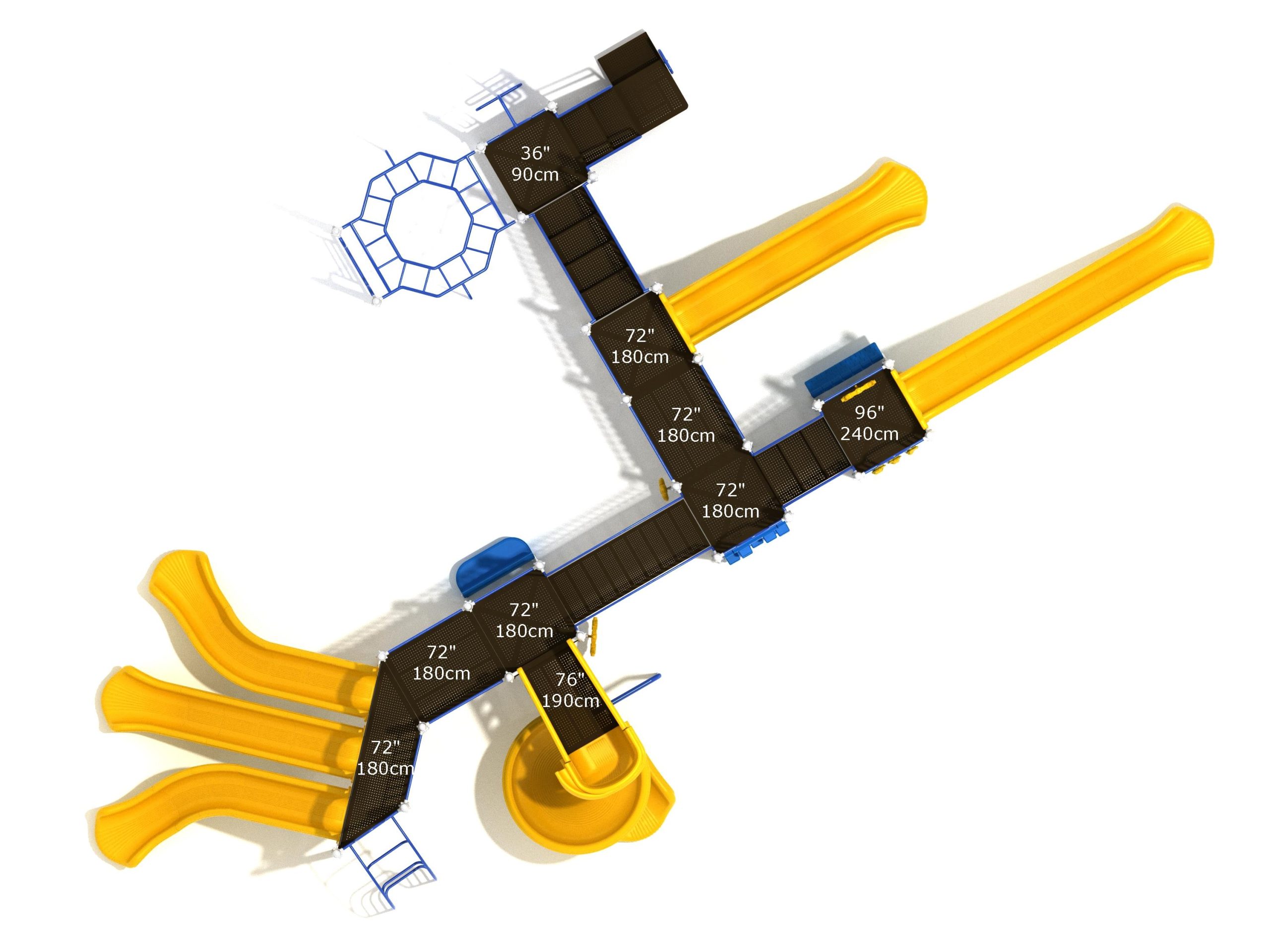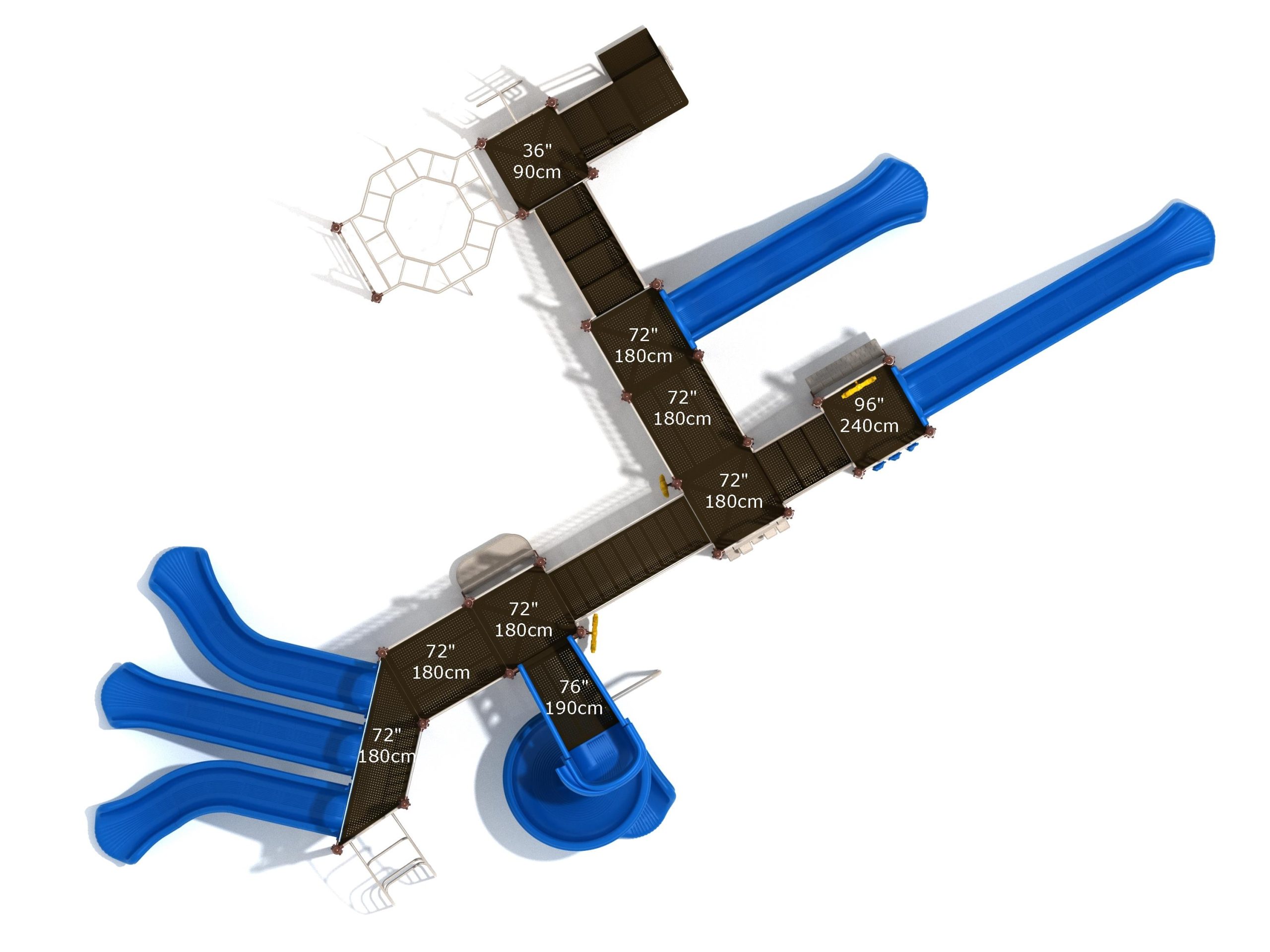 Loveland is a slide city with a number of challenging climbers of different types and difficulties. The only easy way up the Loveland is through the Transfer Station staircase. But if kids want some physical activity before rewarding themselves with slides, they can try any of the tough climbers depending on their willpower. The Snake Climber is good for beginners, followed by the fairly harder and taller Inverted Arch Ladder. If beating the fear of heights is the goal, the tallest Vertical PE Rock Climbing Wall, along with the slightly shorter Pixel Climber, also offers a challenging rock-climbing experience. A good number will also be seen swinging across the Octagon straight-rung horizontal Ladder. Once on top, the only way down is through slides like the bumpy Wave Slide, the Trio of Right Turn, Left Turn and Straight Slide, and crazy Spiral Slide or the whopping 8-foot Straight Slide. The activity Panels and Ship and Rain Wheel will also keep kids busy on the ground level.