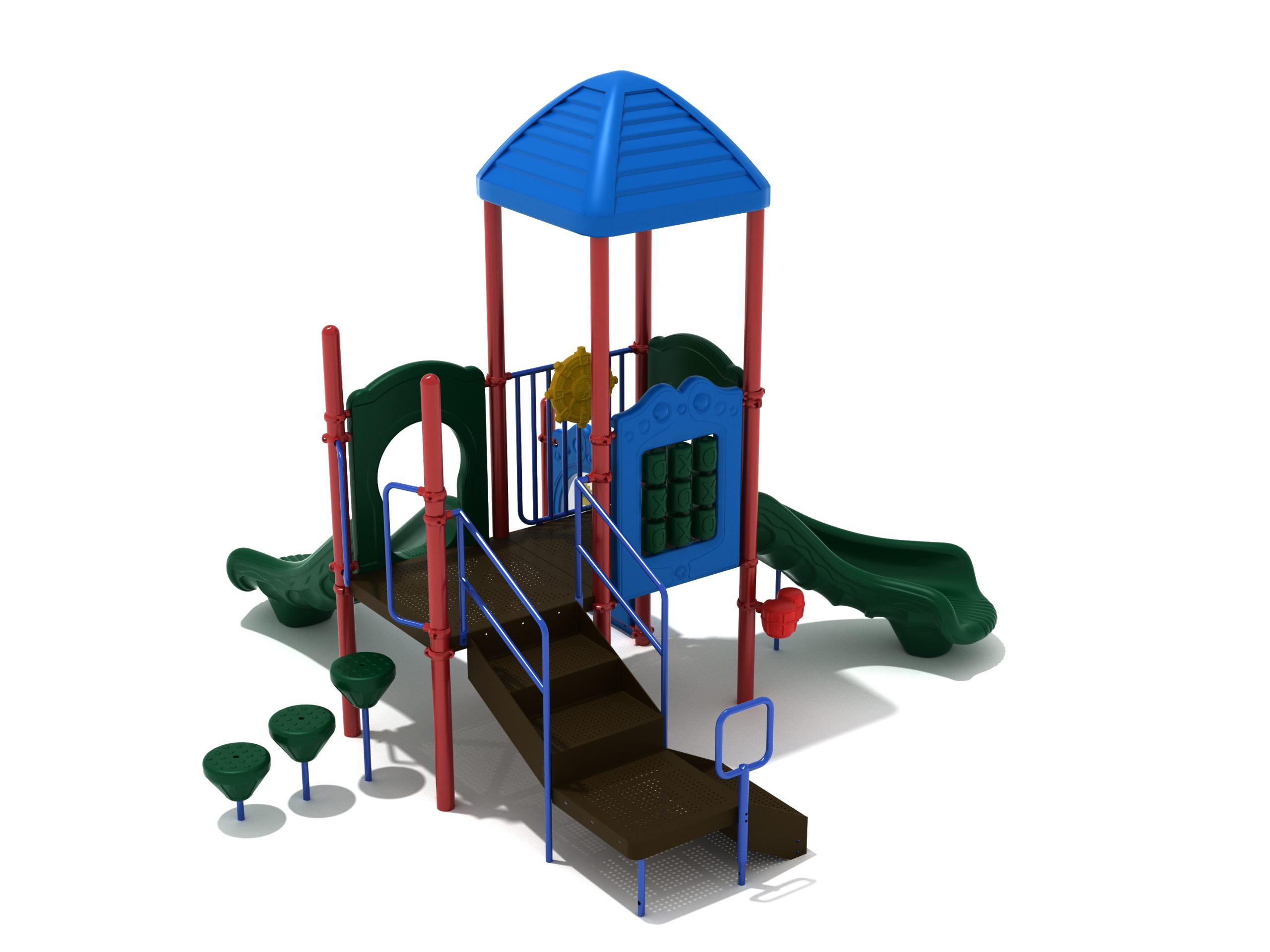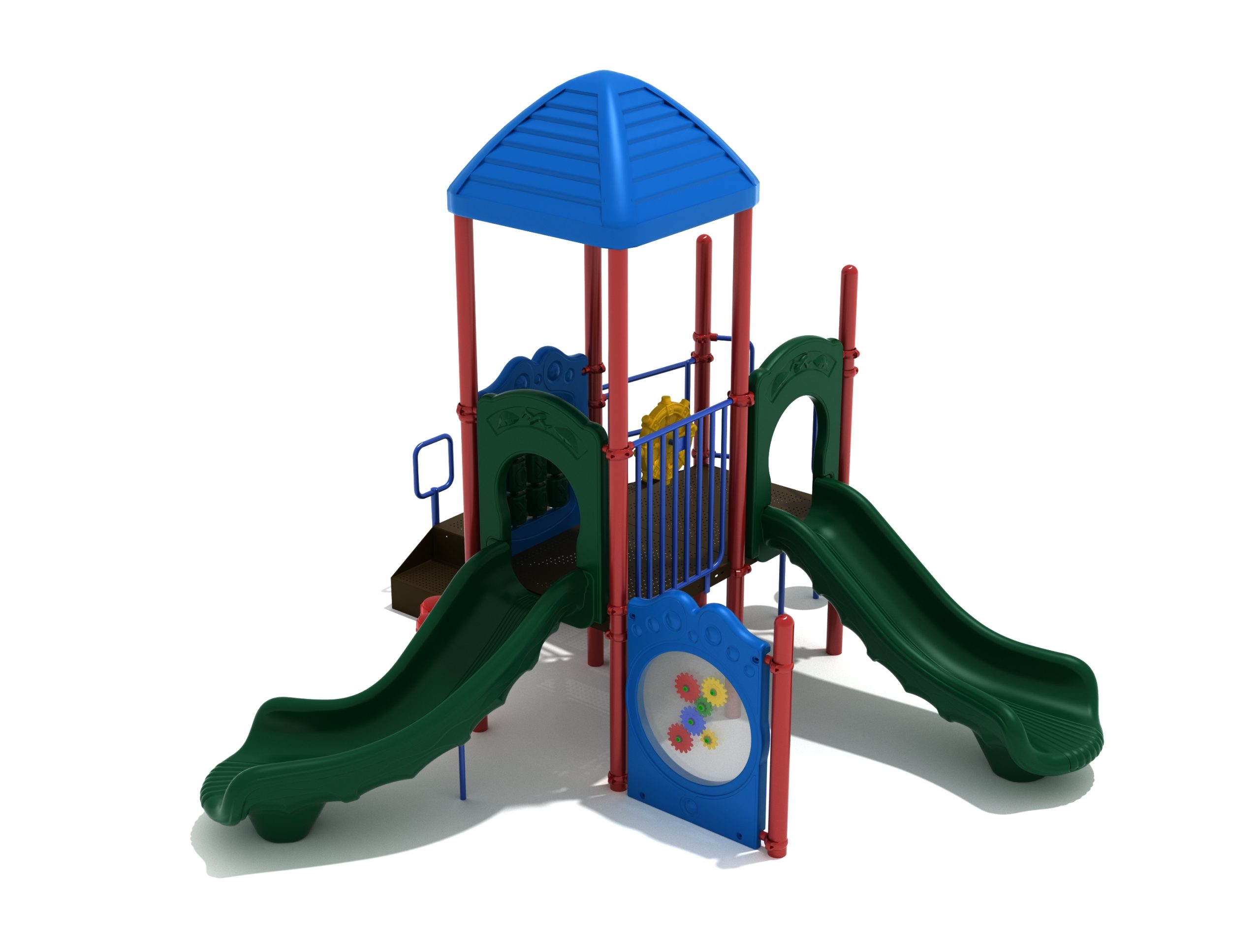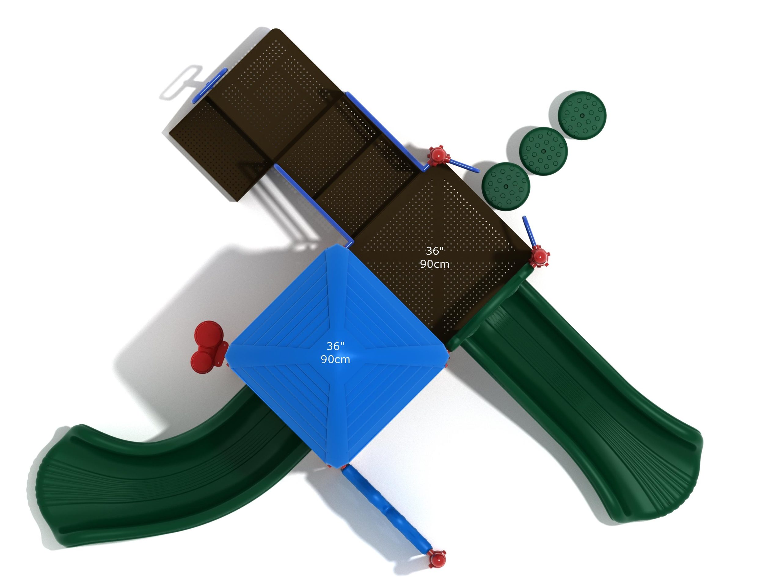 There’s lots to love about the Miami Beach play structure with lots of exciting things to do for younger children just beginning to explore playgrounds and also for older kids who thrive on challenging play equipment. A Tic Tac Toe Panel brings this classic game to live in 3D with spinning symbols to play the game over and over. A Gear Panel and Ship’s Wheel make the play experience more interactive as they investigate turning motions, and Bongos are always a favorite of children whether they’re making music or just creating playful noise. Climbing up to the platform is given a fun twist thanks to the Pebble Climber. It’s a series of three disks with a textured surface to prevent slipping which encourages good balance and kids can pretend they are crossing a river on stepping stones. A Right Turn Slide and Straight Slide complete the structure and give children the opportunity to choose which one they want to go down first, but you can guarantee that both will be used time and time again.